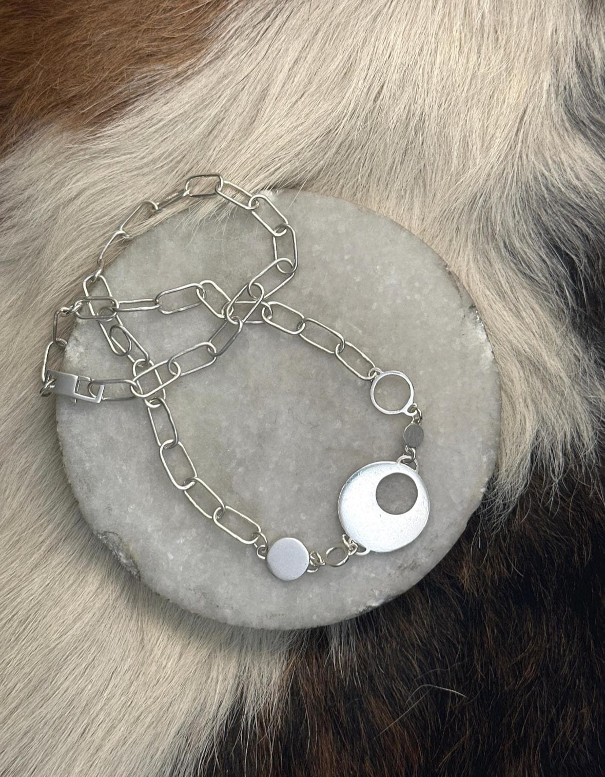 A play with circles on handmade chain, sterling and fine silver components
