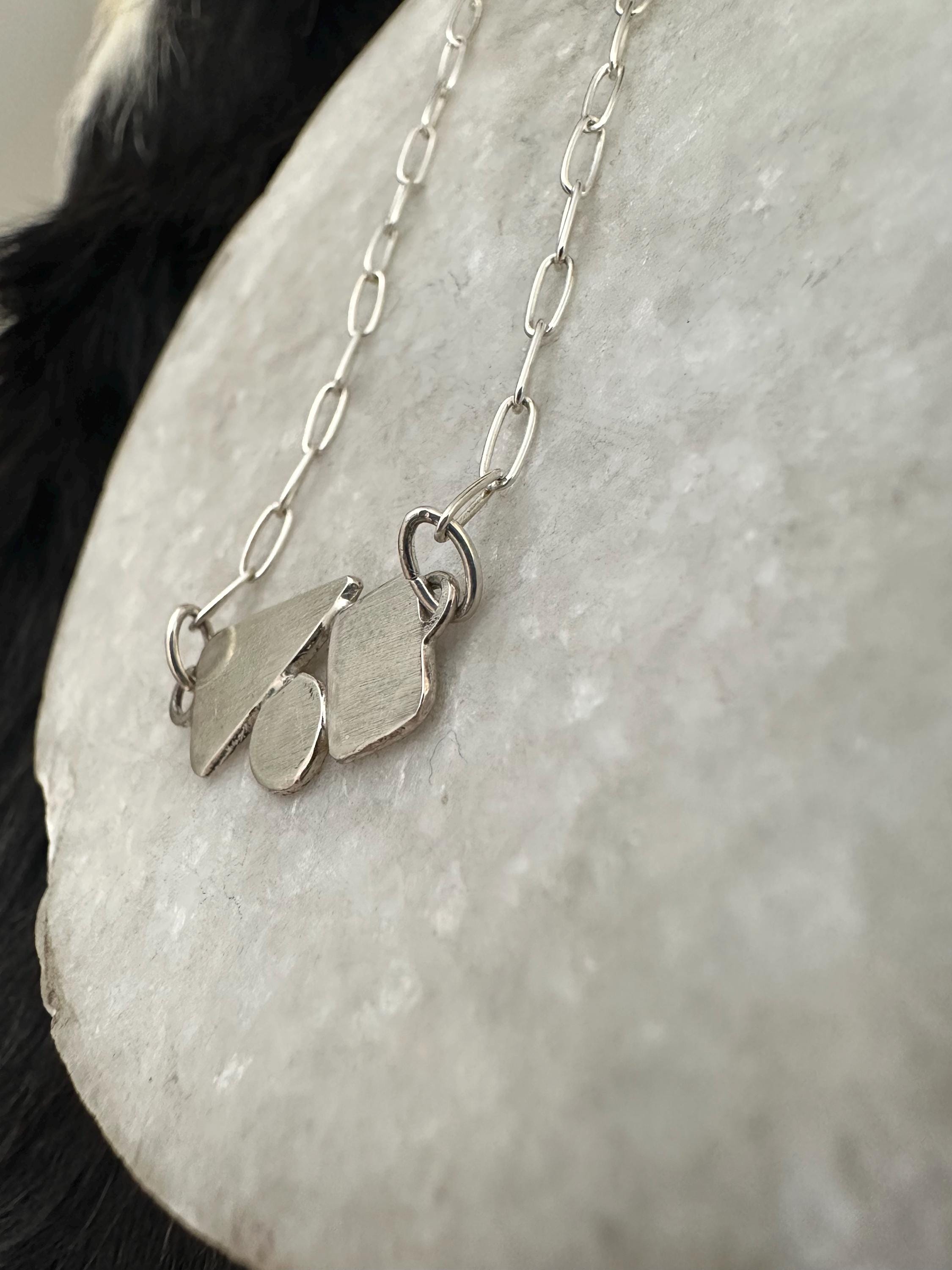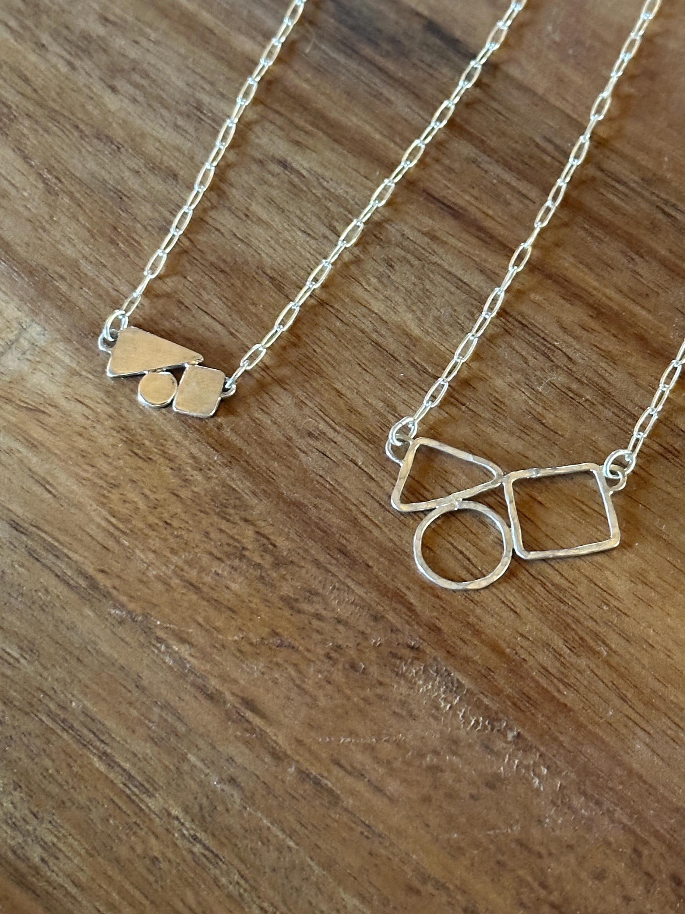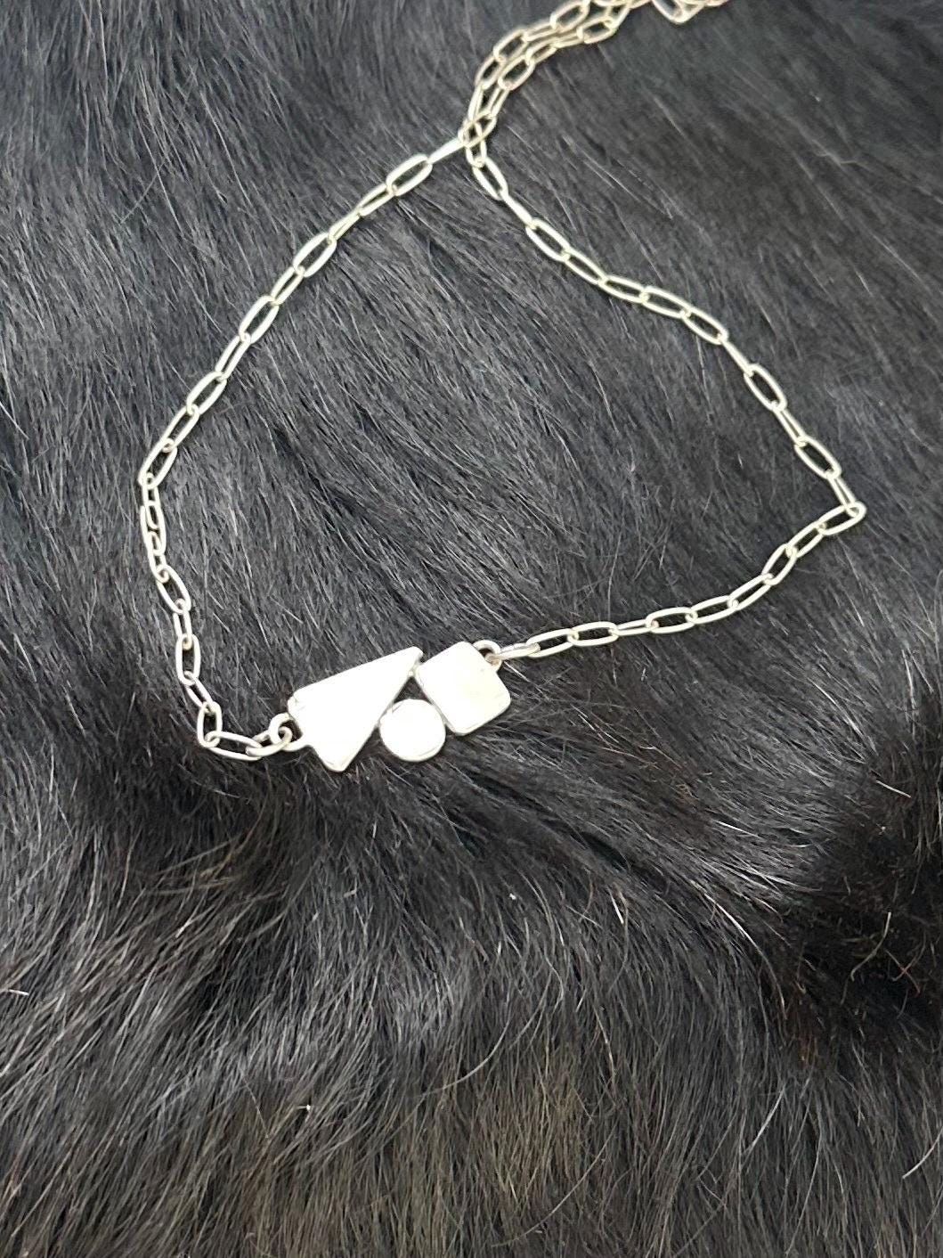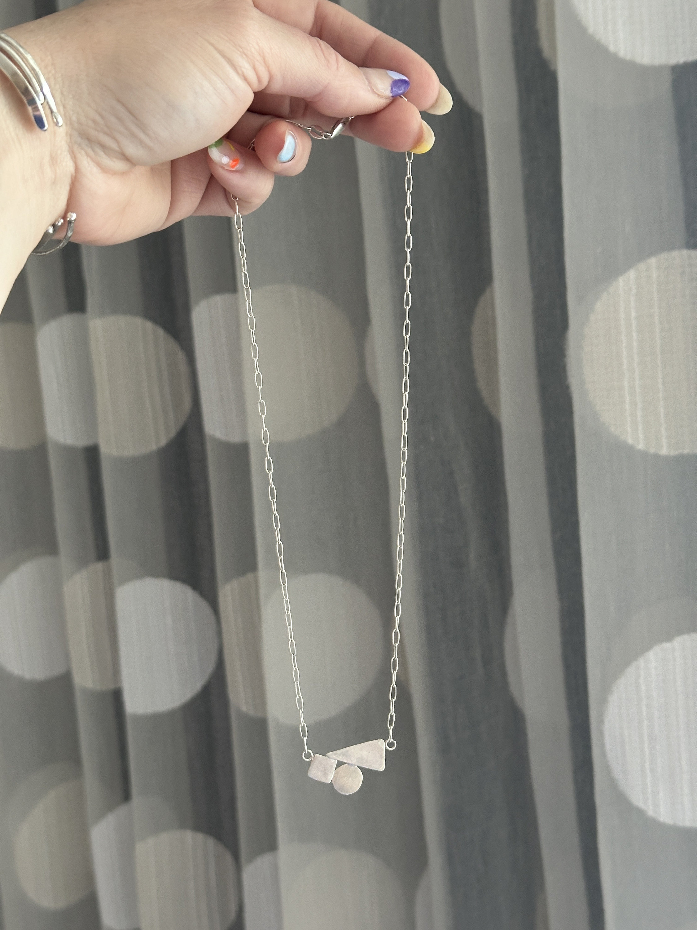 The chain is a delicate paper clip chain to compliment the geometric shapes.