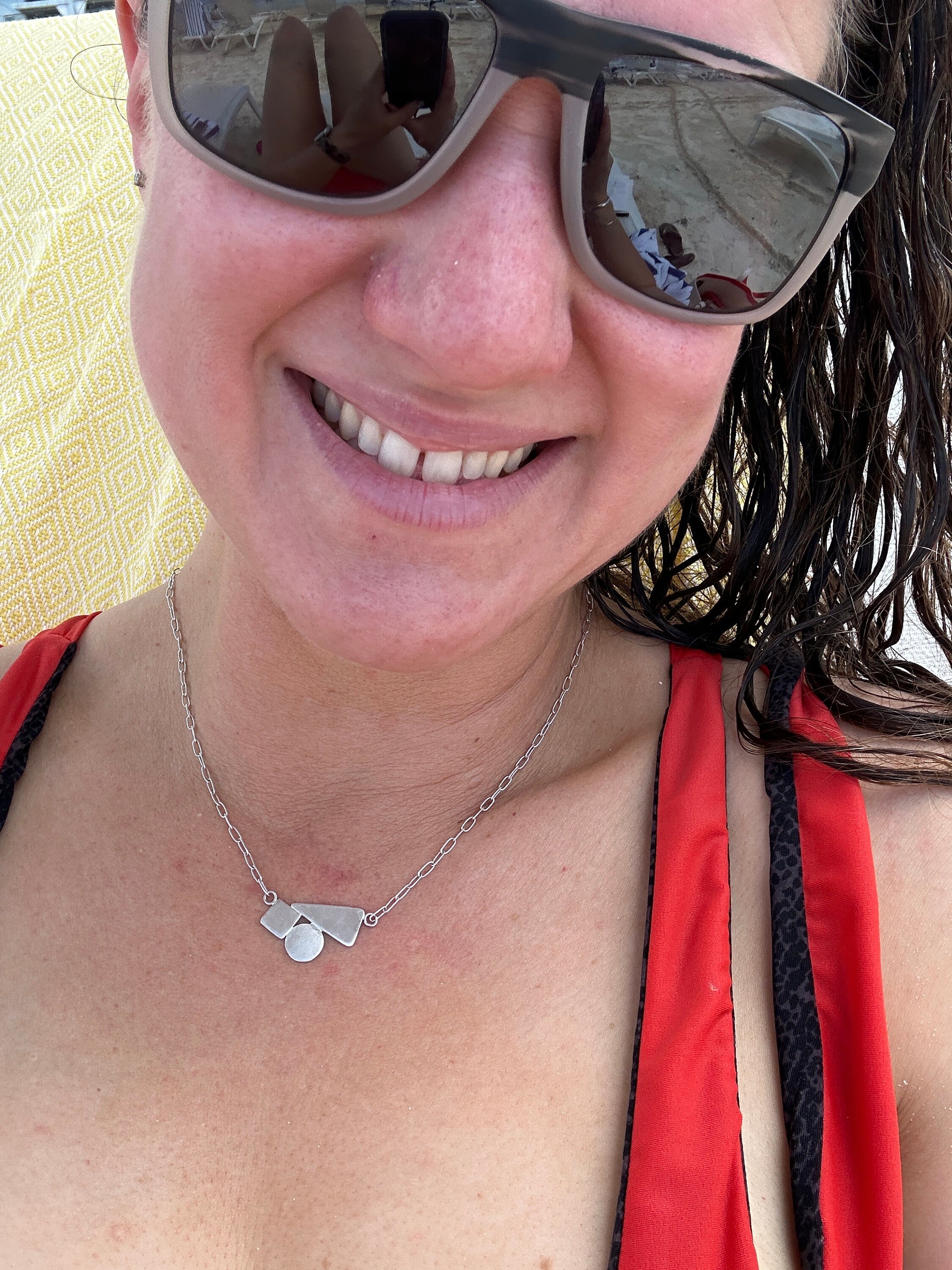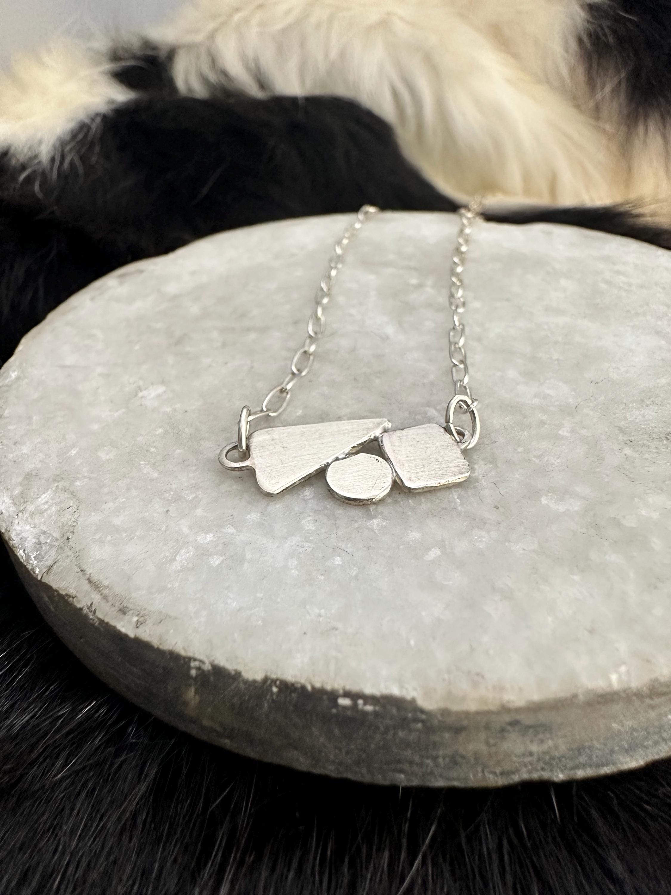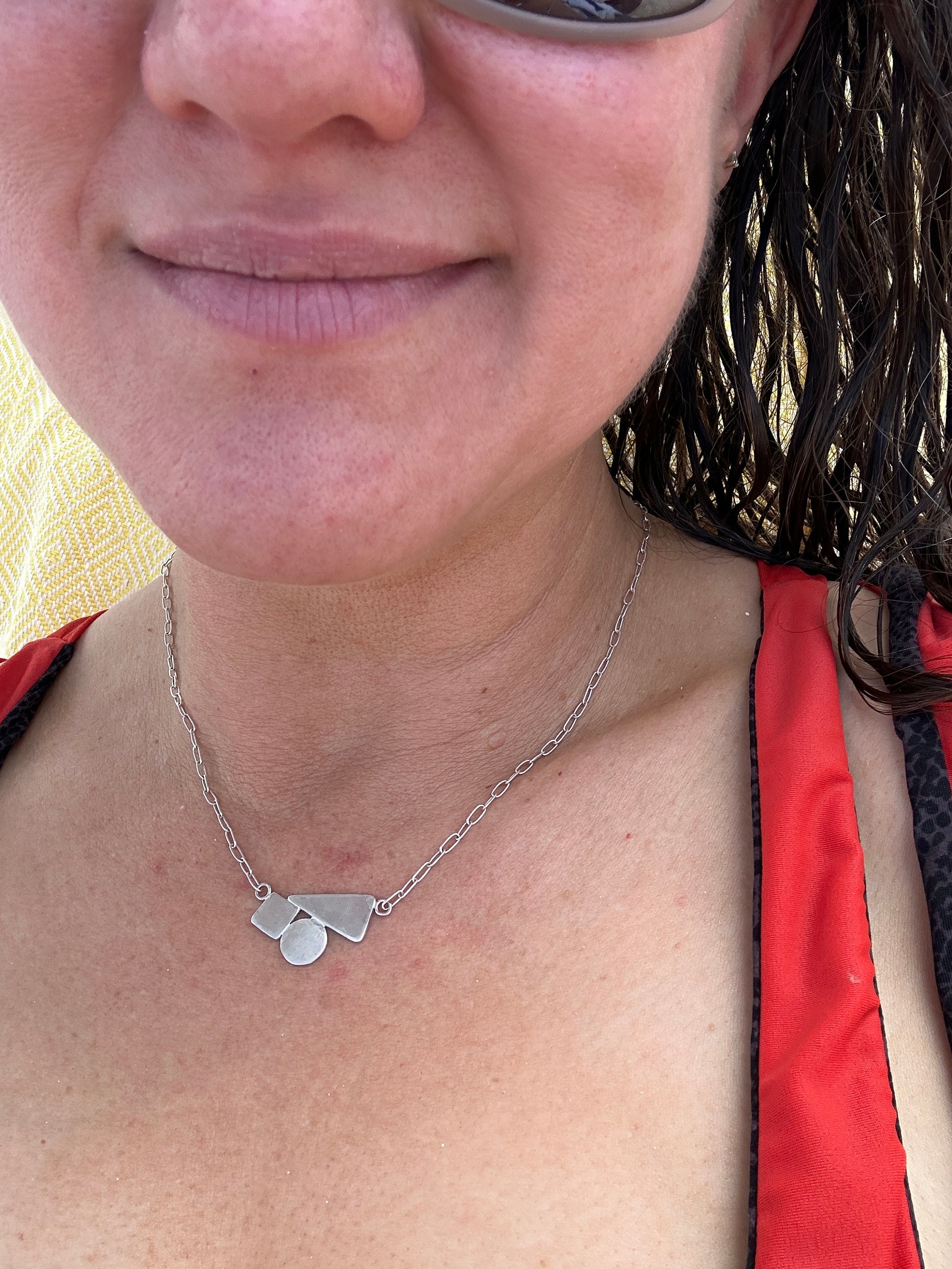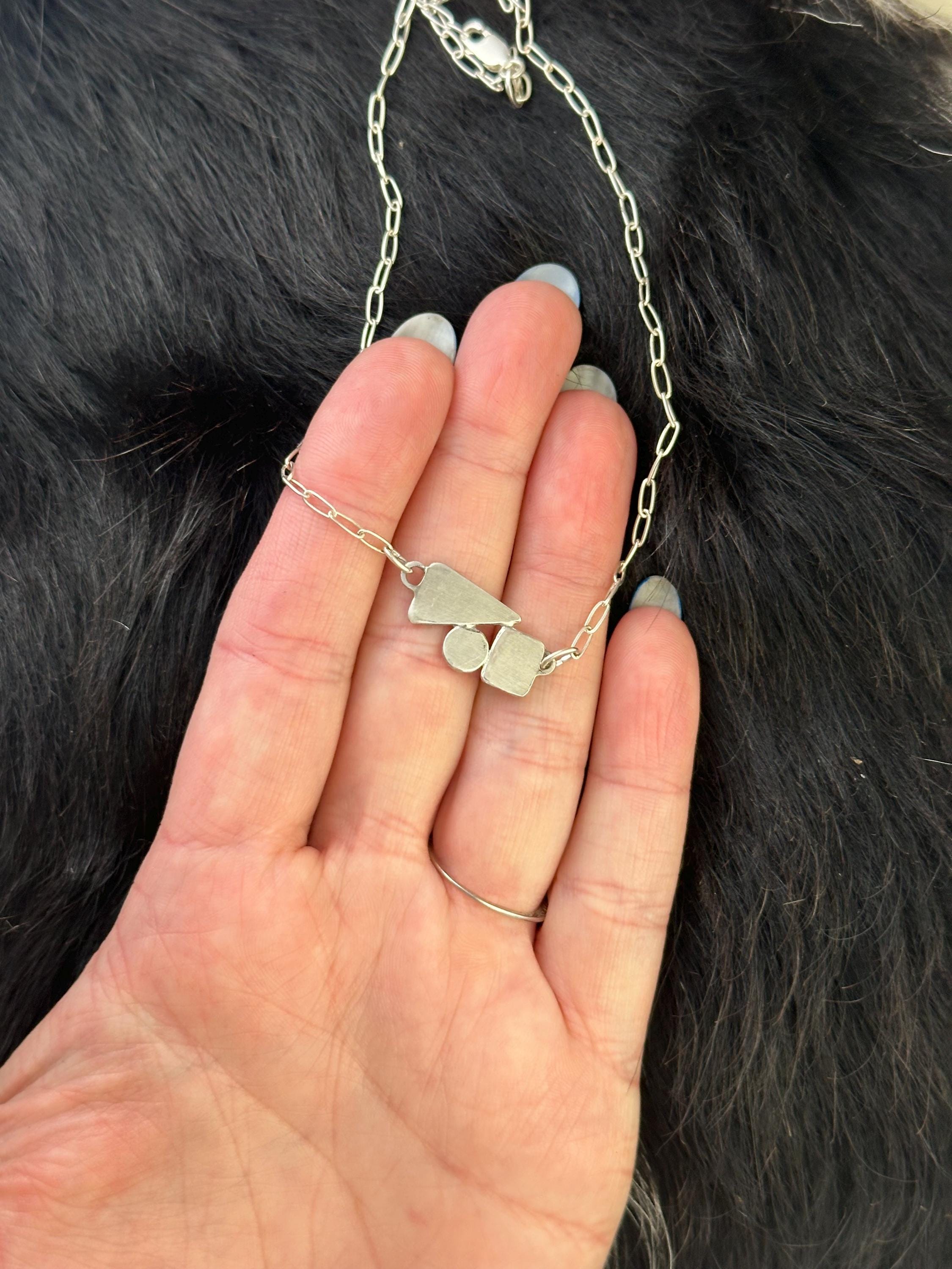 The chain is a delicate paper clip chain to compliment the geometric shapes.