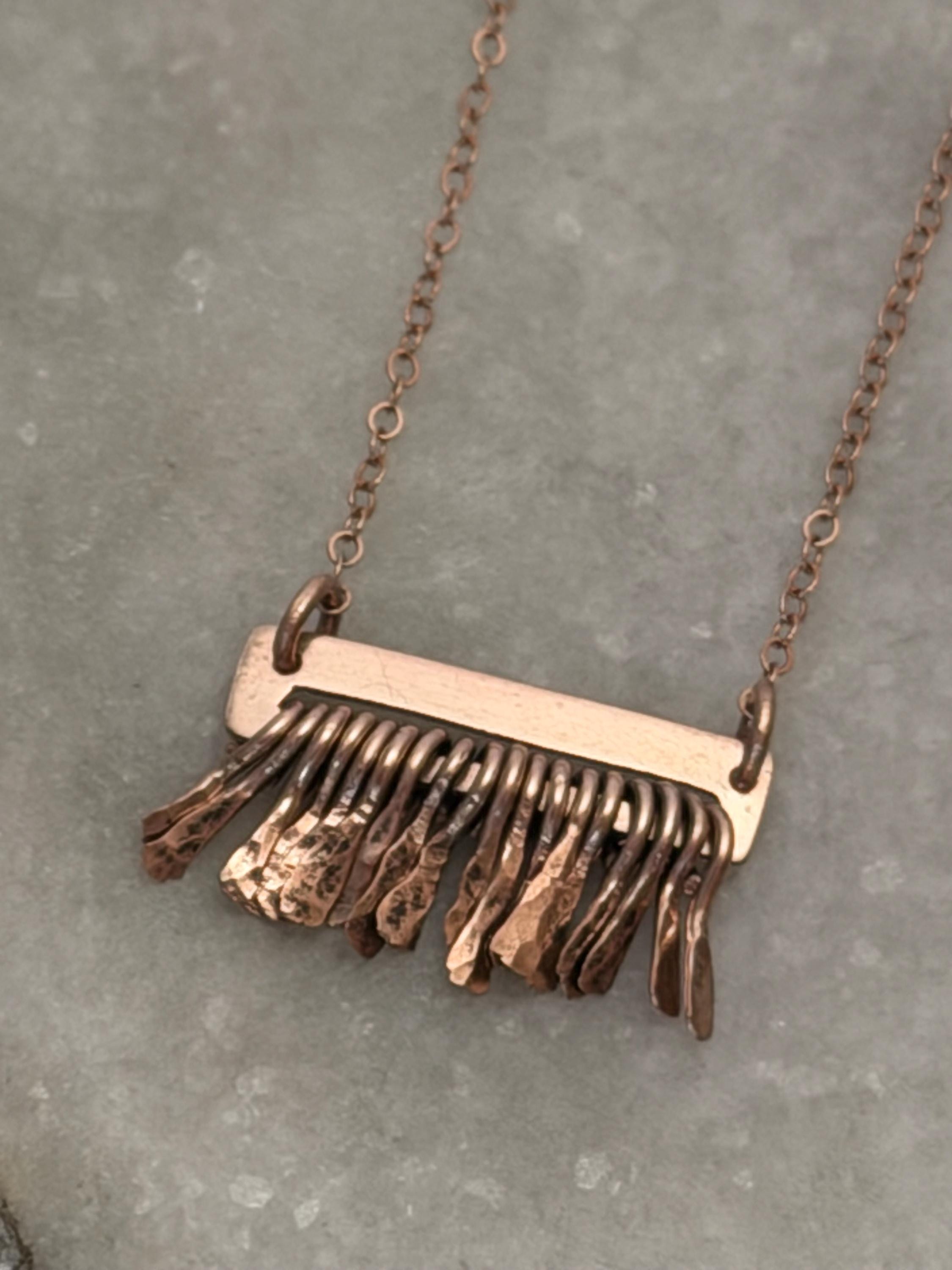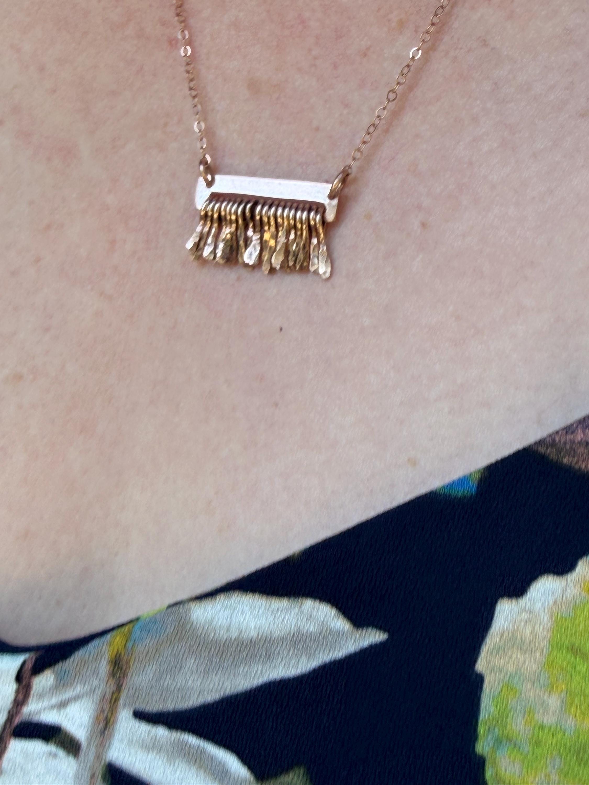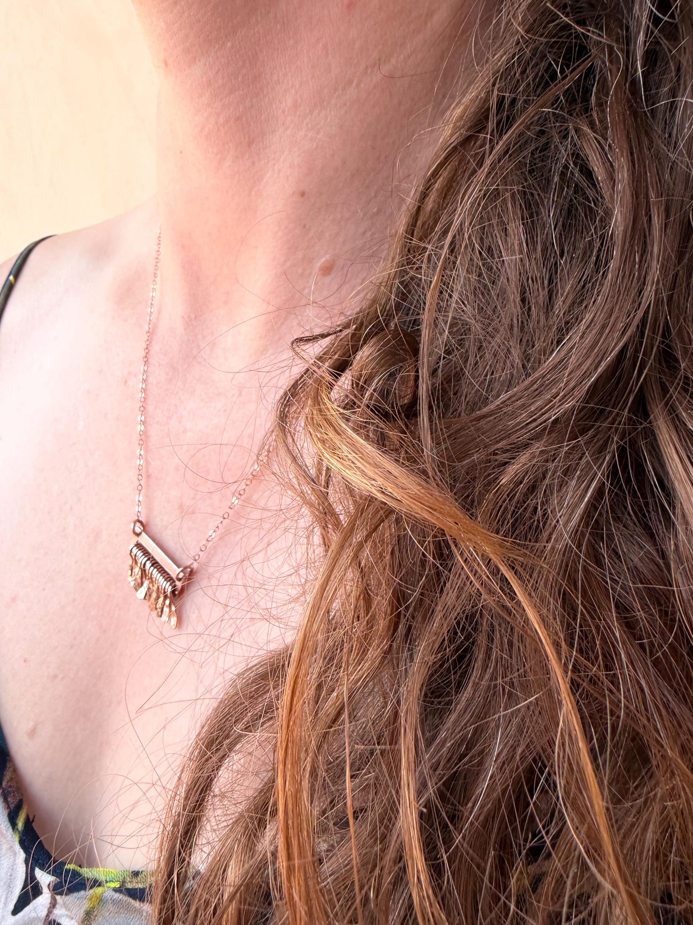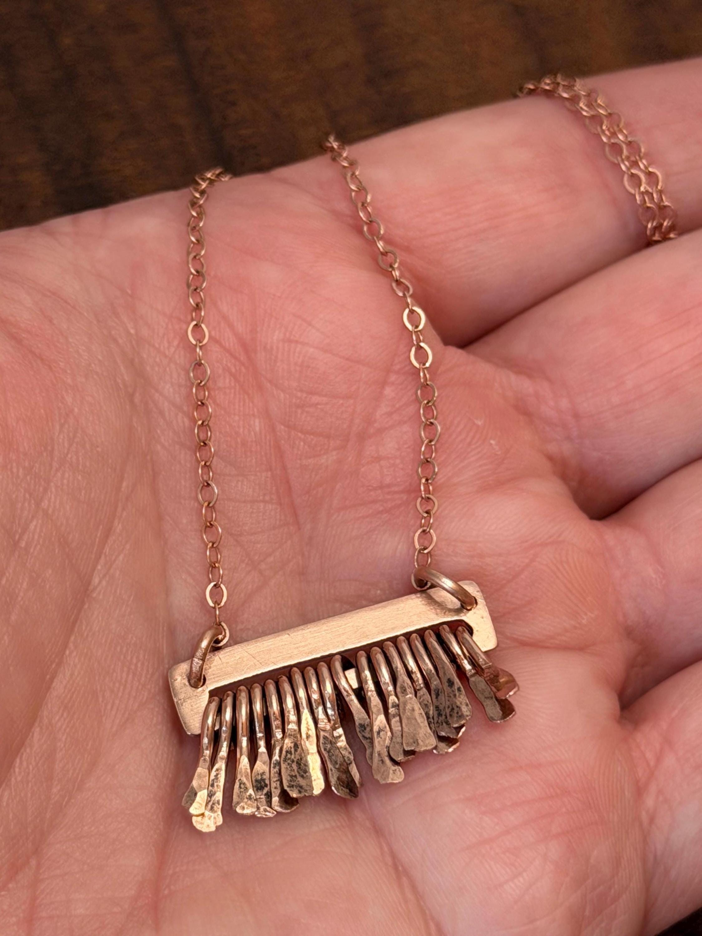 Made of 14k Rose Gold sheet metal and the same quality metal fringe finished on a delicate gold fill metal chain.