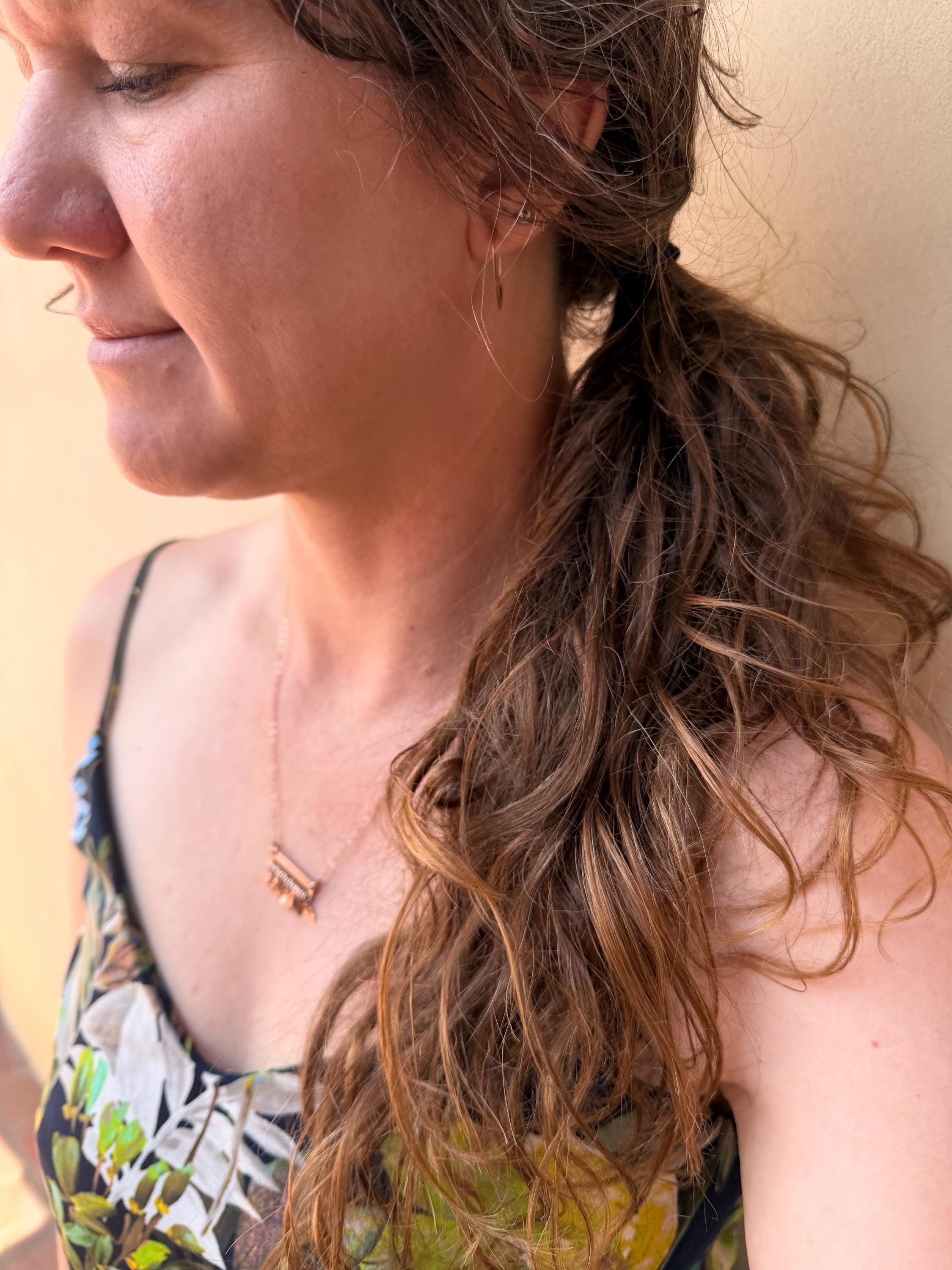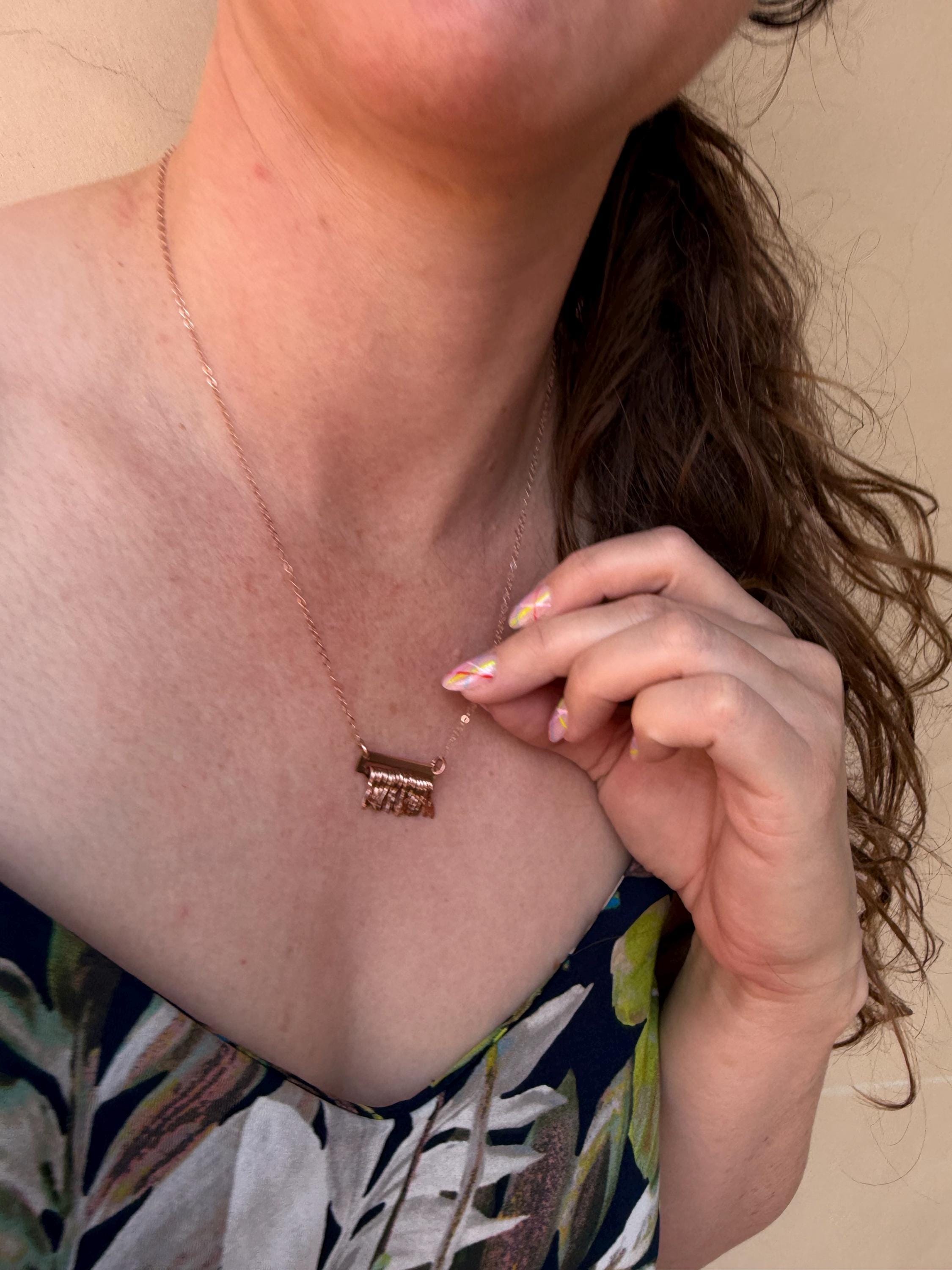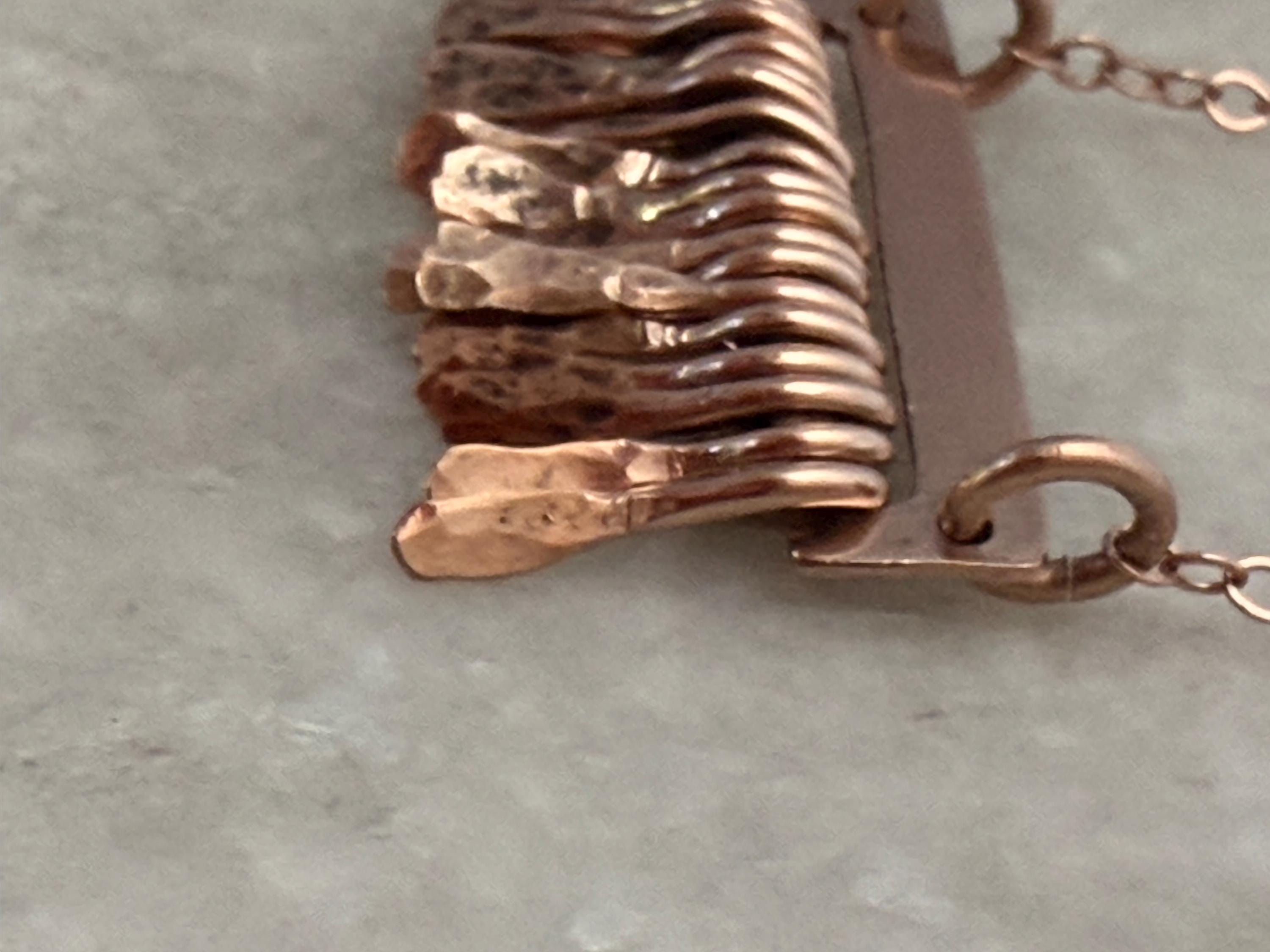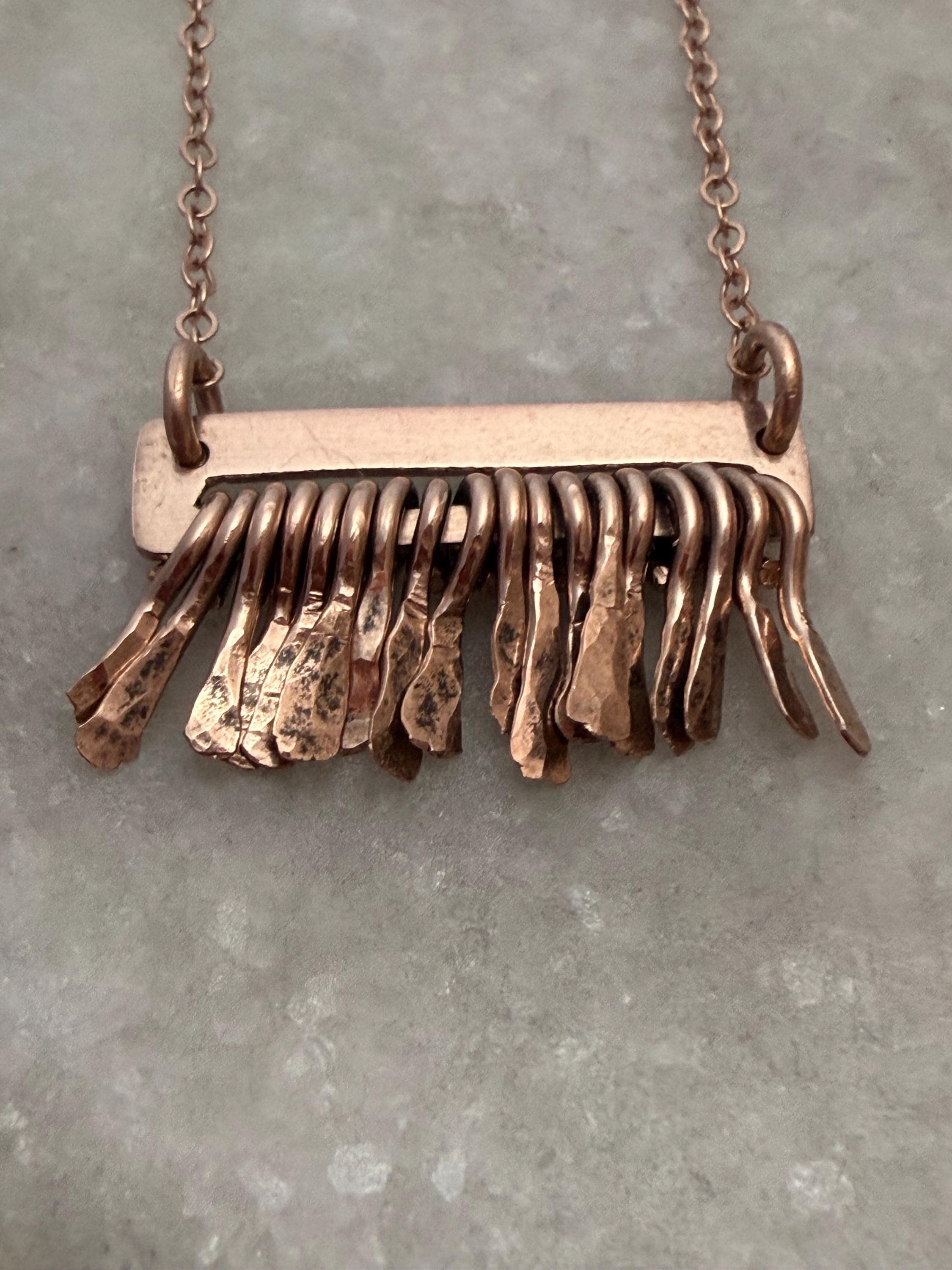 Made of 14k Rose Gold sheet metal and the same quality metal fringe finished on a delicate gold fill metal chain.
