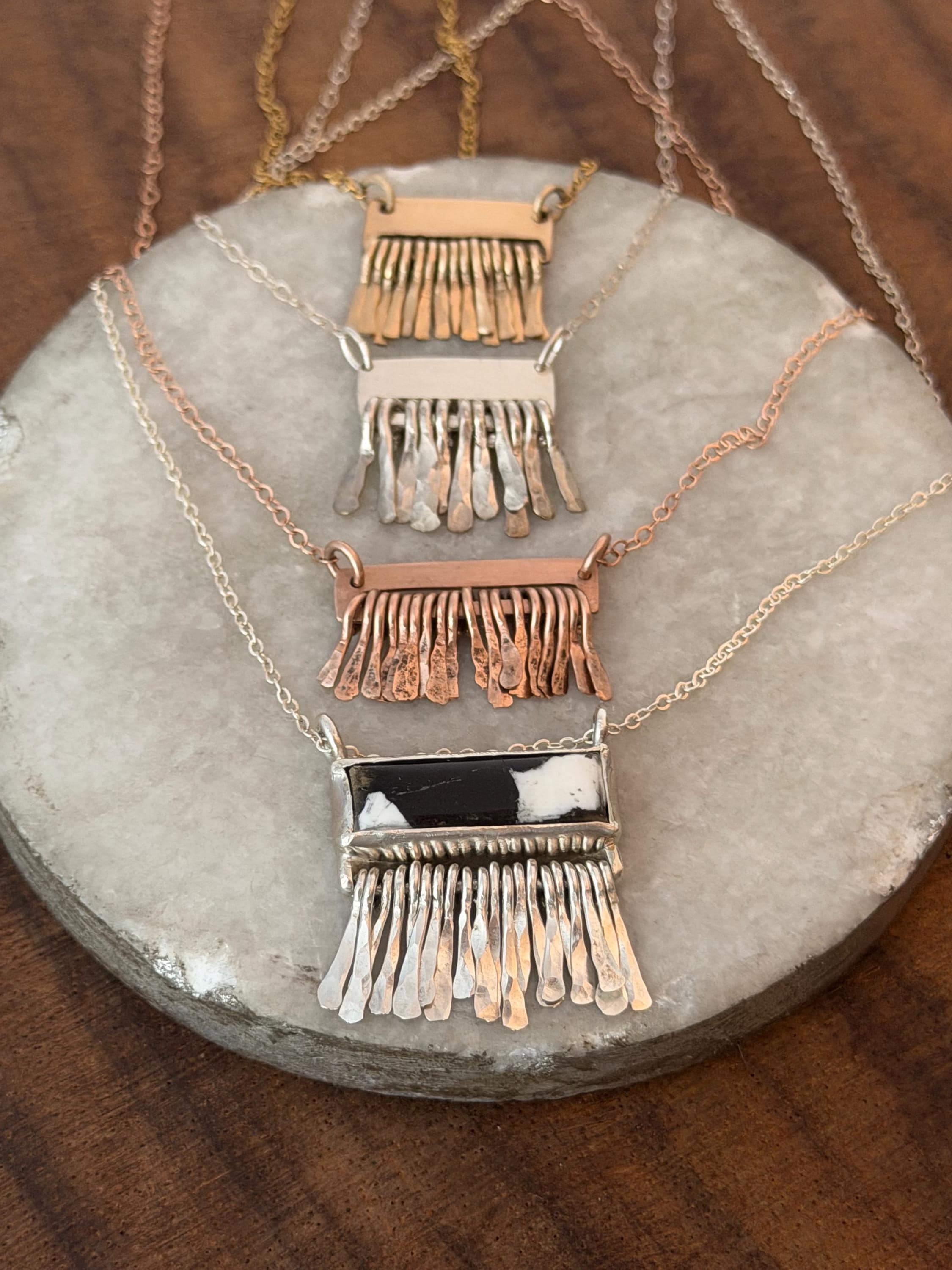 This necklace is an part of my collection I call "Vivian". The metal fringe is my interpretation of the festive nature of the Fiestas celebration on the Central Coast of California where there is dance, clothing with fringe, movement and jovial spirits.