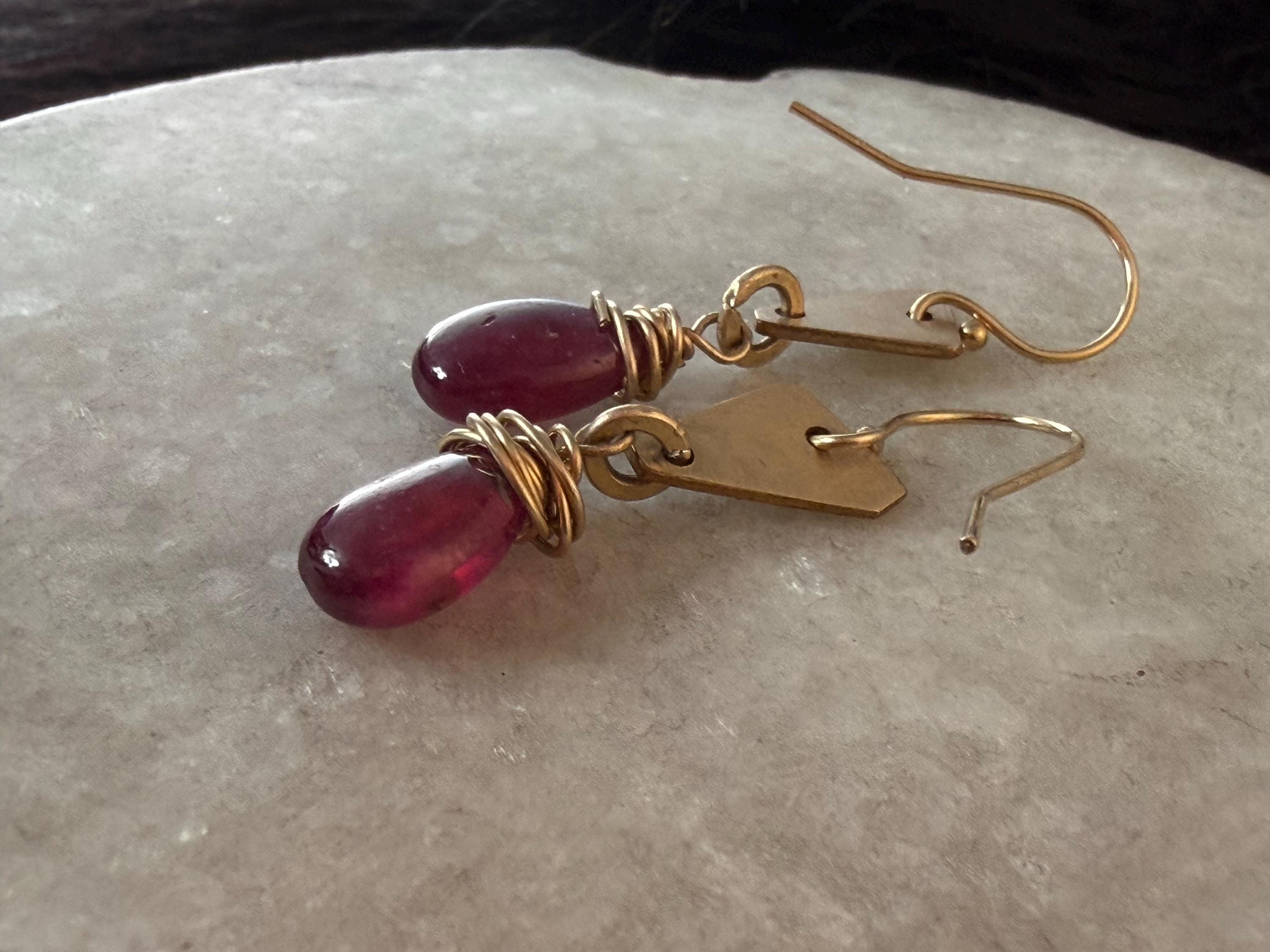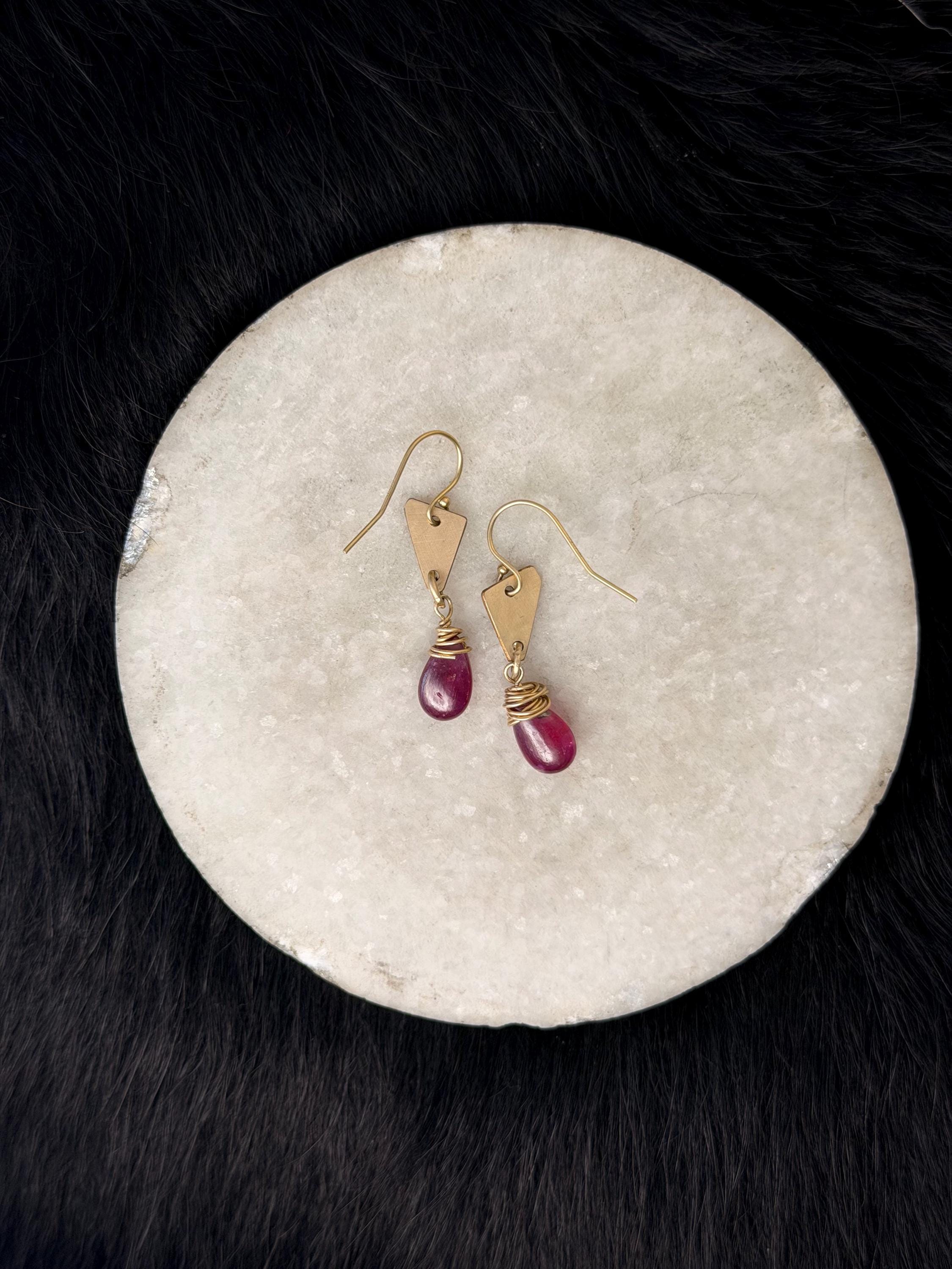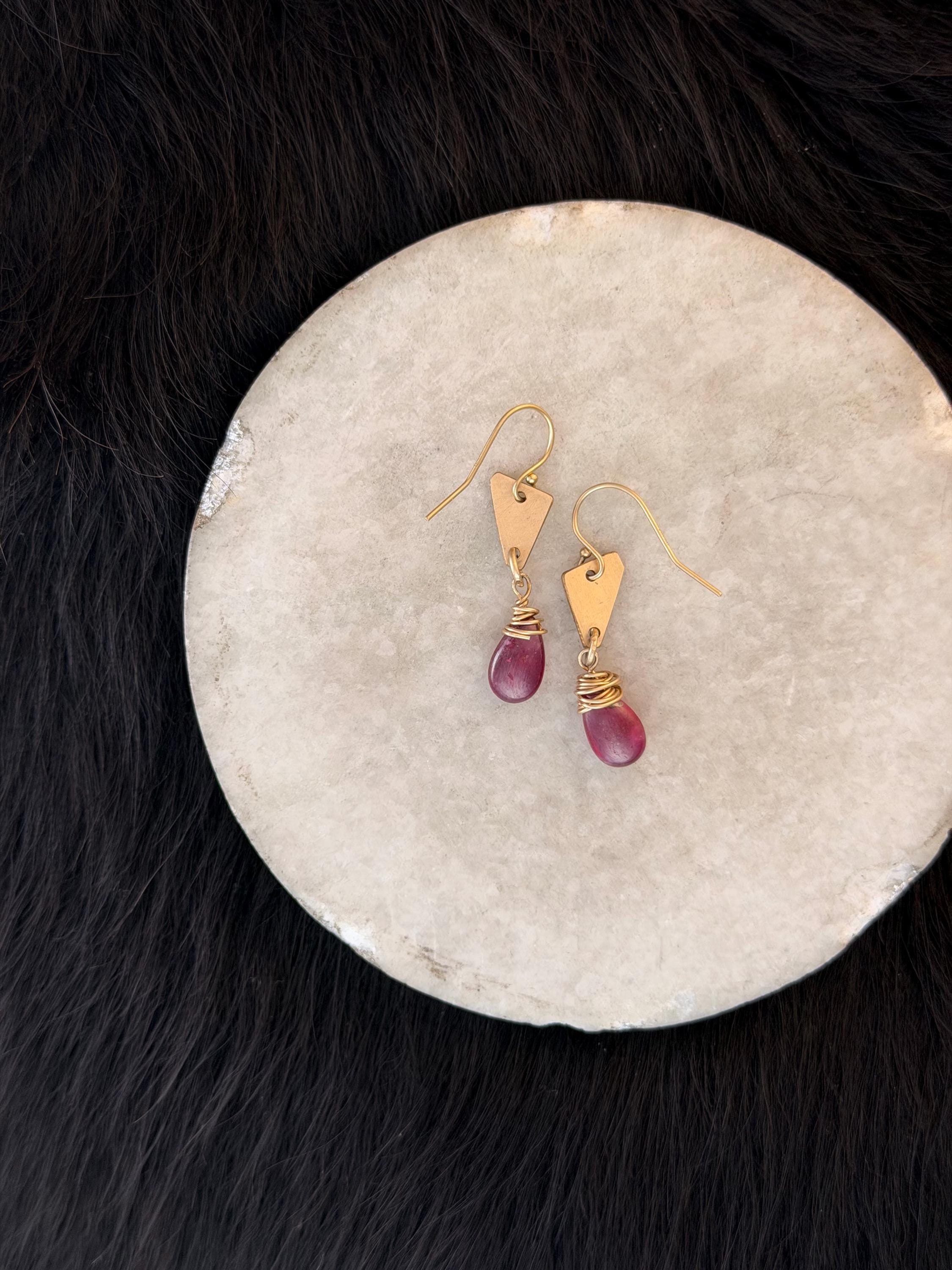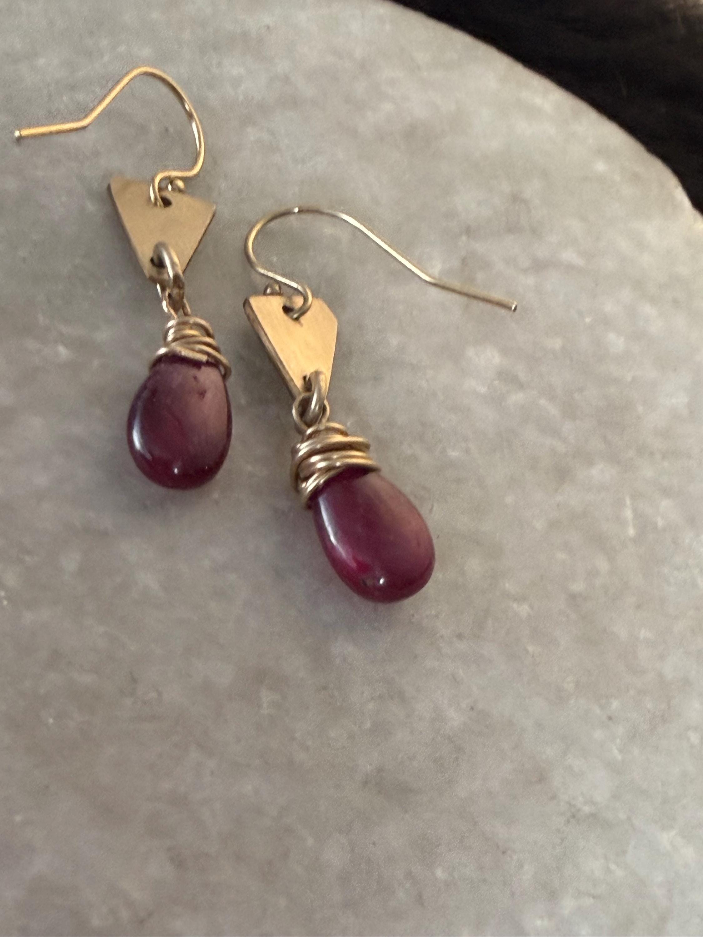 The "Josie" earring, handcut and refined 14k GF triangle shape, a red ruby teardrop shaped bead and a sterling silver hook.