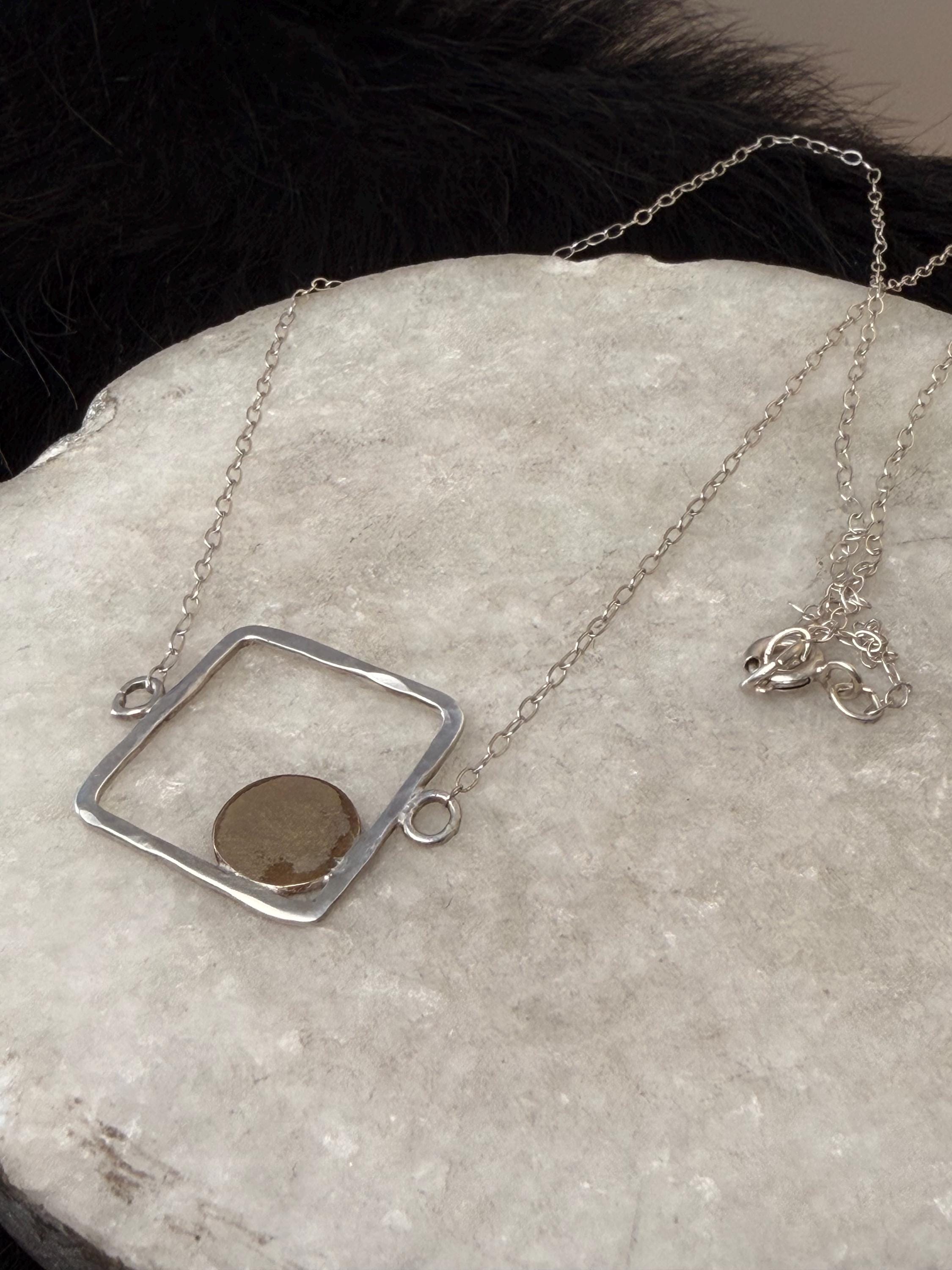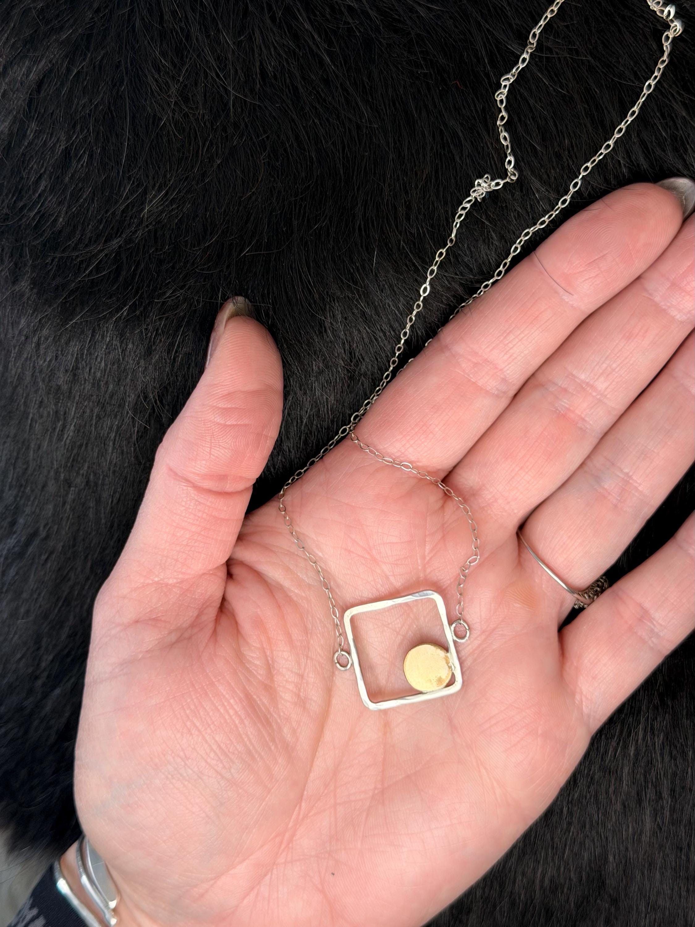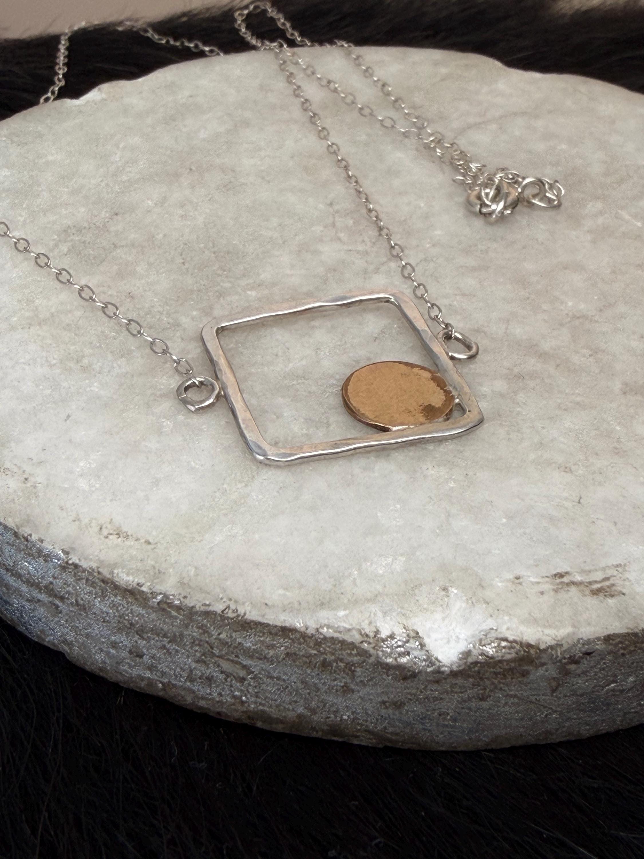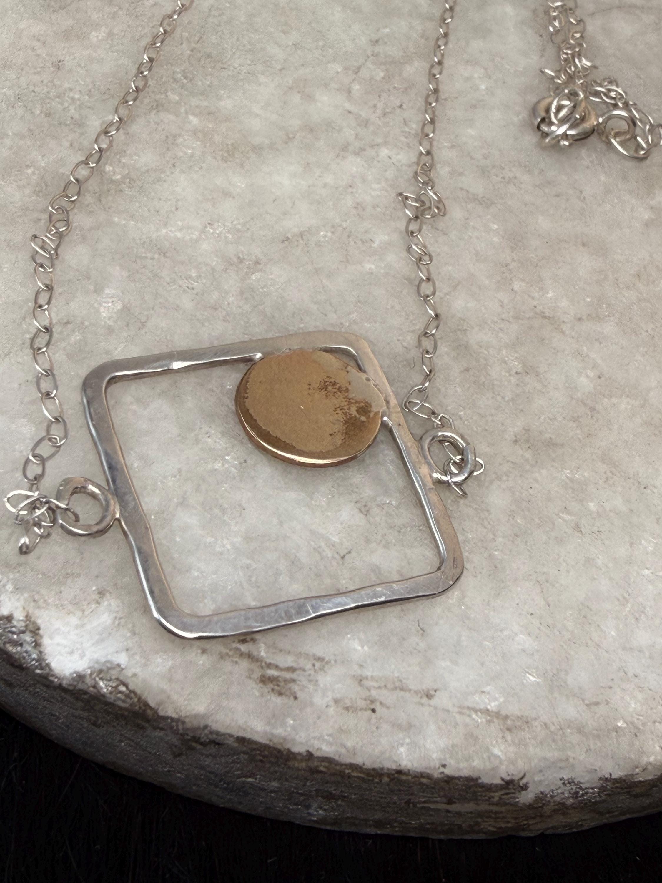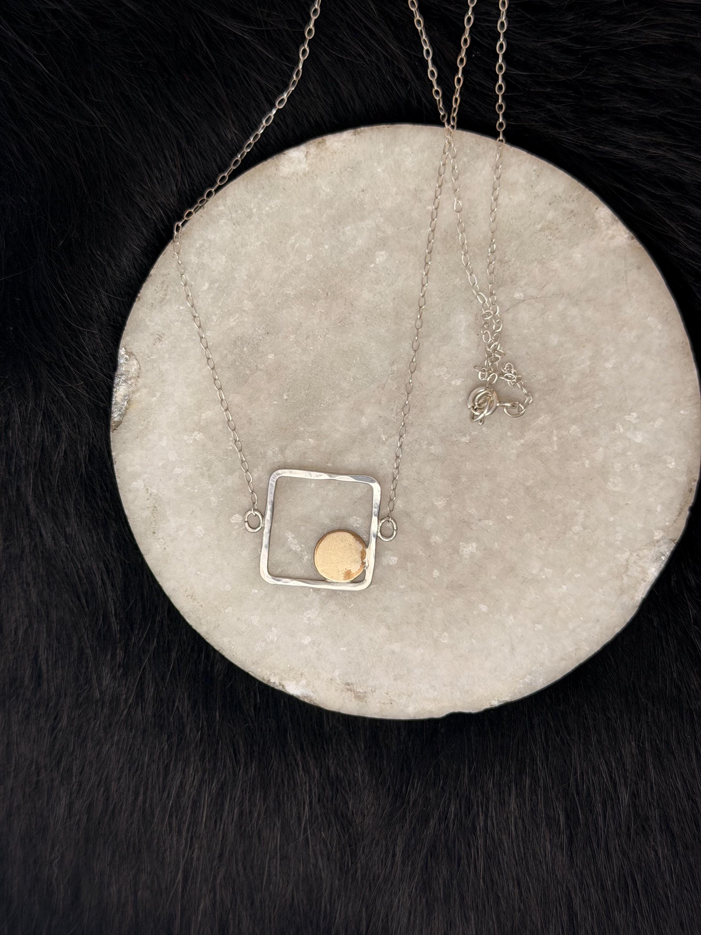 Materials: sterling silver cable chain, hammered sterling square and 14k gold-fill circle