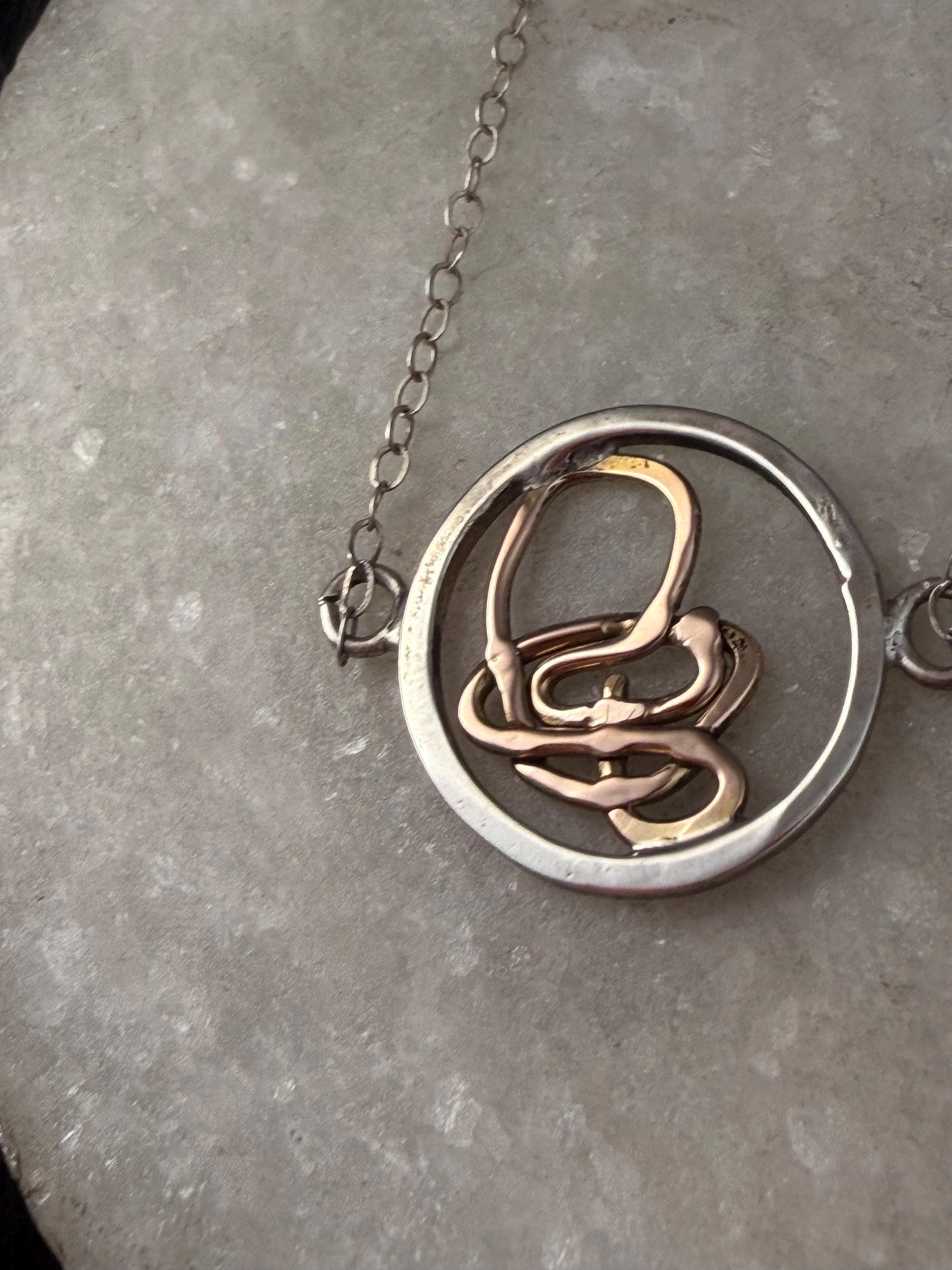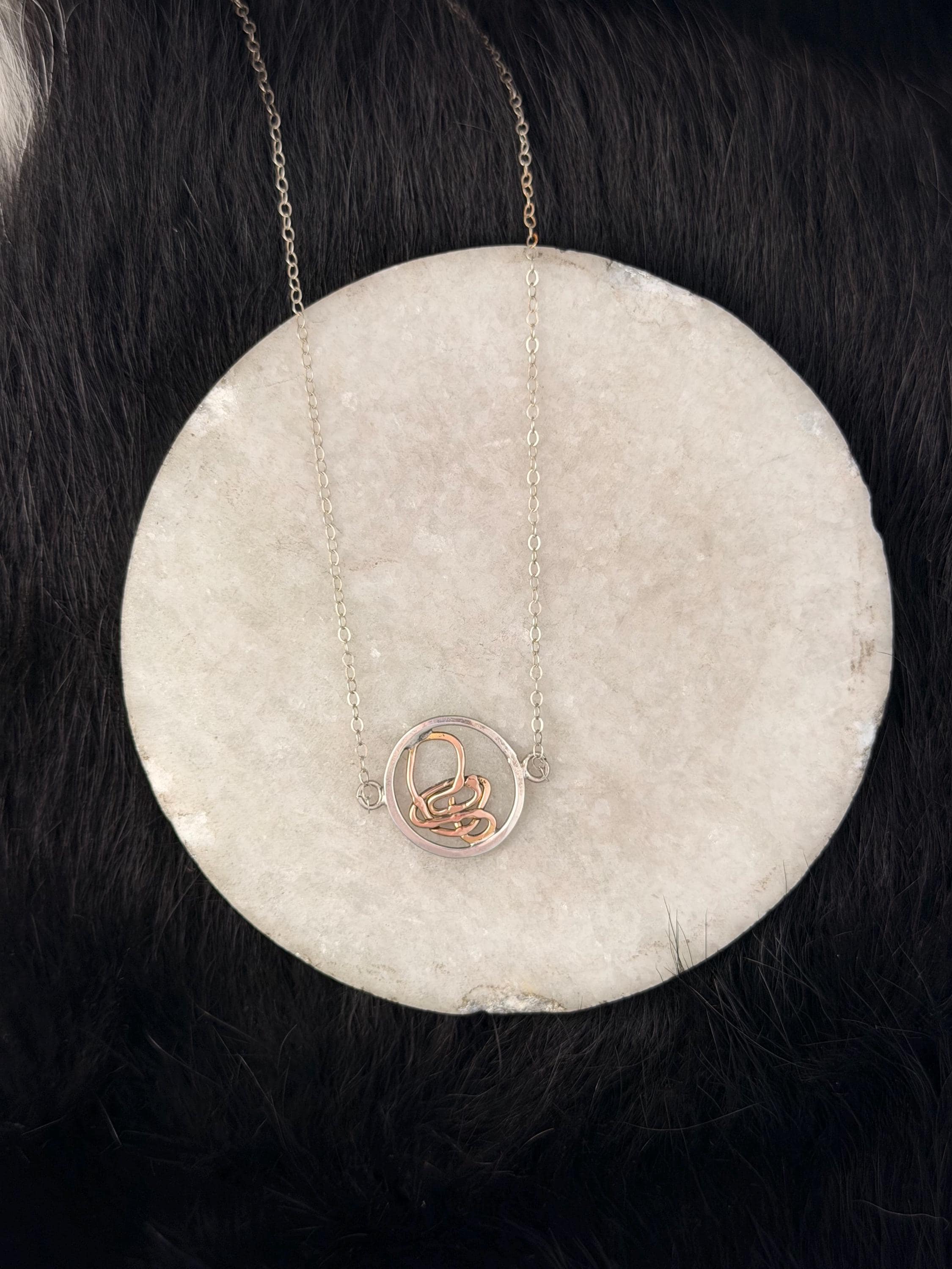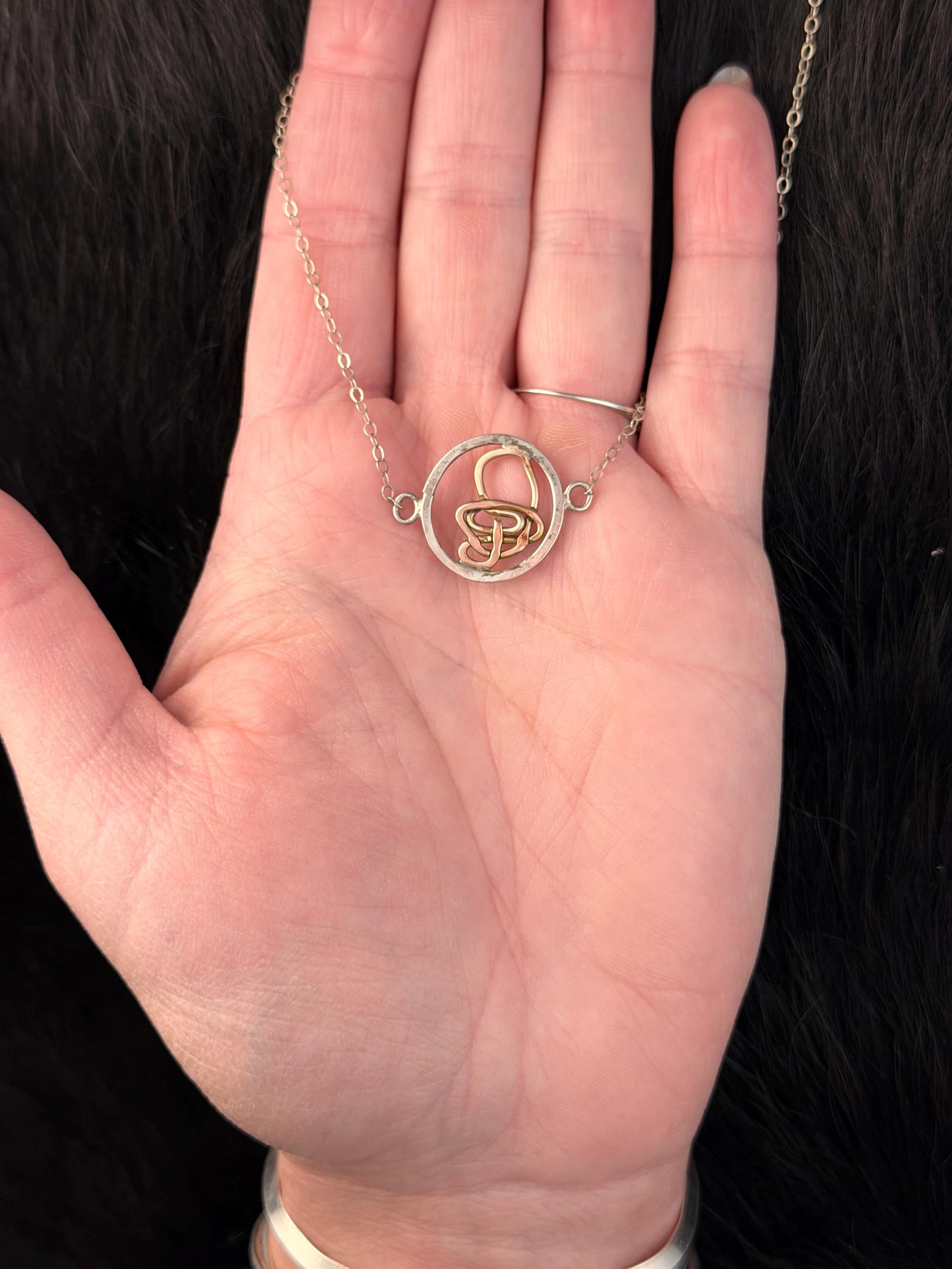 Rosa necklace consists of a circle of sterling silver with a sculpted 14k rose gold metal shape that resembles an abstract rose, hence the name.