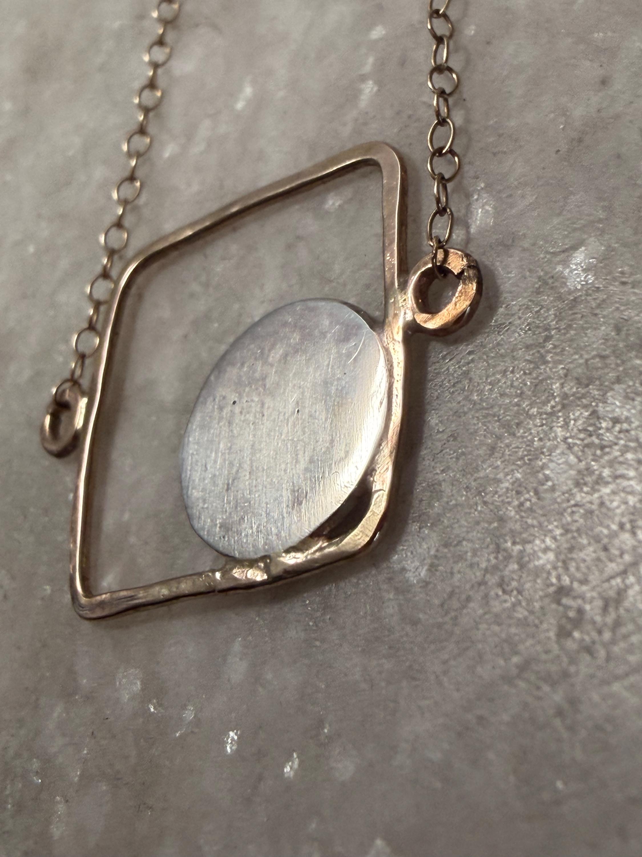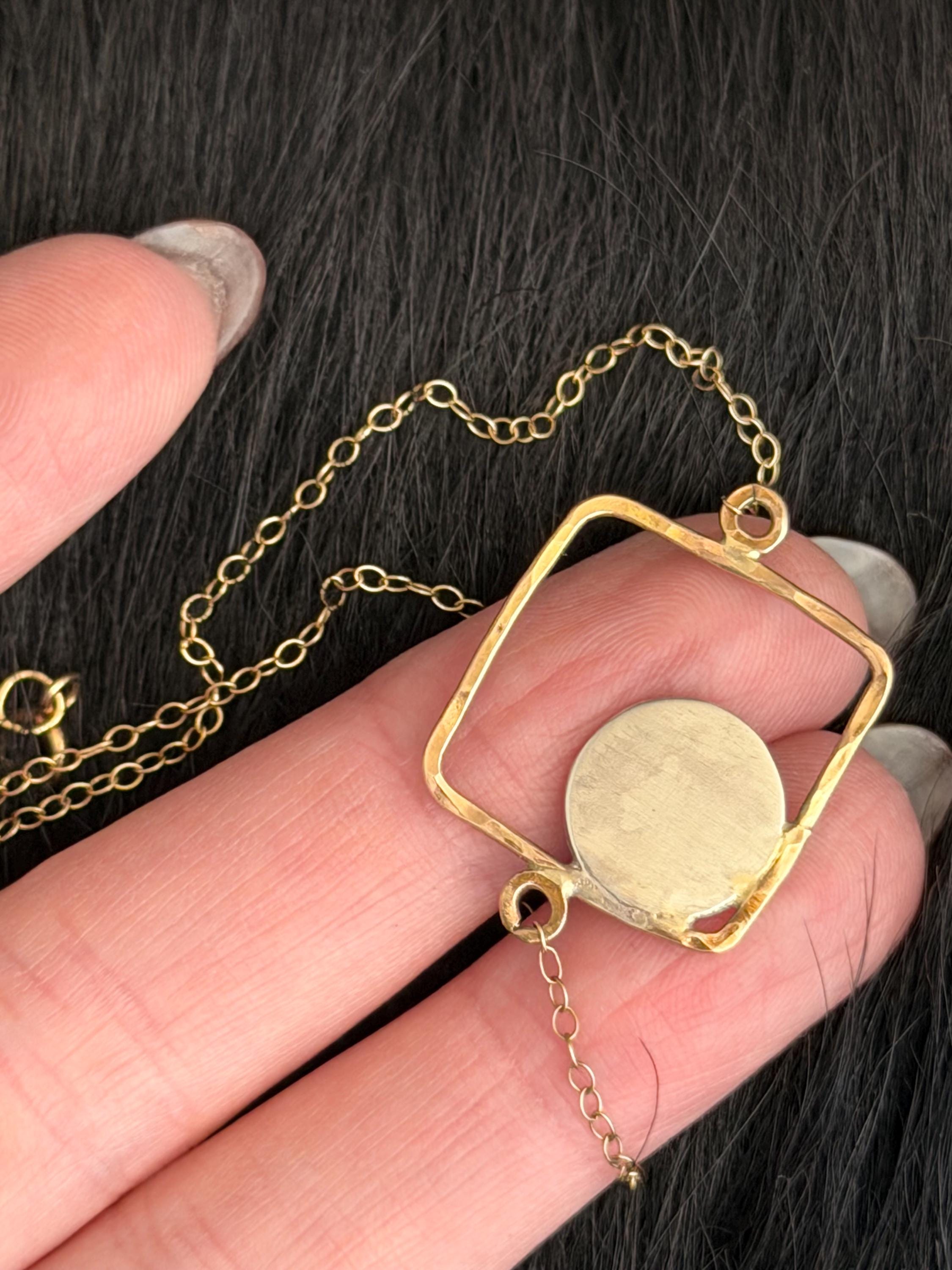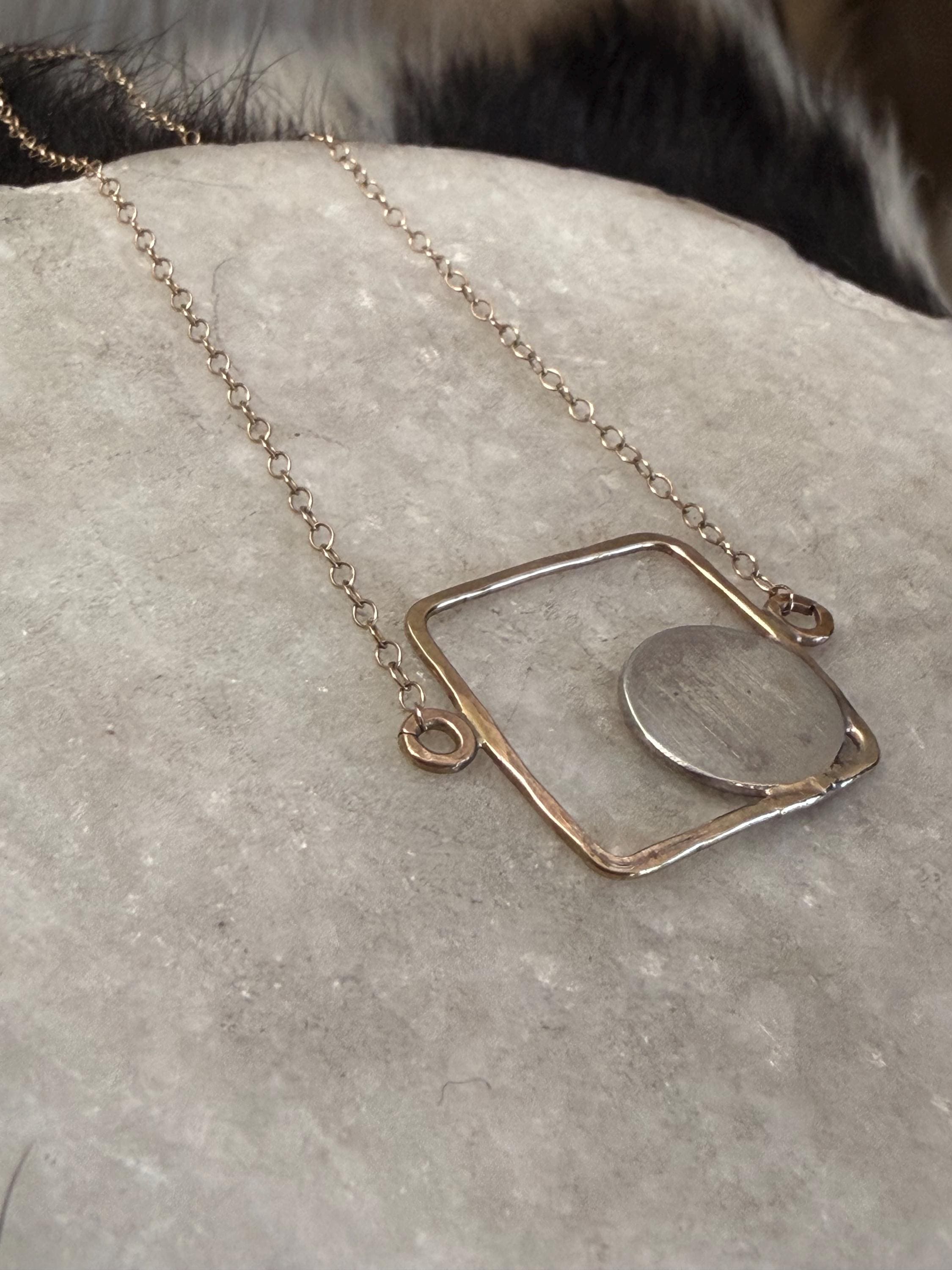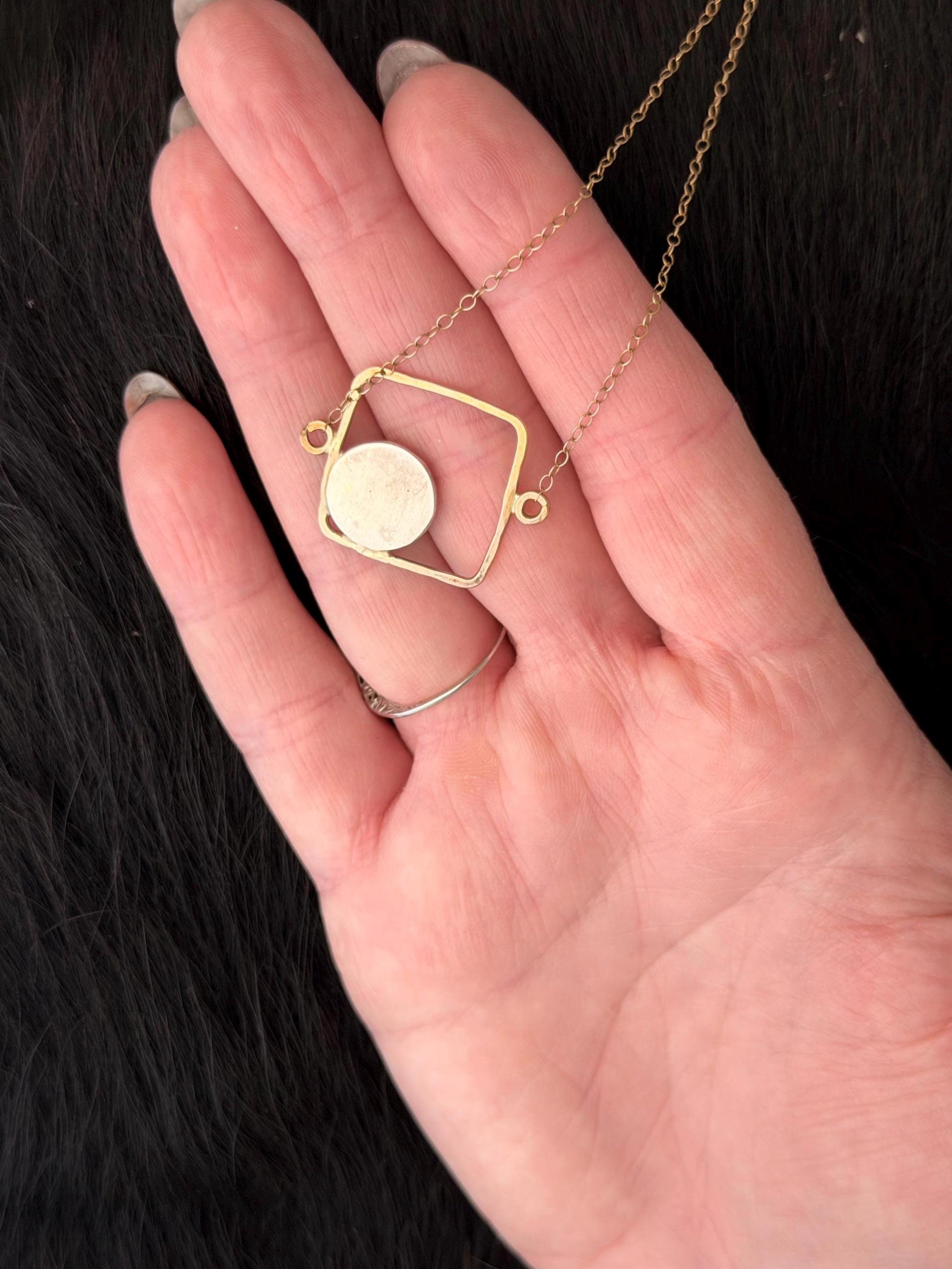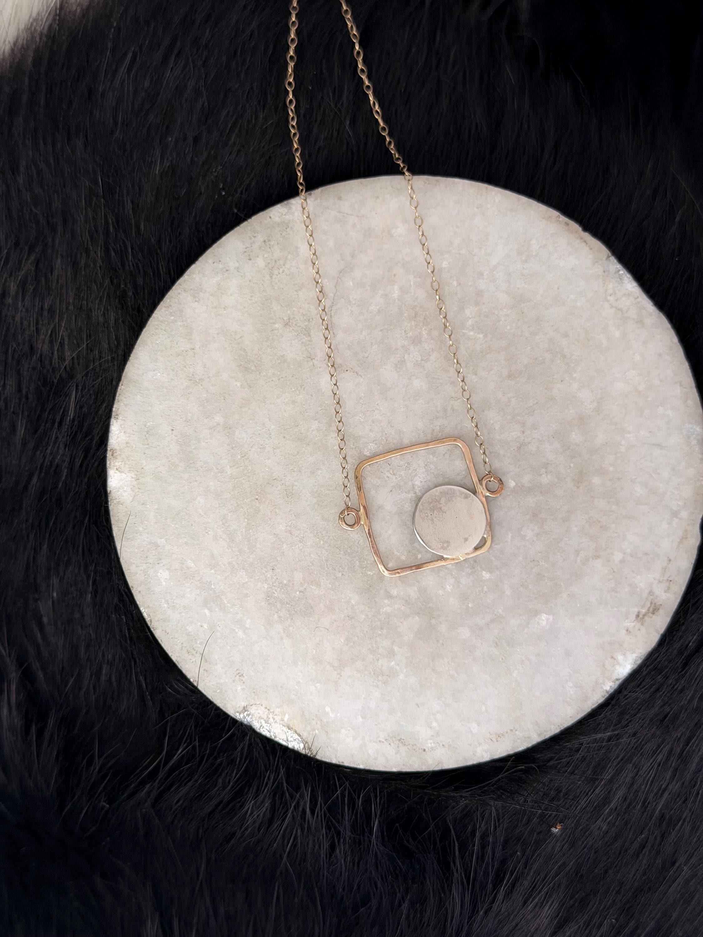 Materials: 14k Gold Fill cable chain, hammered sterling square and silver circle