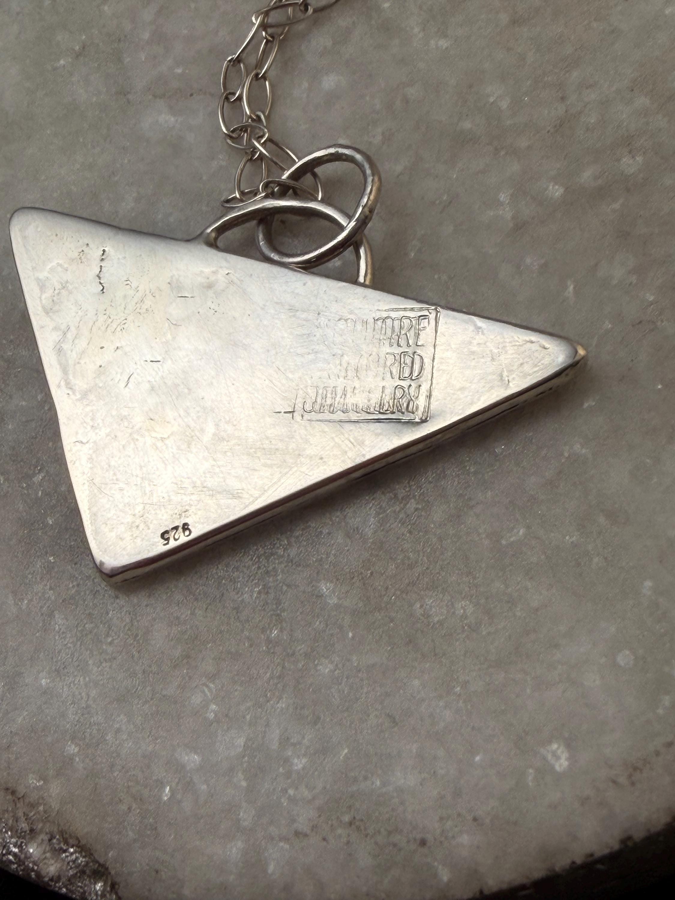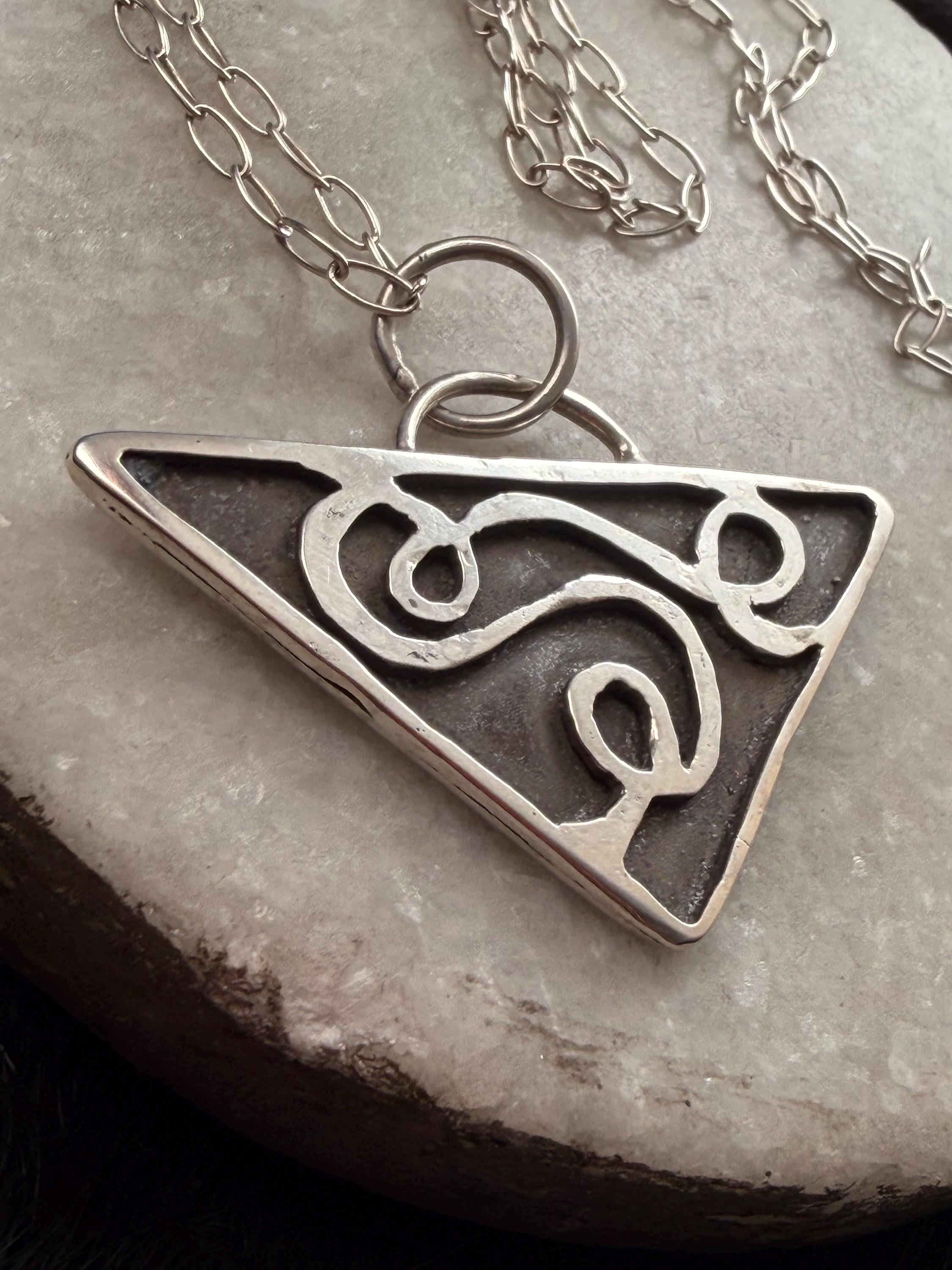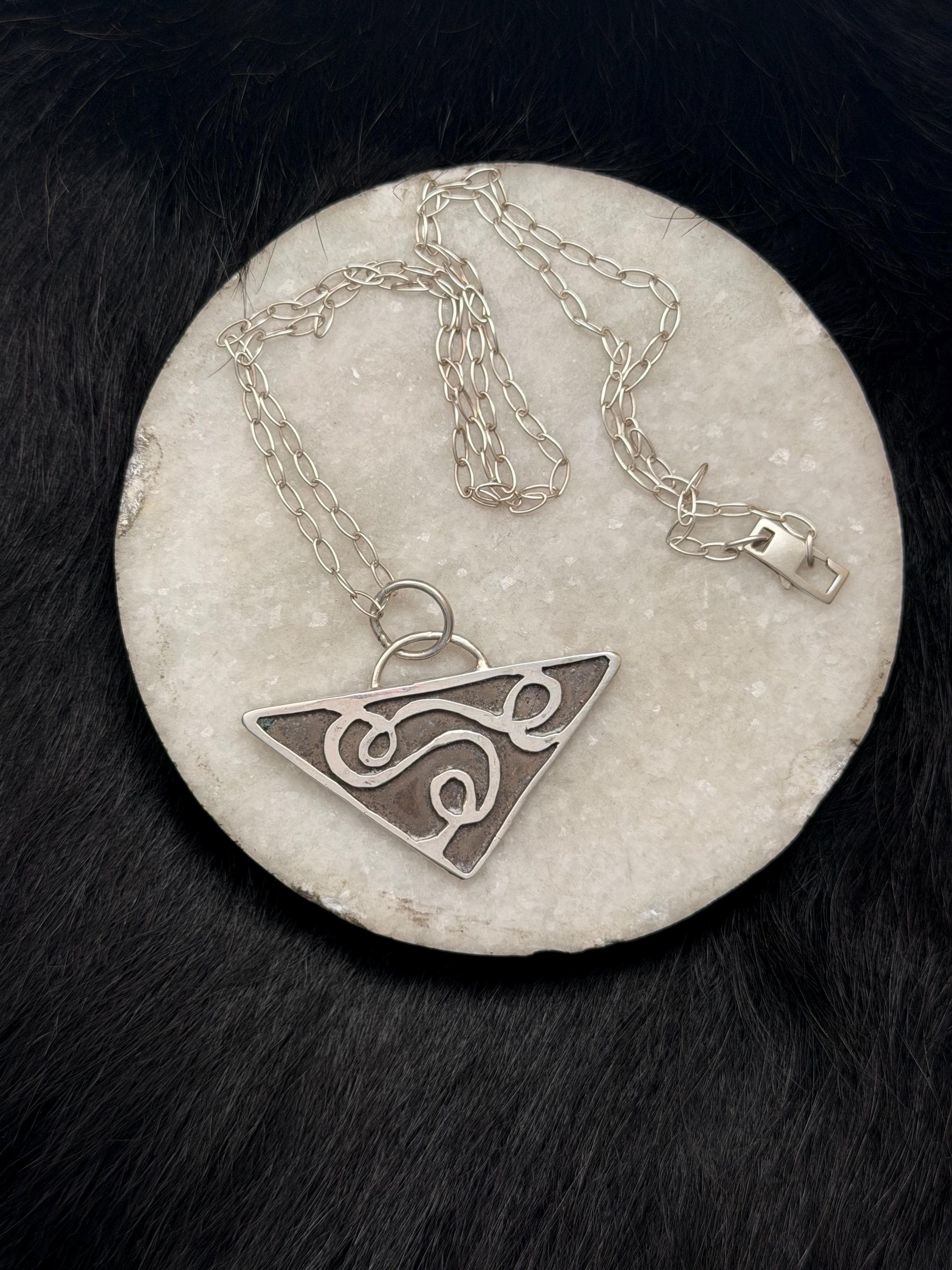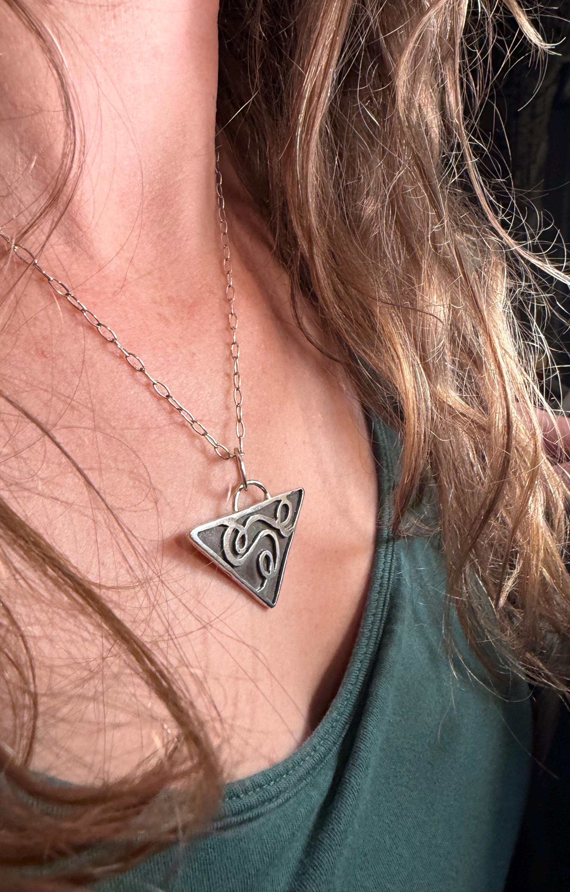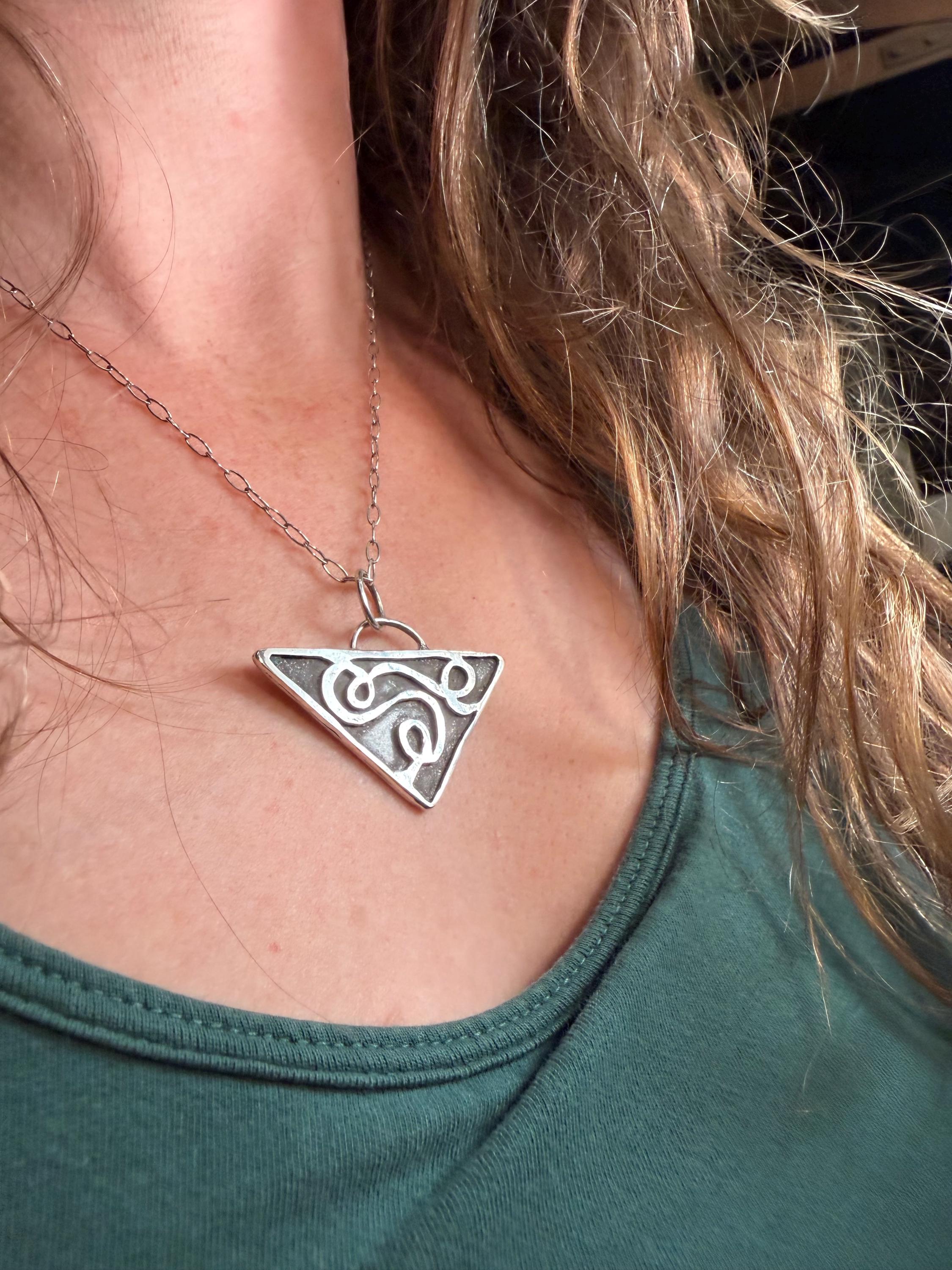 The "Eloise" necklace pendant exhibits free formed swirling shapes accented with a dark background on a Triangle shape.
