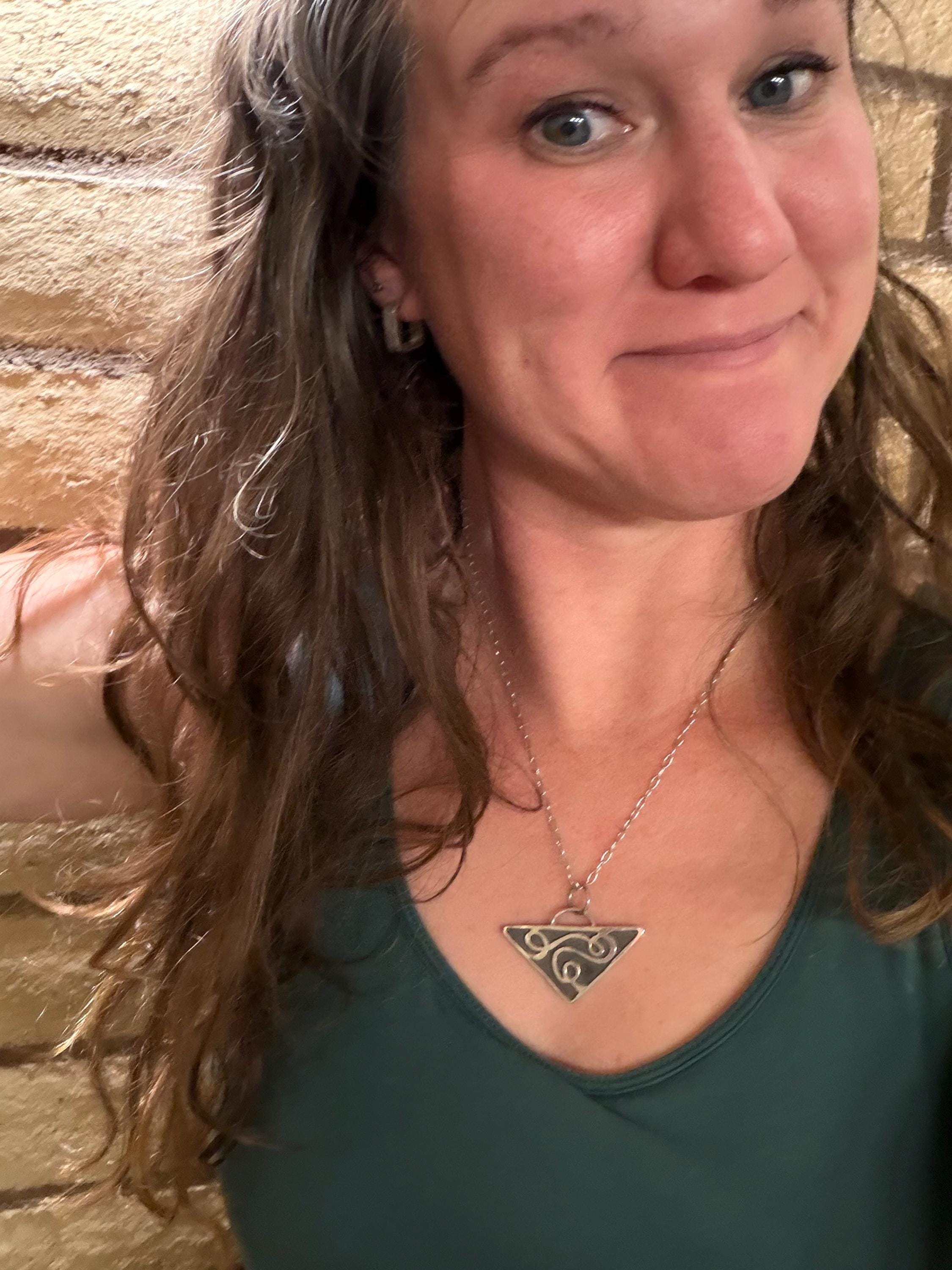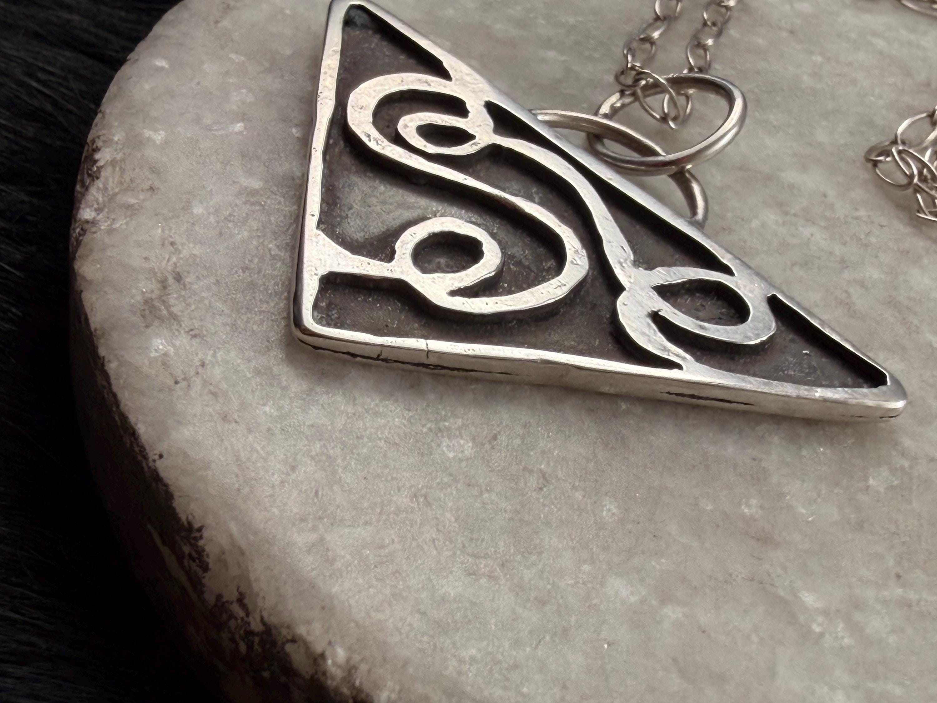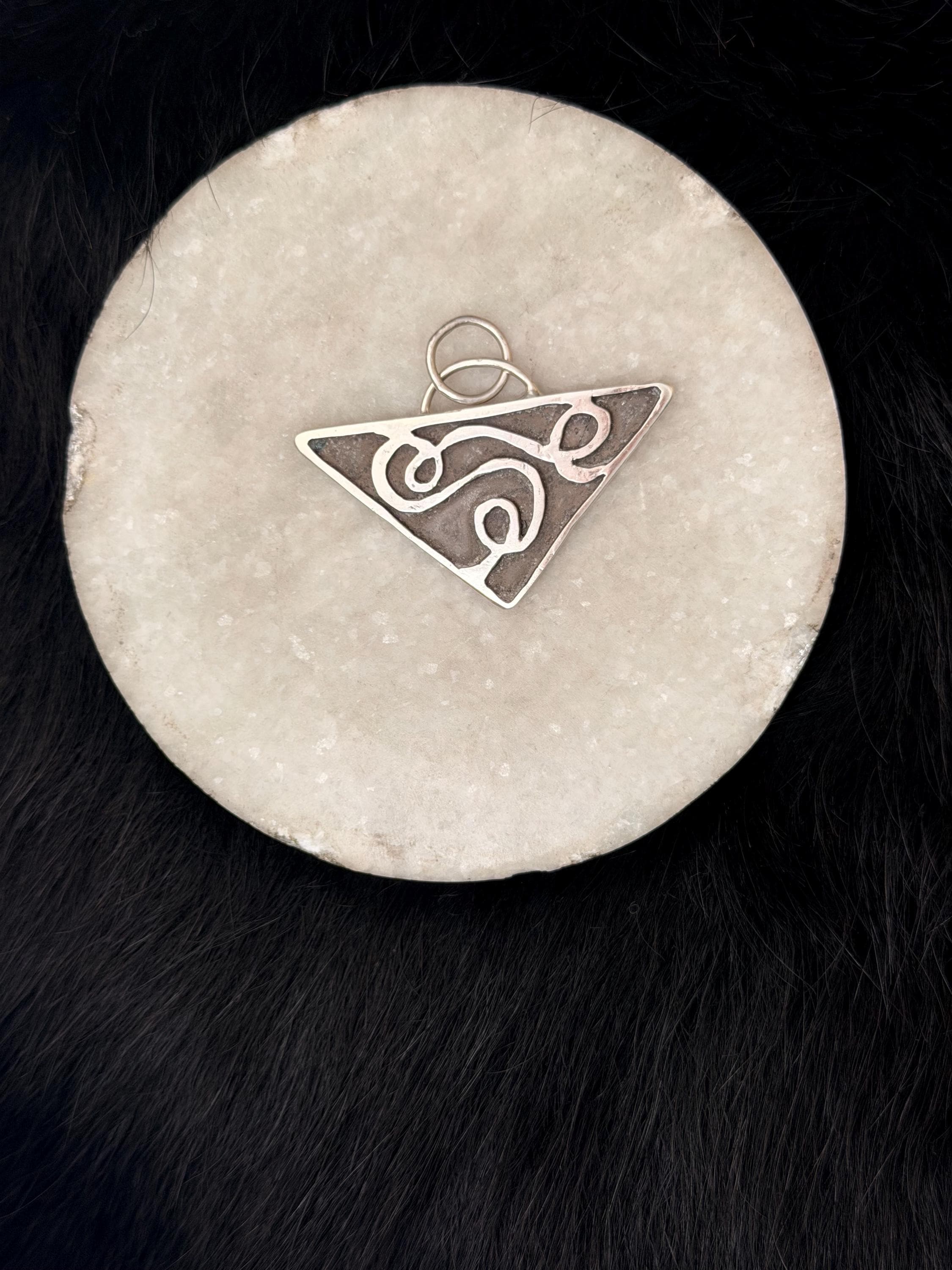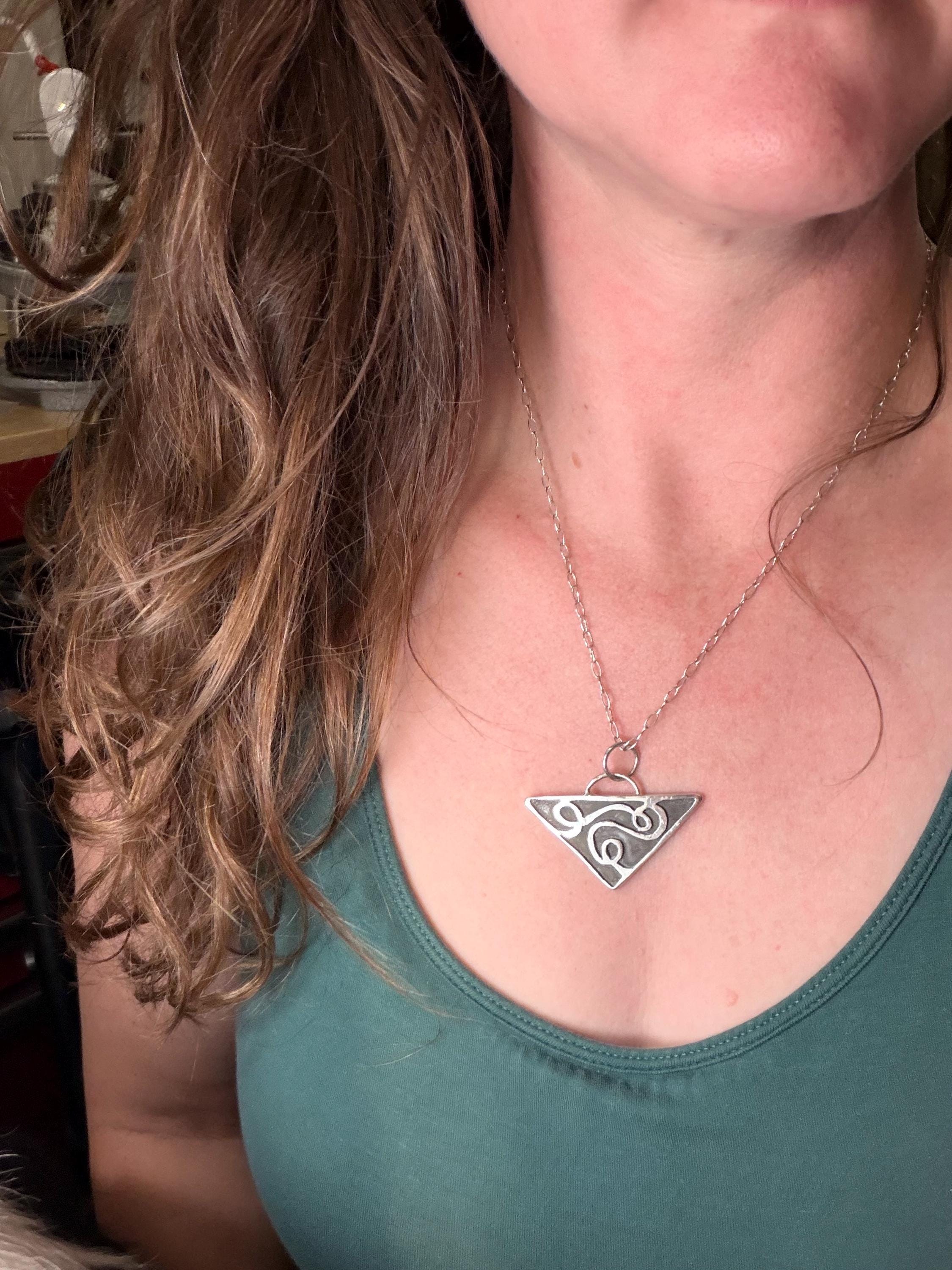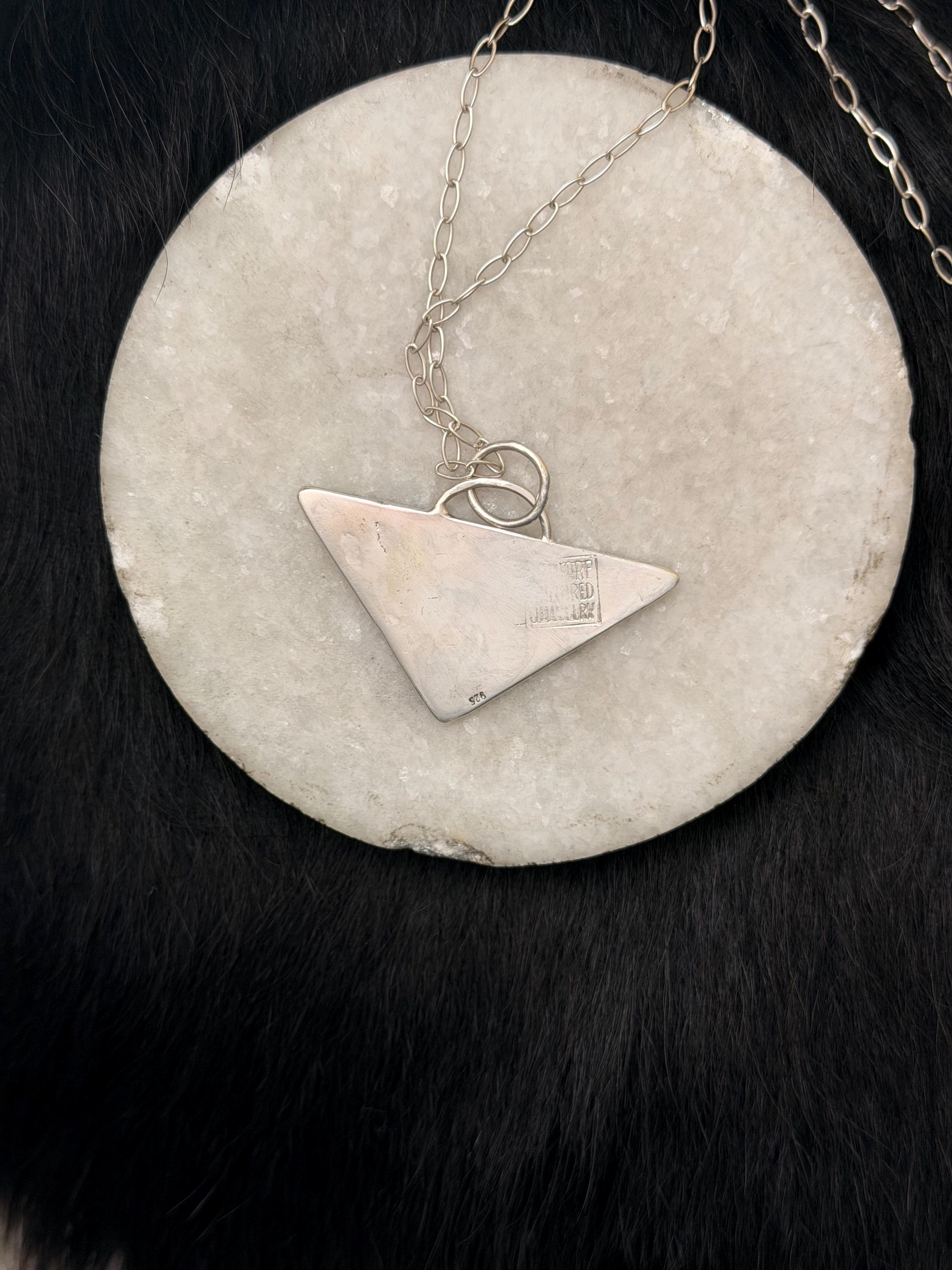 The "Eloise" necklace pendant exhibits free formed swirling shapes accented with a dark background on a Triangle shape.