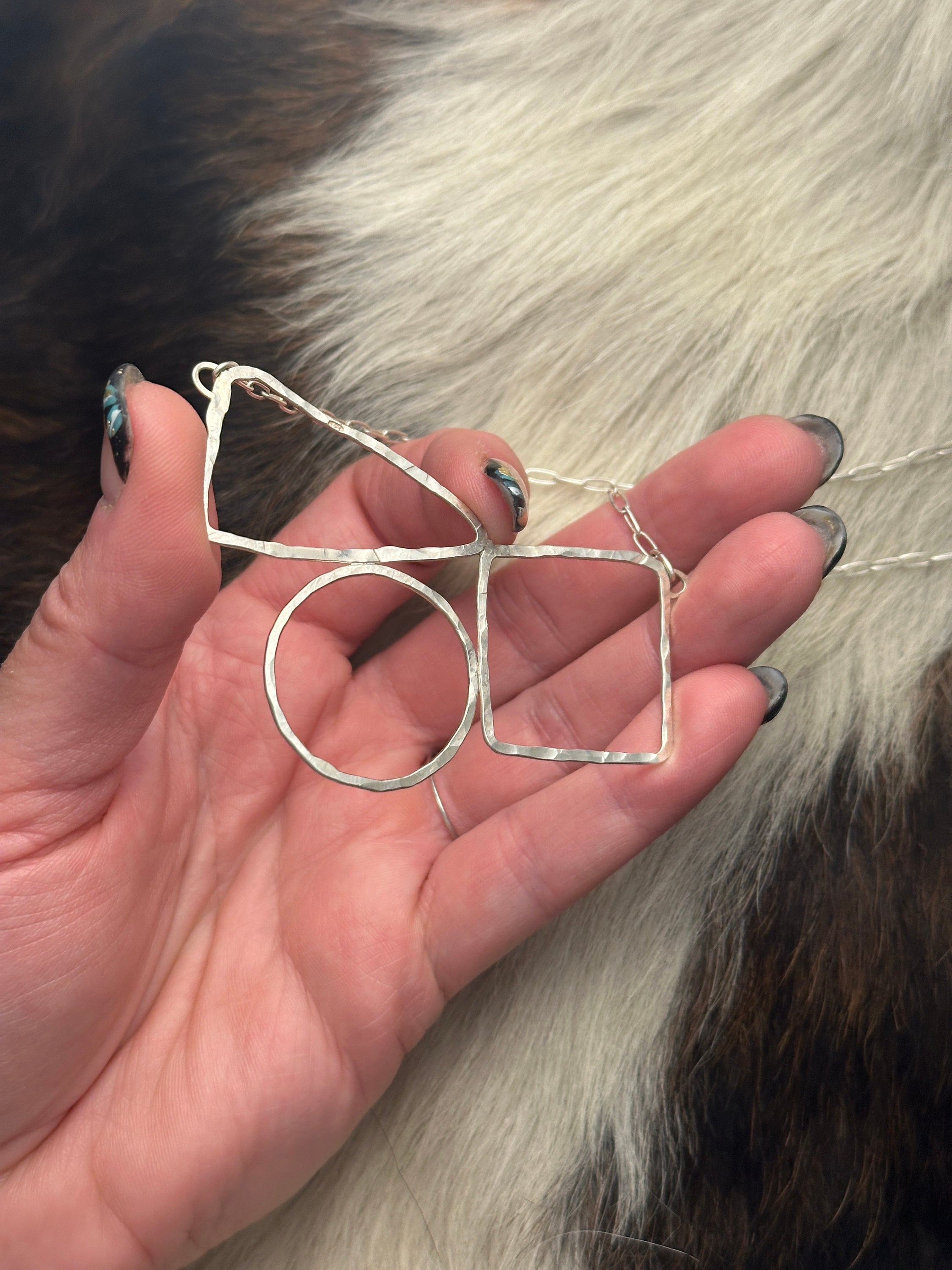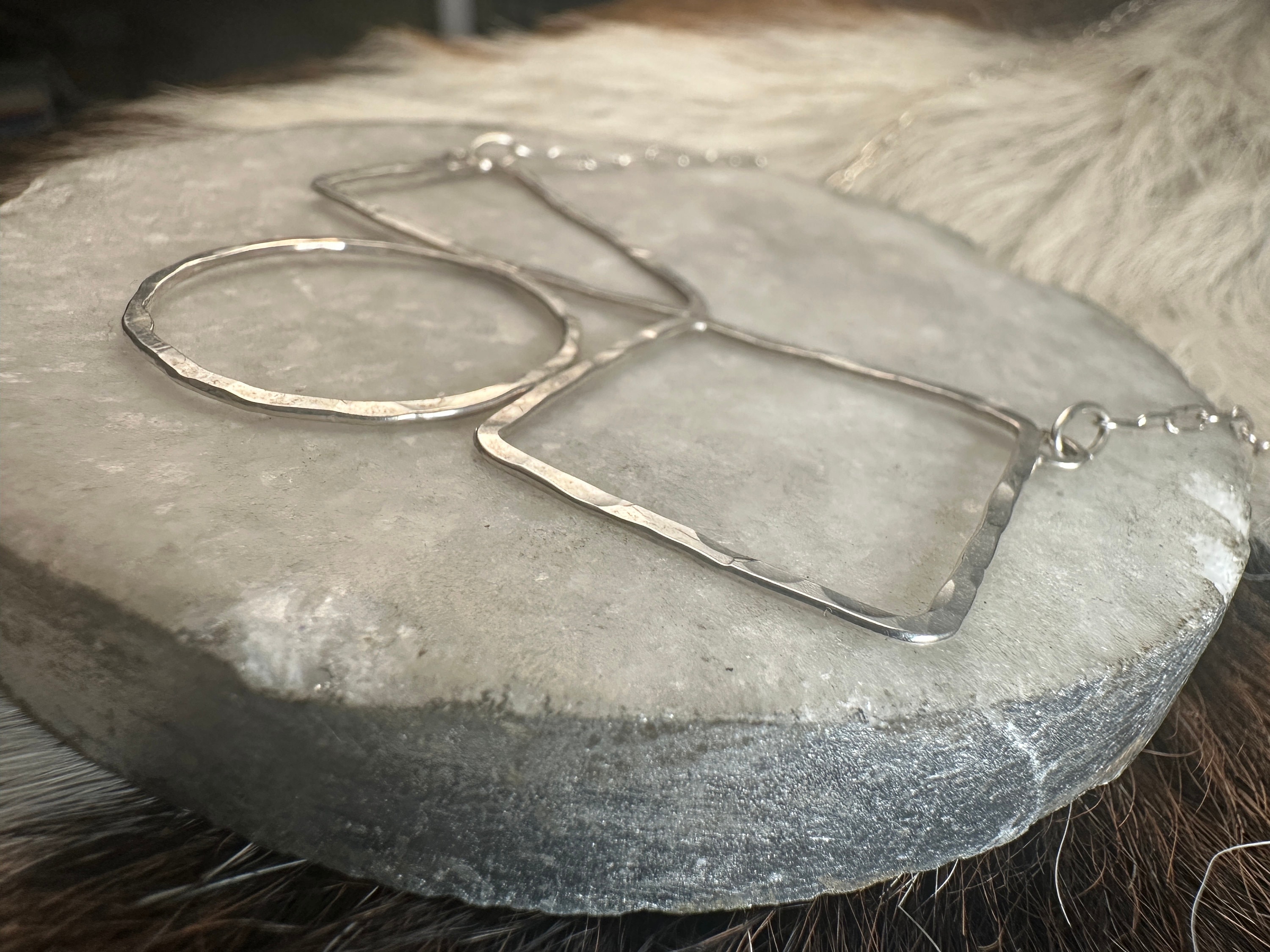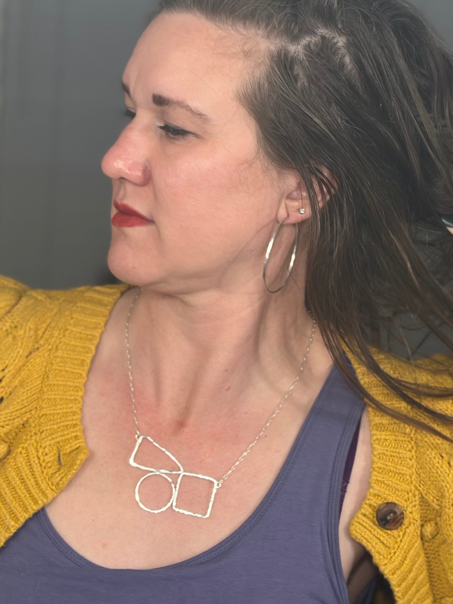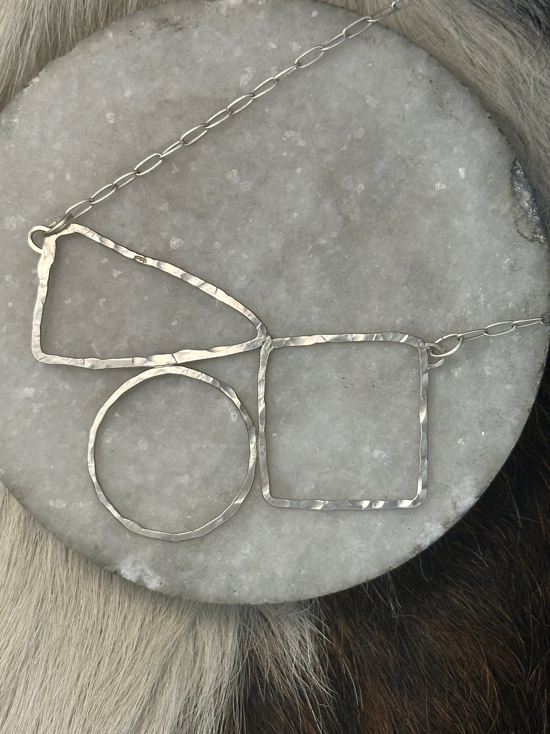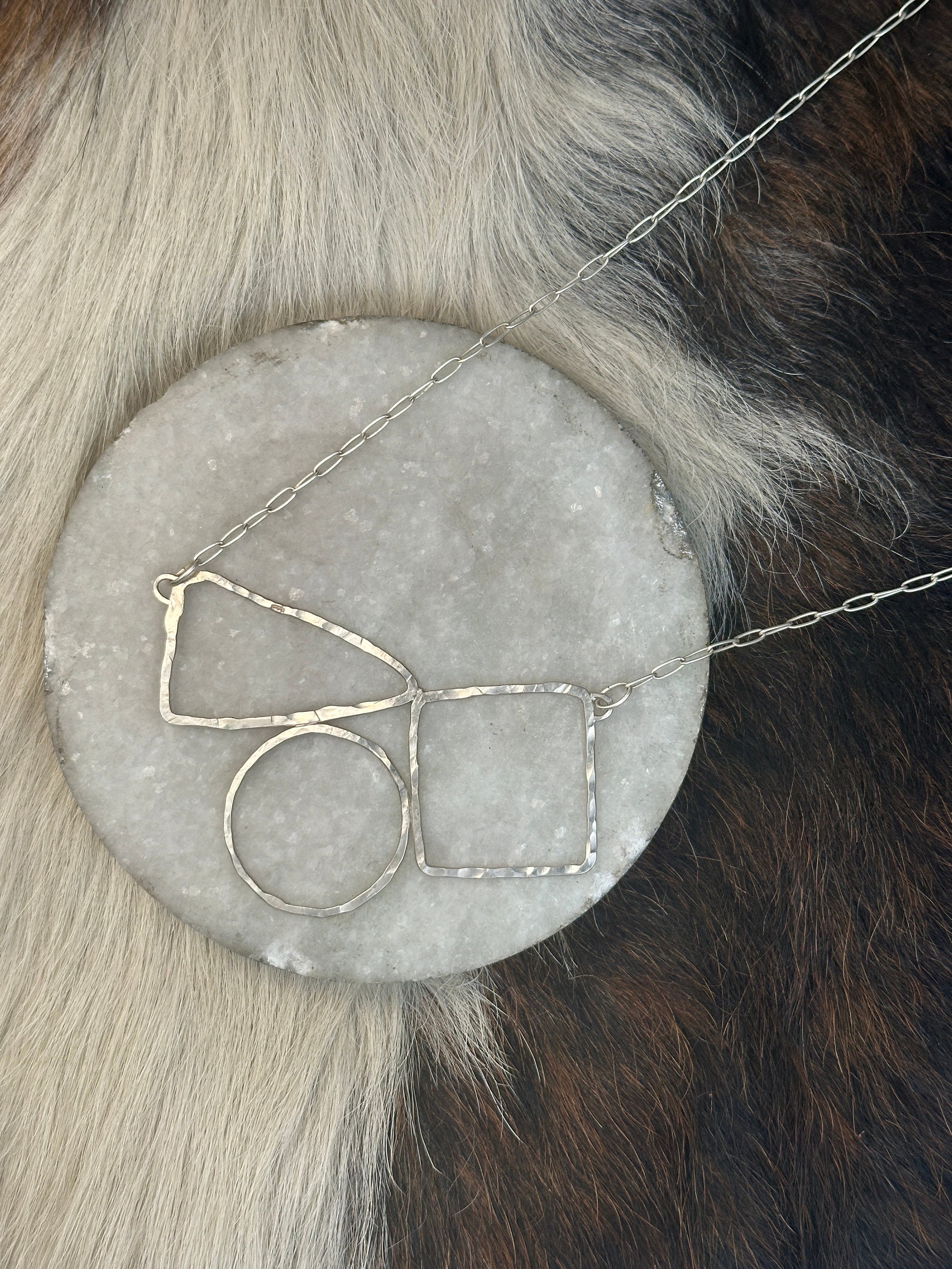 Hand formed outlined geometric shapes soldered together to form a geometric unit as the focal point.