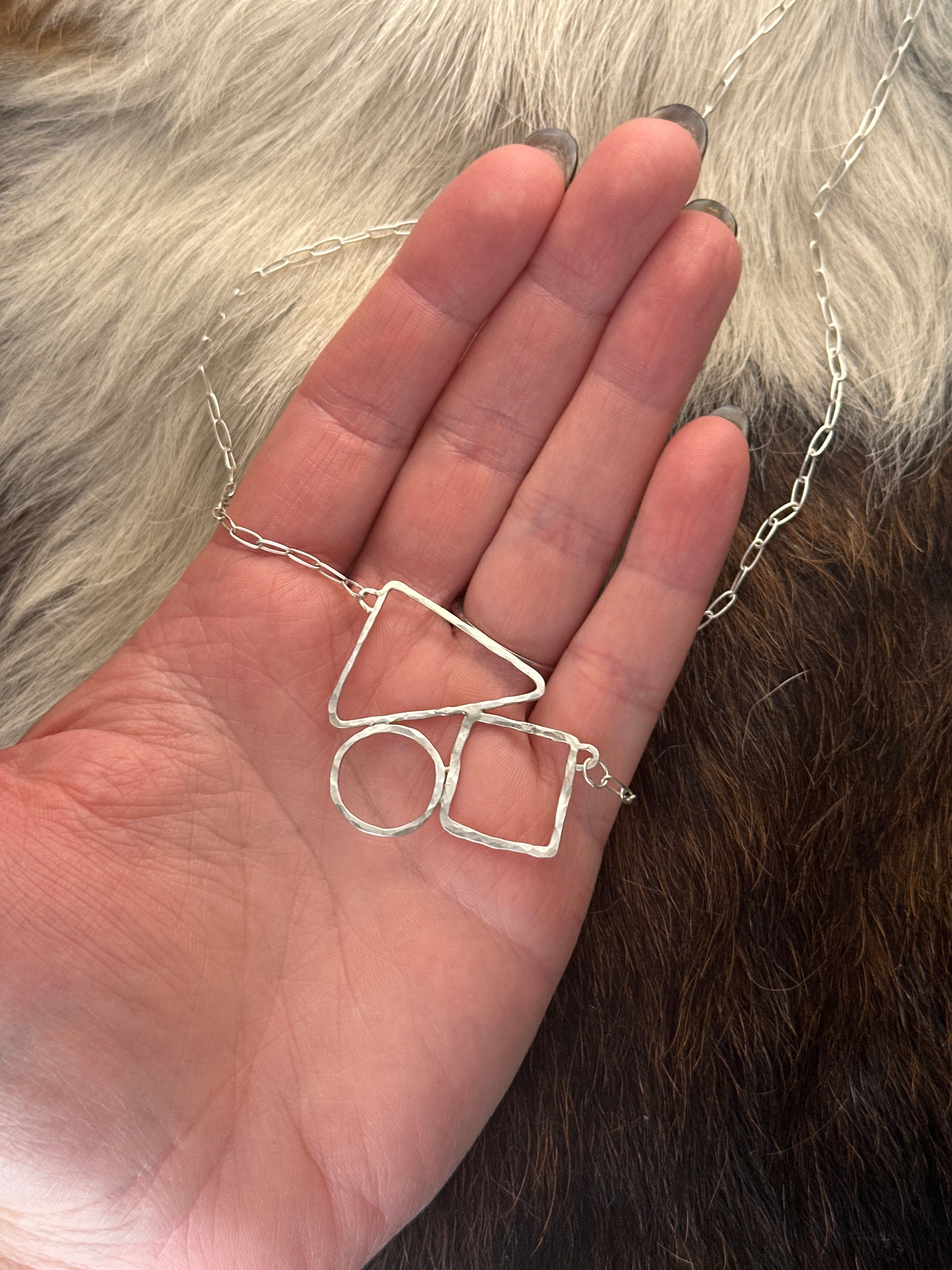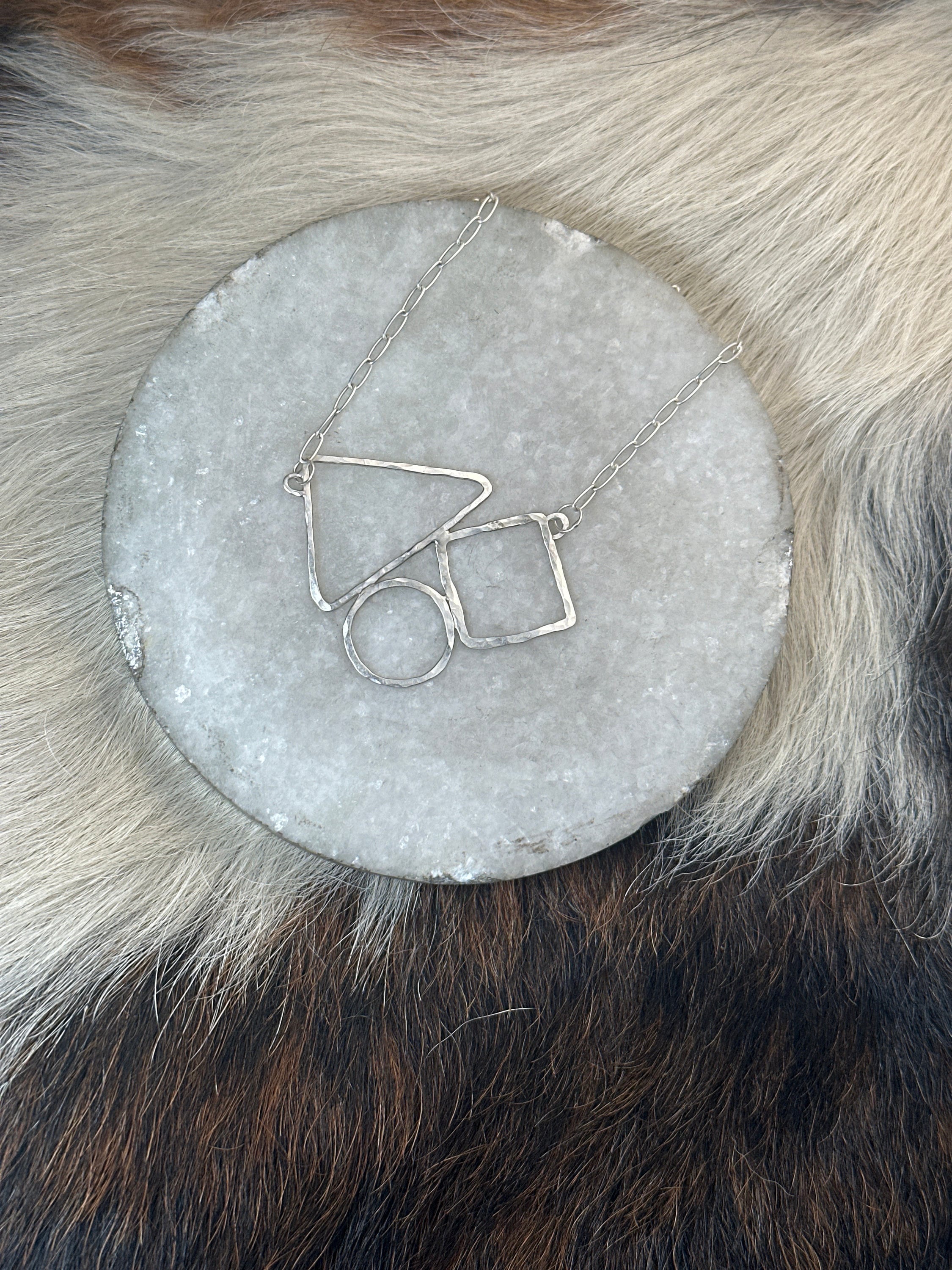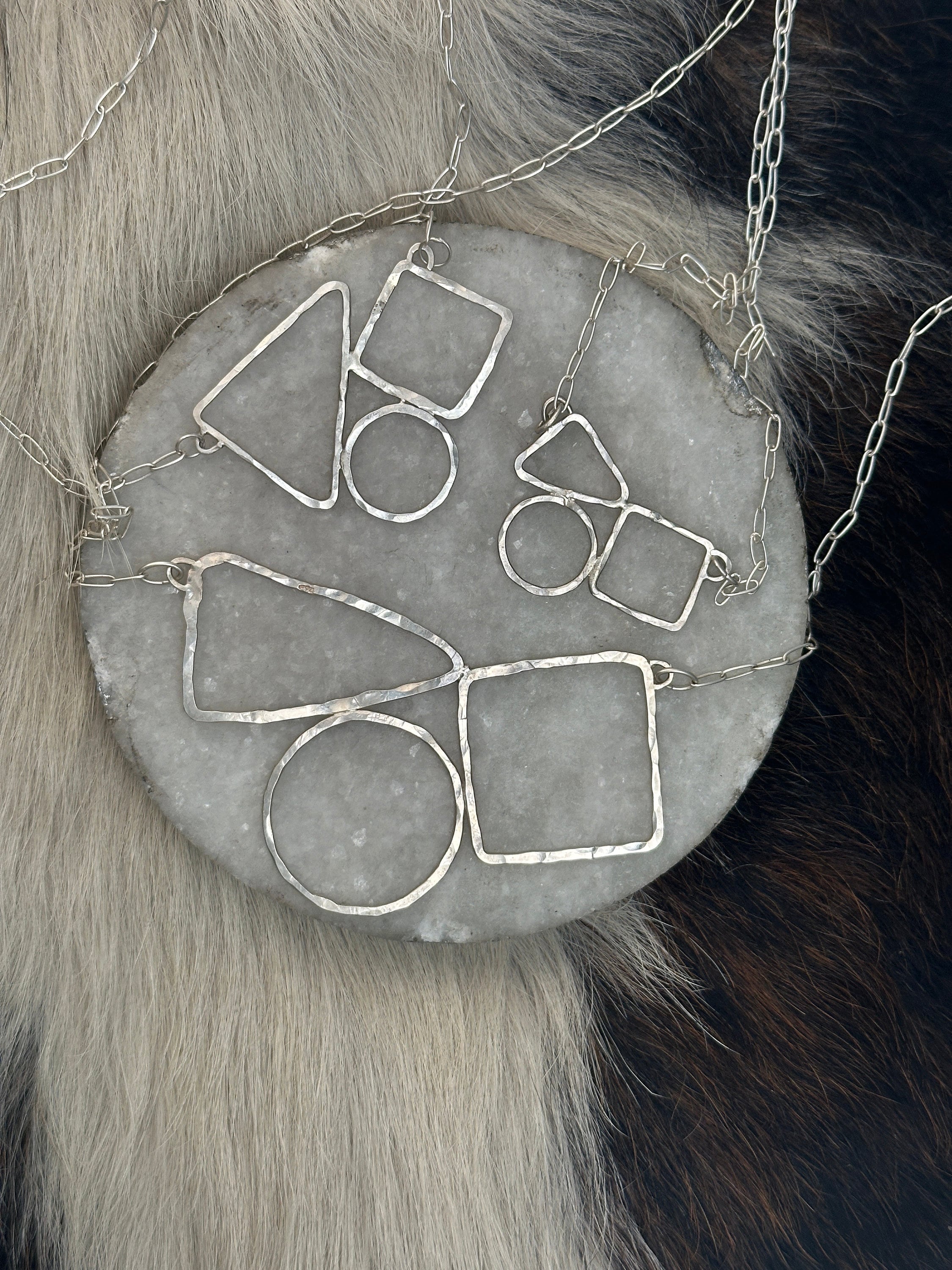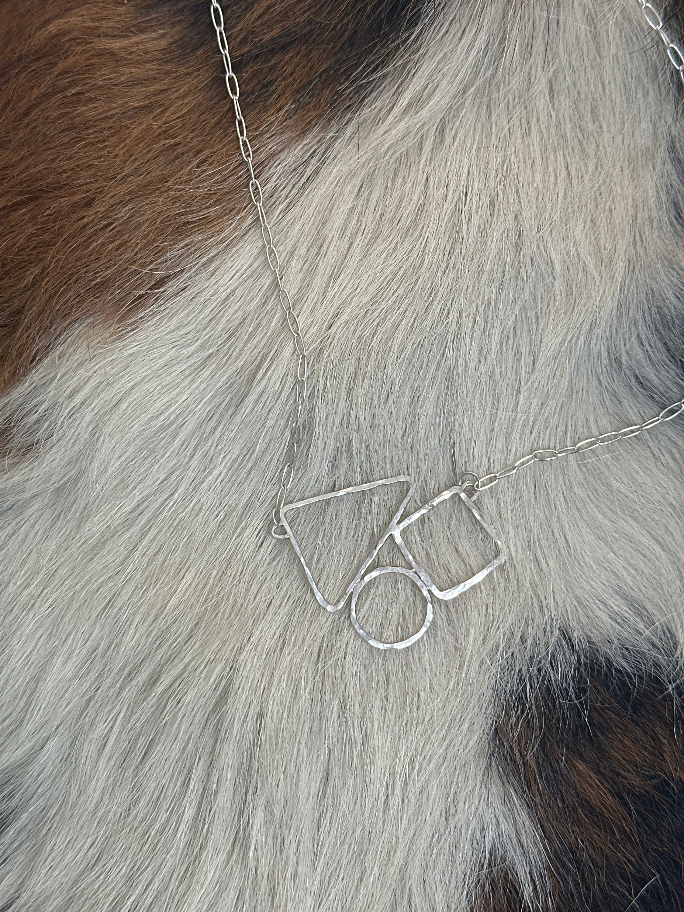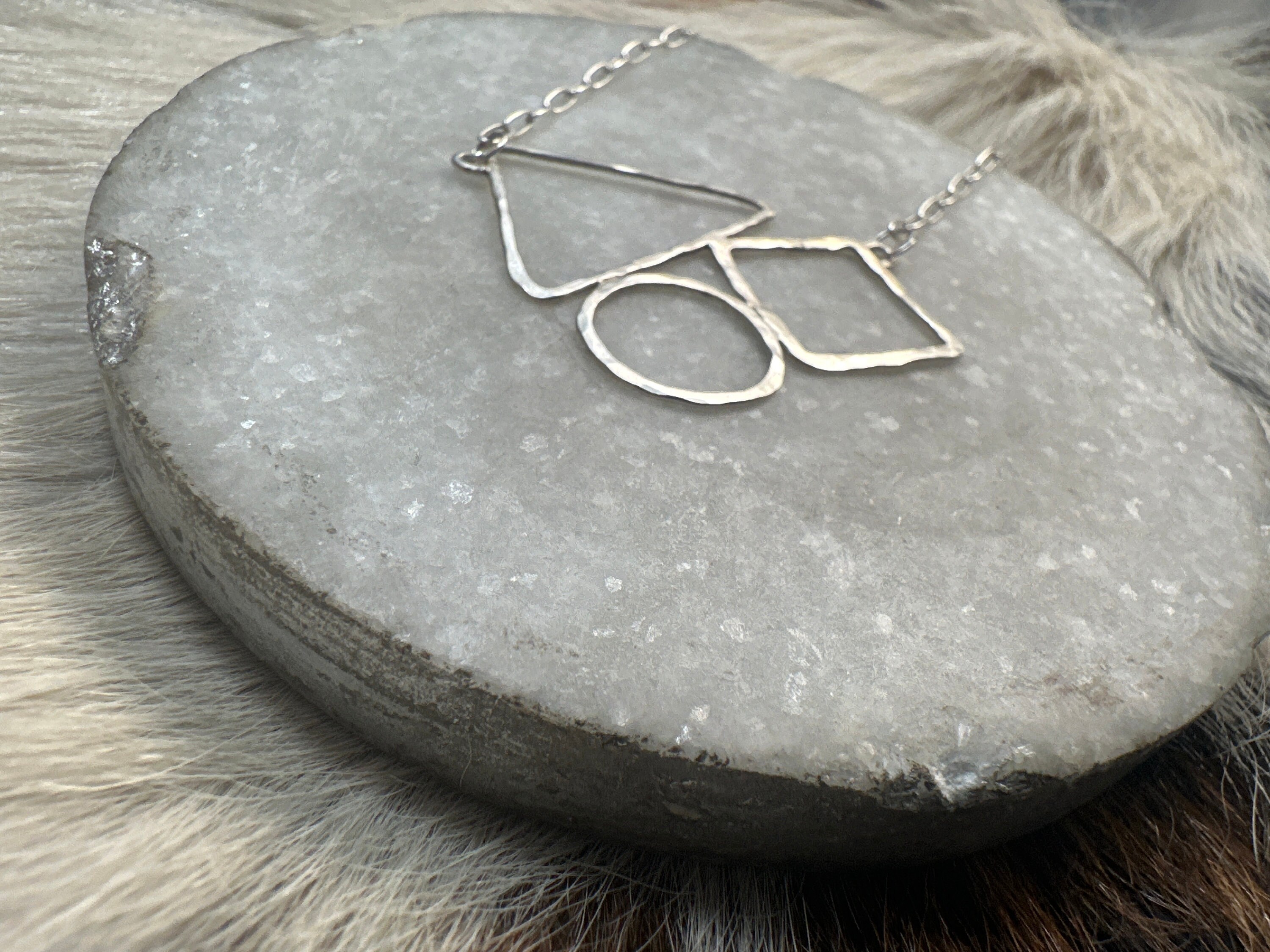 Hand formed outlined geometric shapes soldered together to form a geometric unit as the focal point.