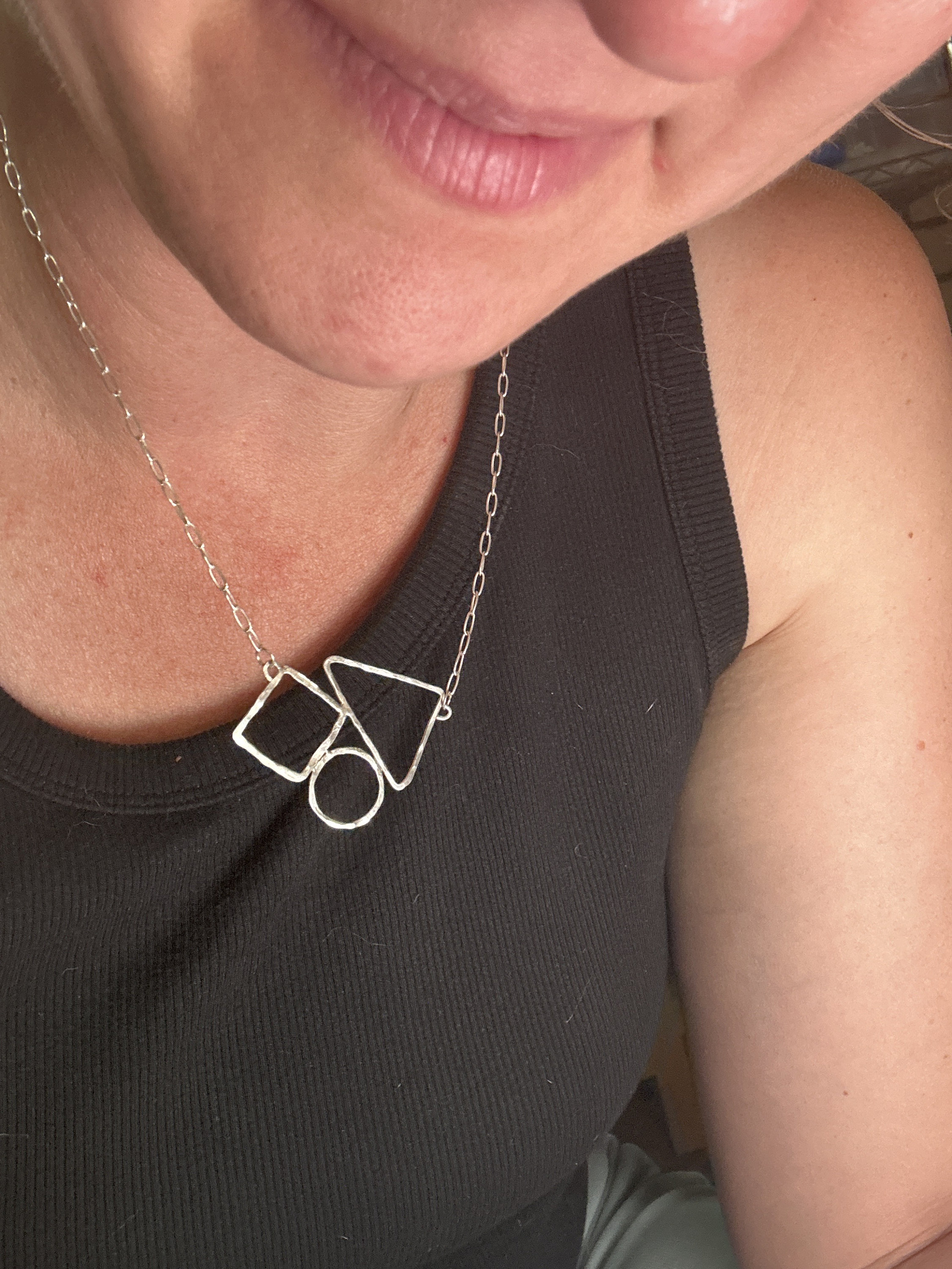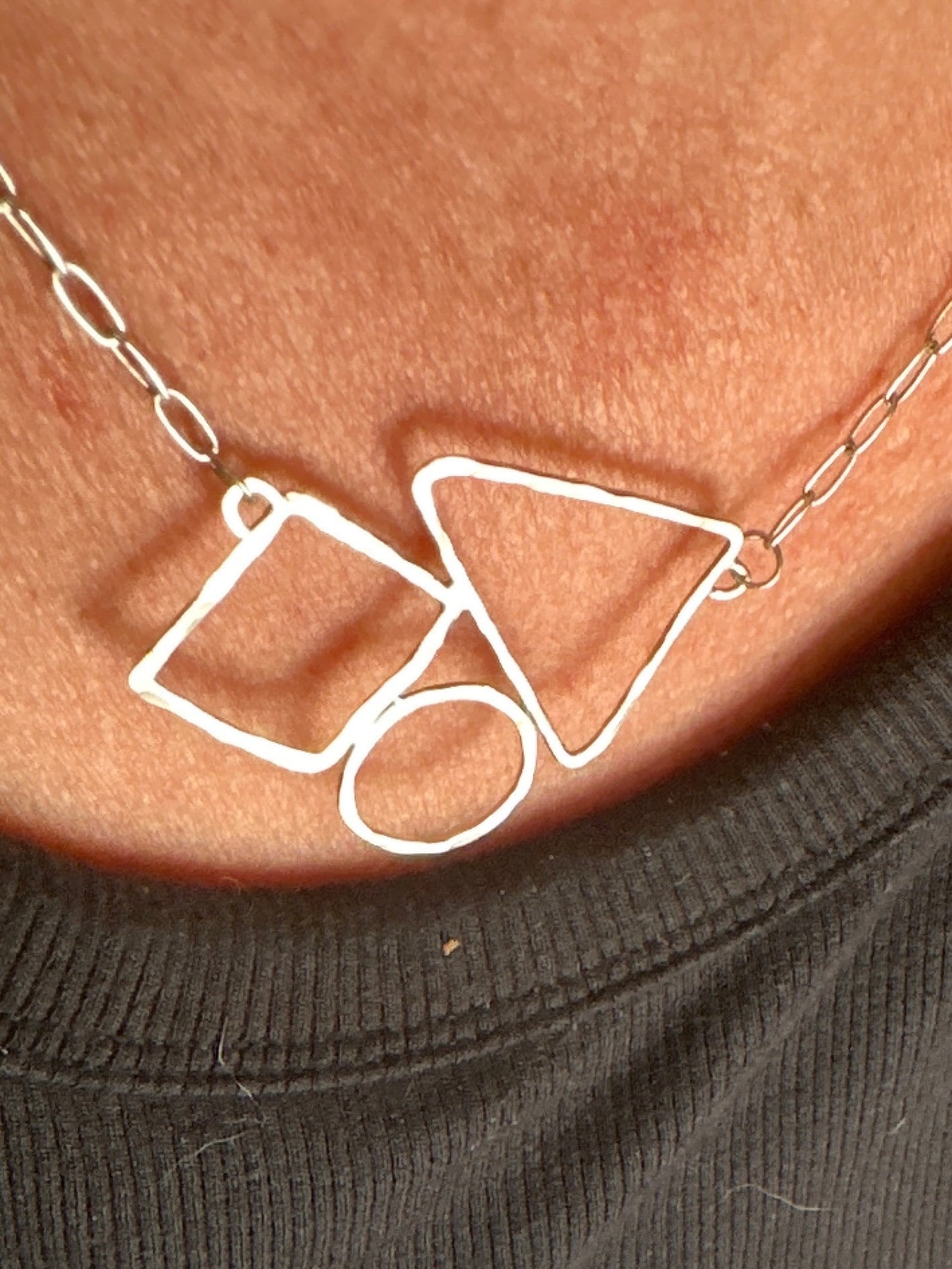 The chain is a delicate paper clip chain to compliment the geometric shapes.