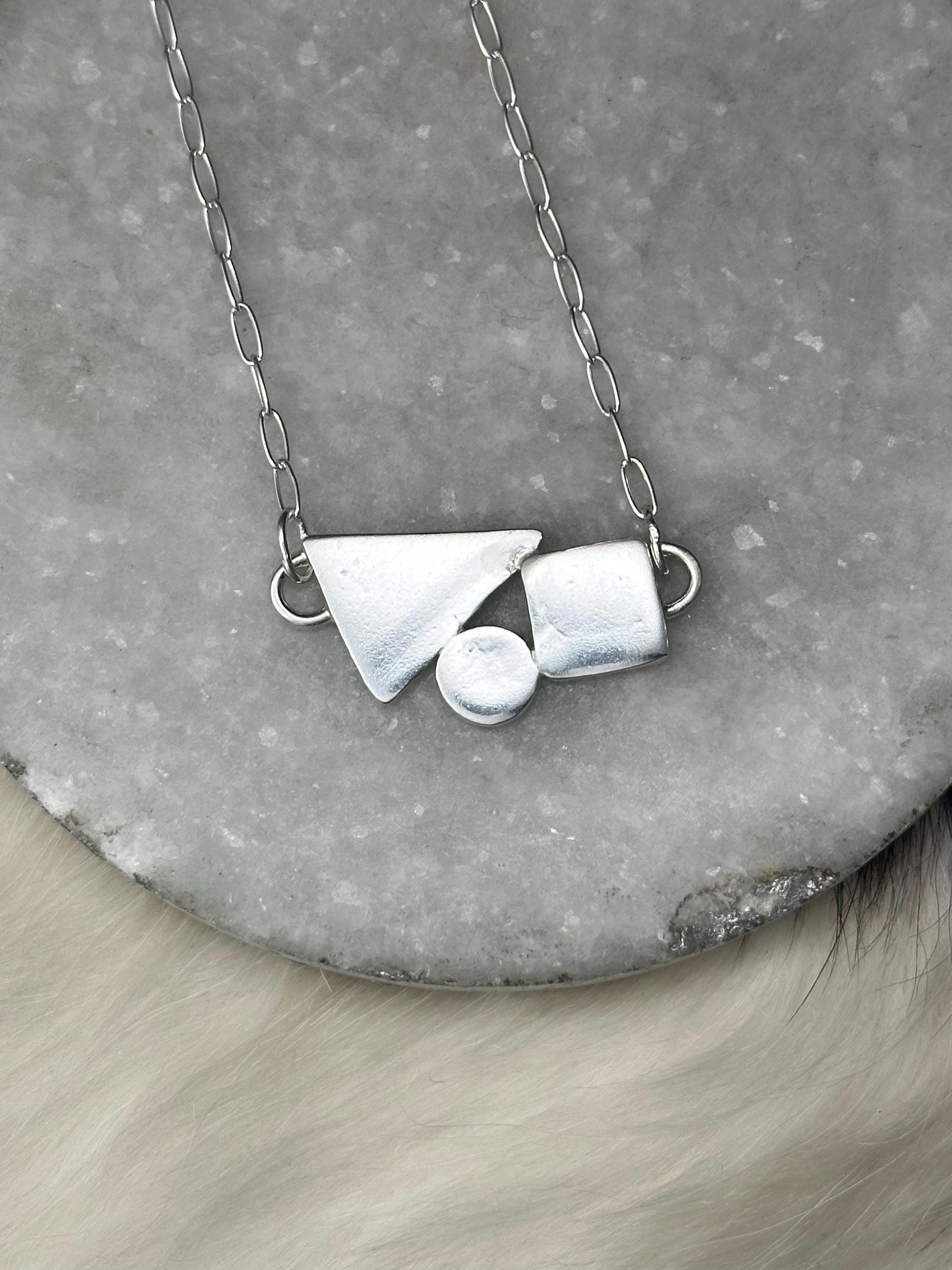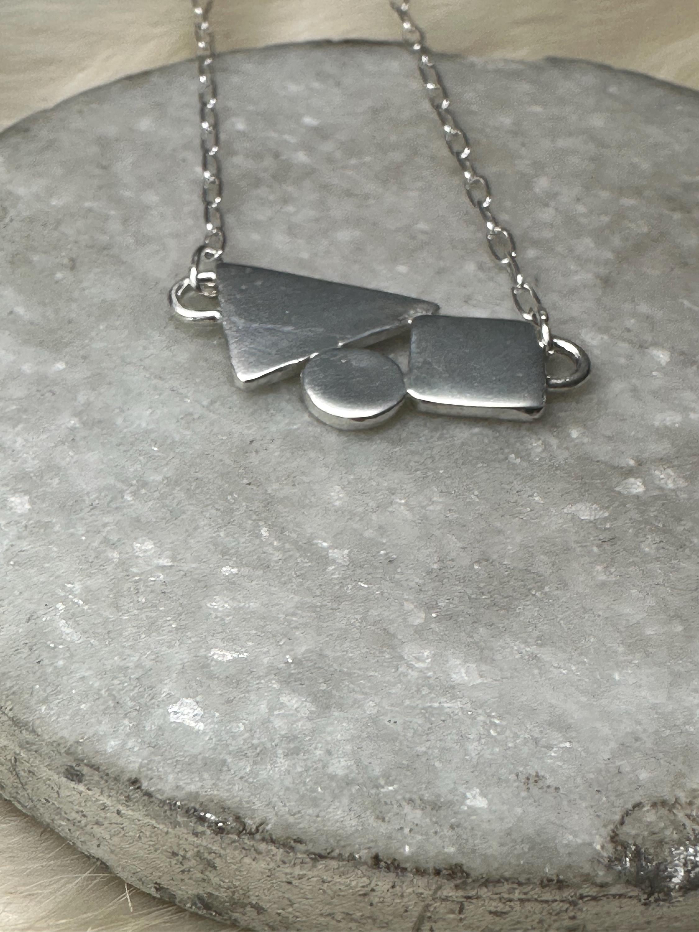 Hand formed geometric shapes soldered together to form a geometric unit as the focal point. This is the large solid shape version.