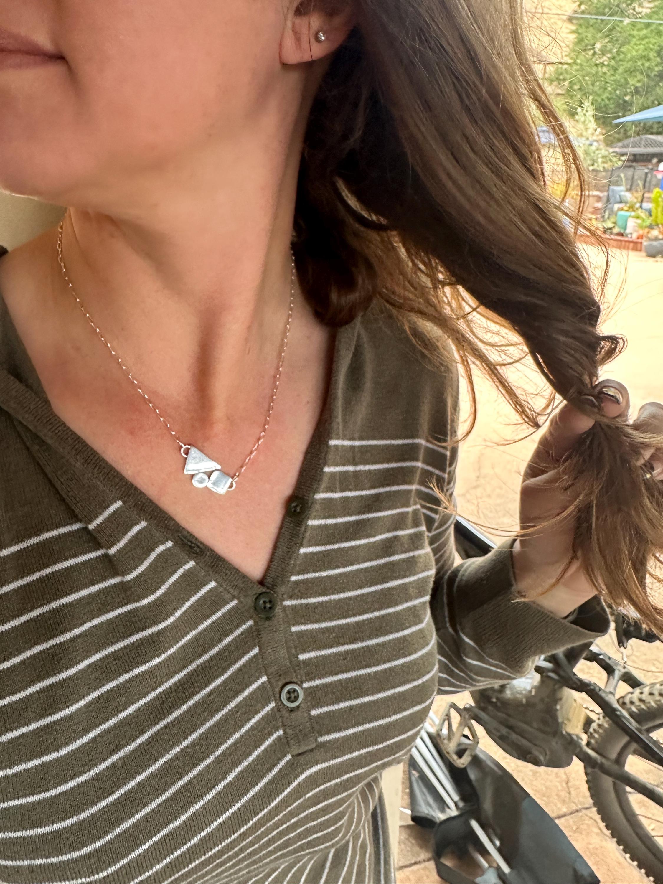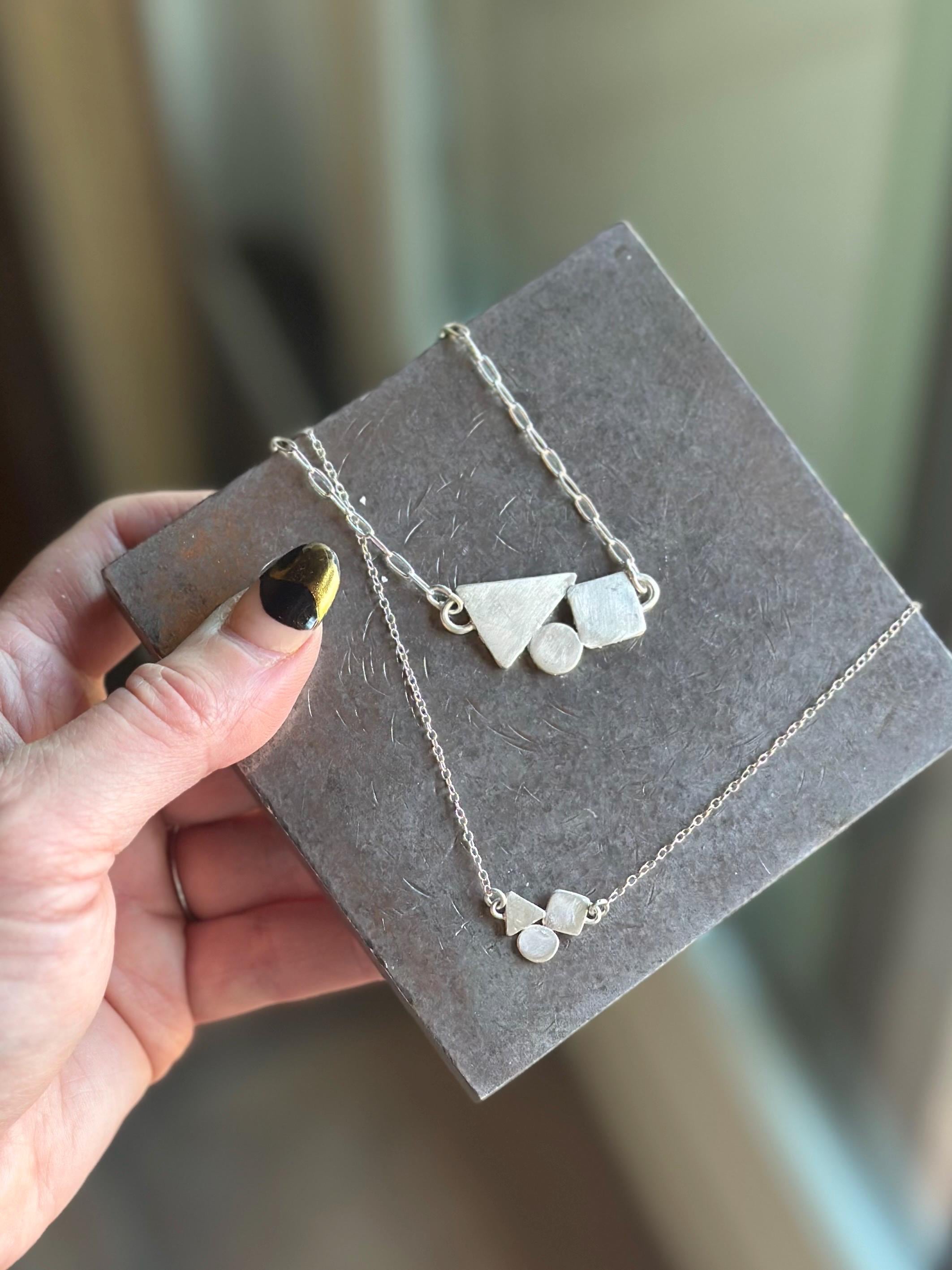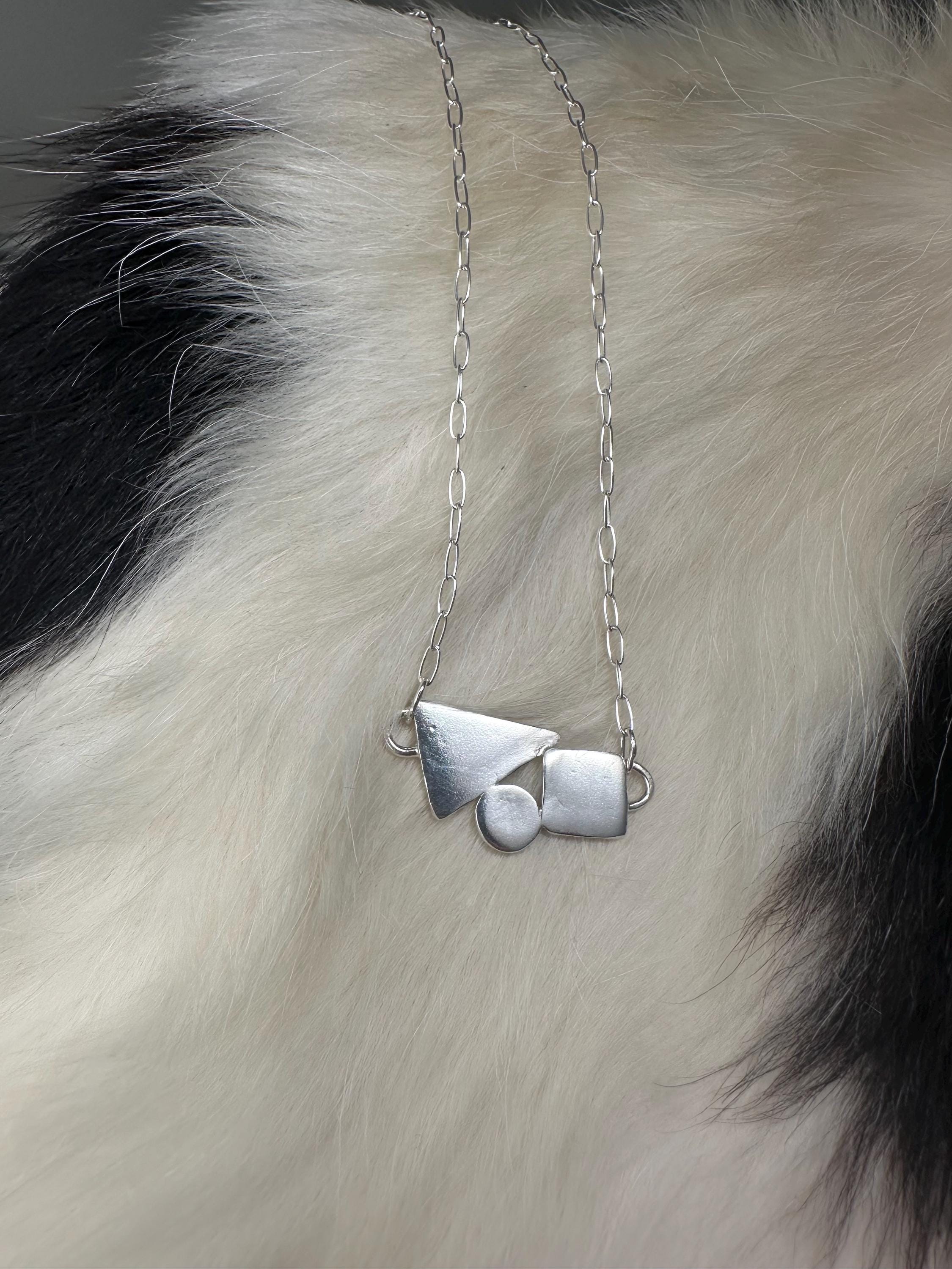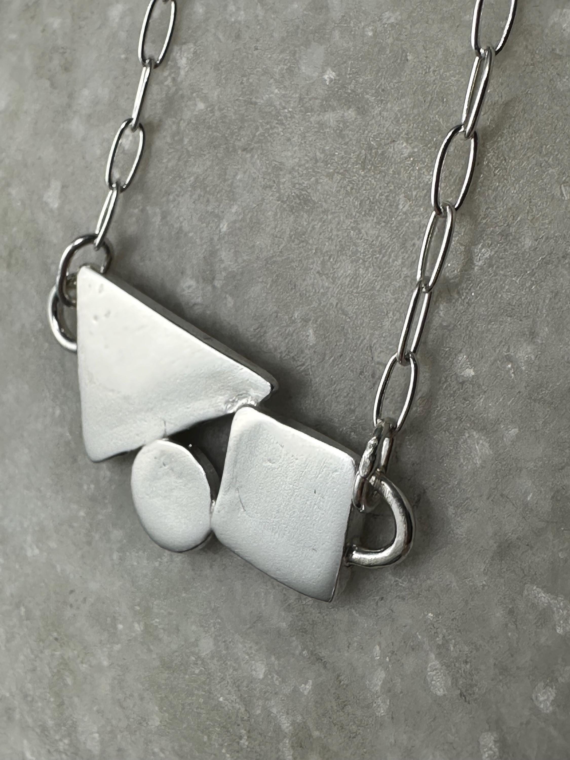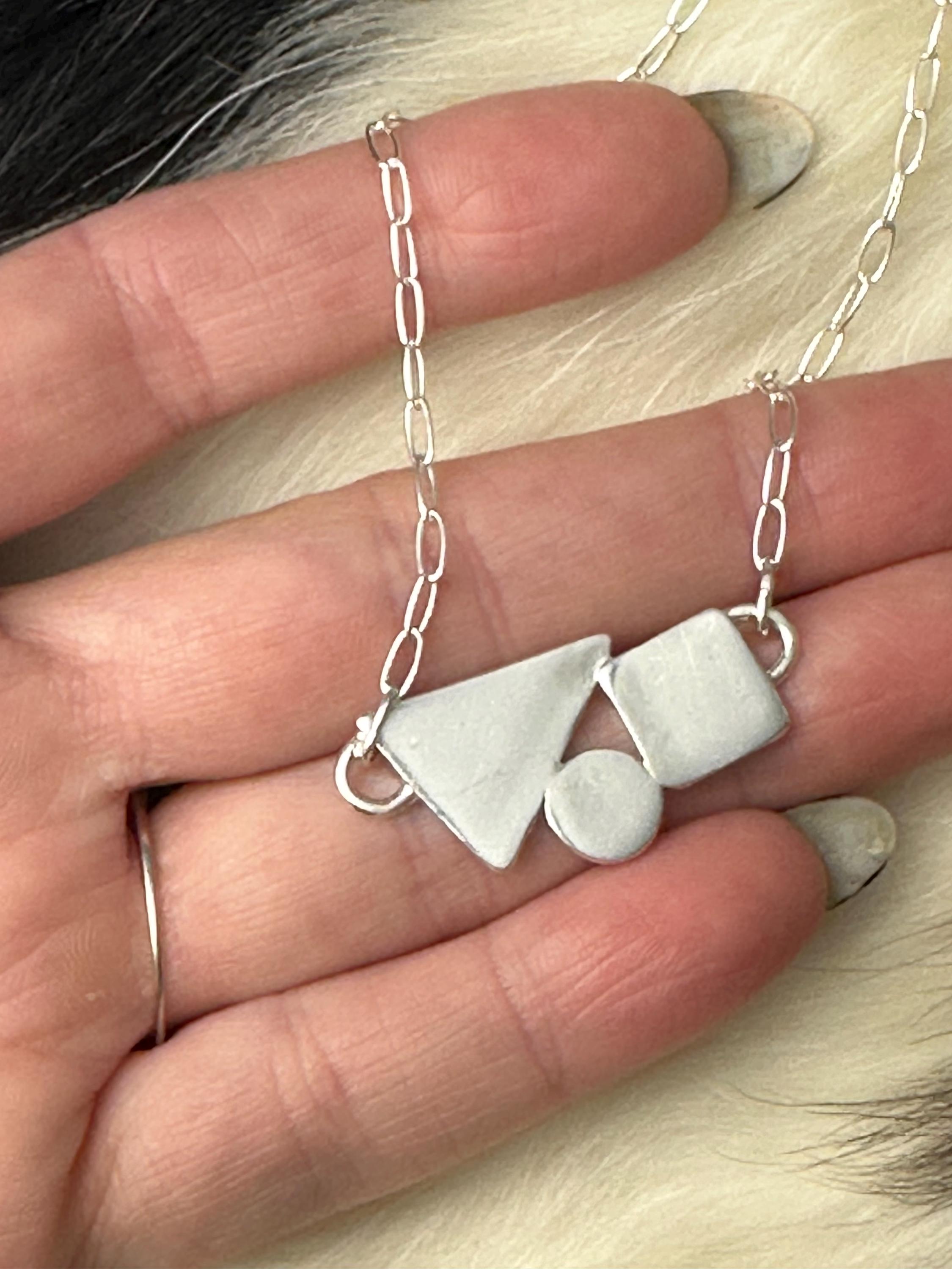 The chain is a delicate paper clip chain to compliment the geometric shapes.
