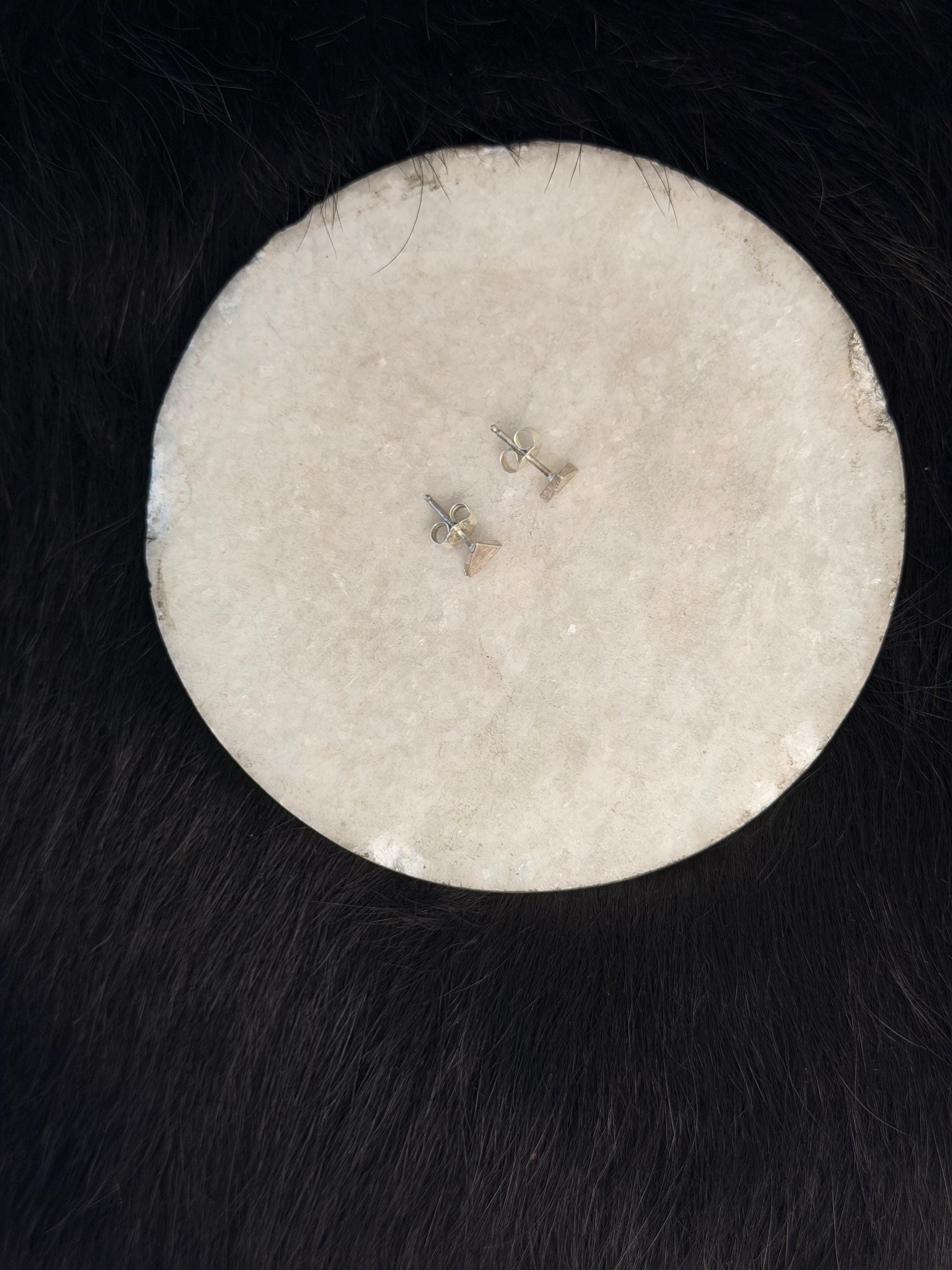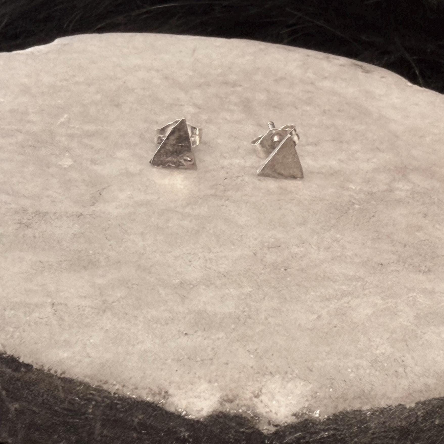 This earring is made of a fine silver triangle (.999) which is a flat slab, not too deep and not too thin. The silver is an excellent metal option, minimal tarnishing and lovely color! The earring is finished with a sterling silver post and ear nut to secure it on the backside.