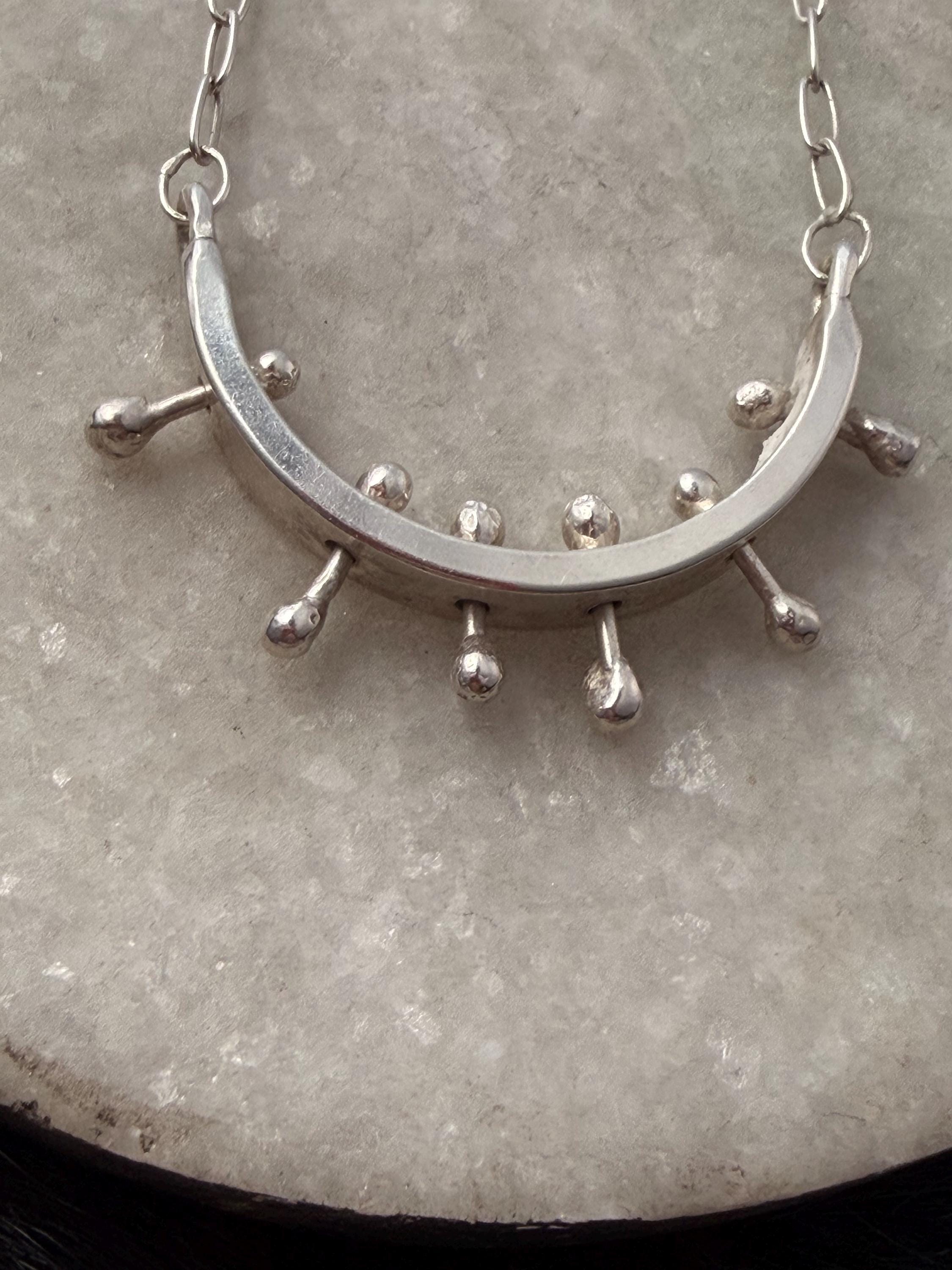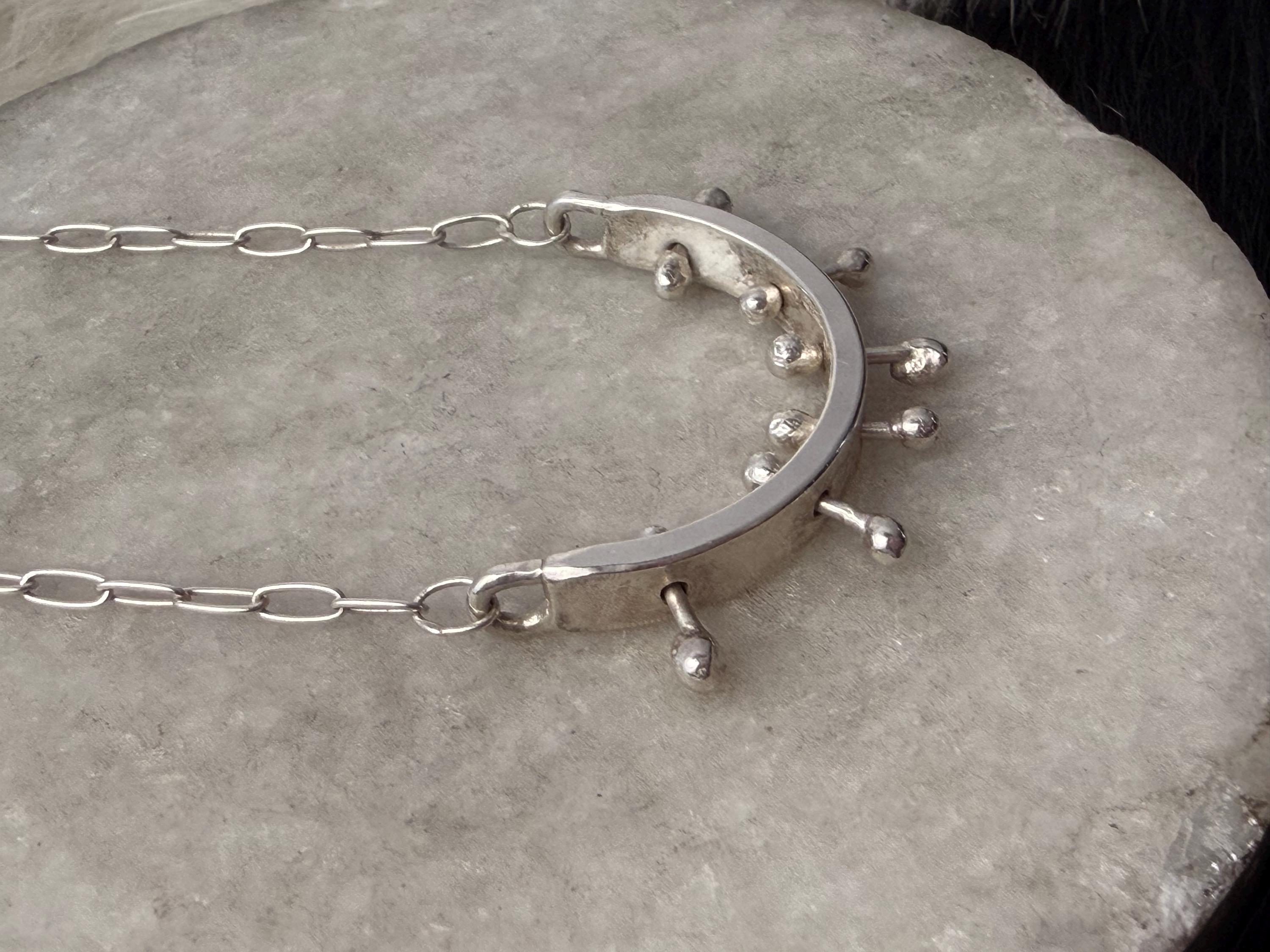 Medium arc focal point (medium weighted) on a small paperclip chain I repurposed scraps of metal to minimize waste in my business practices. The movement of the barbells makes these hoops kinetic! If you give the arc a shake but not with regular walking (don’t worry!) you can hear sounds of the components moving! The necklace abstractly references the stars in the sky on geometric shapes - this one is a rectangle formed into an arc shaped with the barbells passing thru.