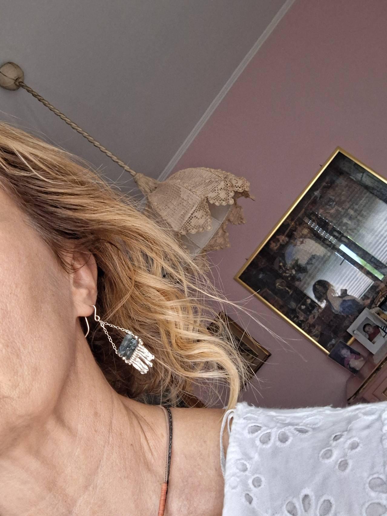 Other materials: silver plated multi-faceted beads, silver chain with hand-forged silver fringe.