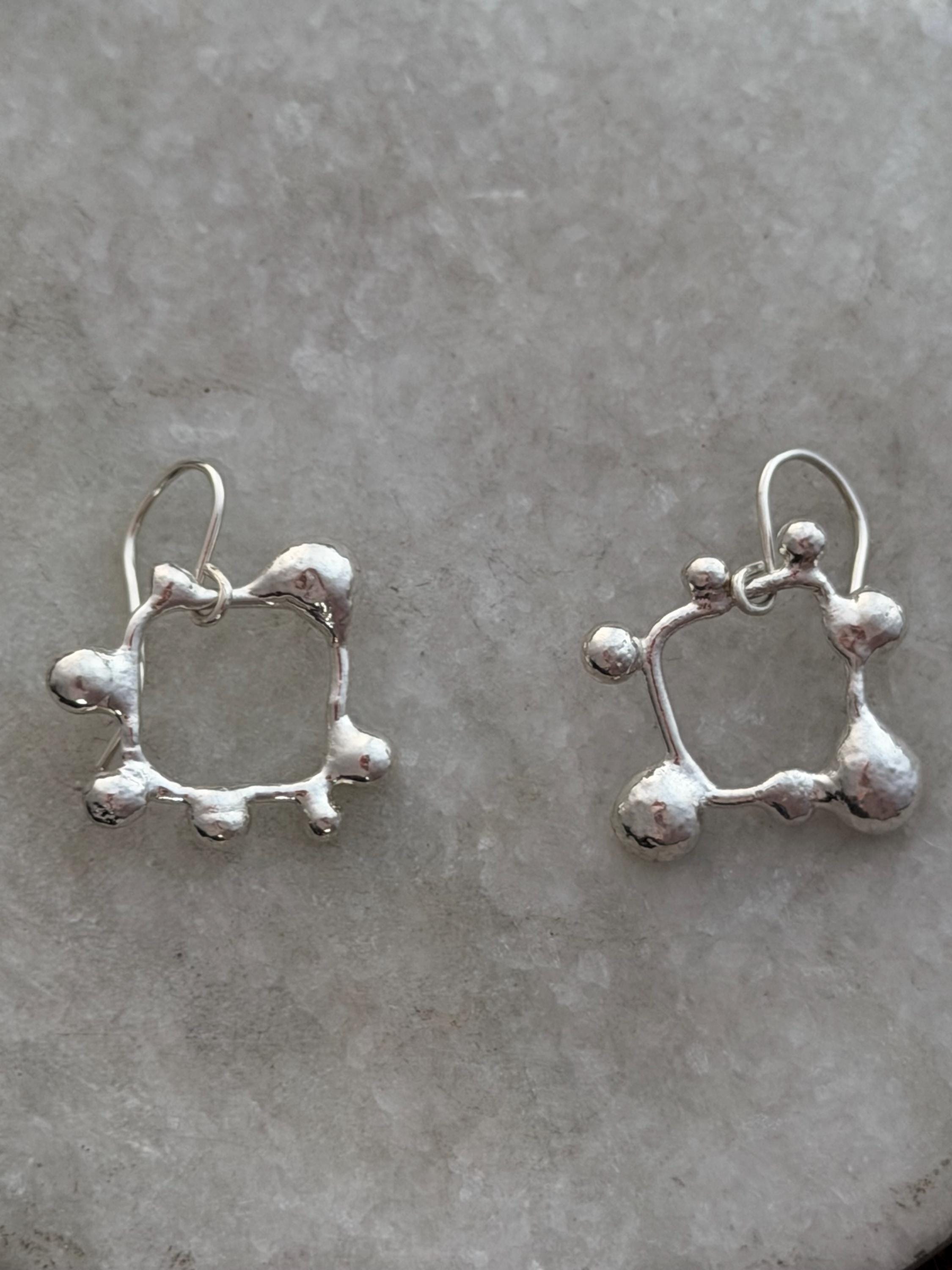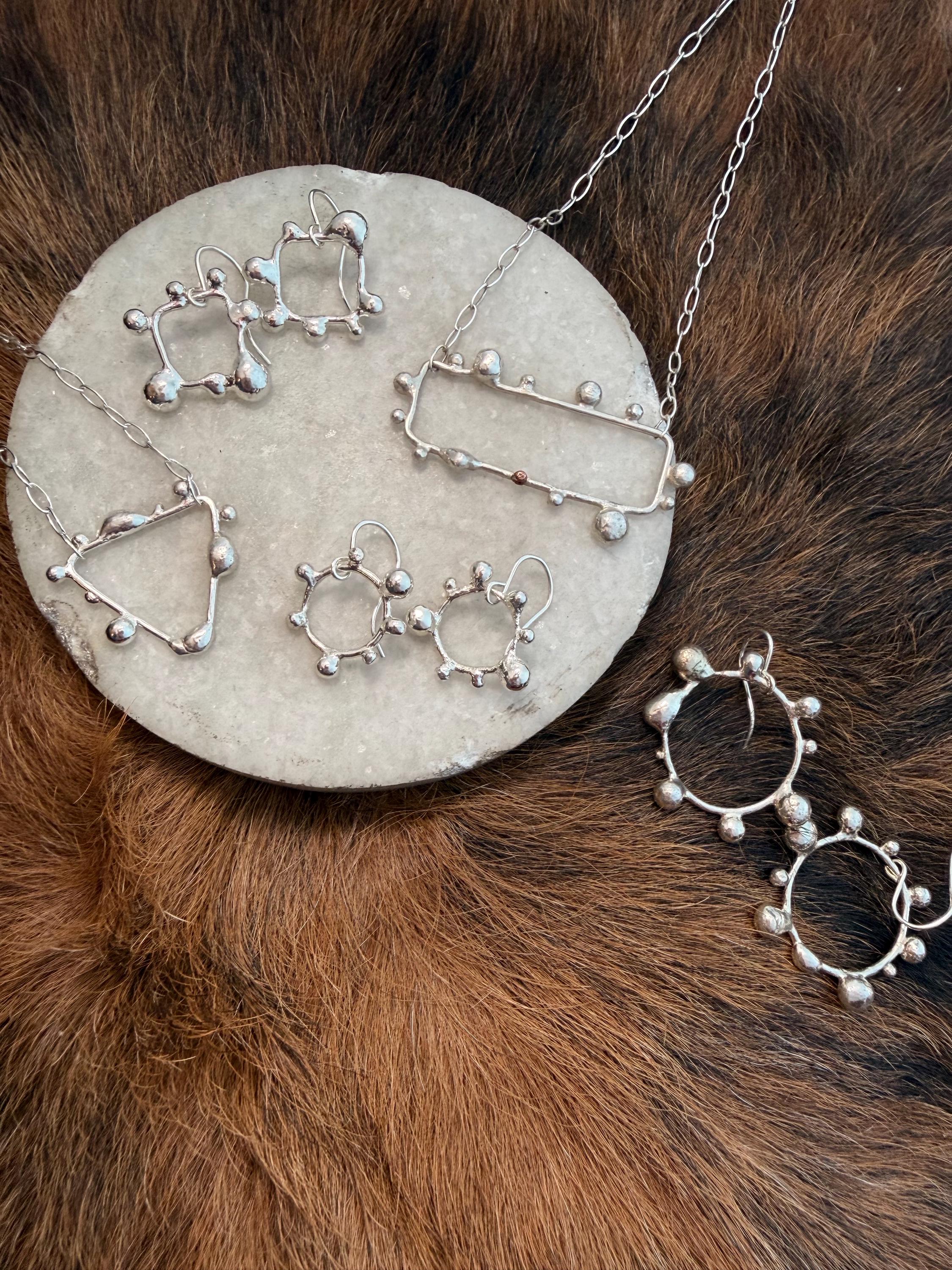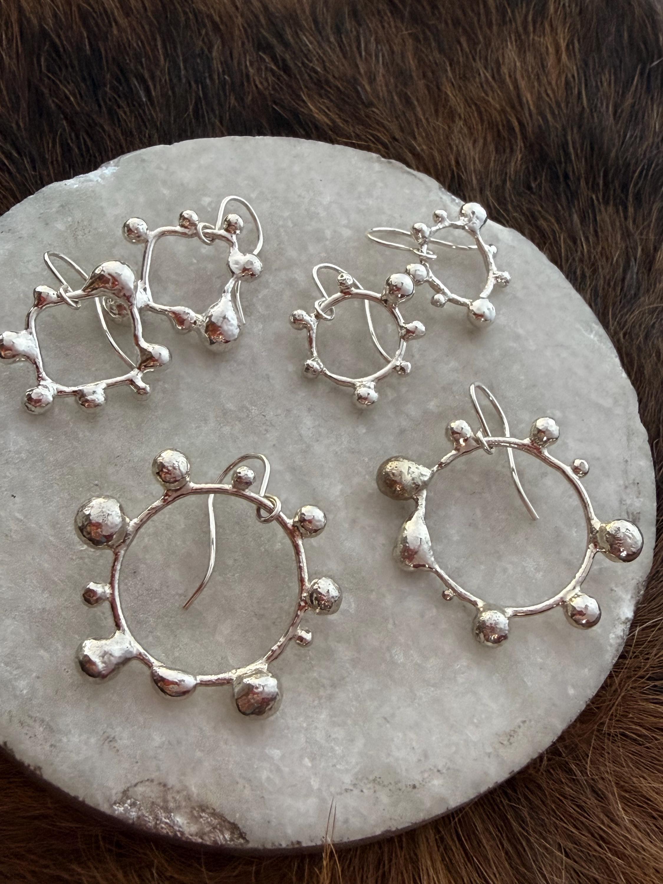 The Circle shape is accented with free formed bubbles and balls of sterling silver. This earring is part of a collection where I have explored more of my artistic creativity while testing the fusing and melting points of silver, it is quite delightful to find these geometric shapes to have formed in the way that they have.