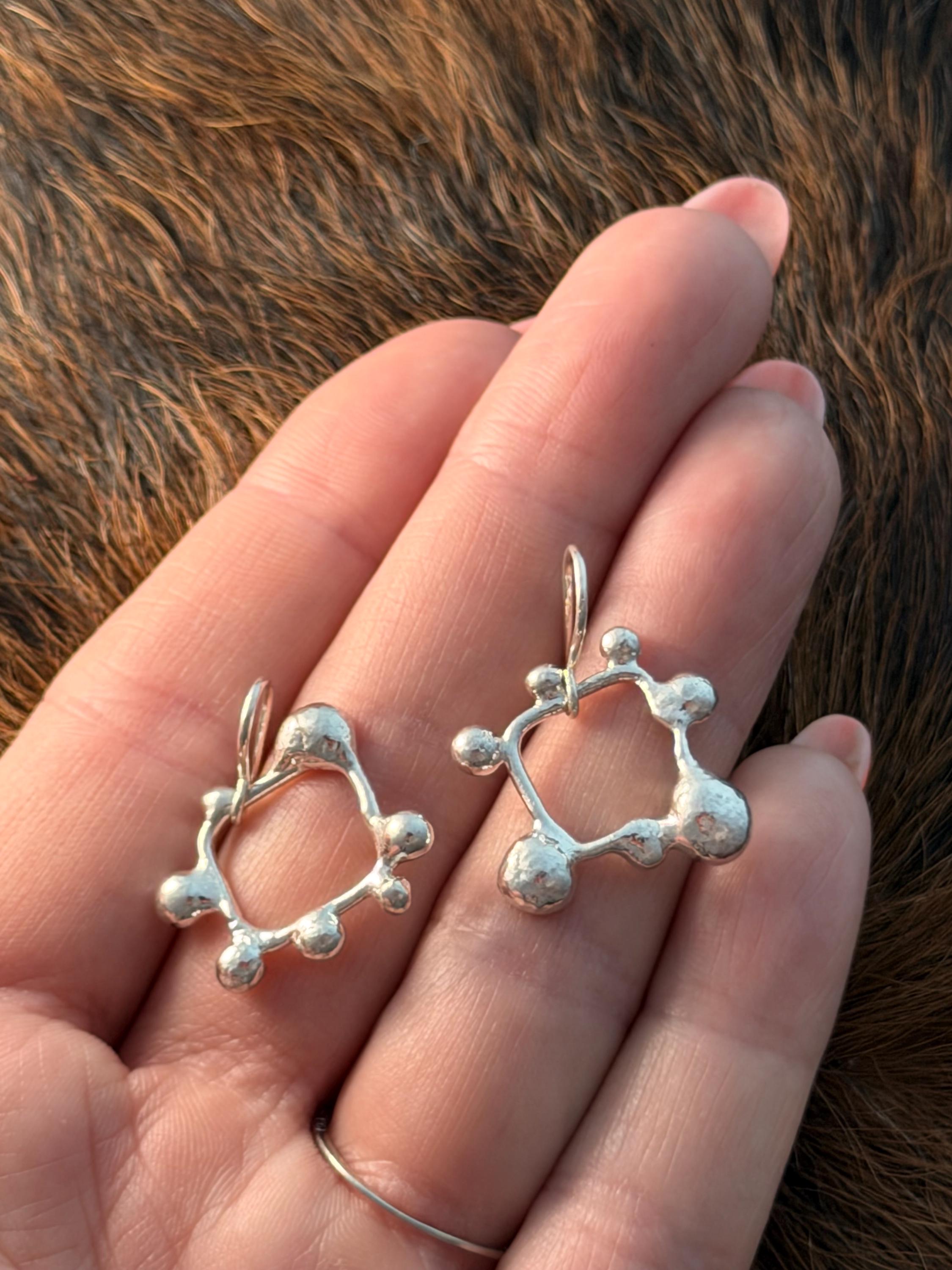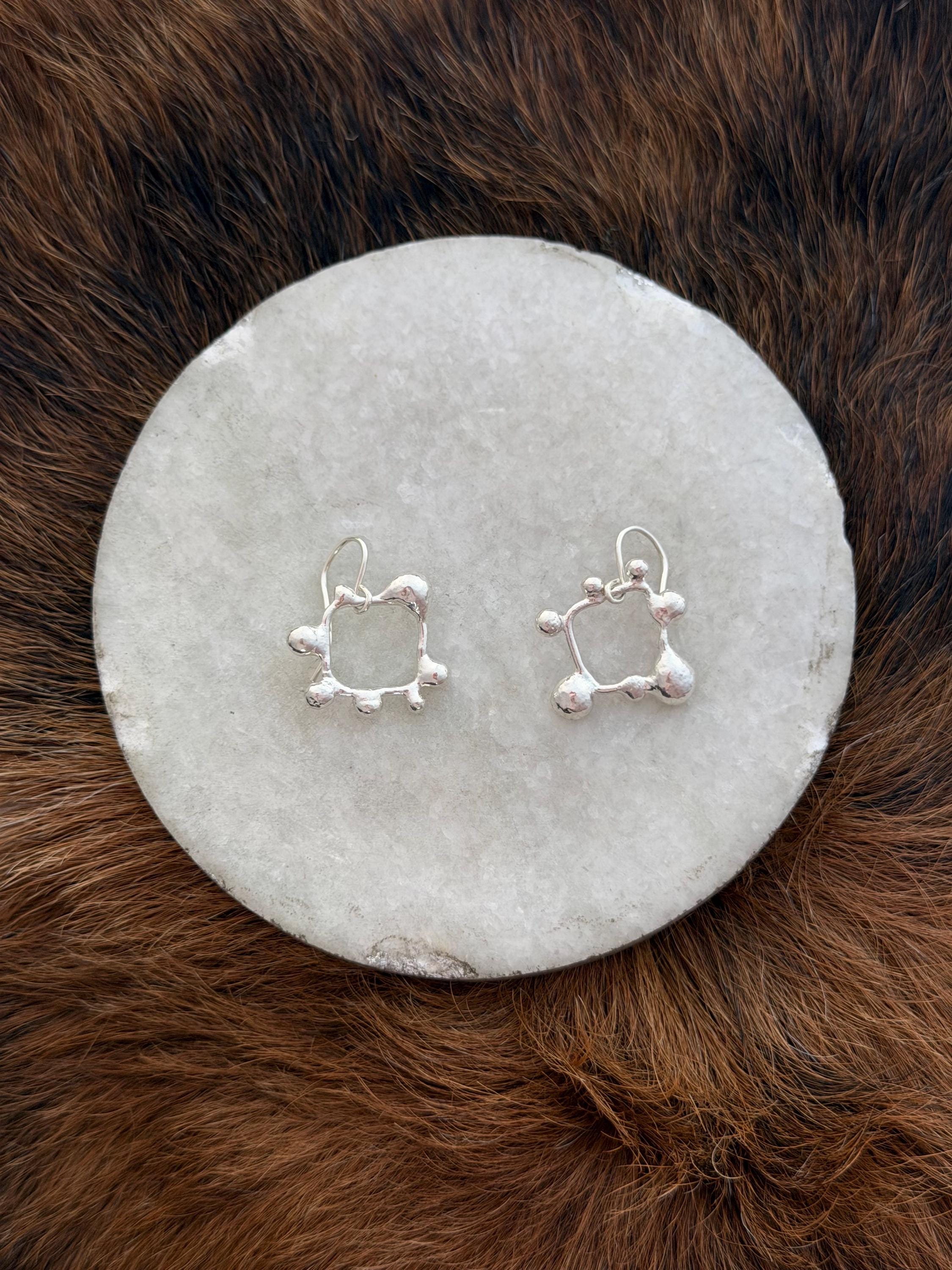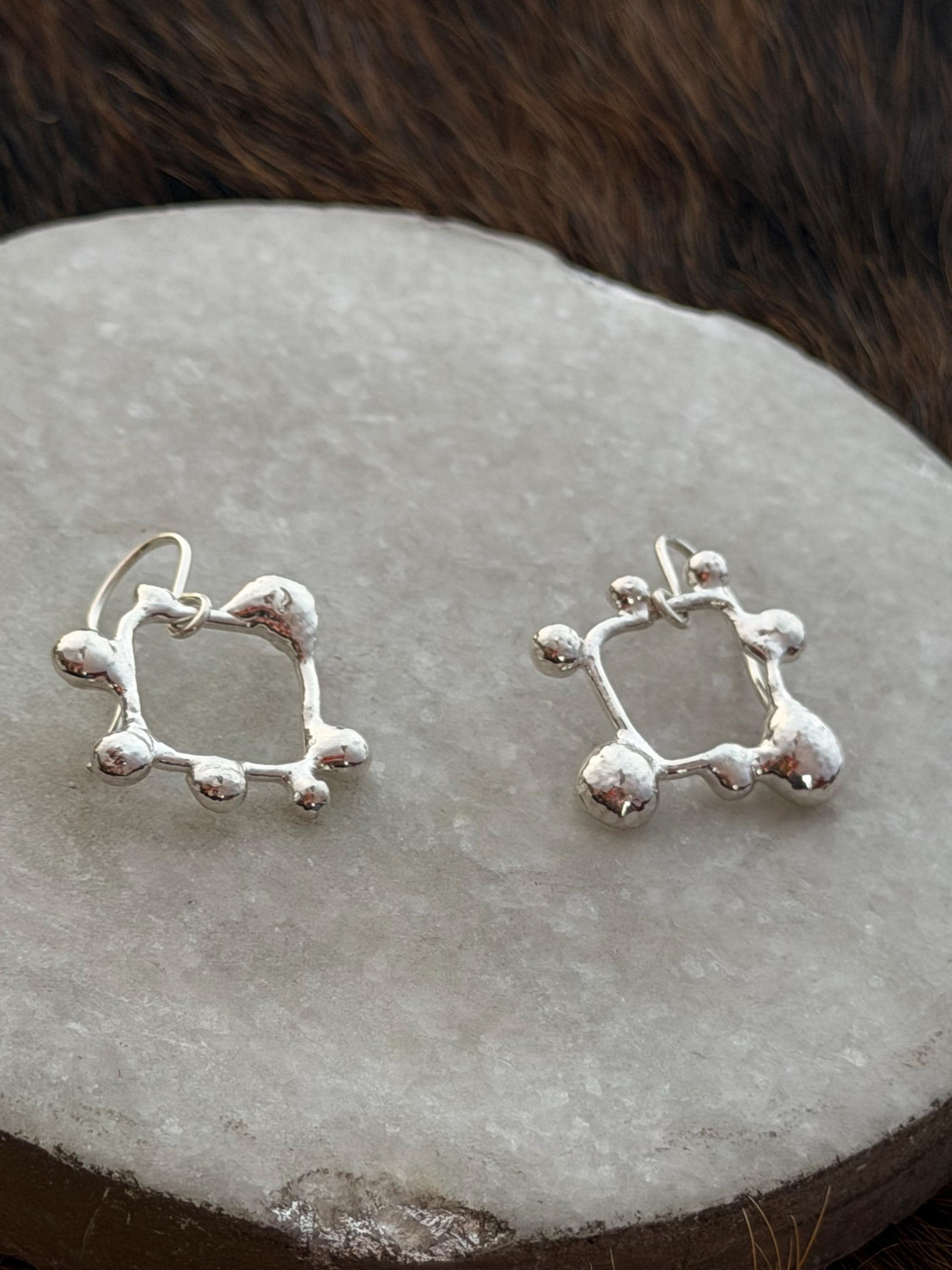 The Circle shape is accented with free formed bubbles and balls of sterling silver. This earring is part of a collection where I have explored more of my artistic creativity while testing the fusing and melting points of silver, it is quite delightful to find these geometric shapes to have formed in the way that they have.