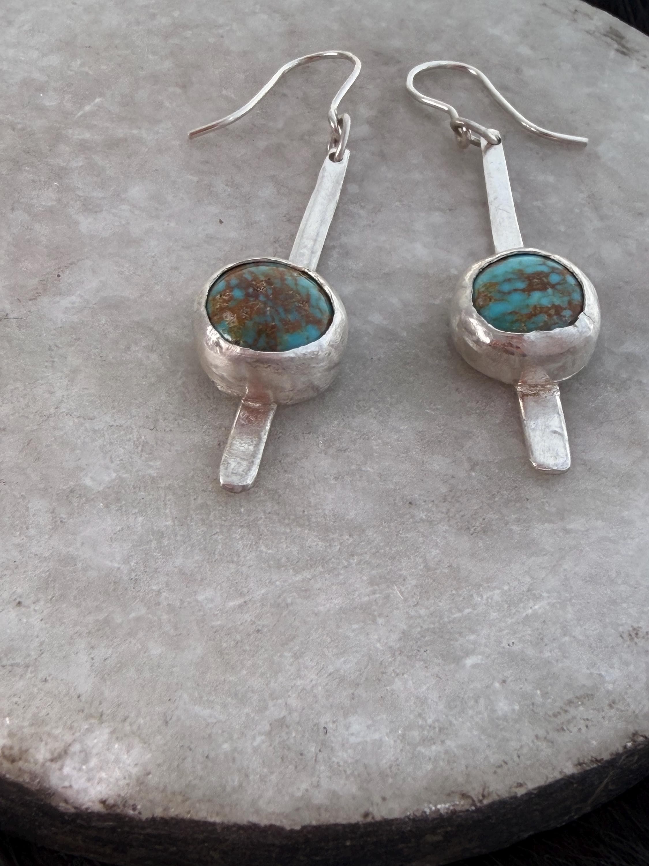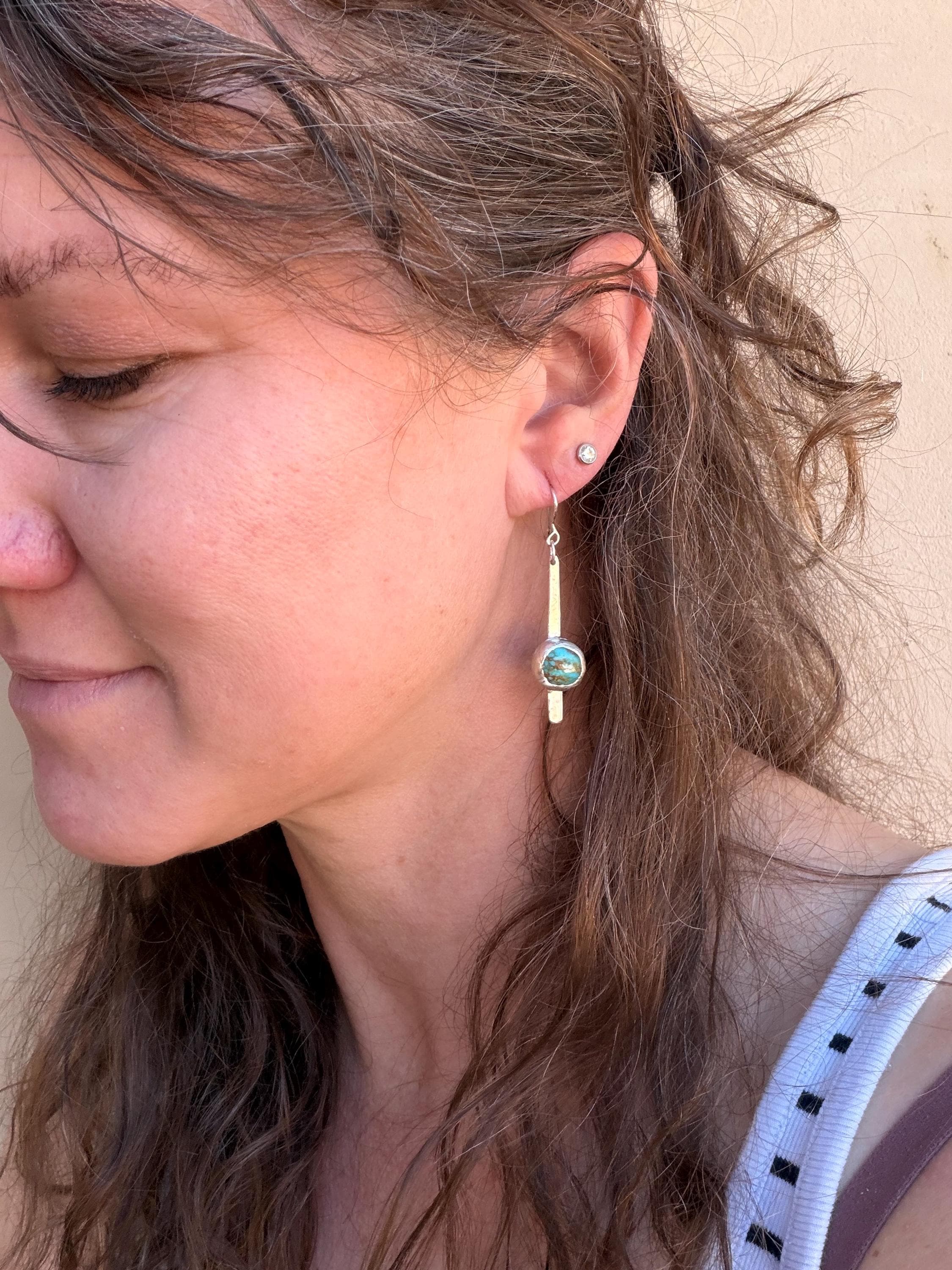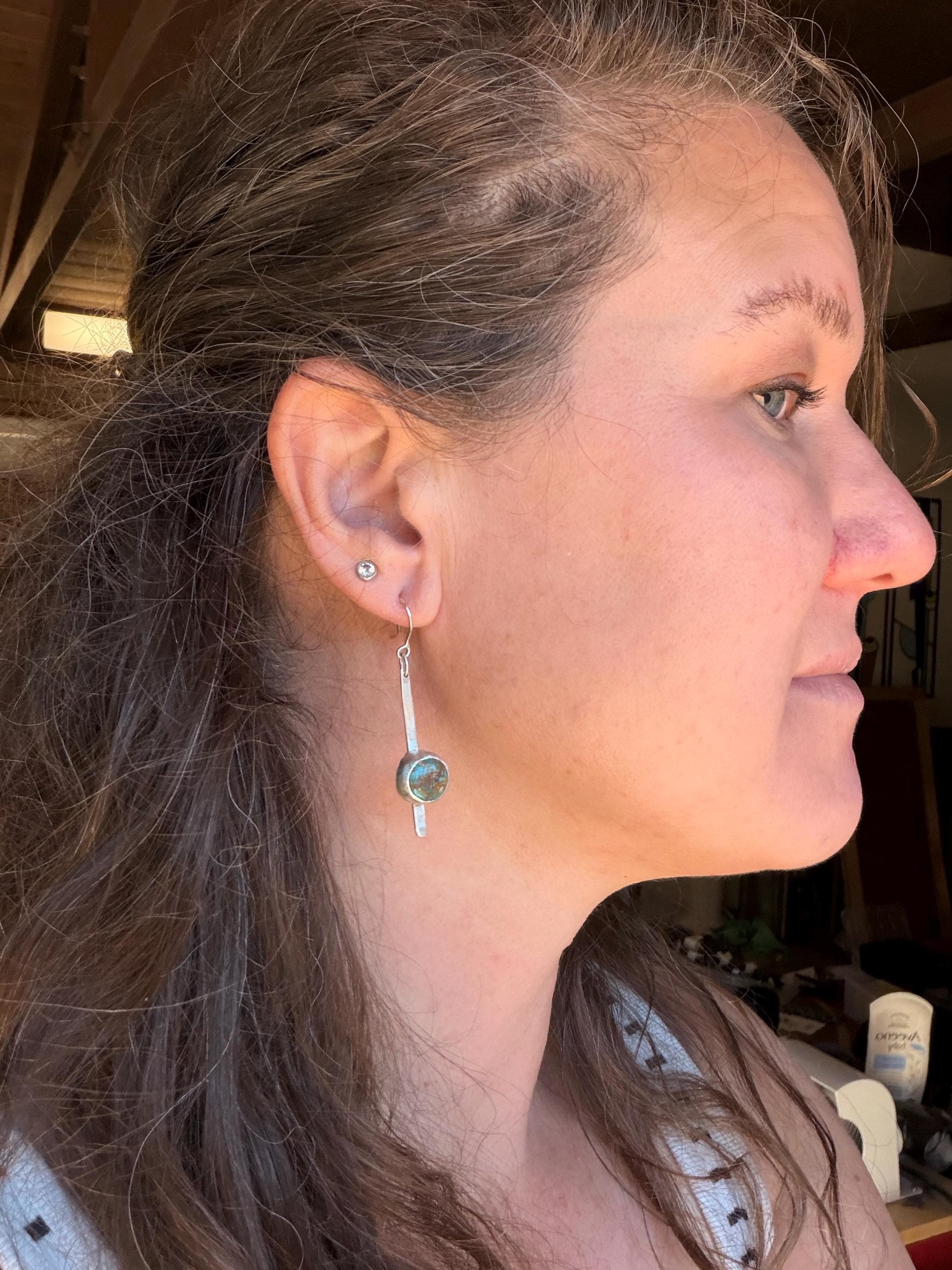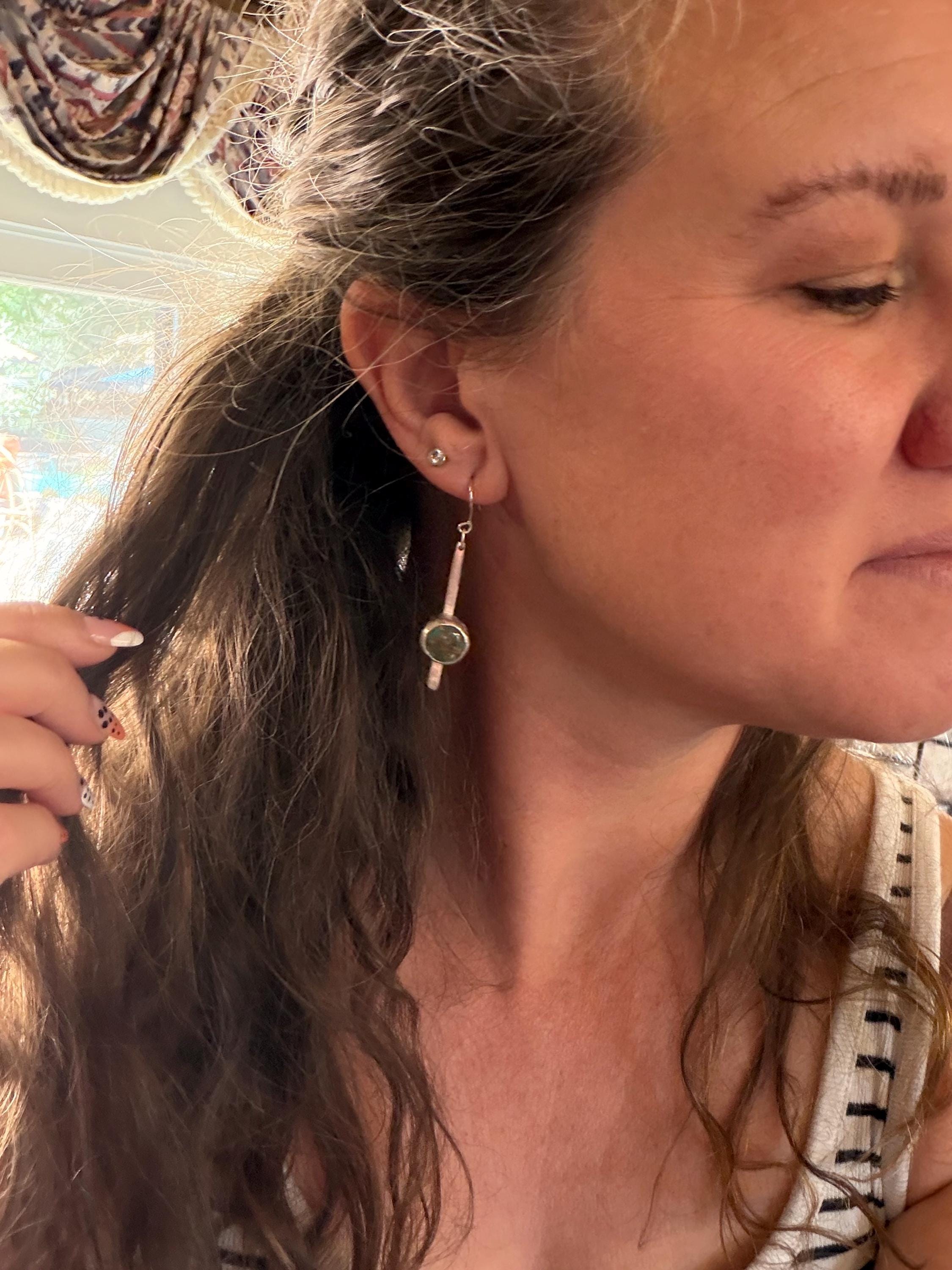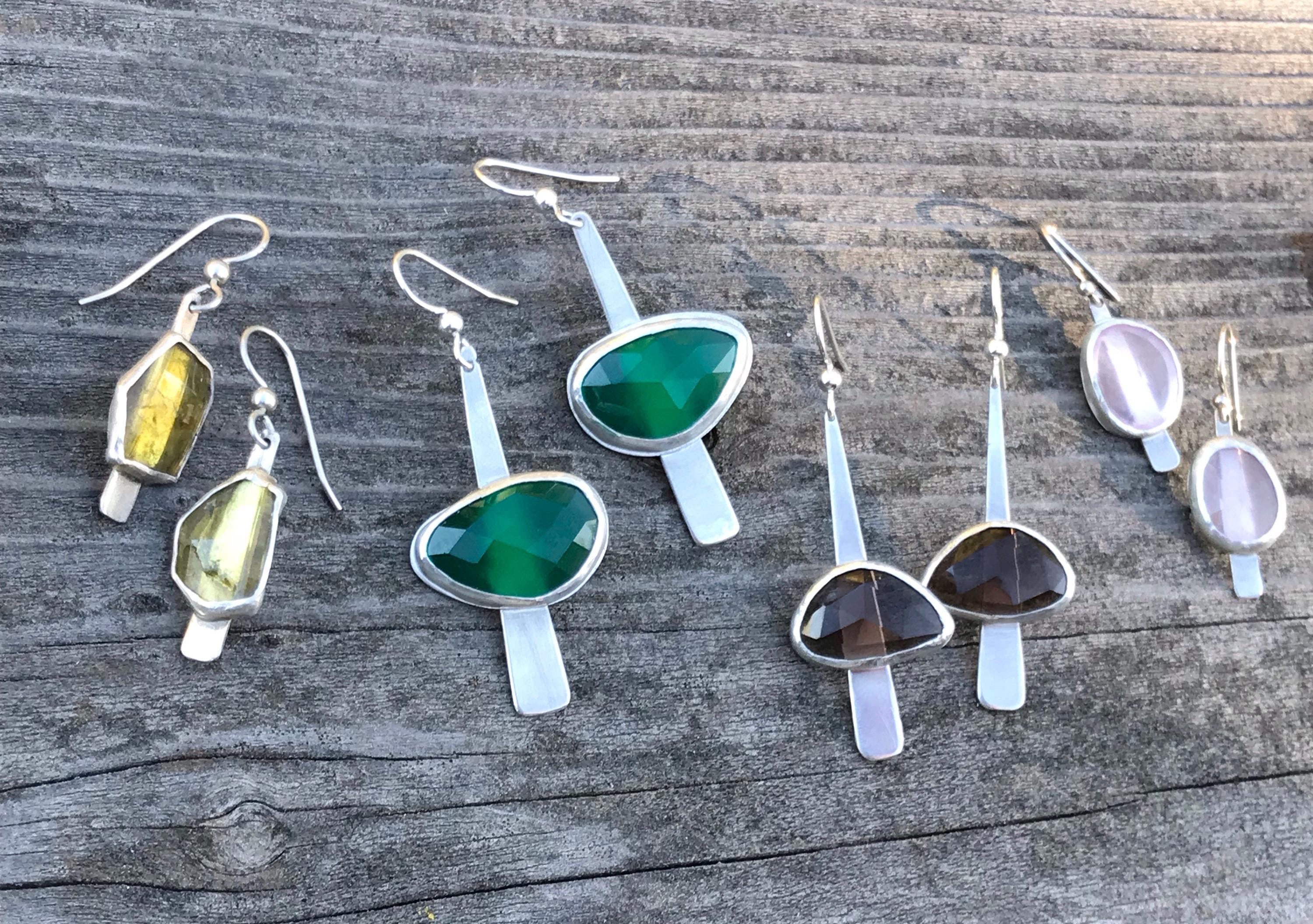 Materials: Sterling silver earwire, sheet metal cut to make a fringe like piece as a baseplate or the stone and fine silver bezel metal