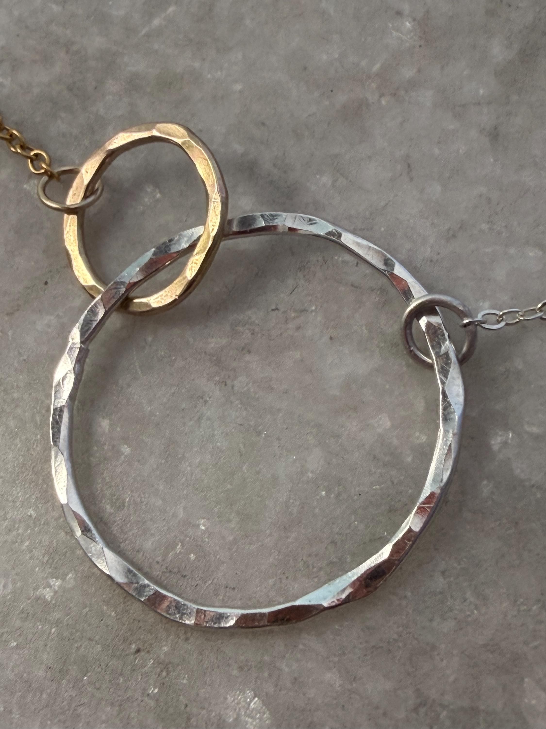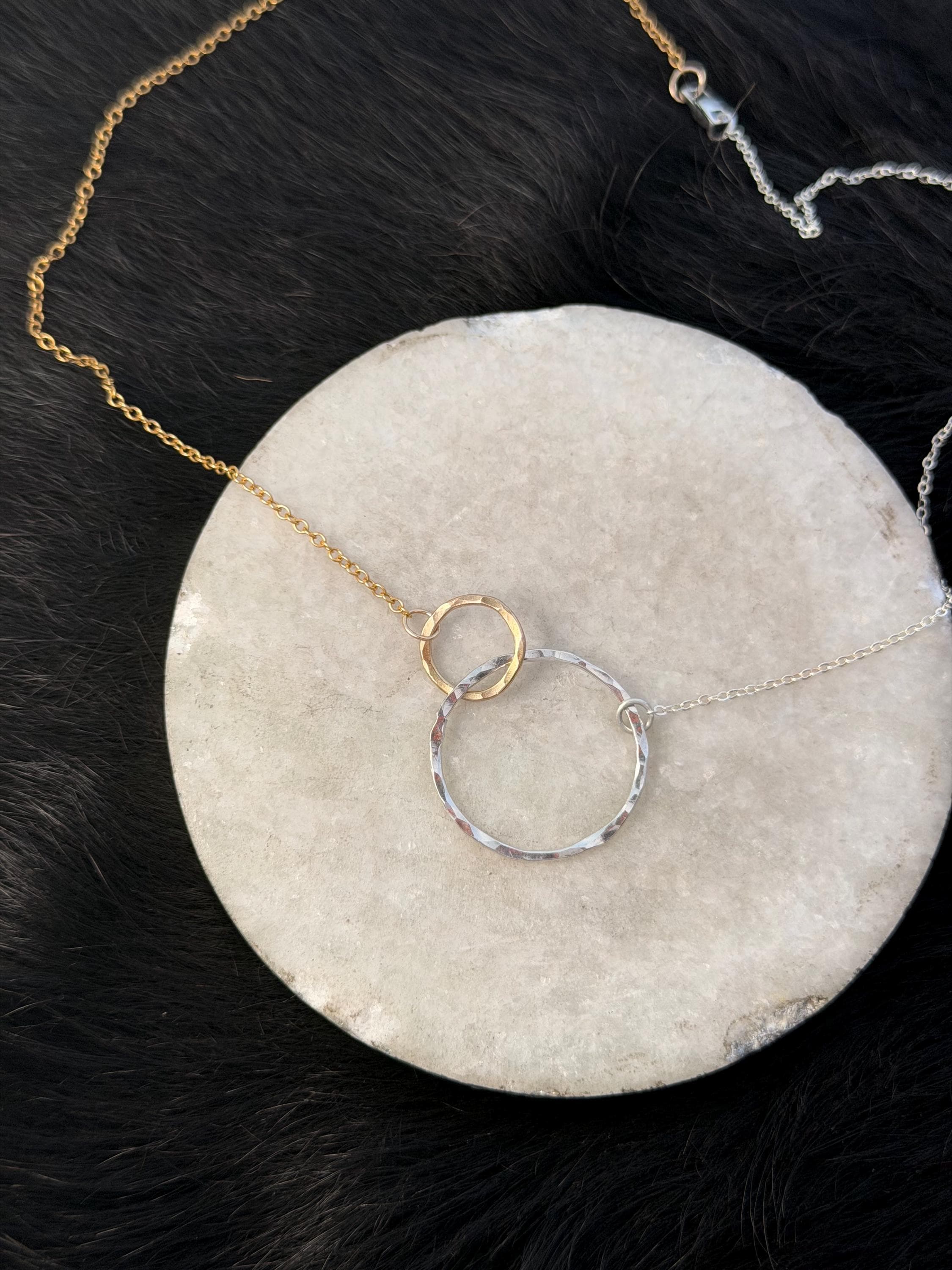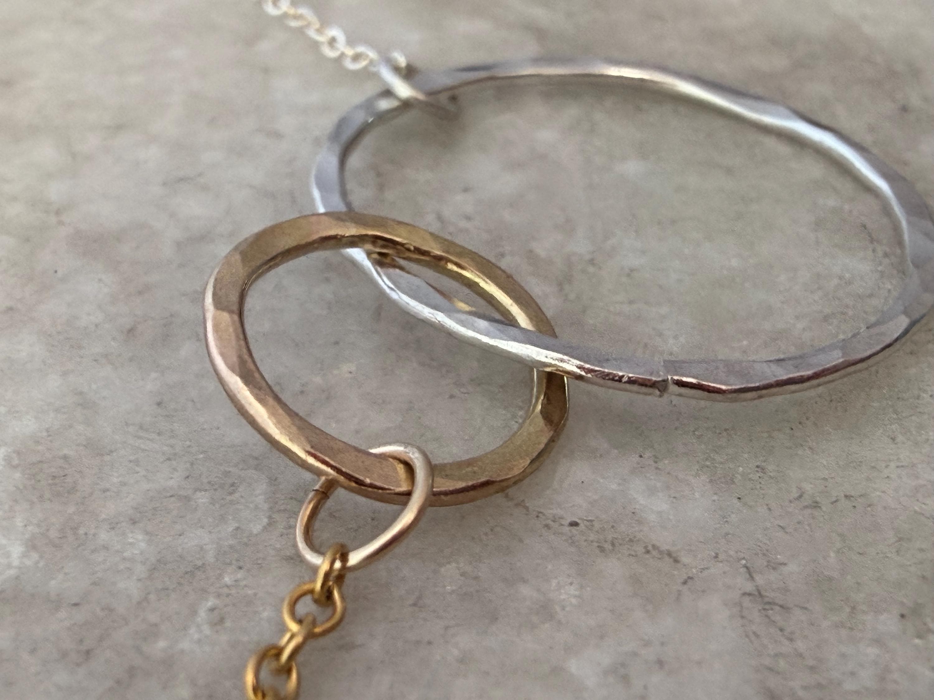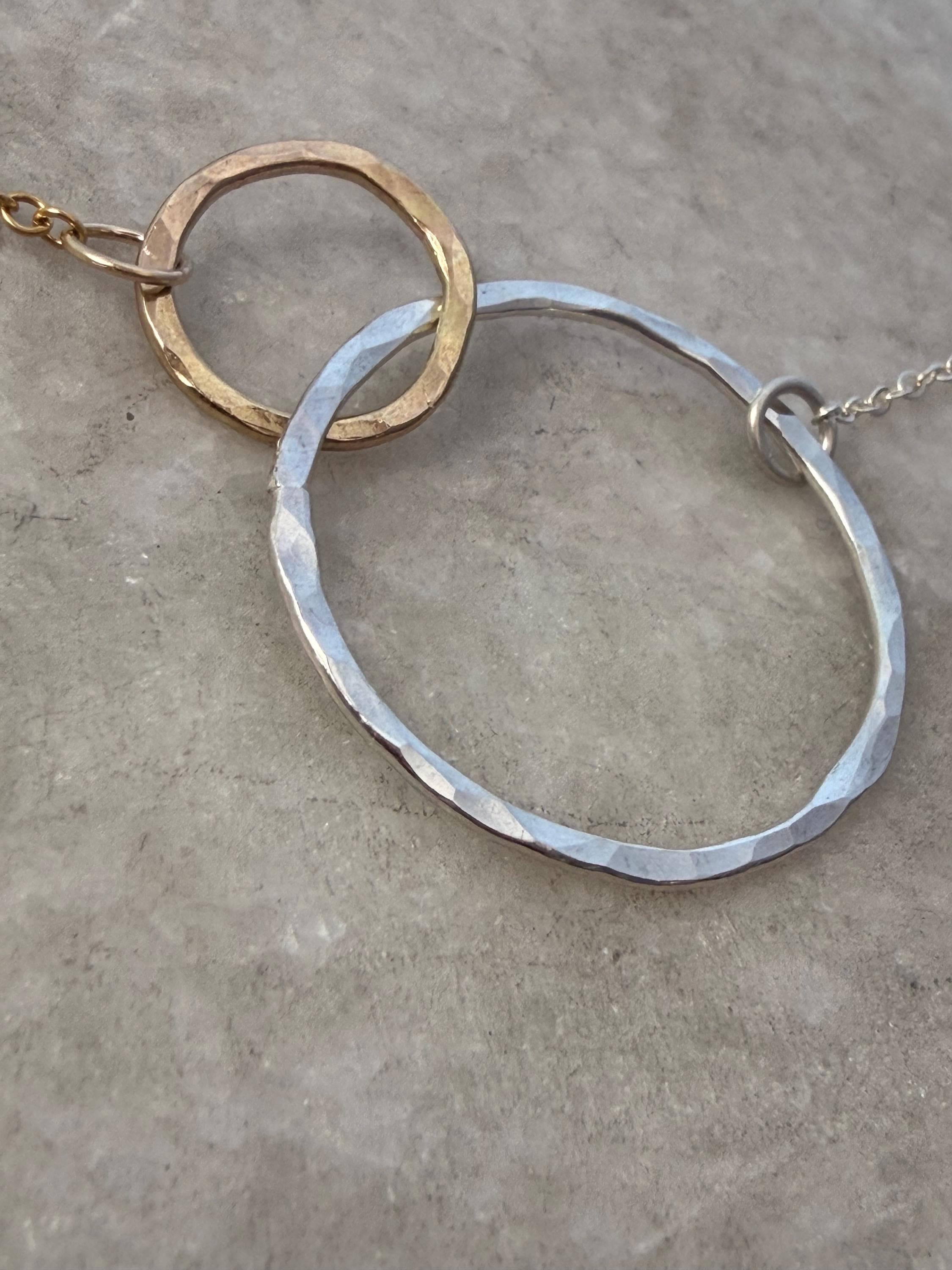 The Lydia necklace, made of sterling silver wire, forged and soldered to interlock and make a statement with their contrasting sizes. These circles are interlocking and provide a stunning movement quality. They are made by hand and finished off with a sterling silver chain on the silver circle and 14k yellow gold fill chain from the gold side totaling 20 inches long from clasp to clasp.