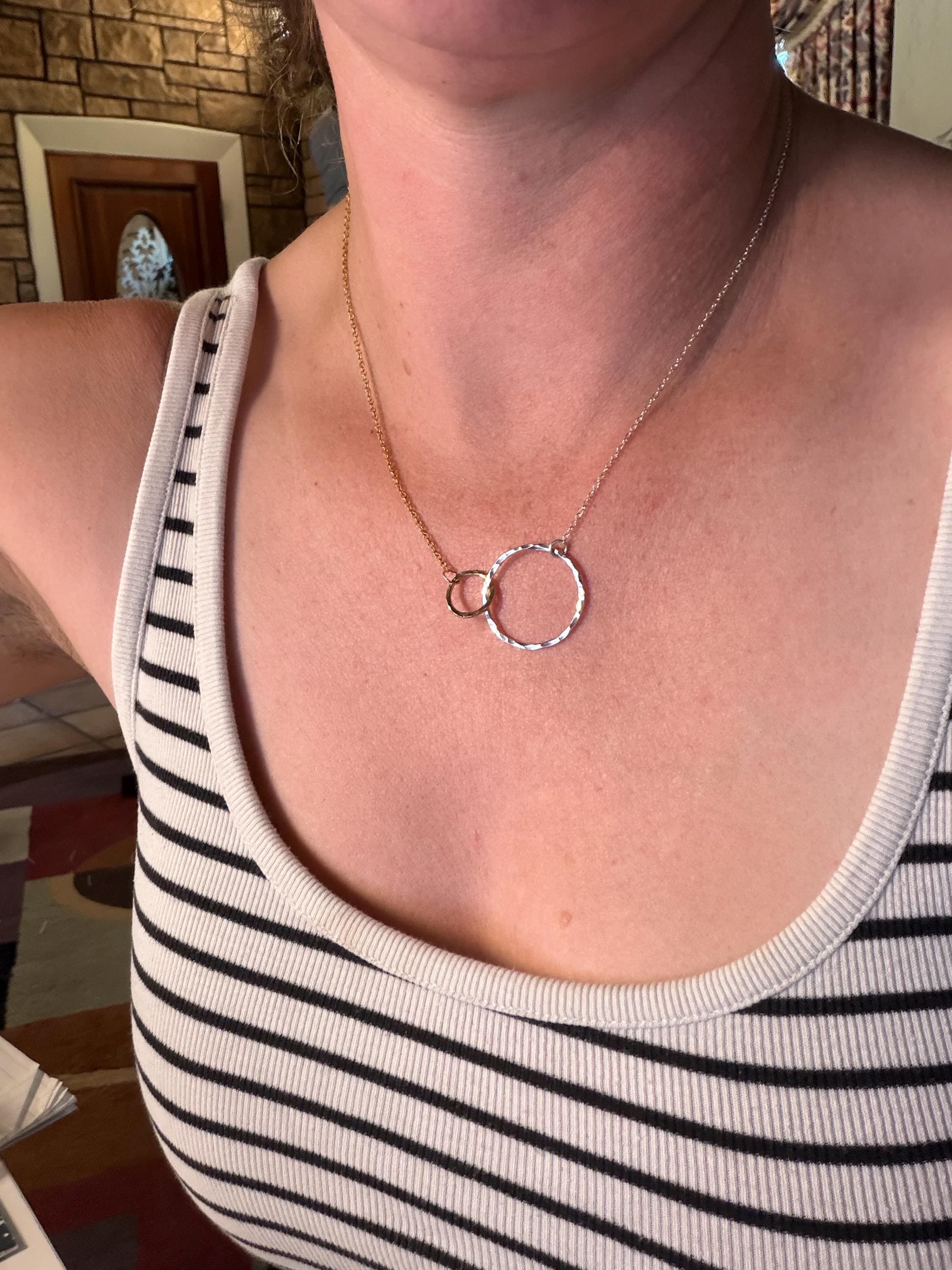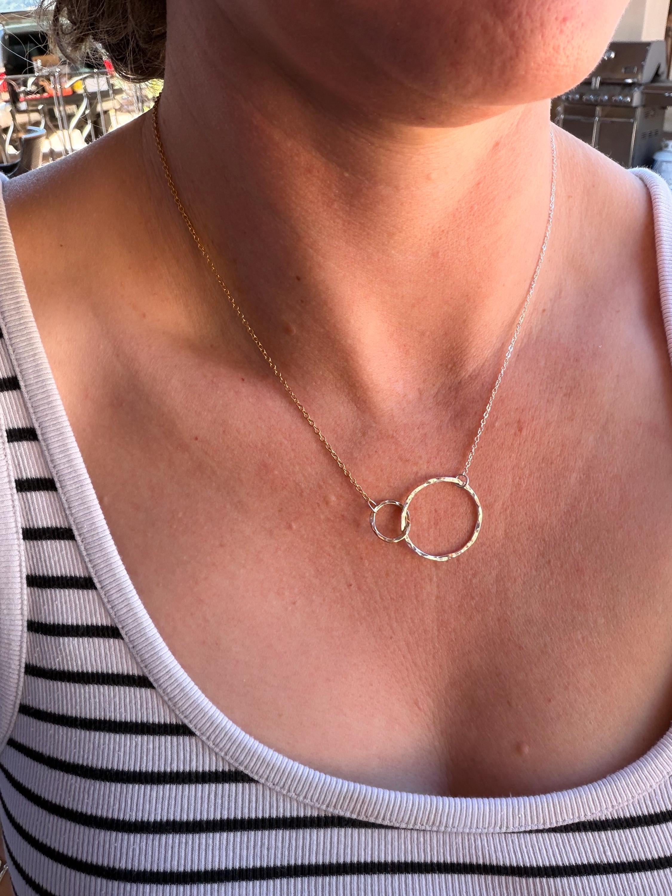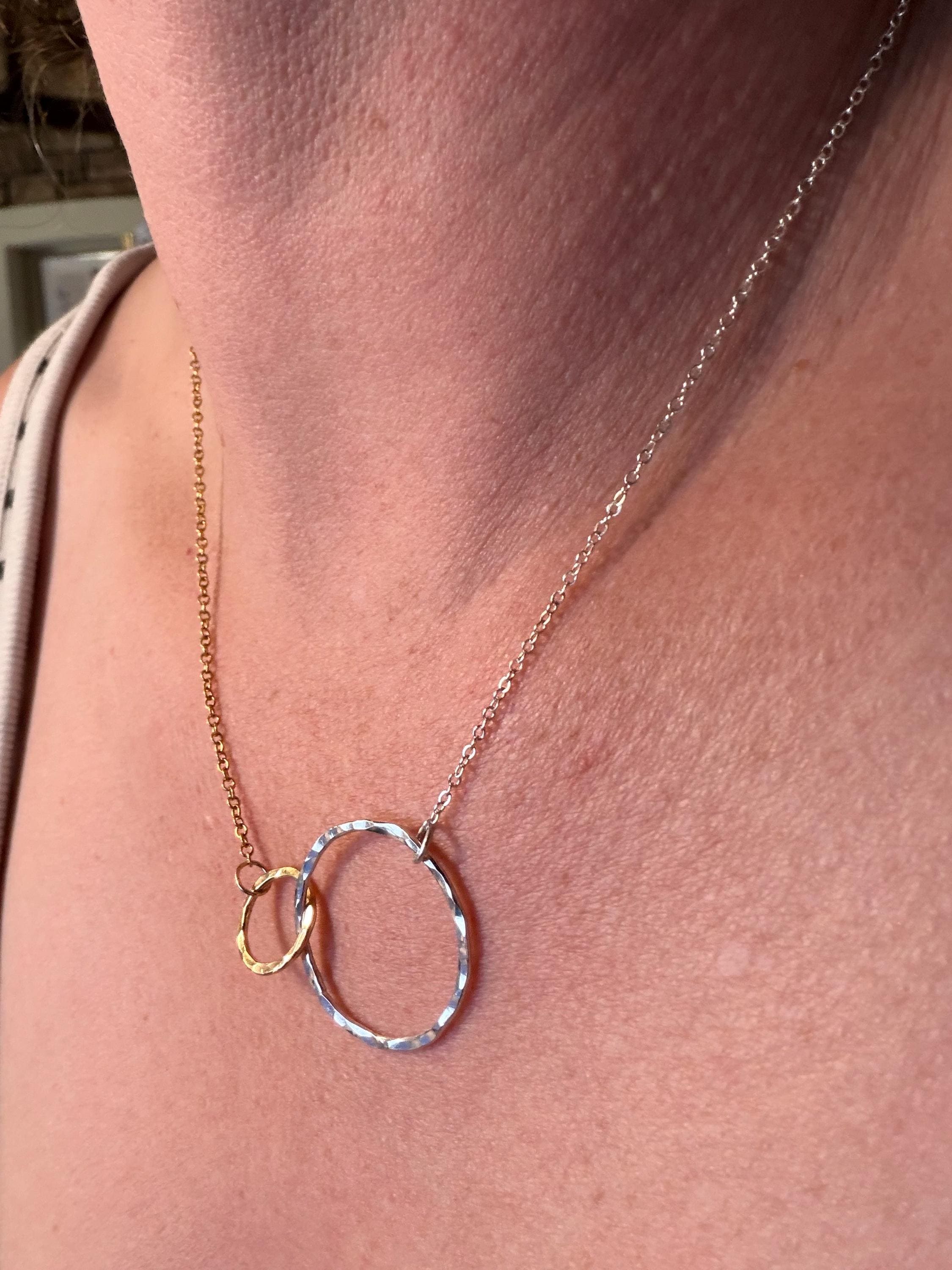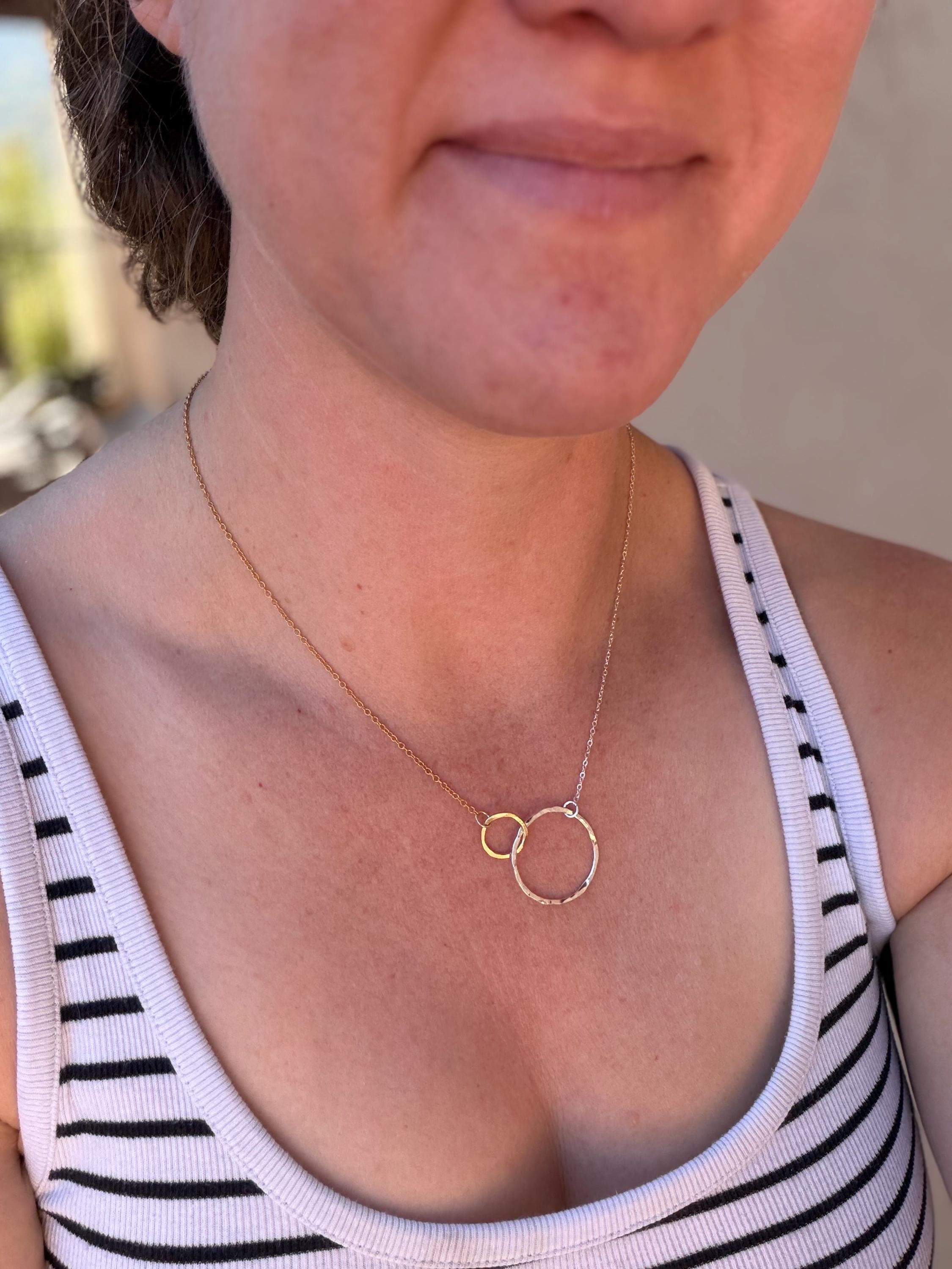 The Lydia necklace, made of sterling silver wire, forged and soldered to interlock and make a statement with their contrasting sizes. These circles are interlocking and provide a stunning movement quality. They are made by hand and finished off with a sterling silver chain on the silver circle and 14k yellow gold fill chain from the gold side totaling 20 inches long from clasp to clasp.