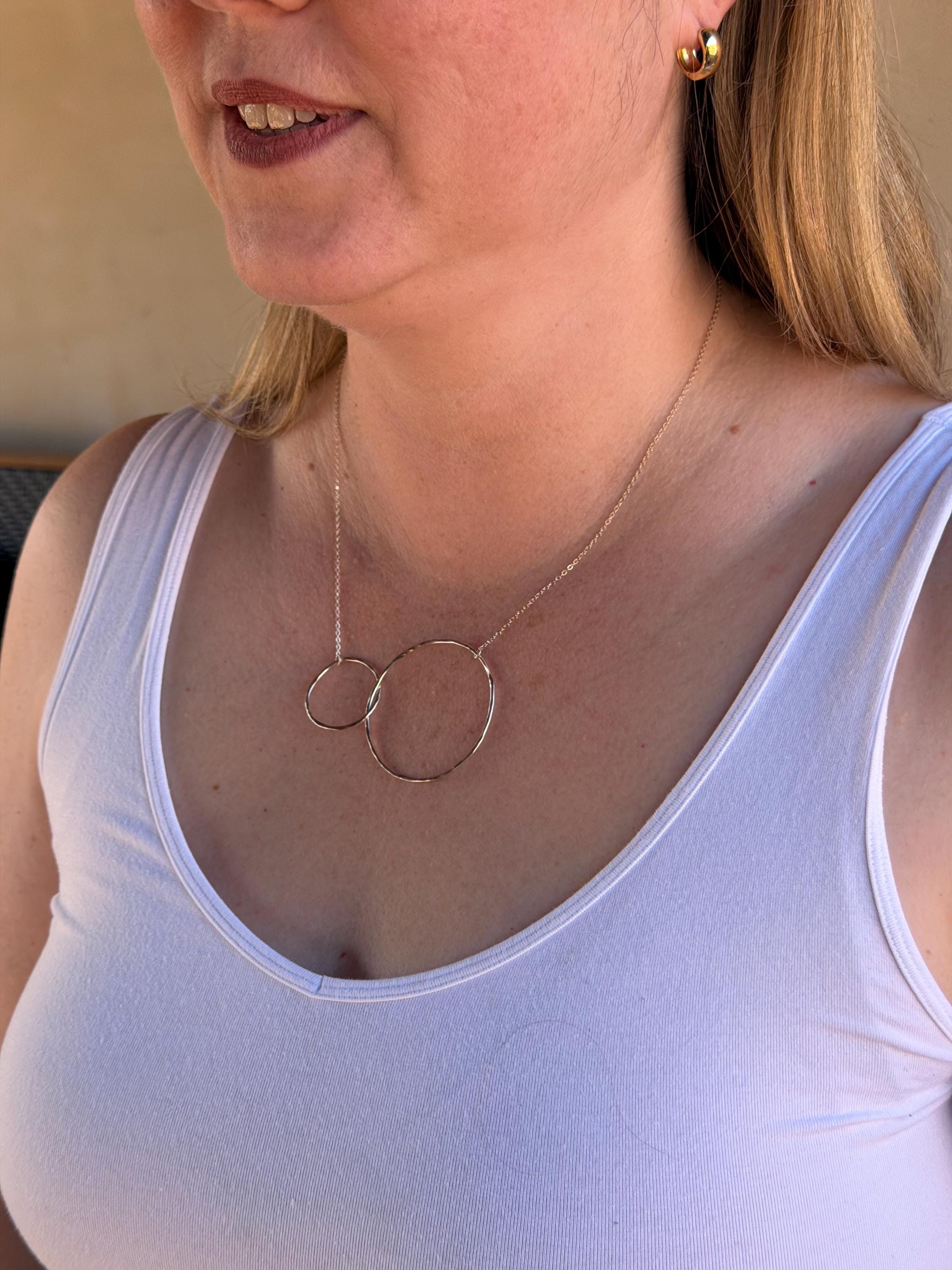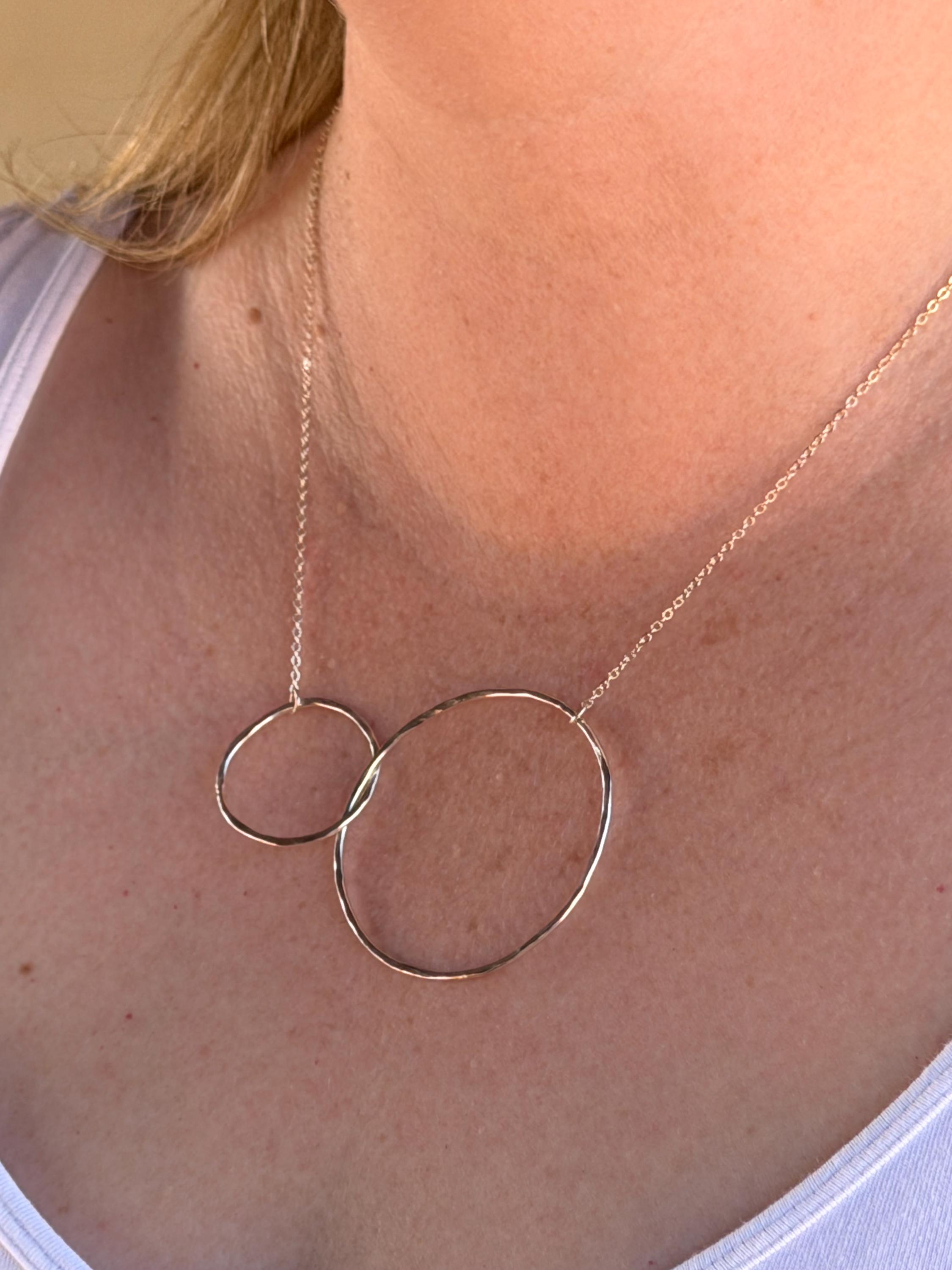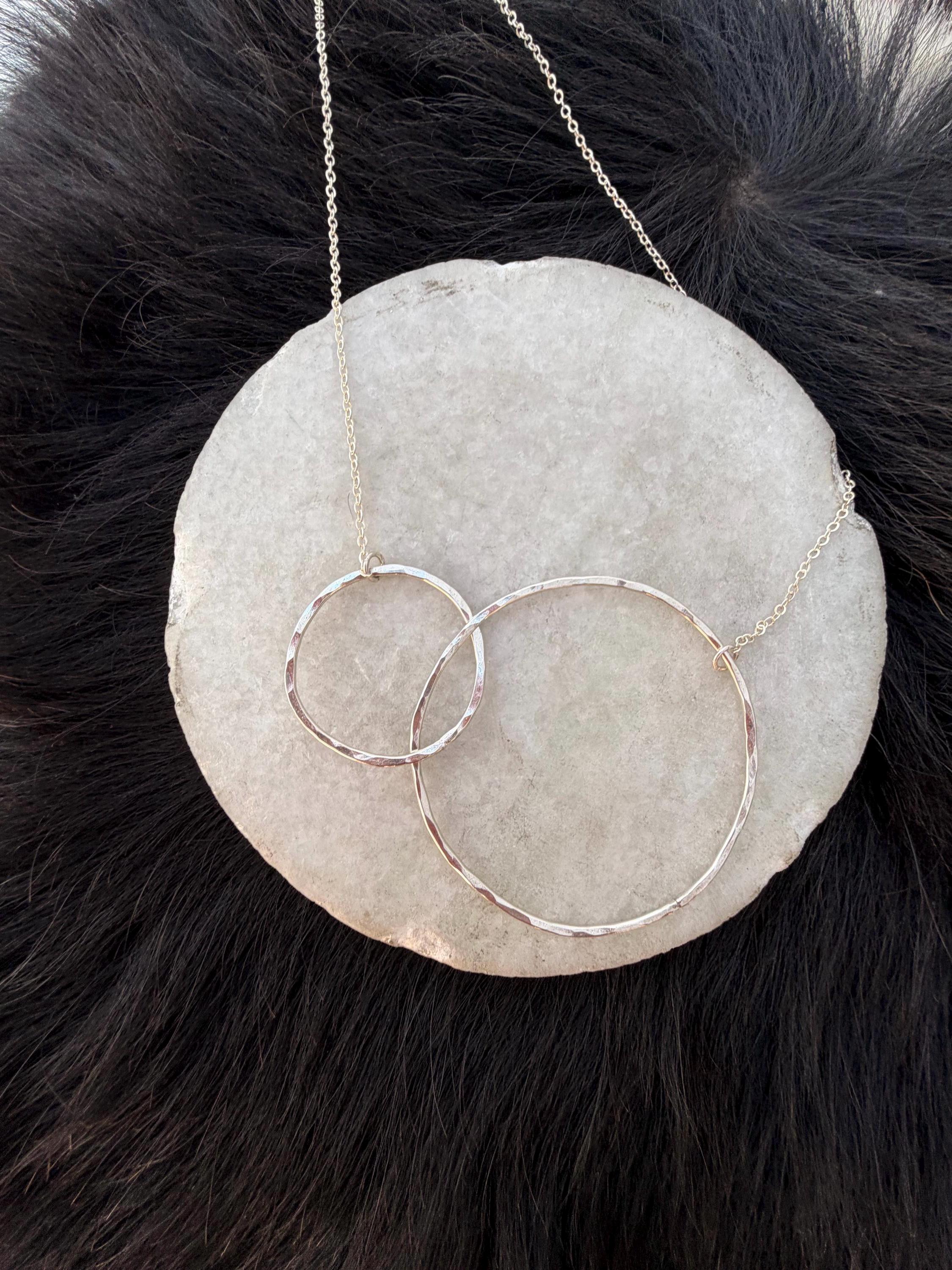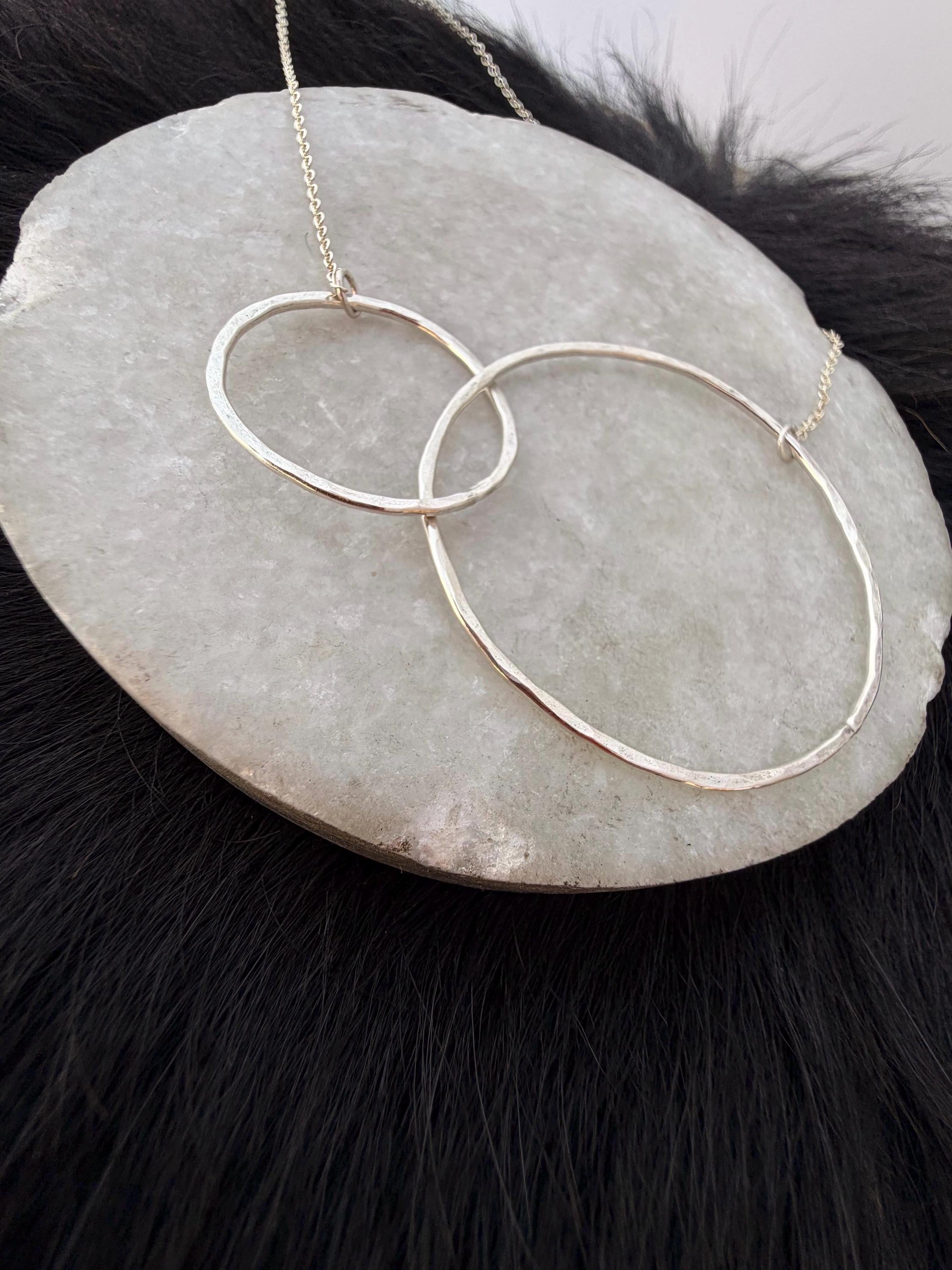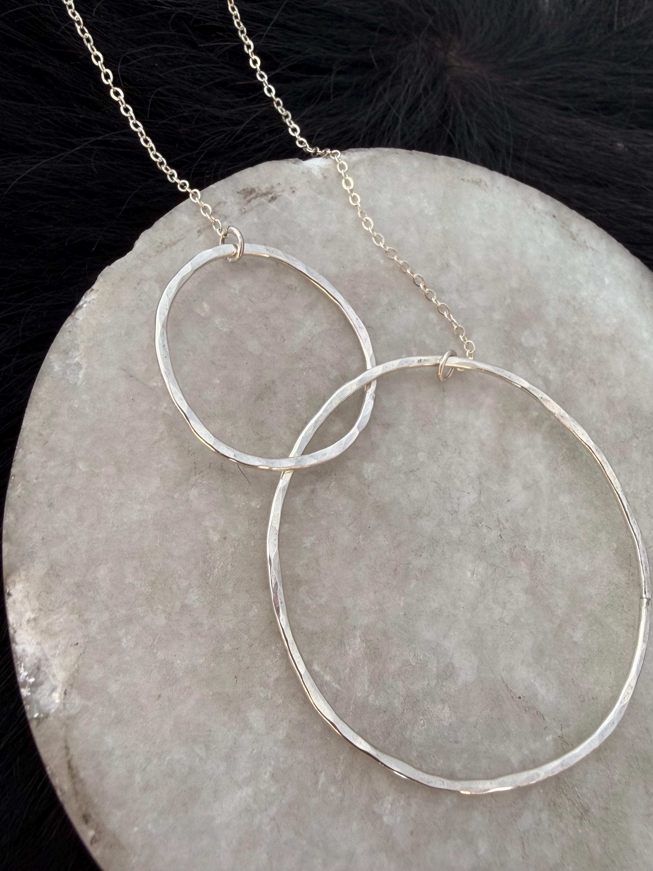 The Lydia necklace, made of sterling silver wire, forged and soldered to interlock and make a statement with their contrasting sizes. These circles are interlocking and provide a stunning movement quality. They are made by hand and finished off with a sterling silver chain totaling 20 inches long from clasp to clasp.