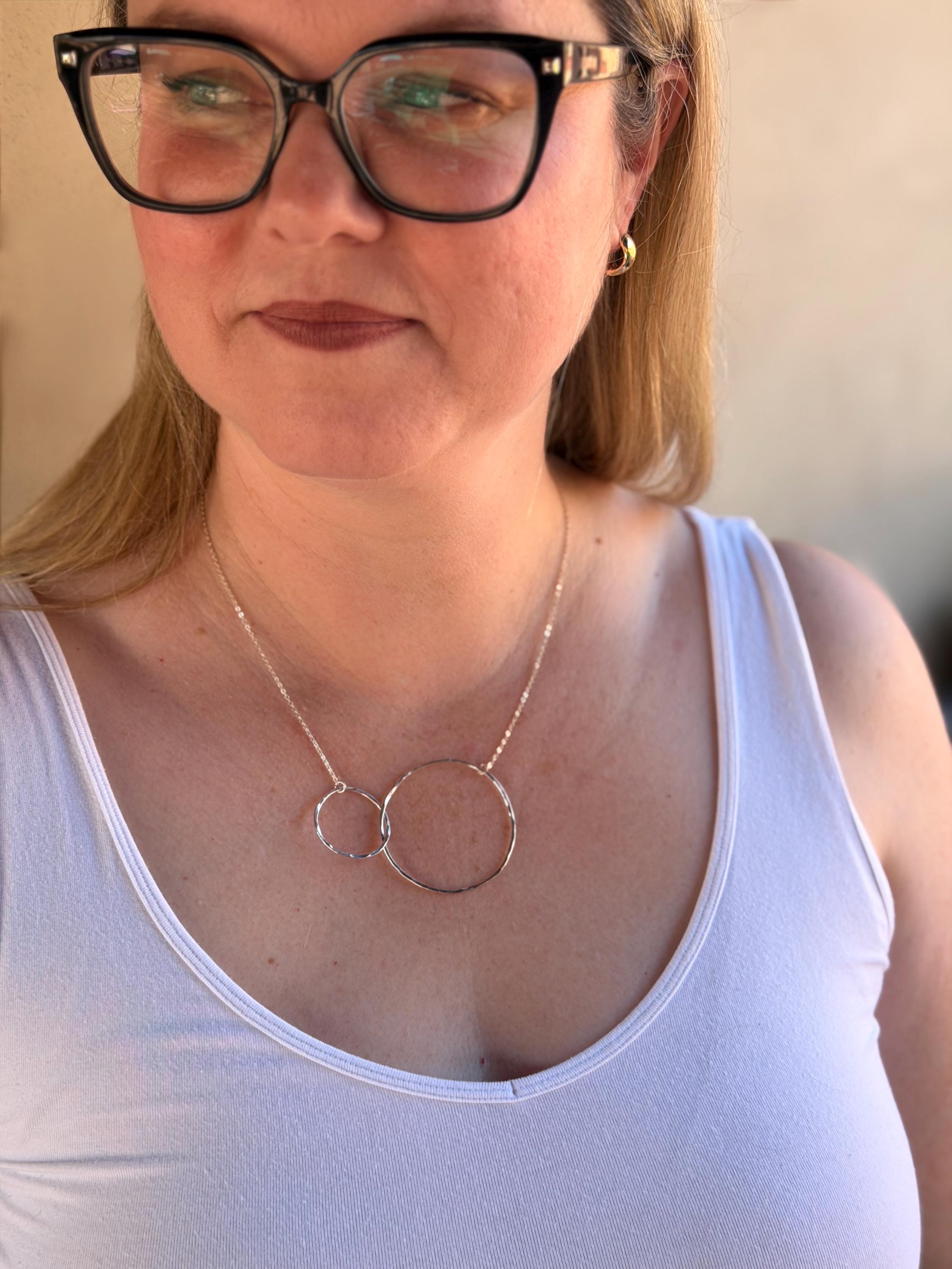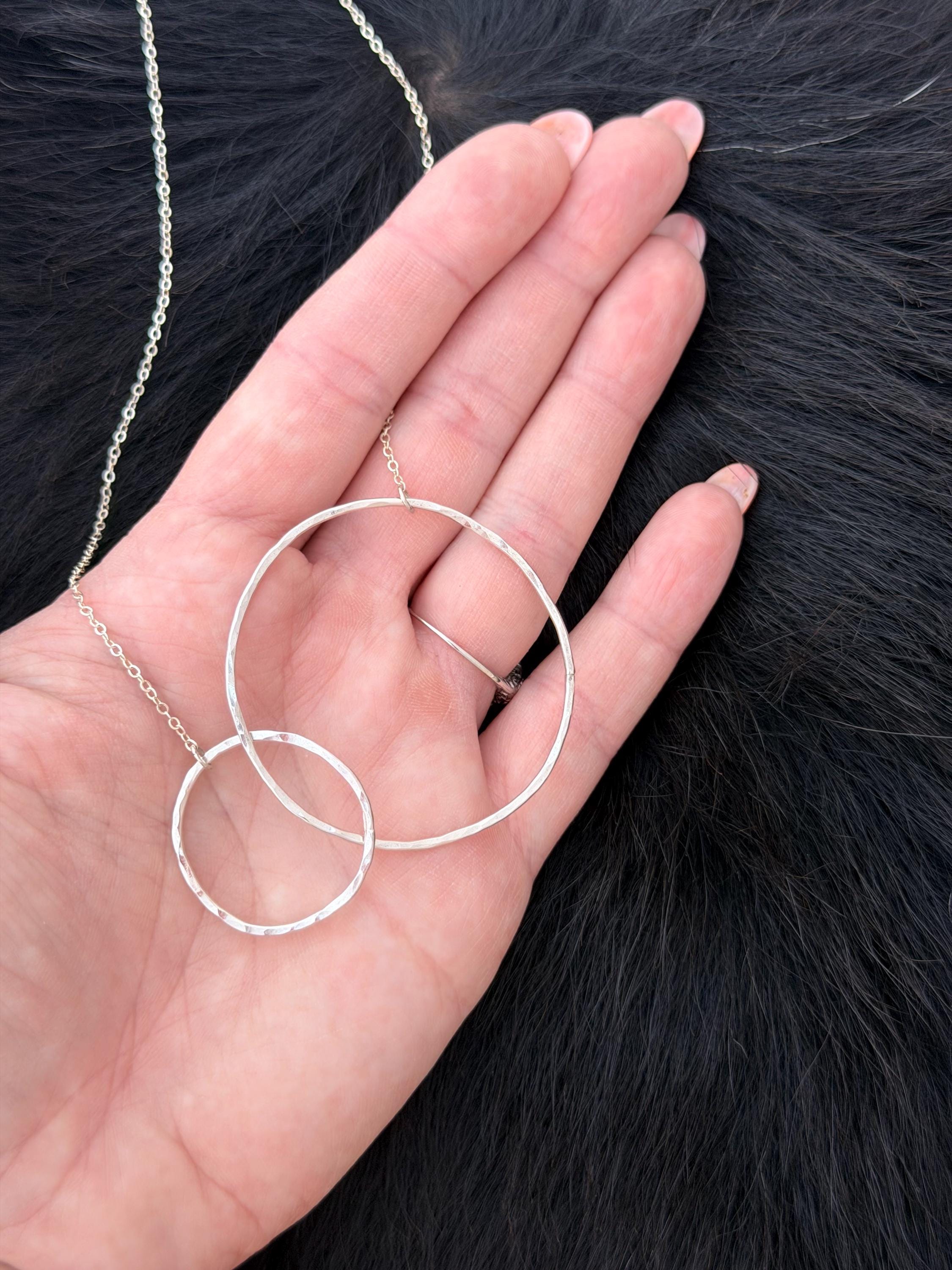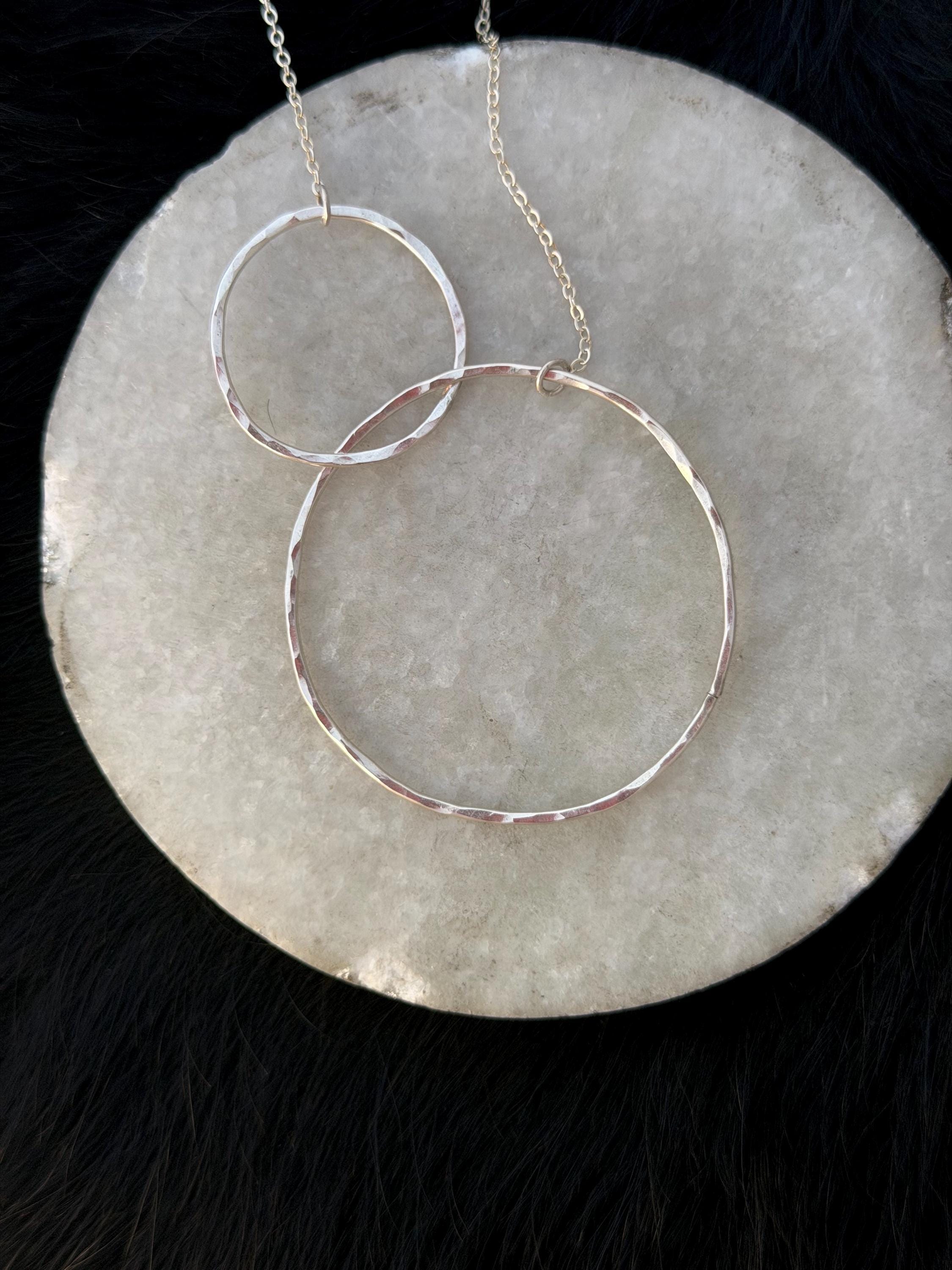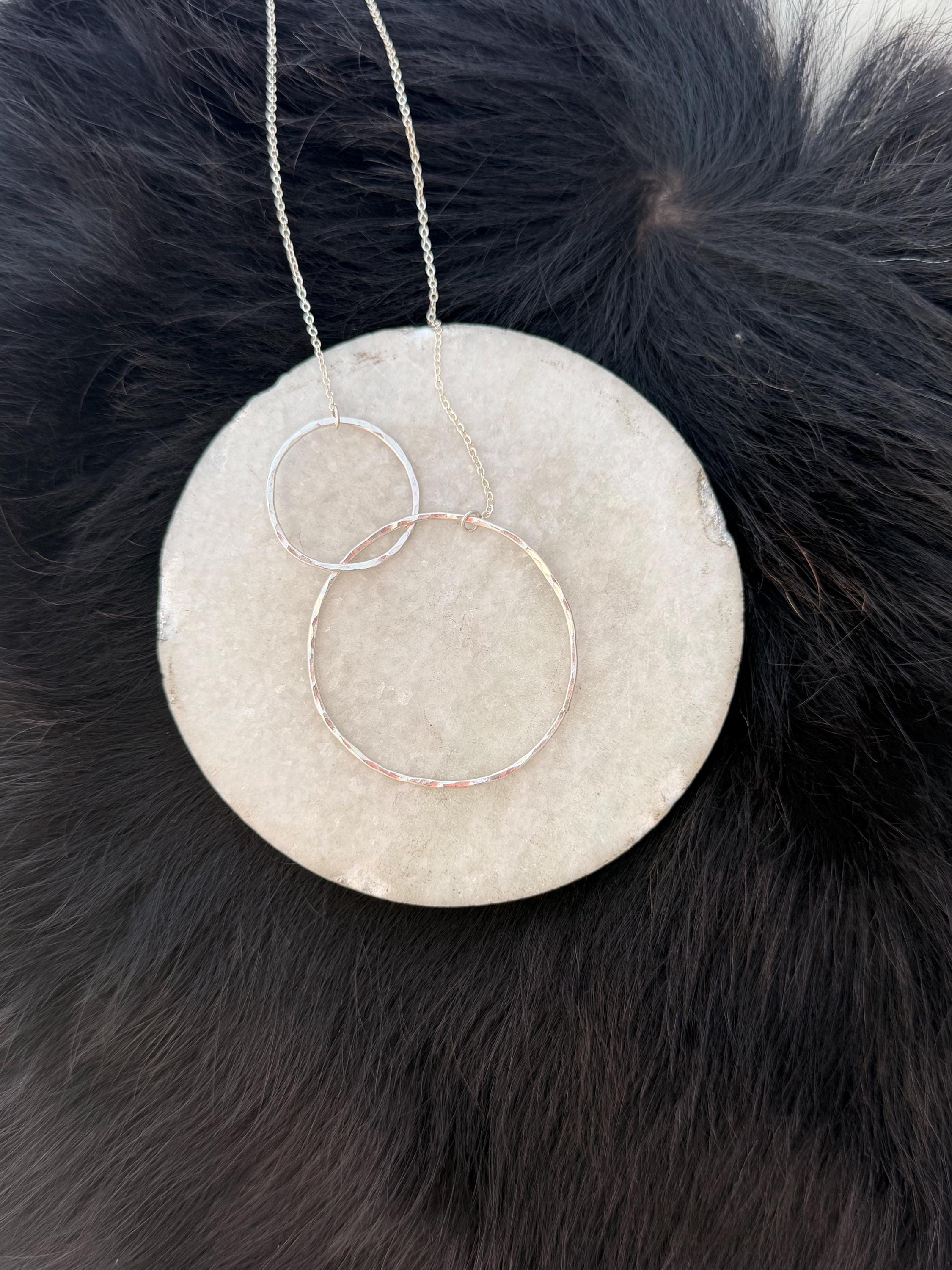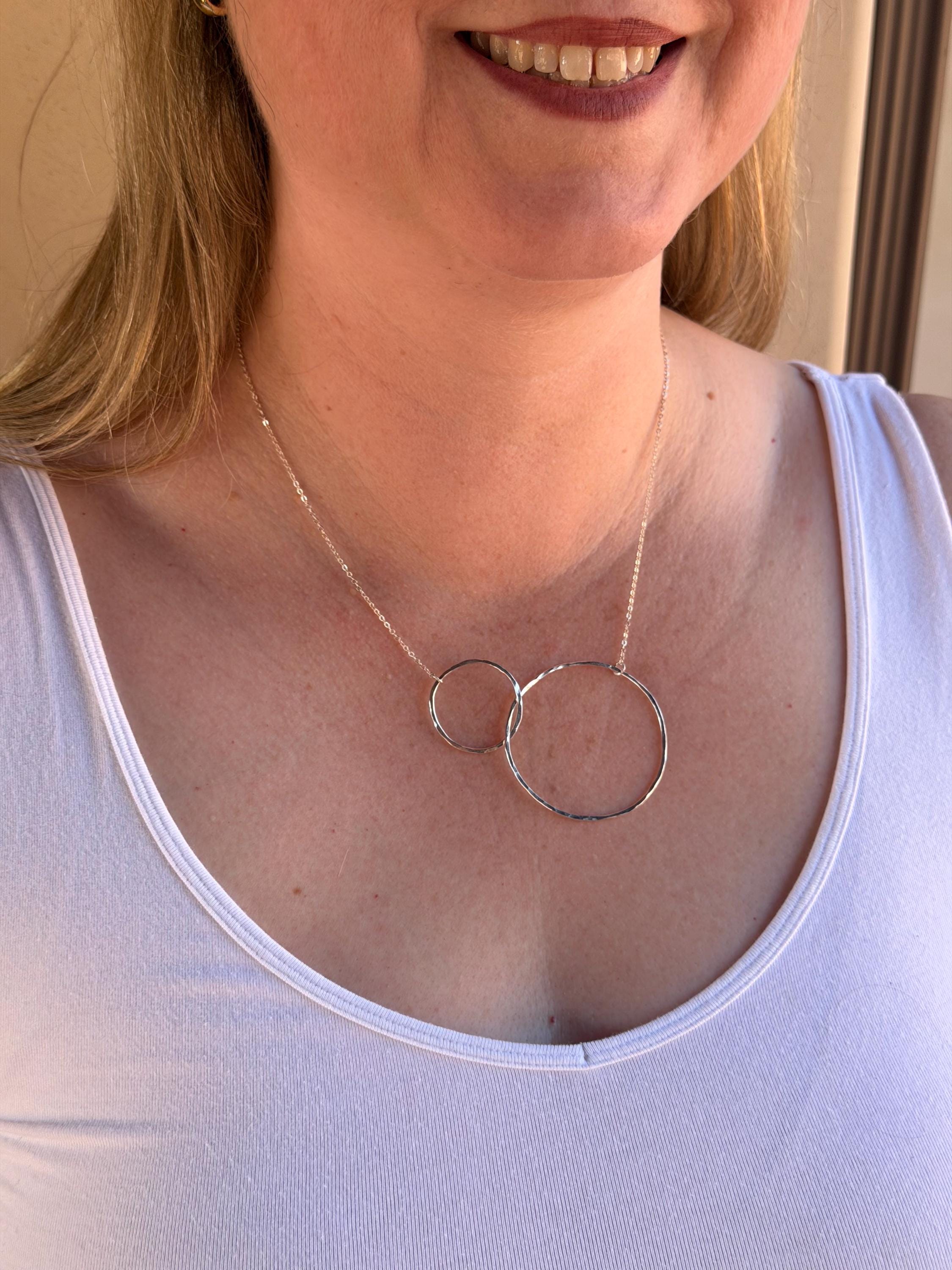 The Lydia necklace, made of sterling silver wire, forged and soldered to interlock and make a statement with their contrasting sizes. These circles are interlocking and provide a stunning movement quality. They are made by hand and finished off with a sterling silver chain totaling 20 inches long from clasp to clasp.