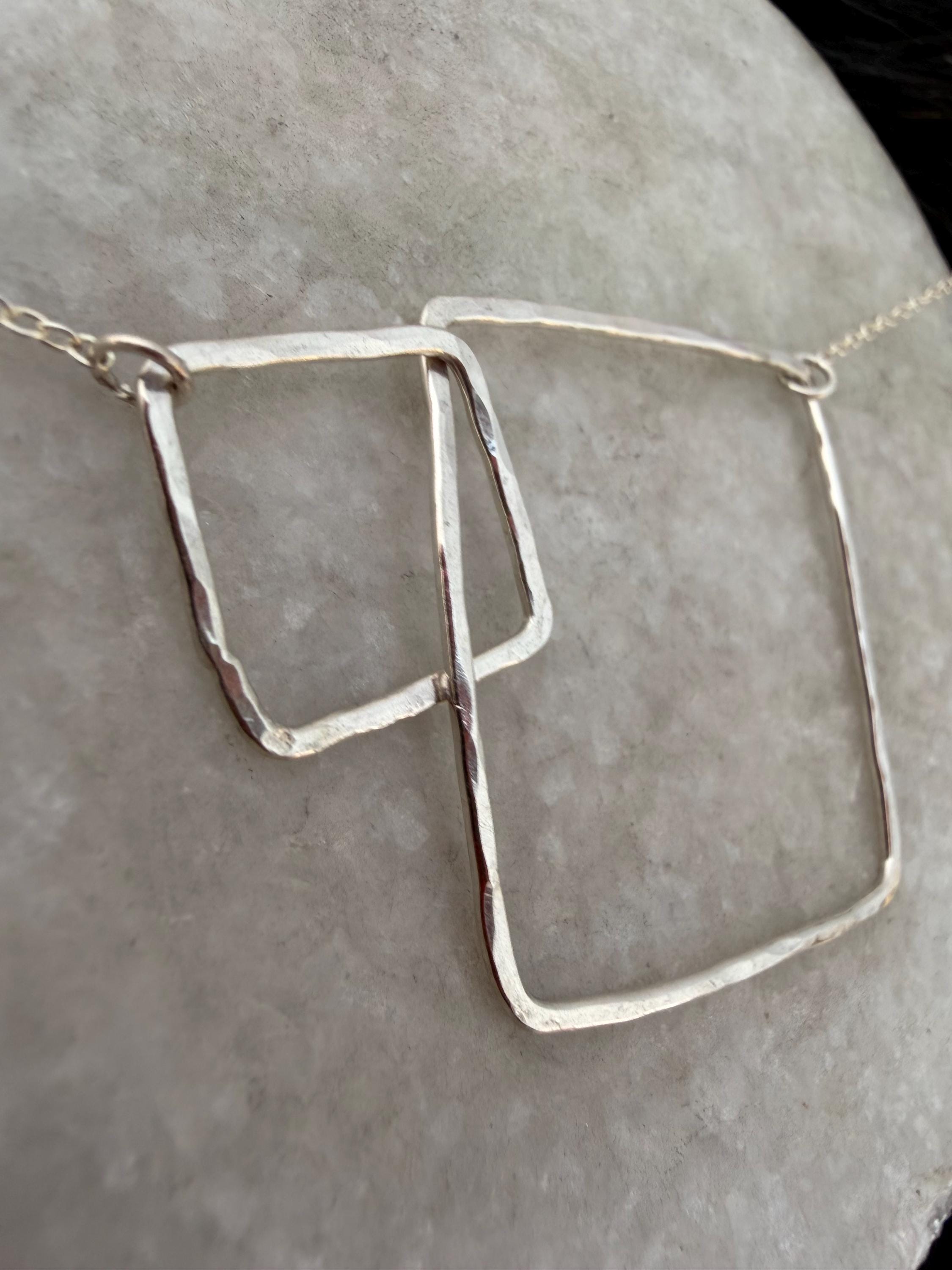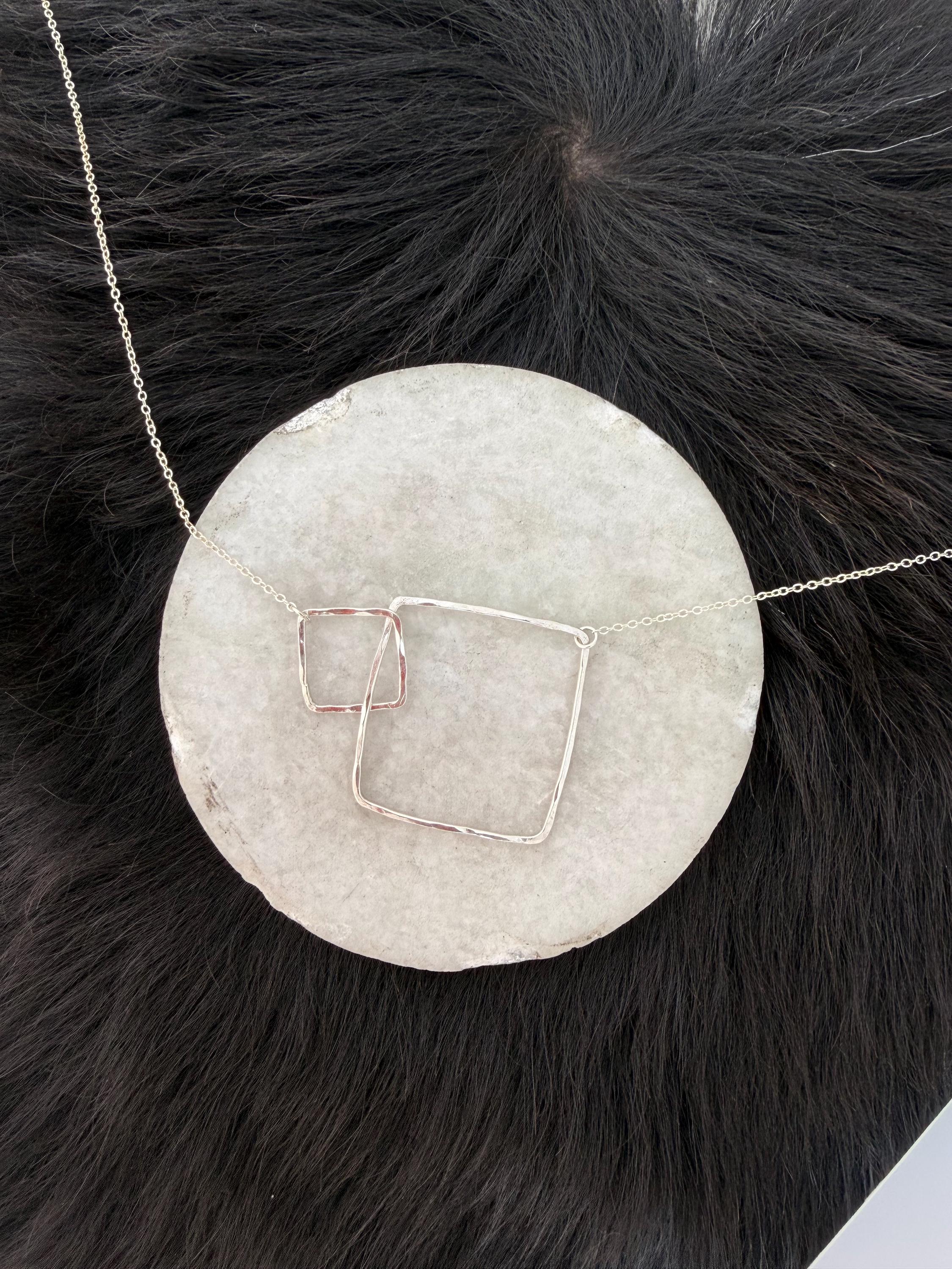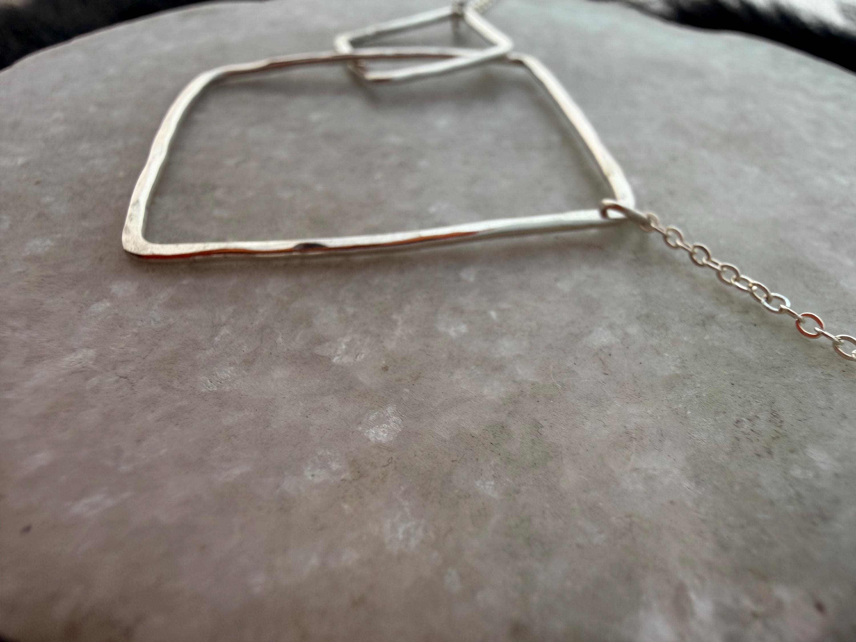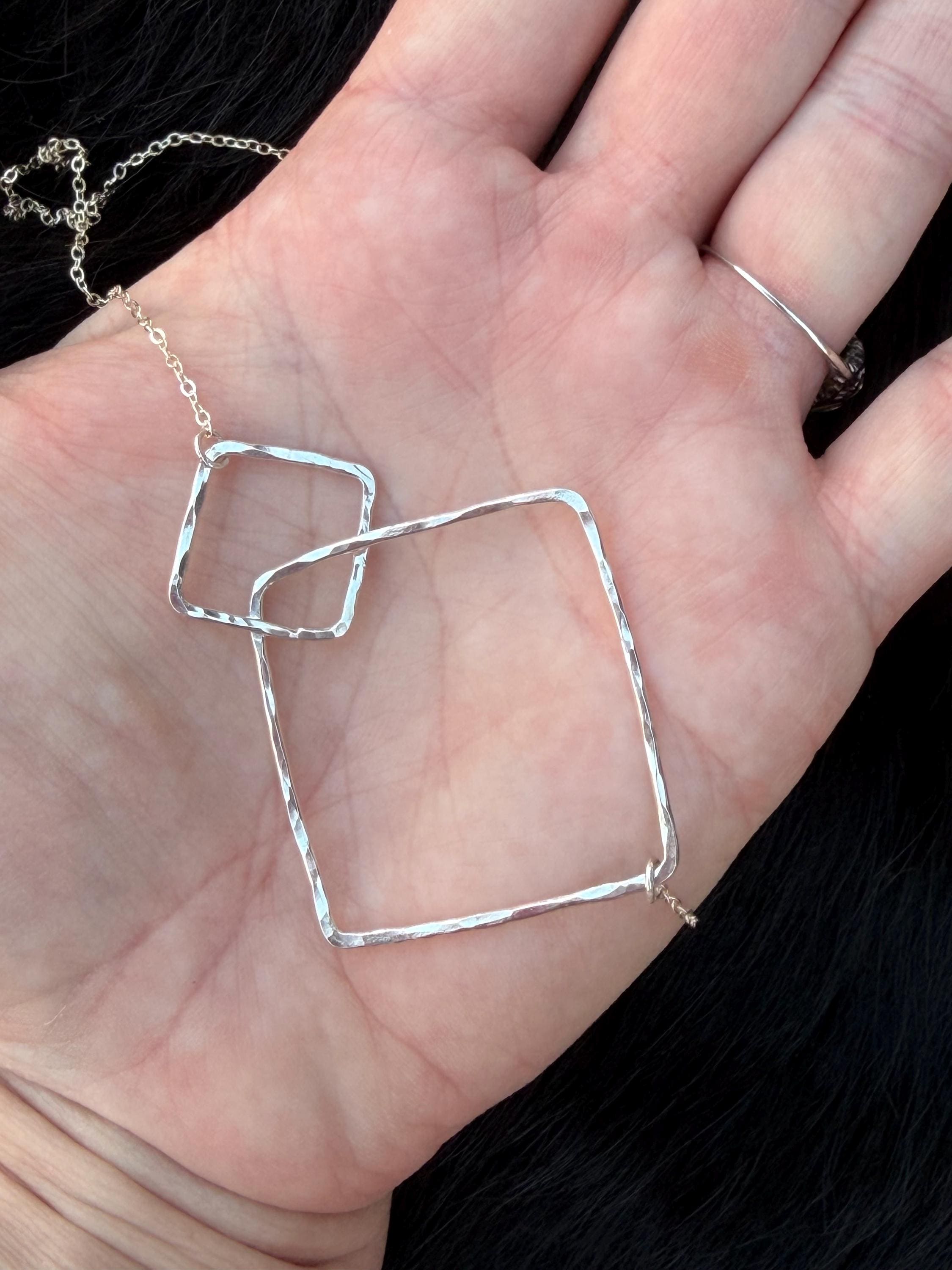 The Lydia necklace, made of sterling silver wire, forged and soldered to interlock and make a statement with their contrasting sizes. These square shapes are interlocking and provide a stunning movement quality. They are made by hand and finished off with a sterling silver chain totaling 21 inches long from clasp to clasp.