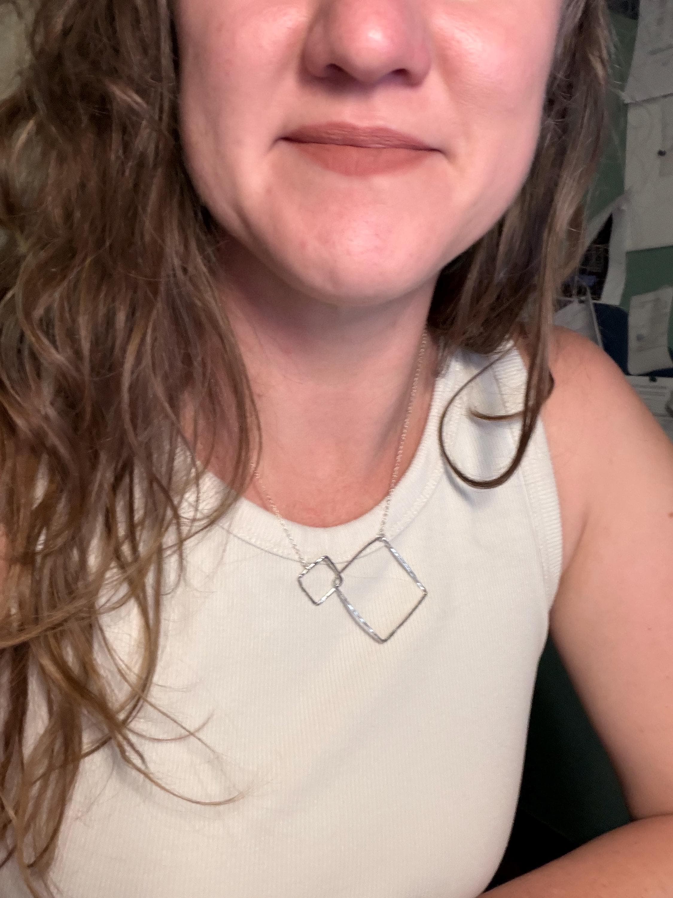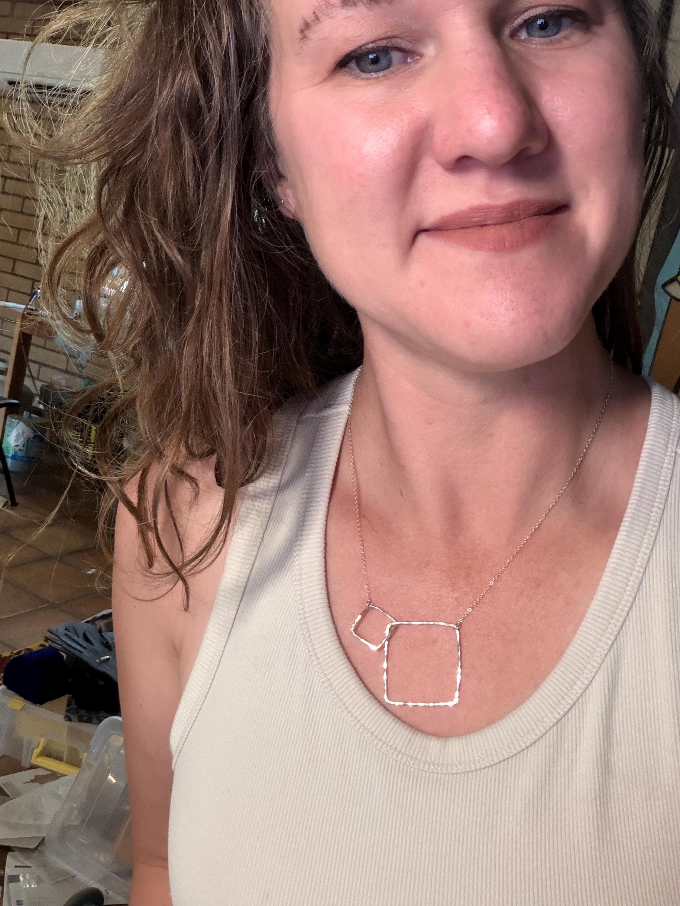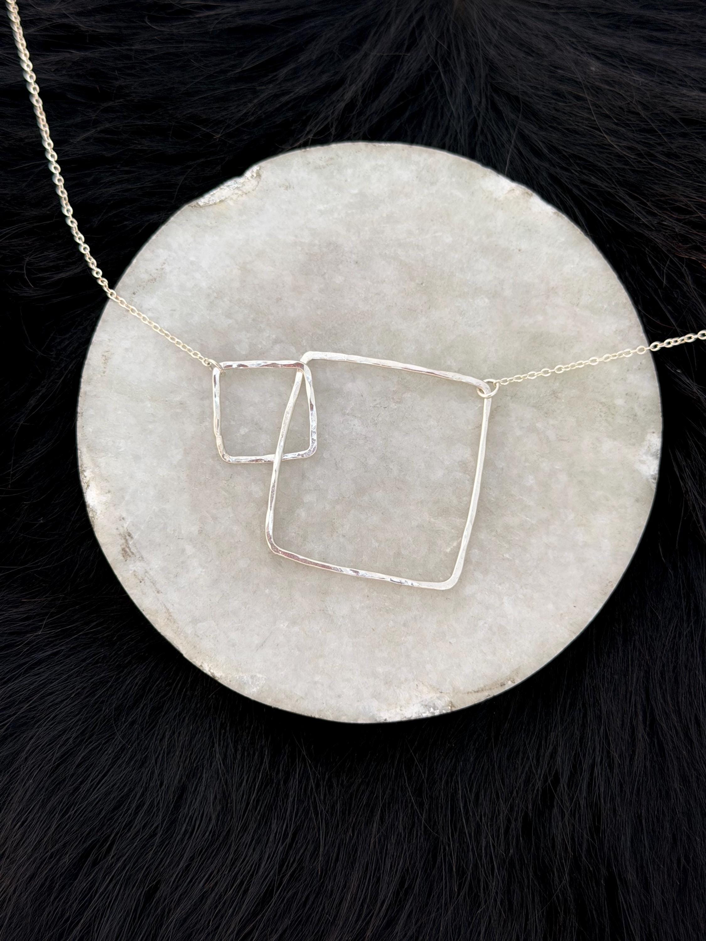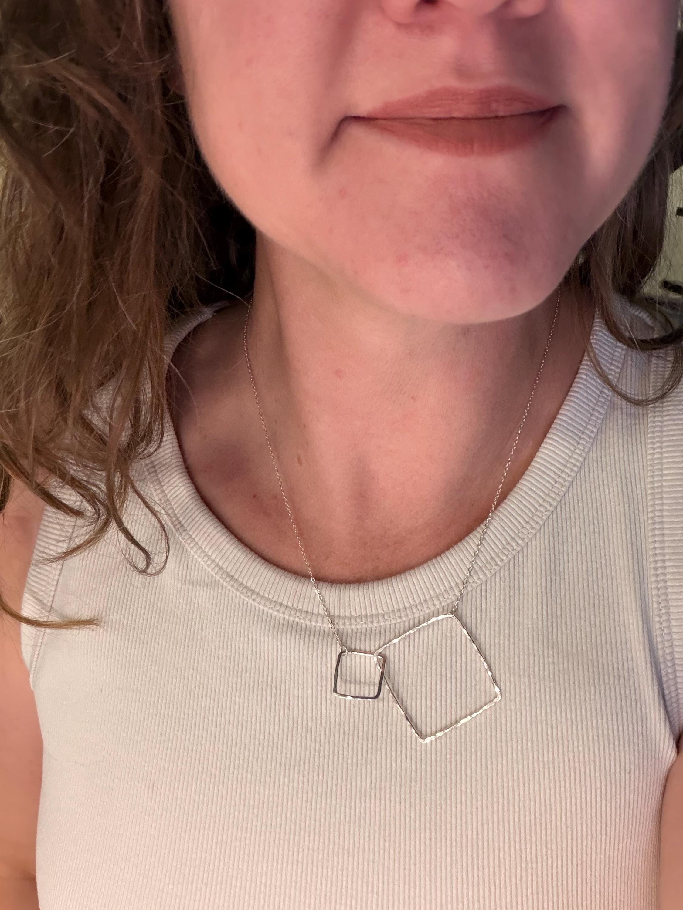 The Lydia necklace, made of sterling silver wire, forged and soldered to interlock and make a statement with their contrasting sizes. These square shapes are interlocking and provide a stunning movement quality. They are made by hand and finished off with a sterling silver chain totaling 21 inches long from clasp to clasp.