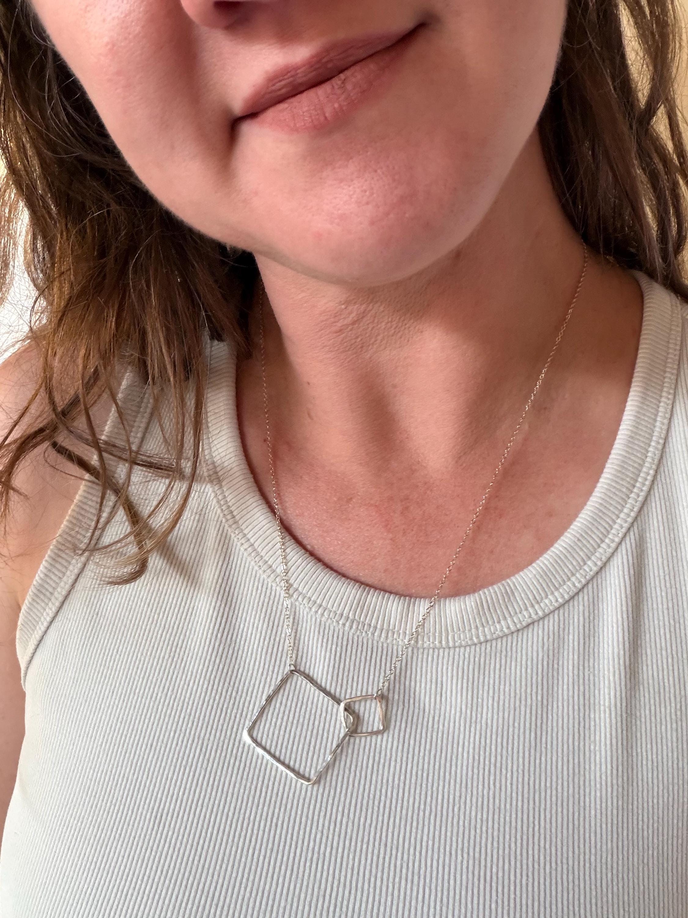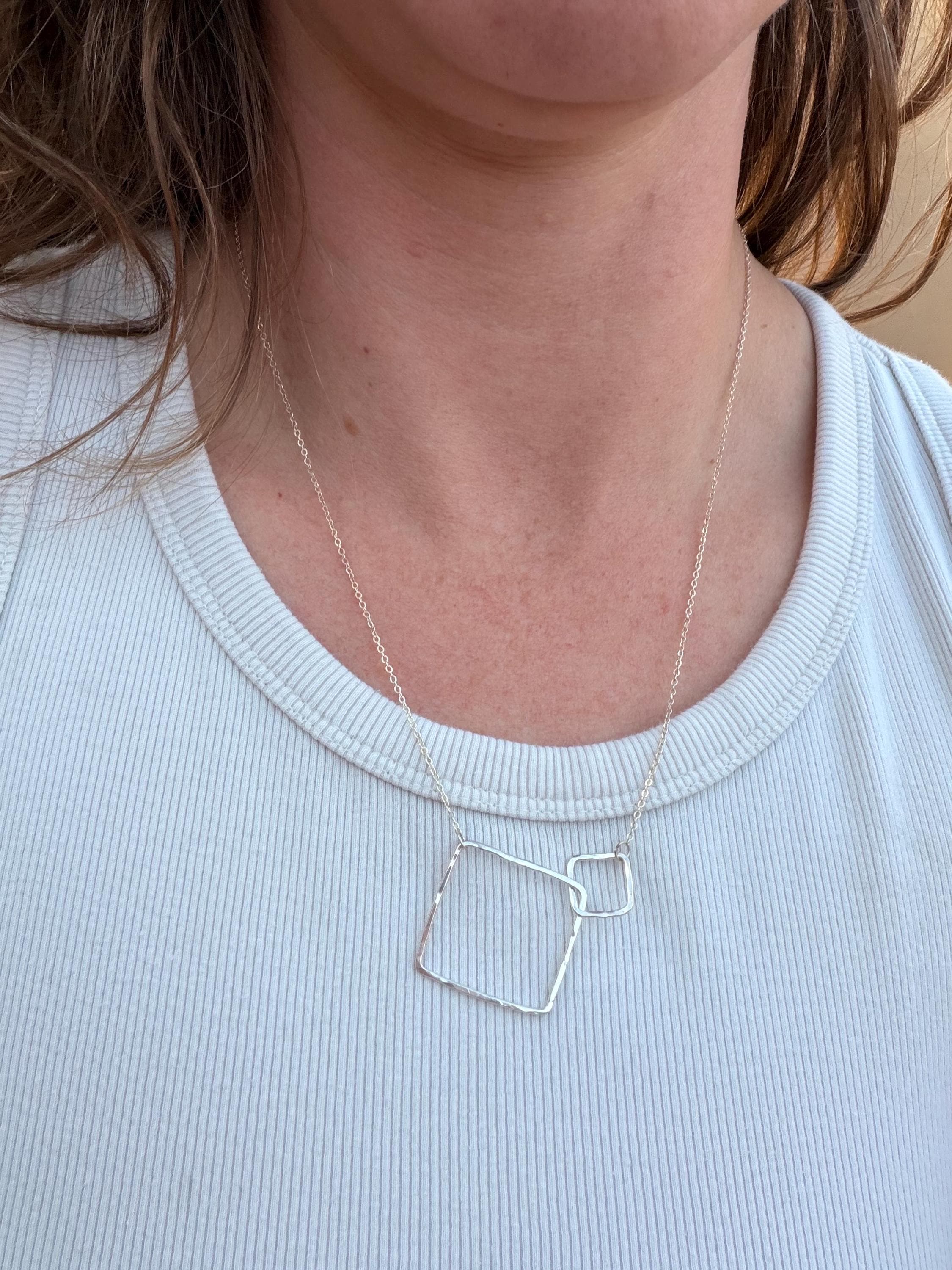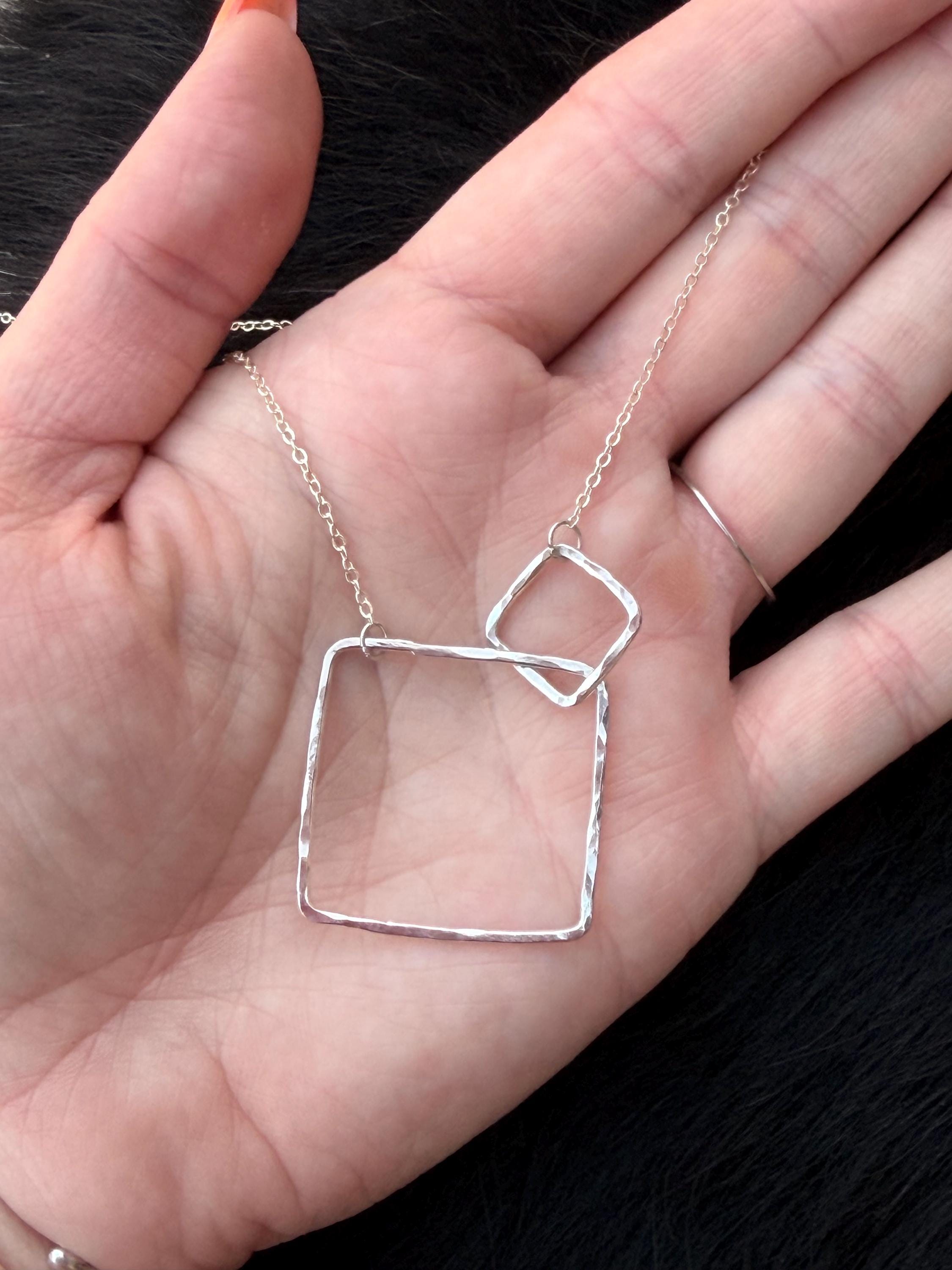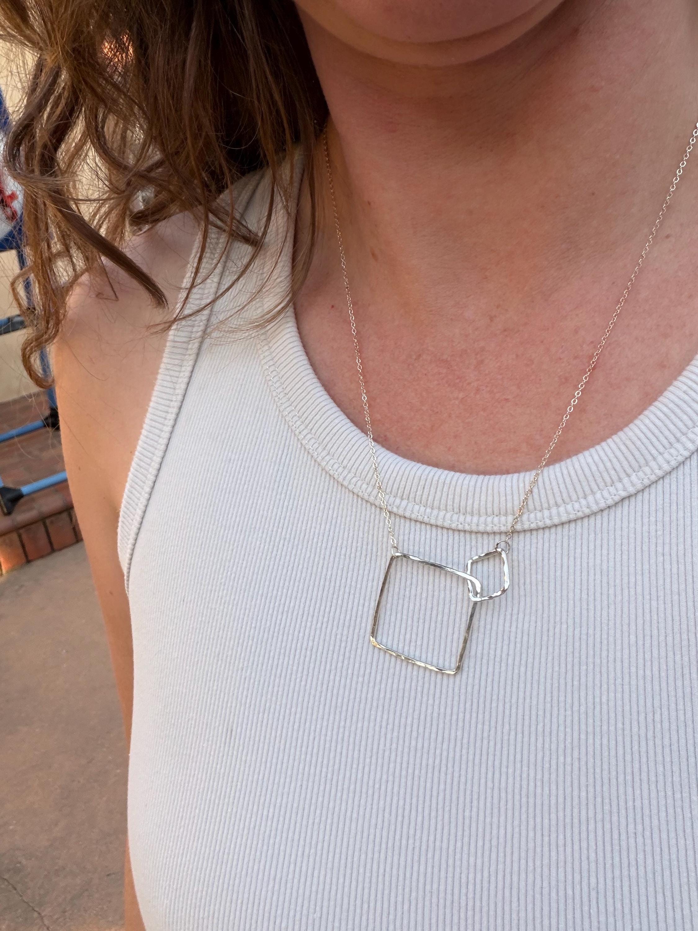 The Lydia necklace, made of sterling silver wire shapes, forged and soldered to interlock and make a statement with their contrasting sizes. These square shapes are interlocking and provide a stunning movement quality. They are made by hand and finished off with a sterling silver chain totaling 22 1/2 inches long from clasp to clasp.