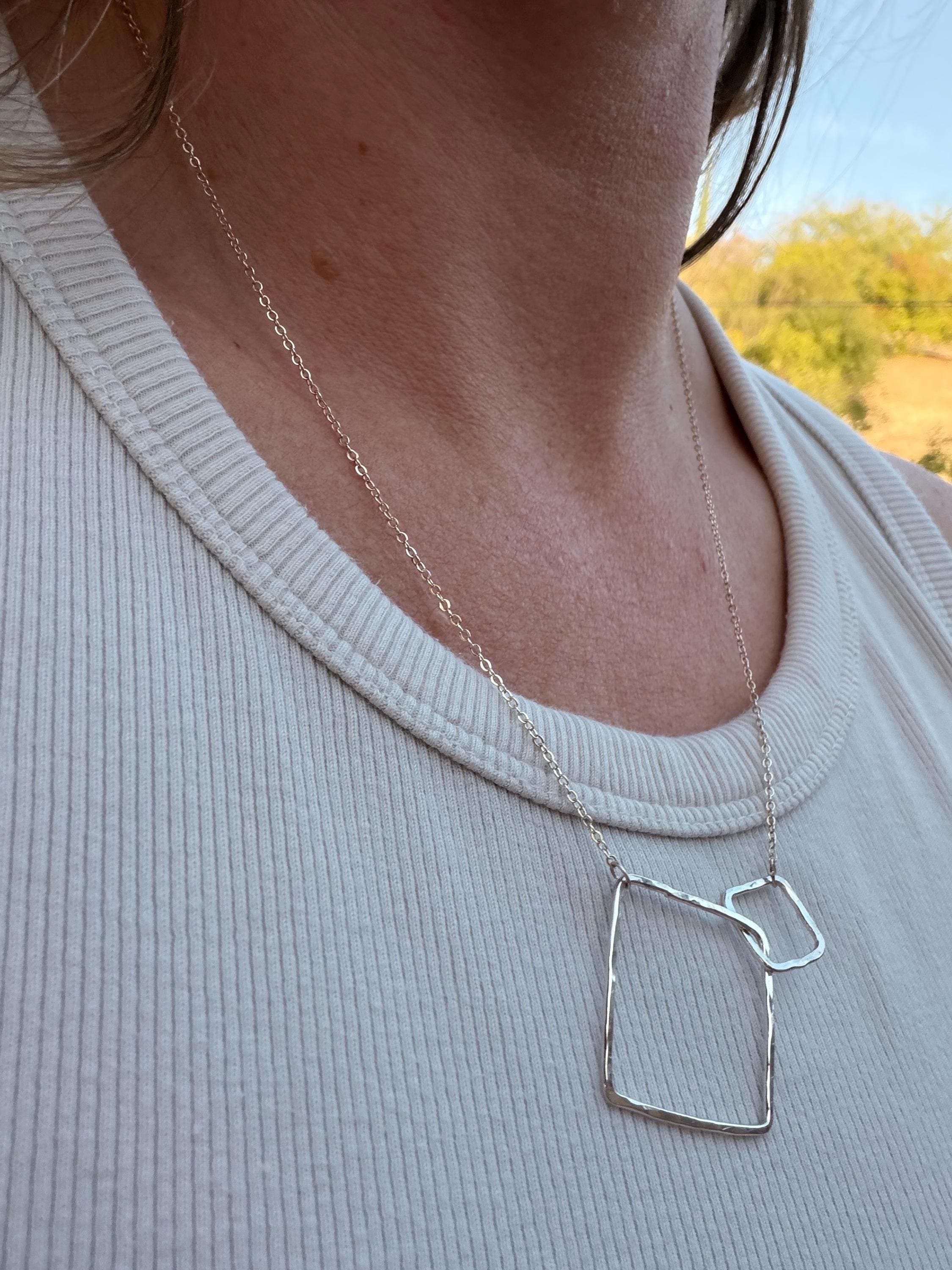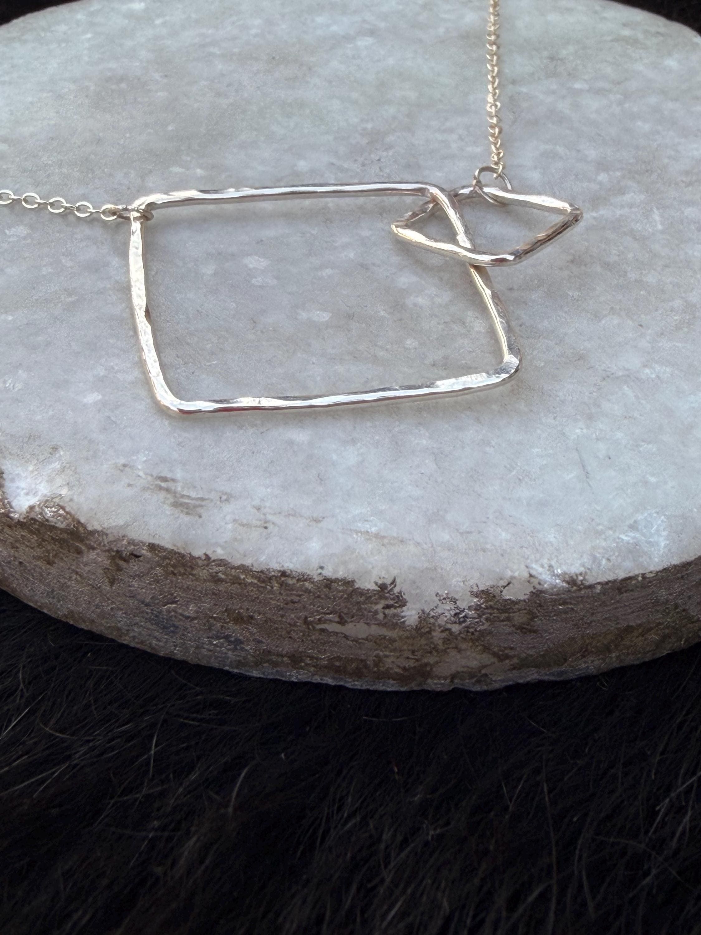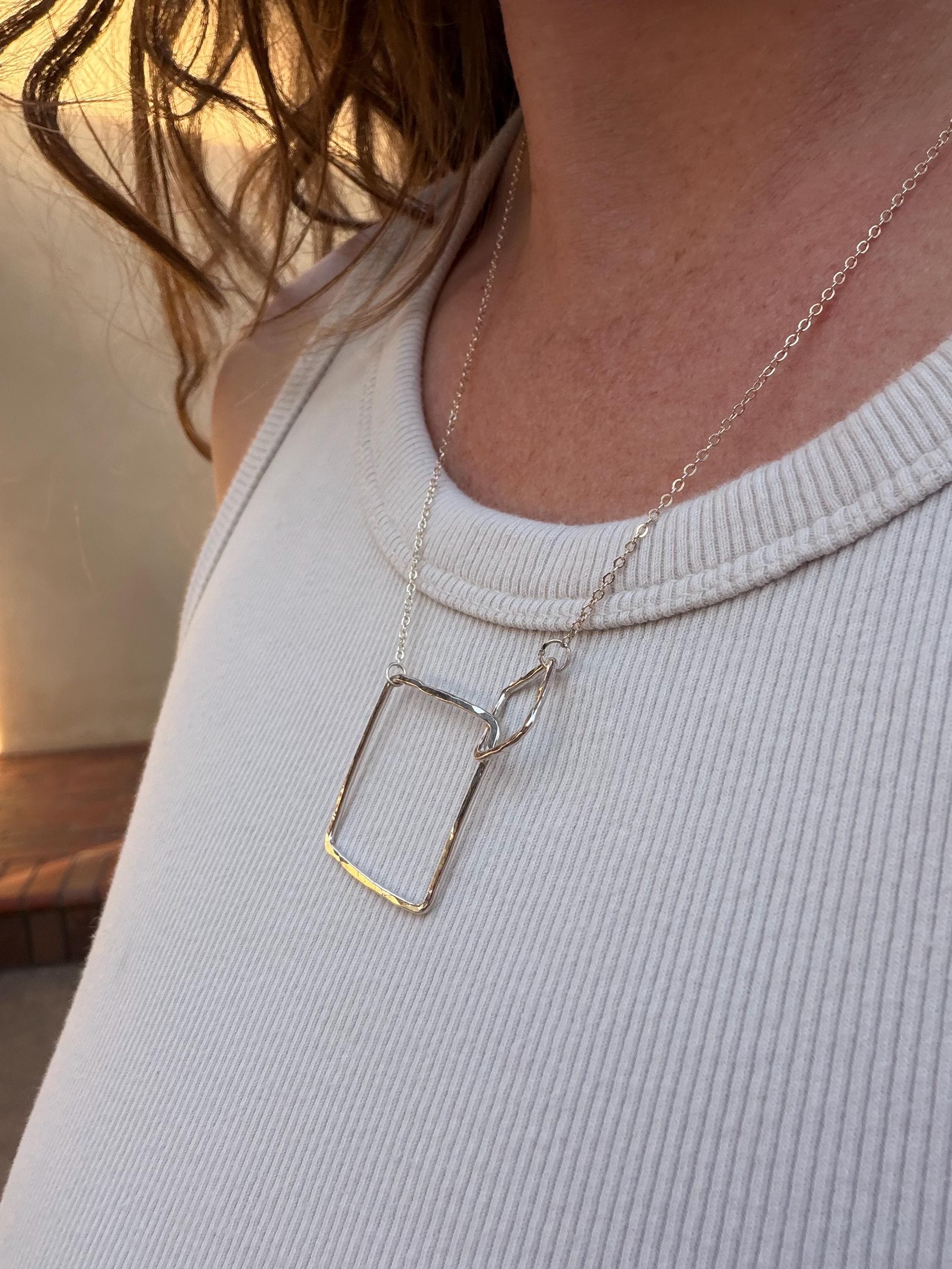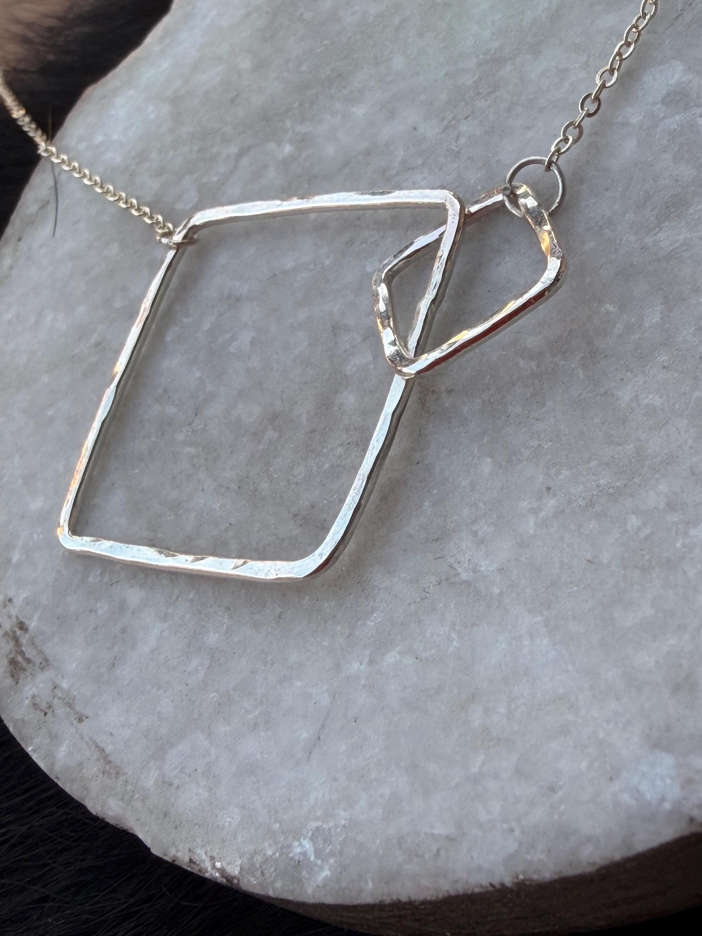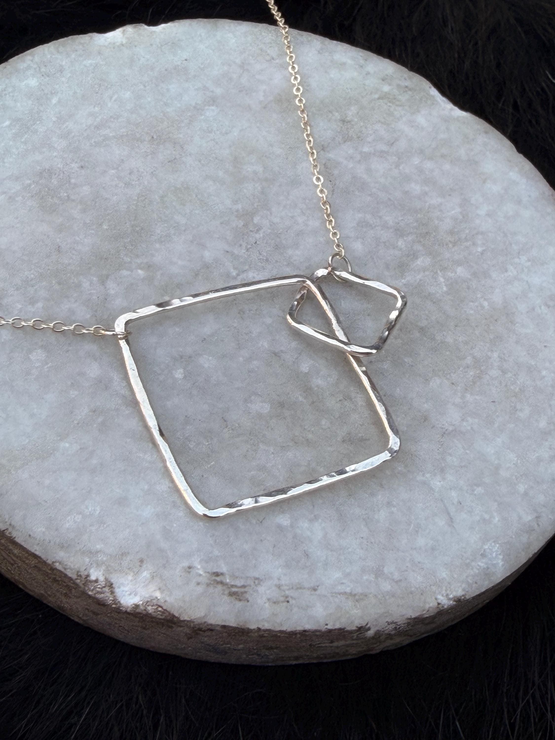 The Lydia necklace, made of sterling silver wire shapes, forged and soldered to interlock and make a statement with their contrasting sizes. These square shapes are interlocking and provide a stunning movement quality. They are made by hand and finished off with a sterling silver chain totaling 22 1/2 inches long from clasp to clasp.