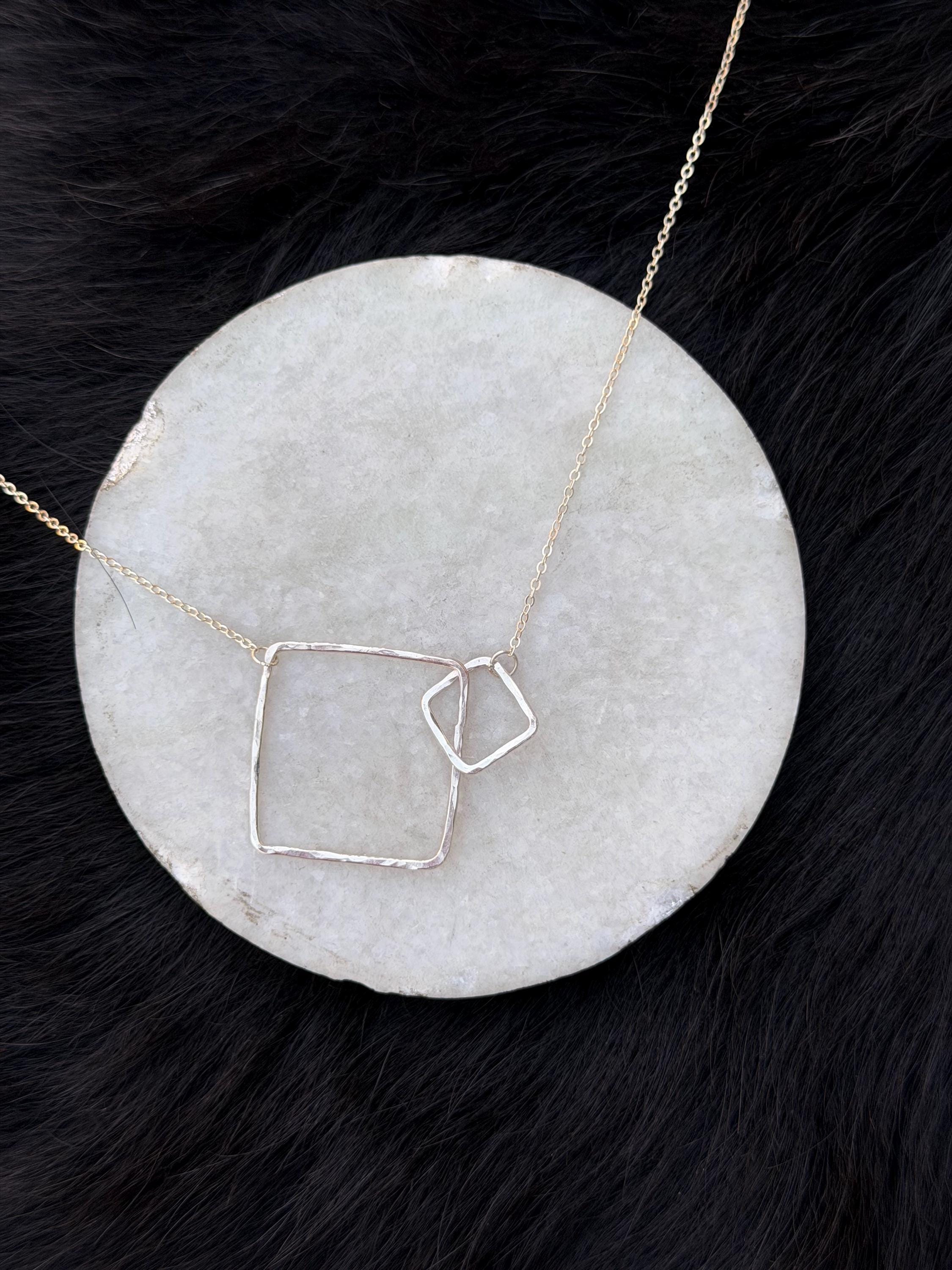 The necklace design comes in double circles or squares or a combo of shapes too. Metal options are: silver, 14k gold fill, 14k Rose gold and every combo of those metals too.