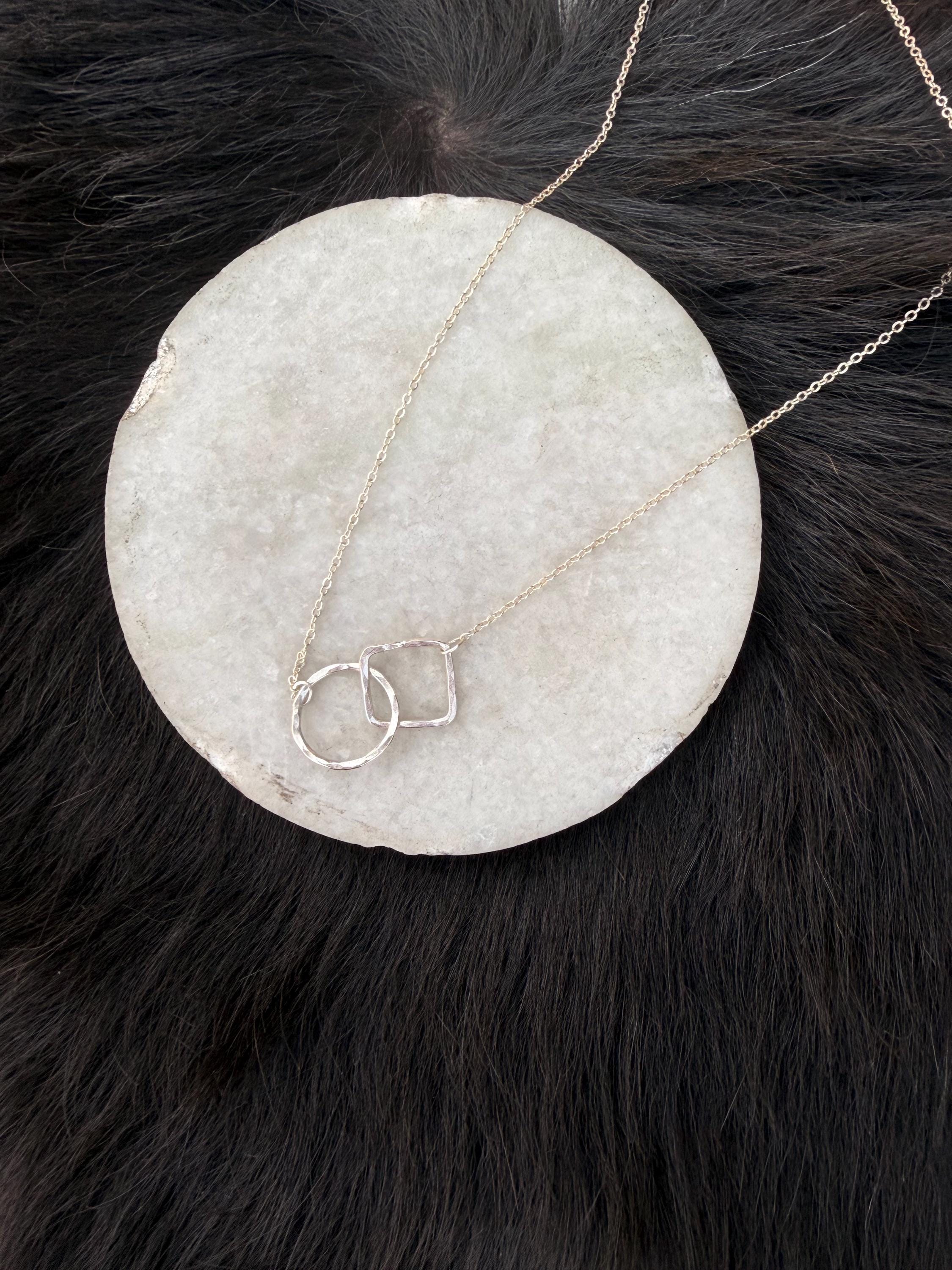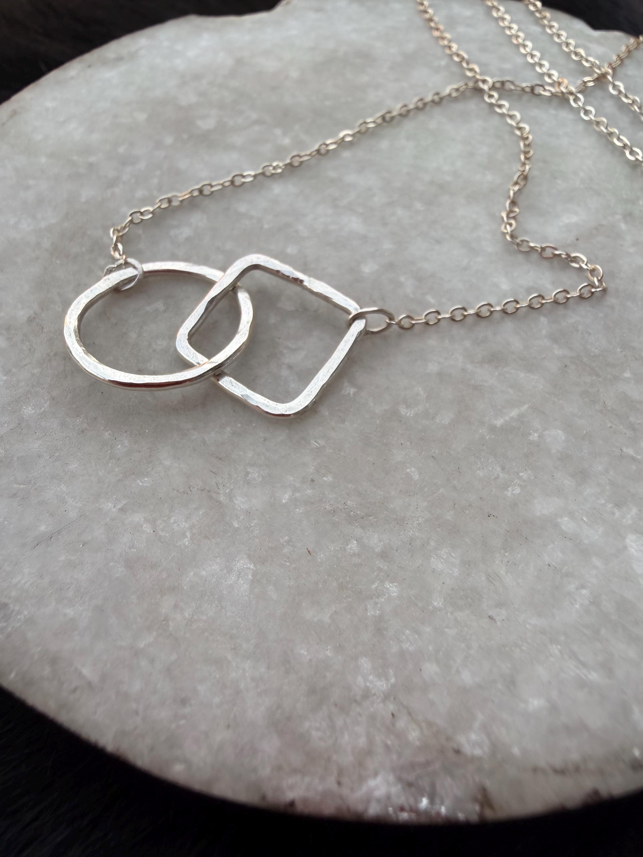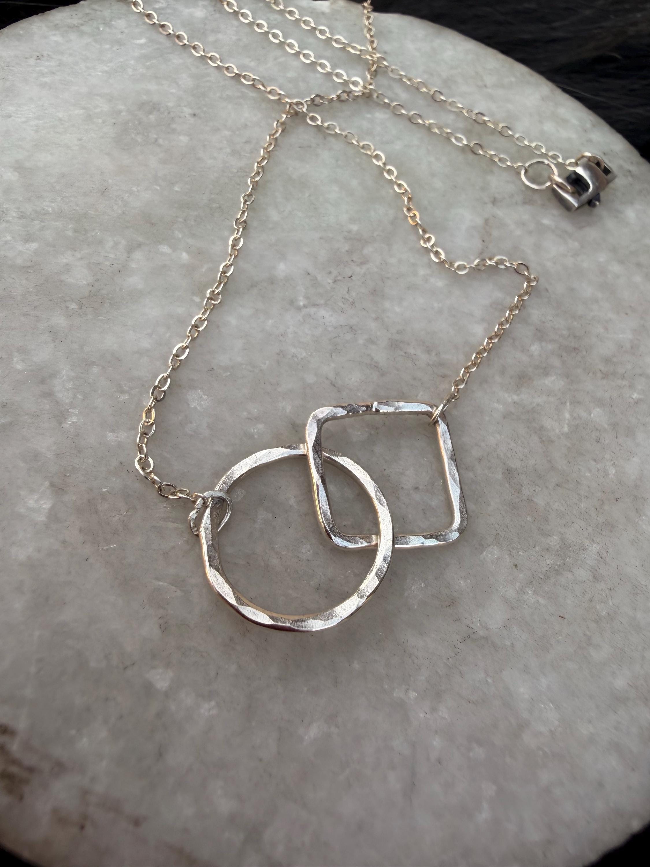 The Lydia necklace, made of sterling silver wire, forged and soldered to interlock and make a statement with their contrasting sizes. These shapes, circle and square are interlocking and provide a stunning movement quality. They are made by hand and finished off with a sterling silver chain totaling 16 1/2 inches long from clasp to clasp.
