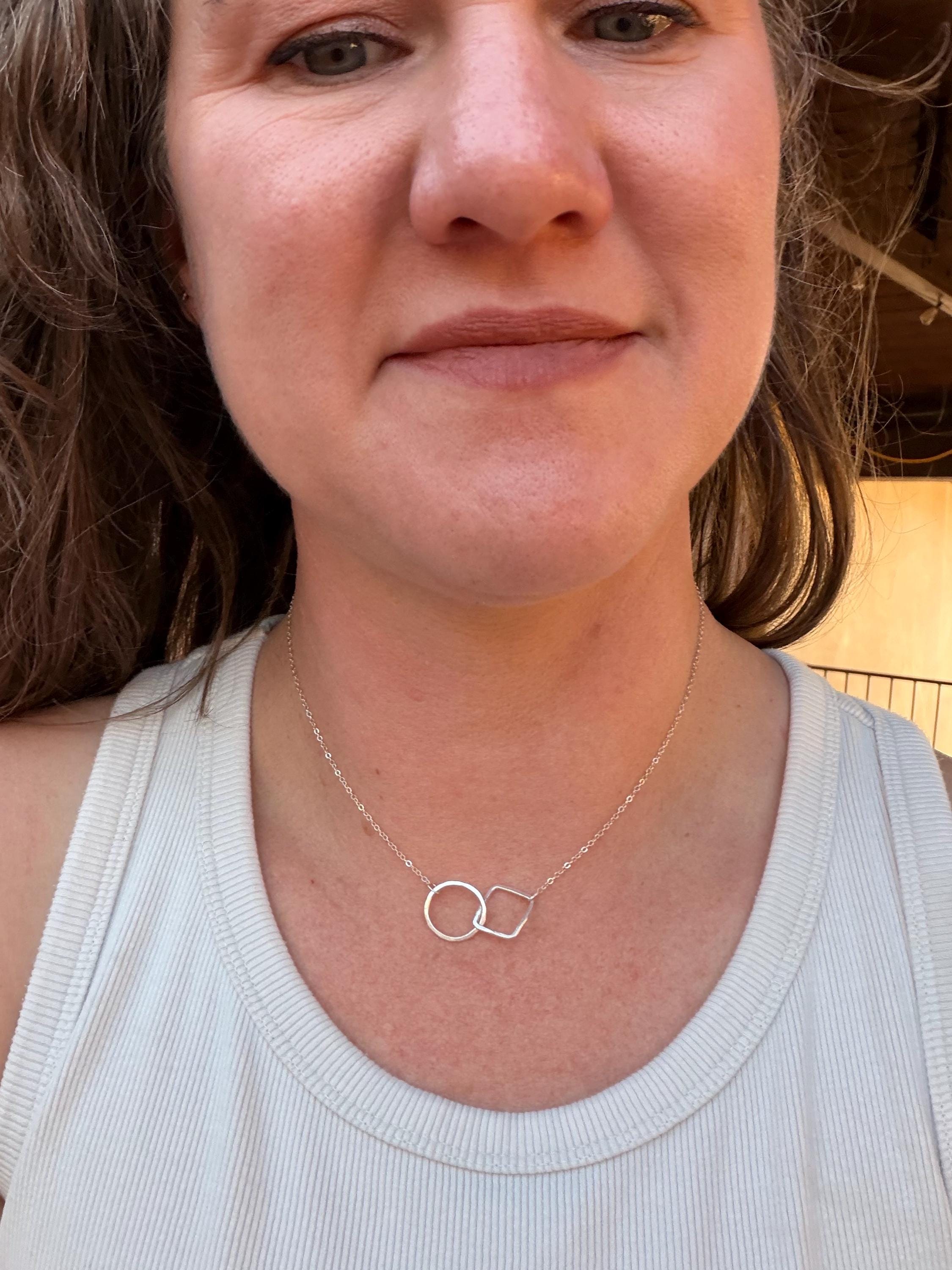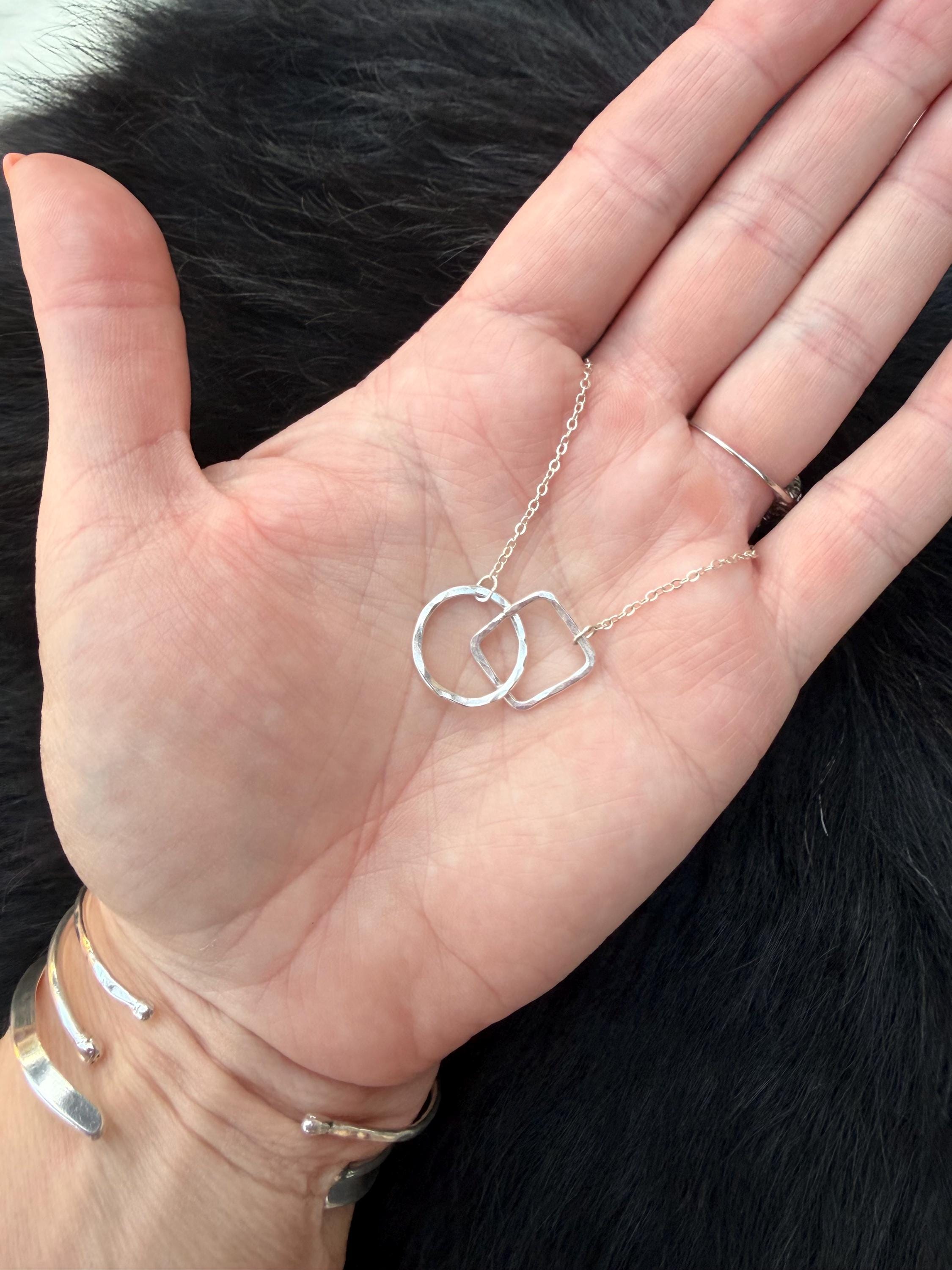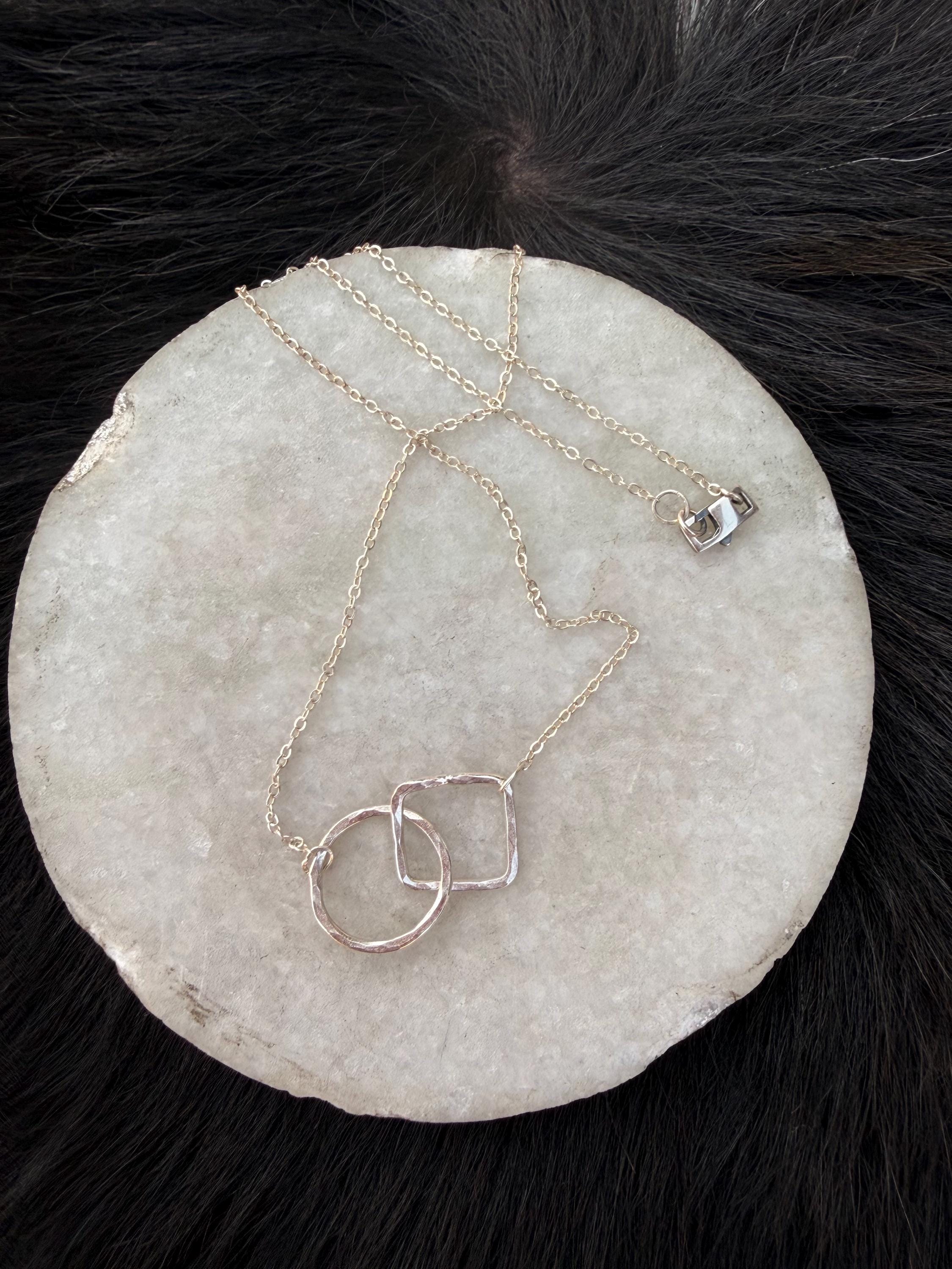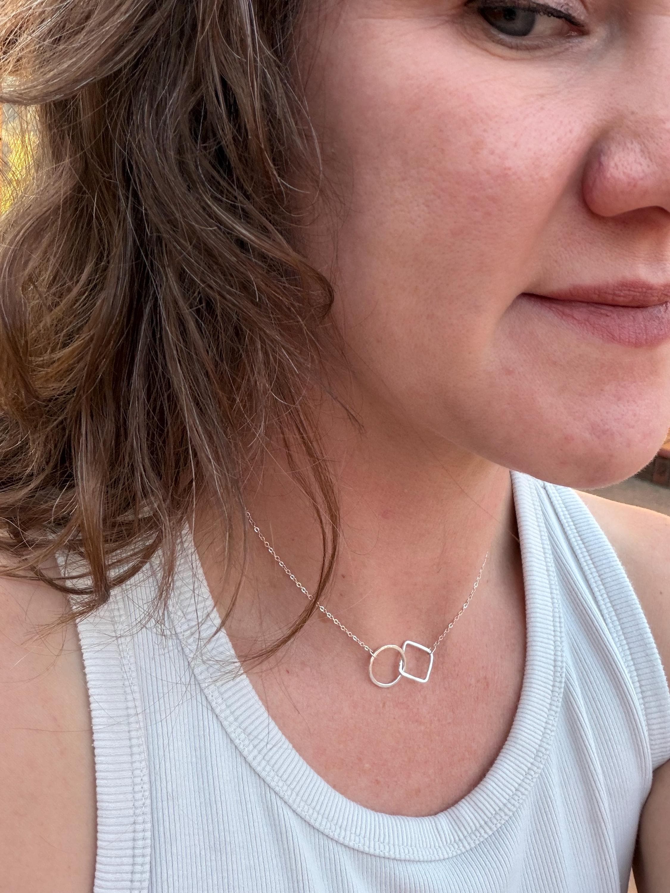 The Lydia necklace, made of sterling silver wire, forged and soldered to interlock and make a statement with their contrasting sizes. These shapes, circle and square are interlocking and provide a stunning movement quality. They are made by hand and finished off with a sterling silver chain totaling 16 1/2 inches long from clasp to clasp.
