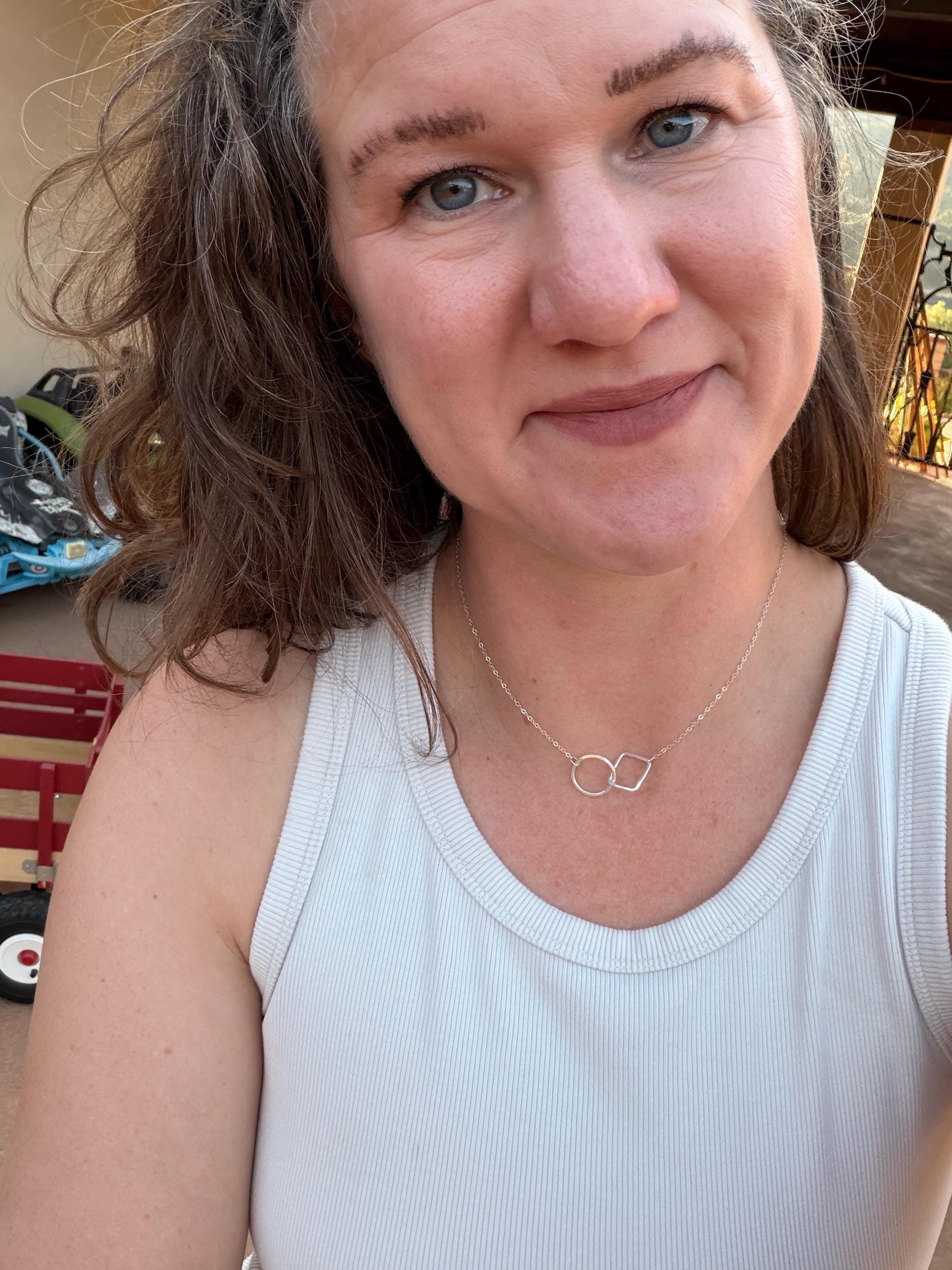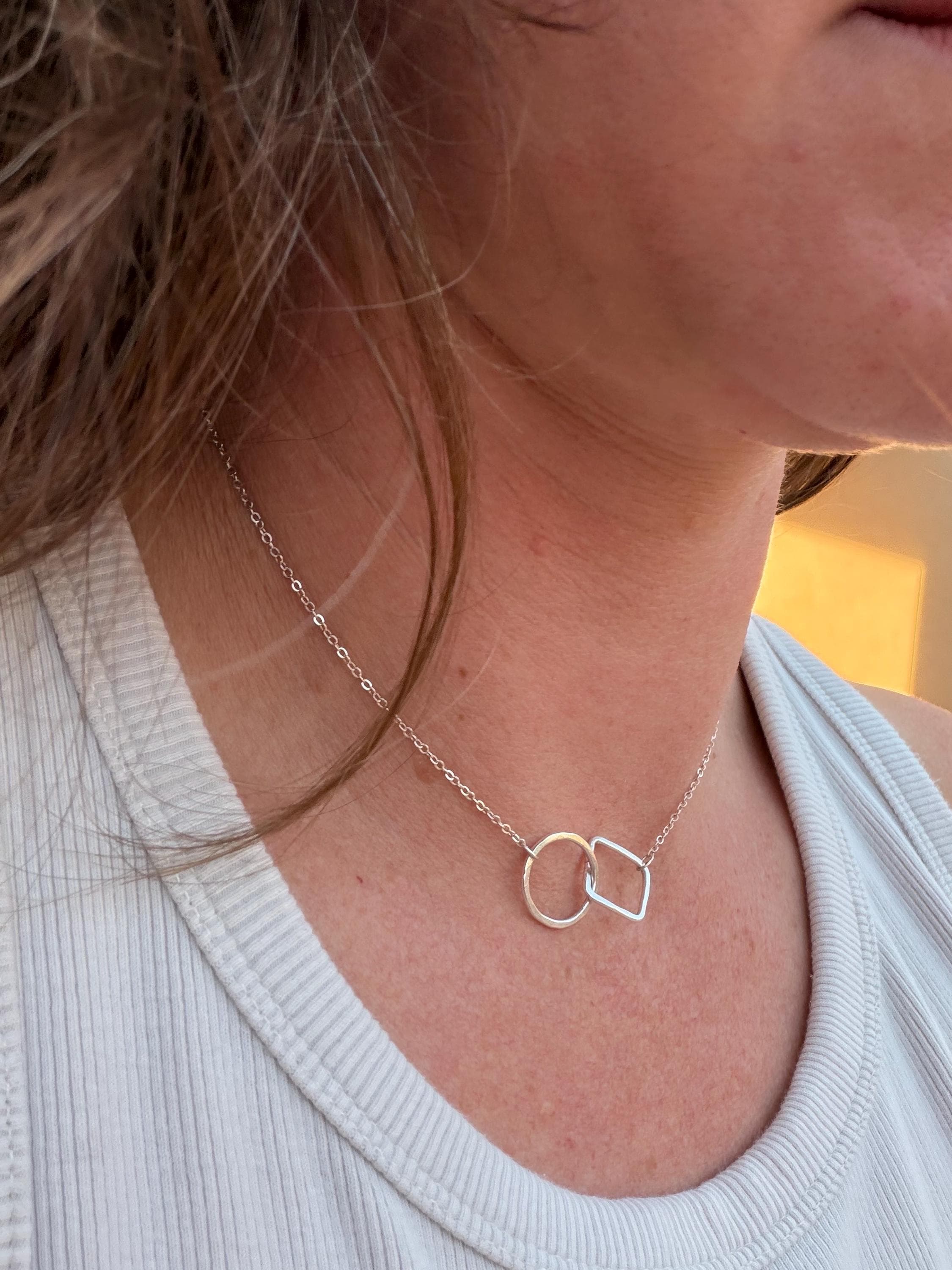 The necklace design comes in double circles or squares or a combo of shapes too. Metal options are: silver, 14k gold fill, 14k Rose gold and every combo of those metals too.