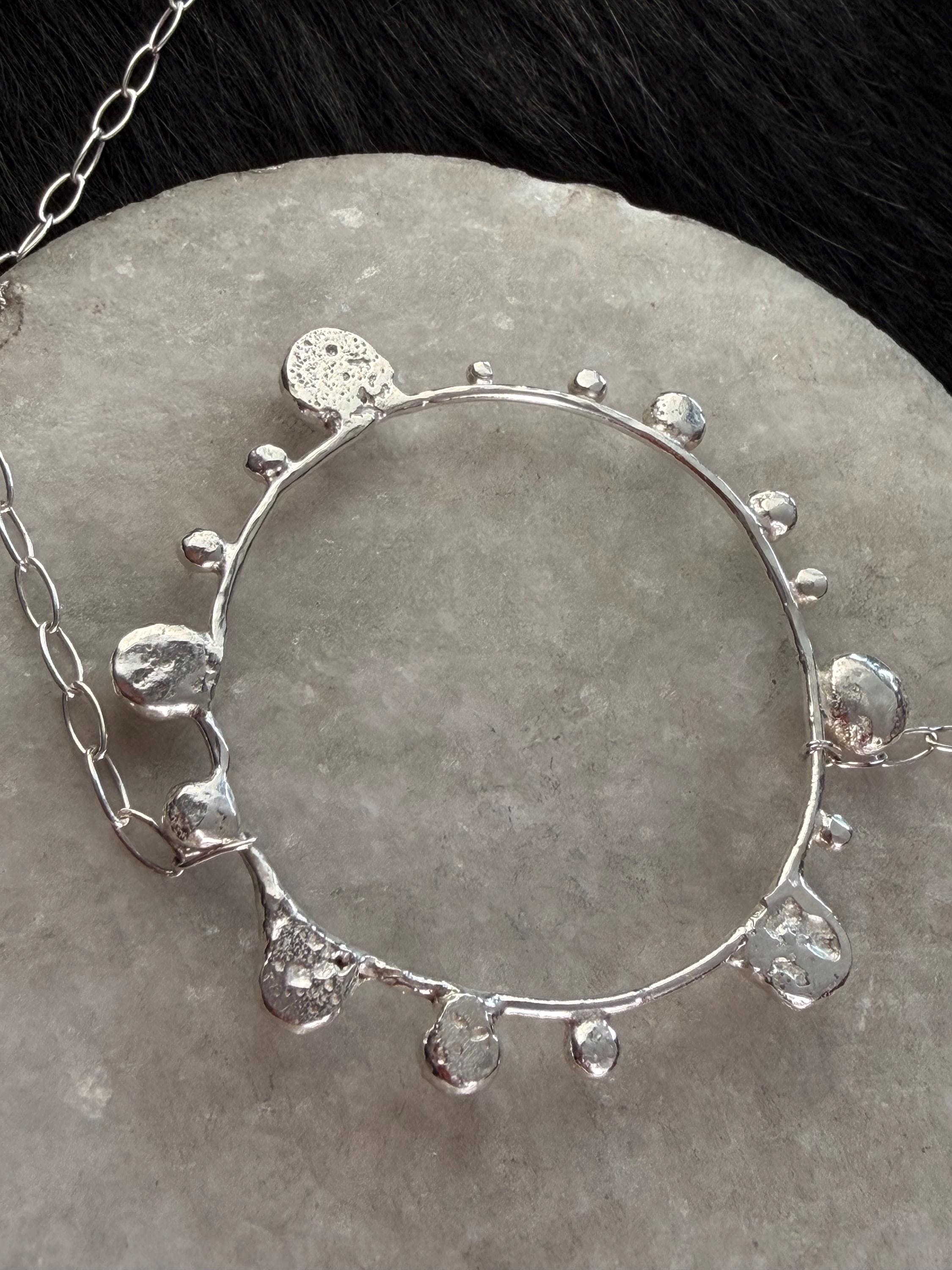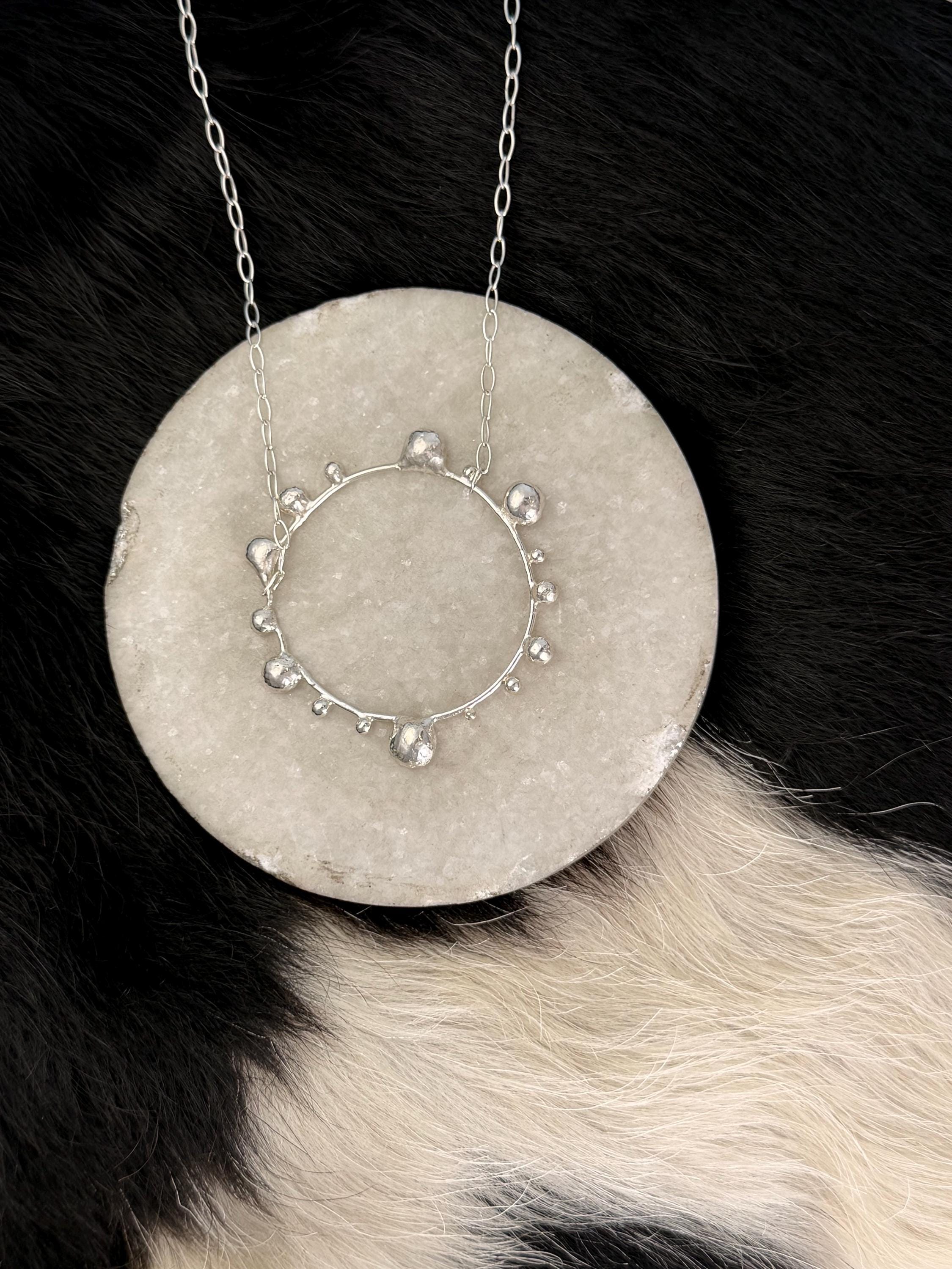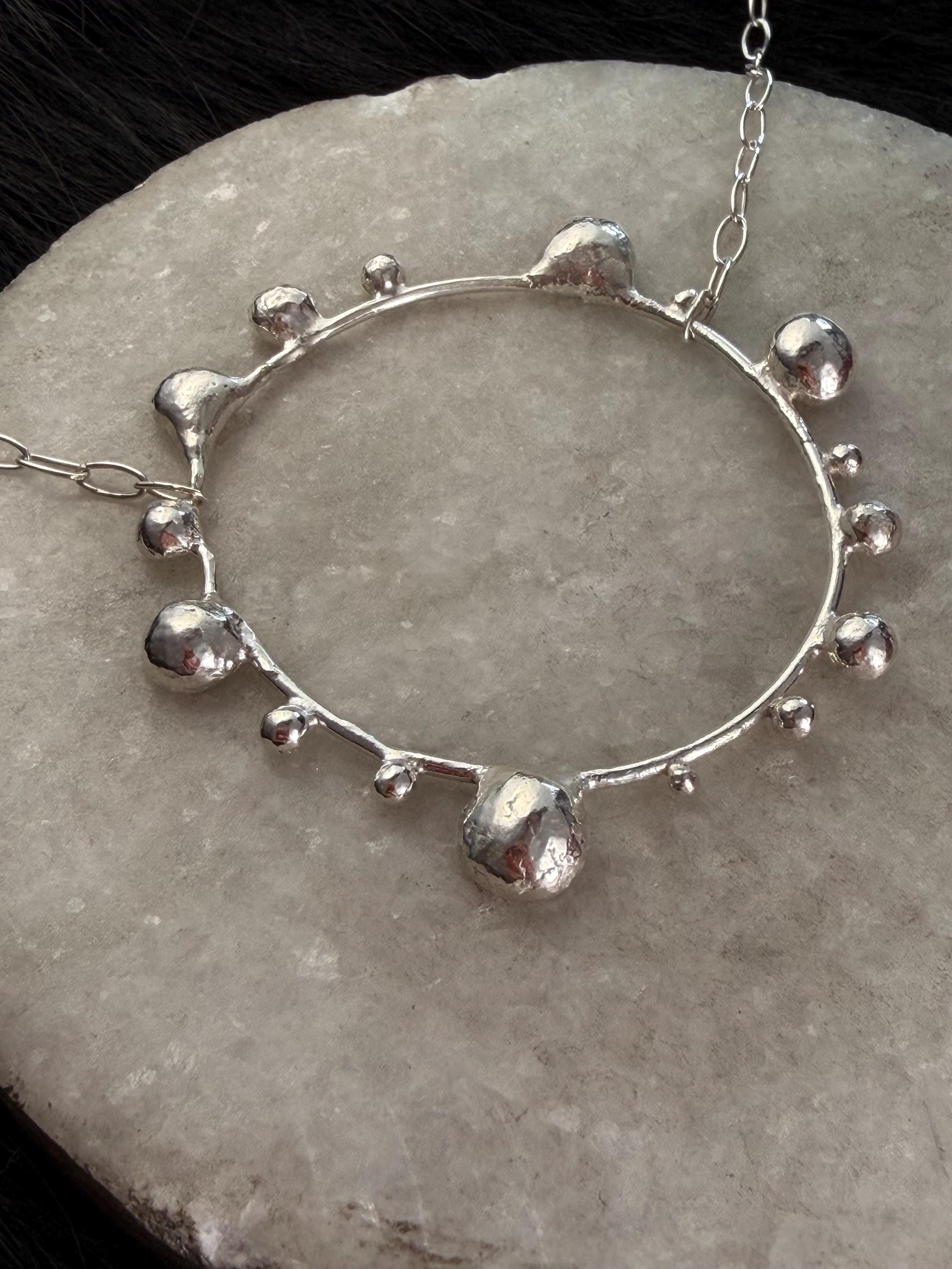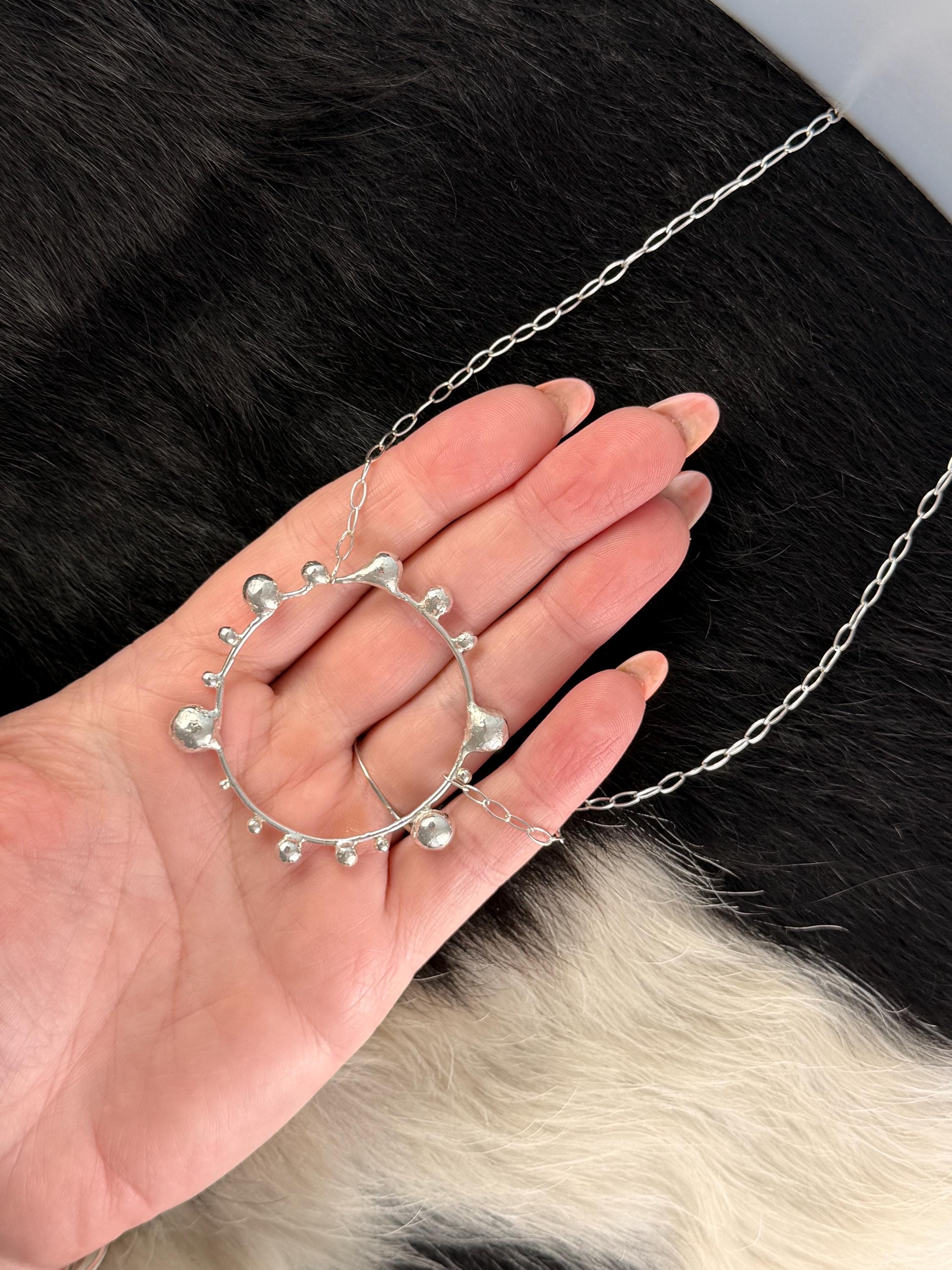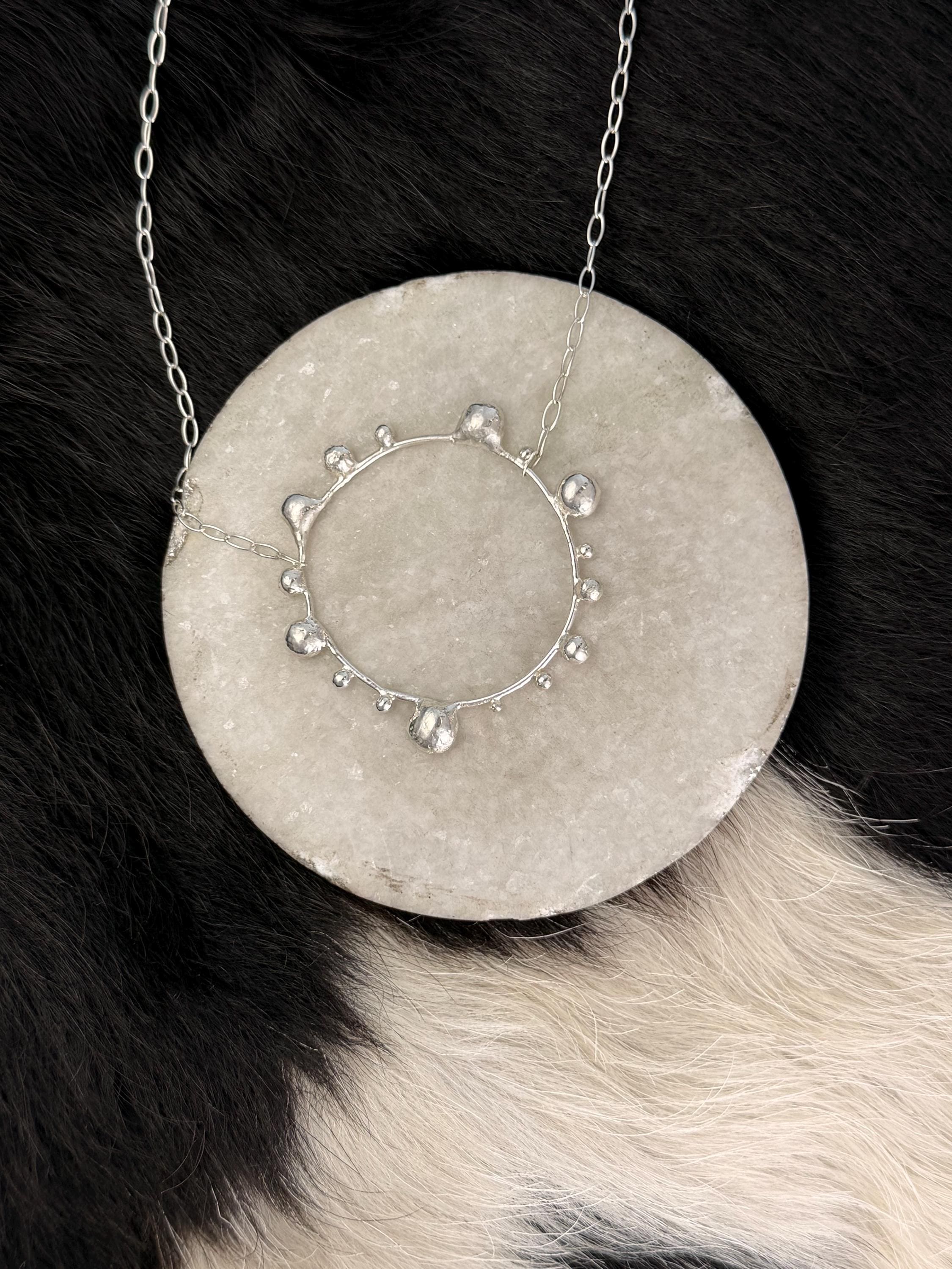 The Circle shape focal point is accented with free formed bubbles and balls of sterling silver. This necklace is part of a collection where I have explored more of my artistic creativity while testing the fusing and melting points of silver, it is quite delightful to find these geometric shapes to have formed in the way that they have. The necklace exhibits hand formed circle outline with the ball shapes fused and accenting the edge. this necklace is finished with a light and dainty paperclip chain and signature rectangle silver clasp.