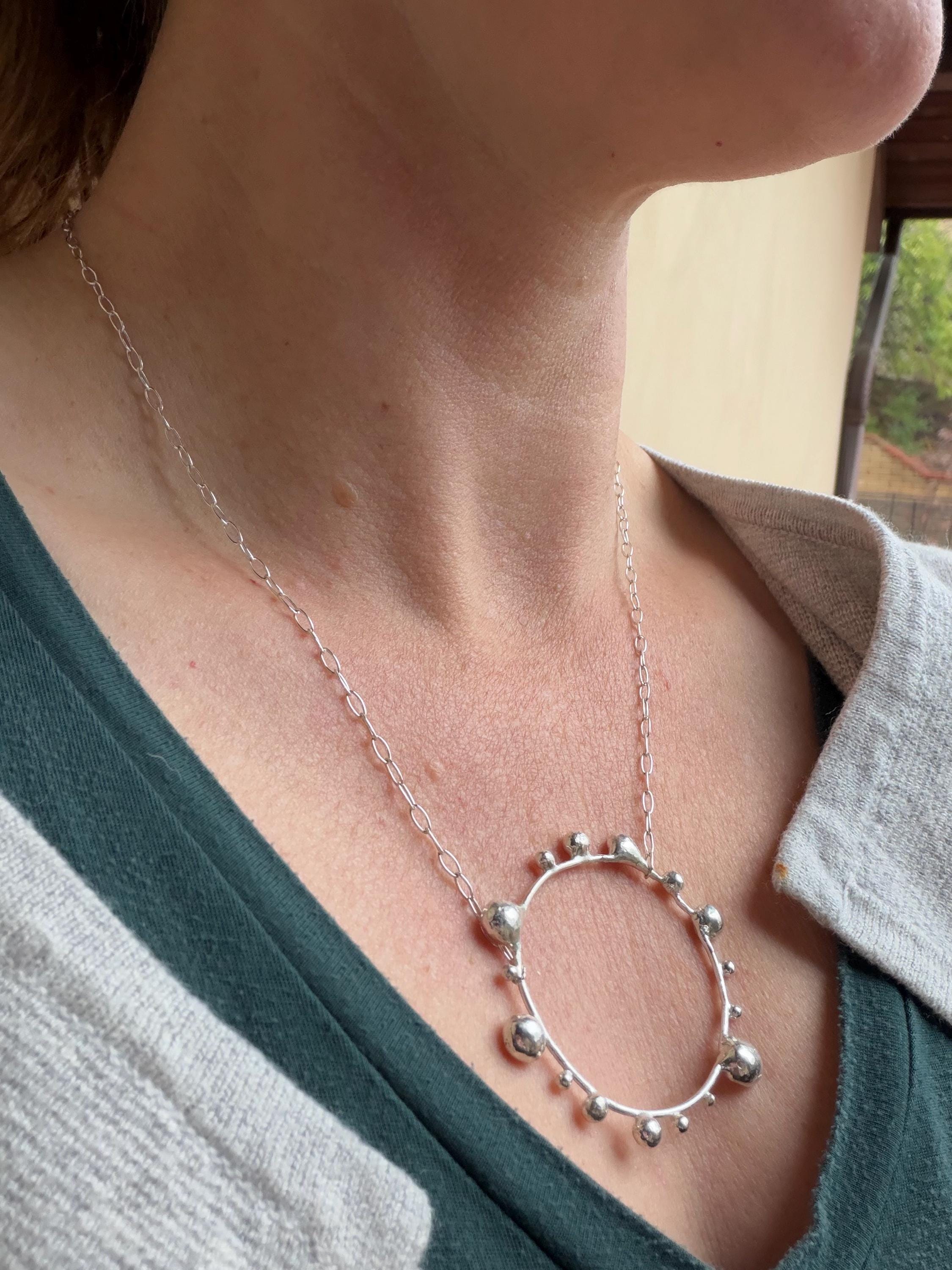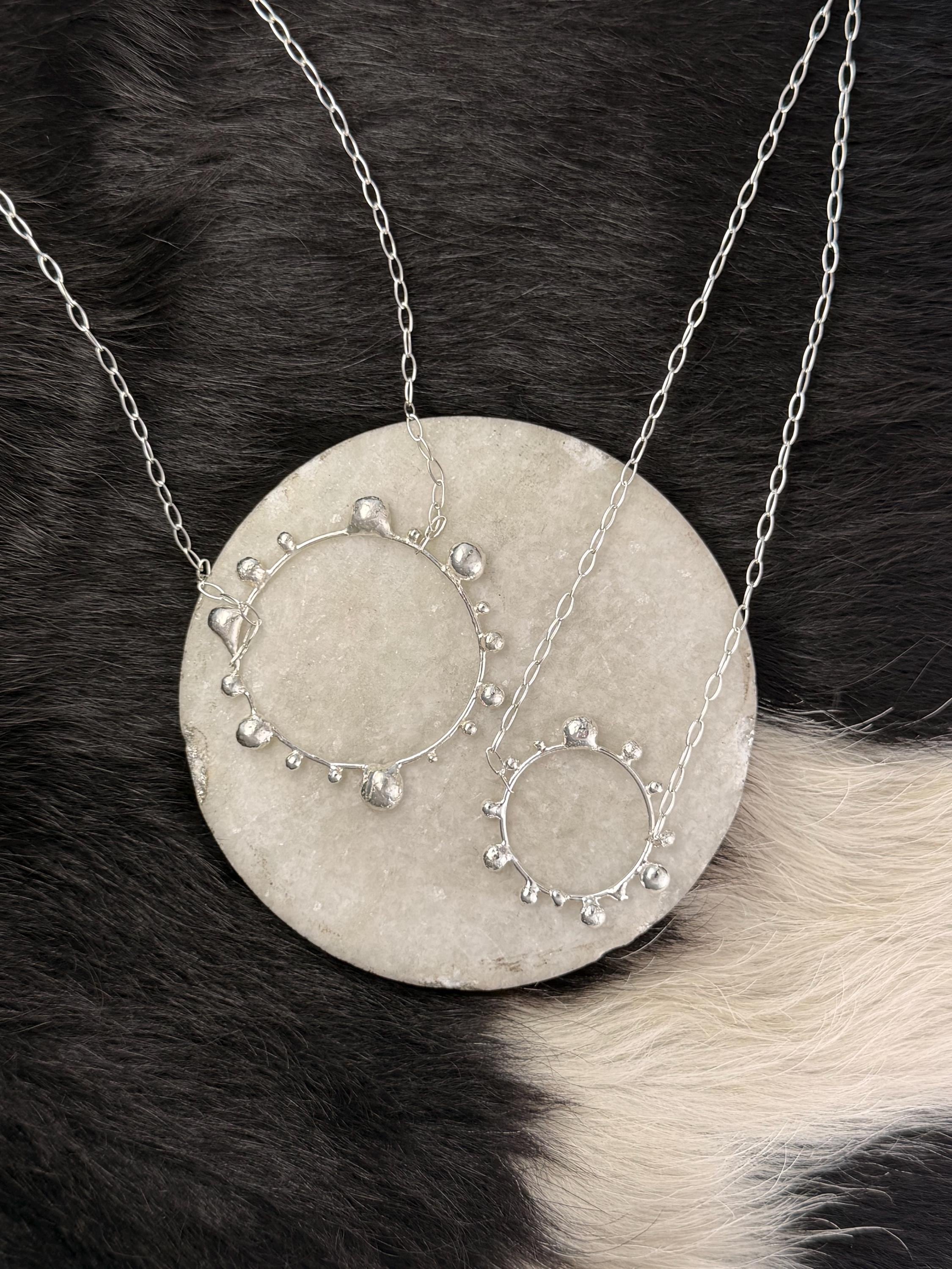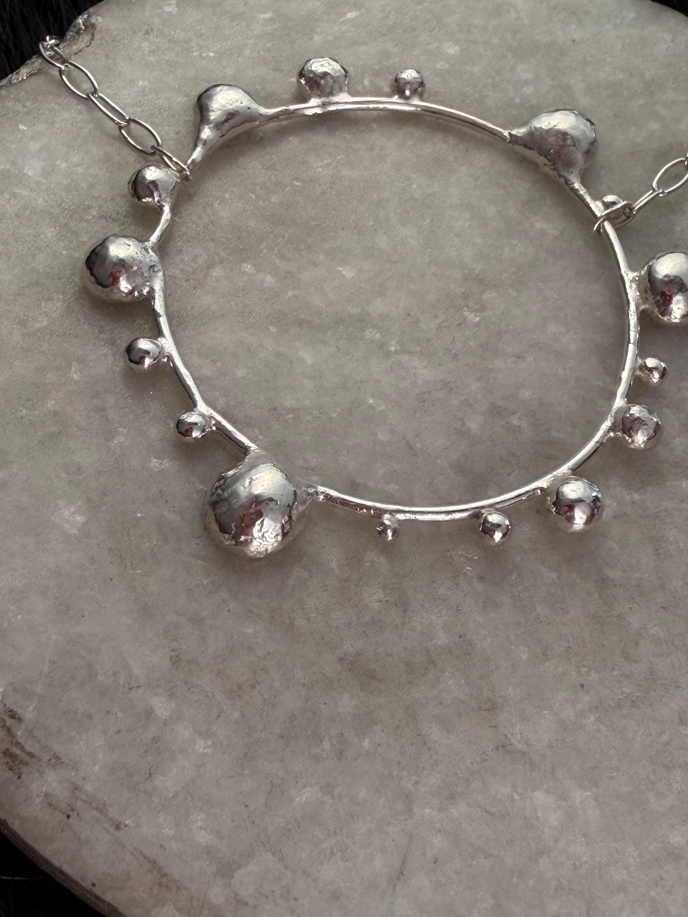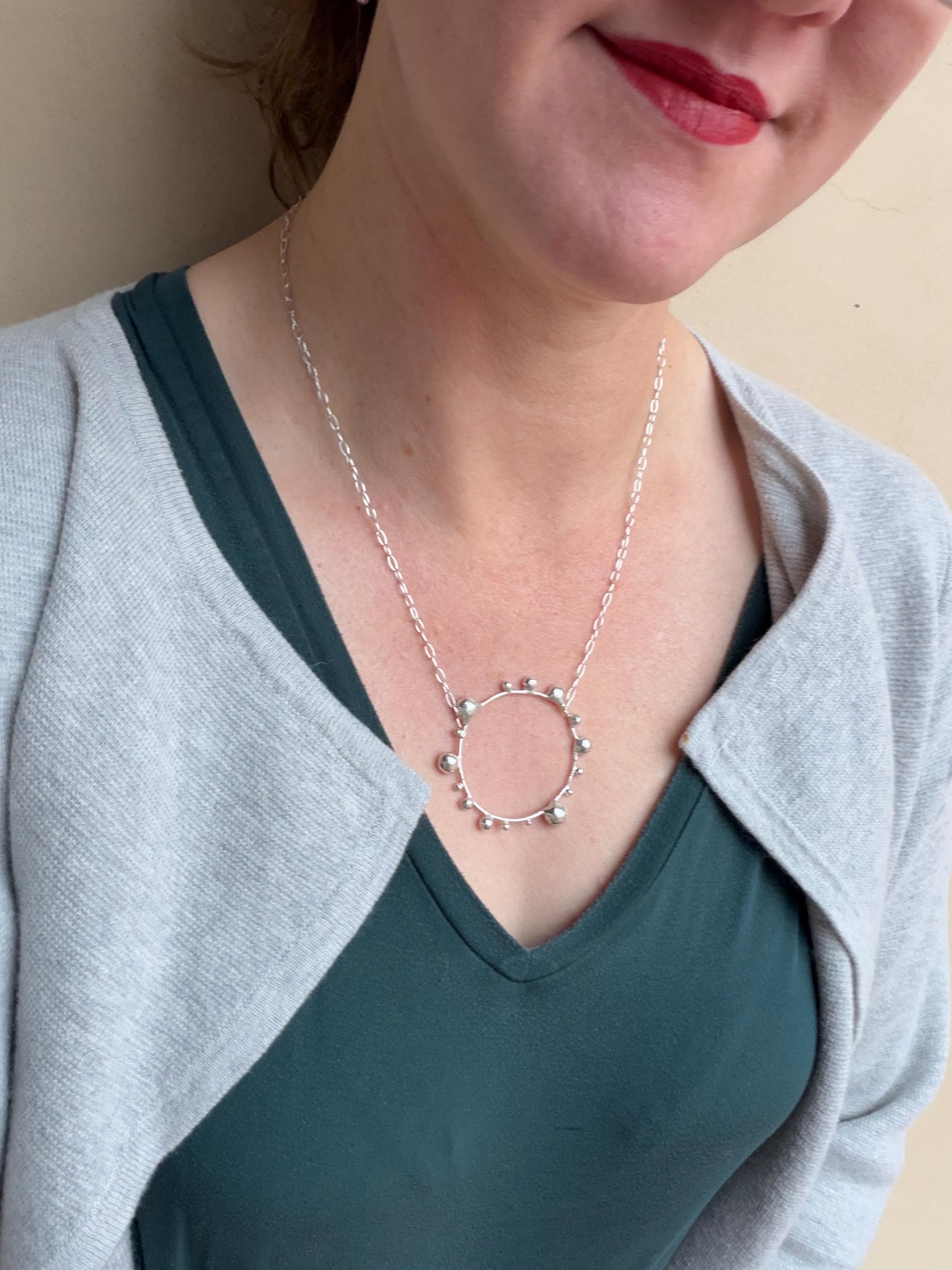 The Circle shape focal point is accented with free formed bubbles and balls of sterling silver. This necklace is part of a collection where I have explored more of my artistic creativity while testing the fusing and melting points of silver, it is quite delightful to find these geometric shapes to have formed in the way that they have. The necklace exhibits hand formed circle outline with the ball shapes fused and accenting the edge. this necklace is finished with a light and dainty paperclip chain and signature rectangle silver clasp.