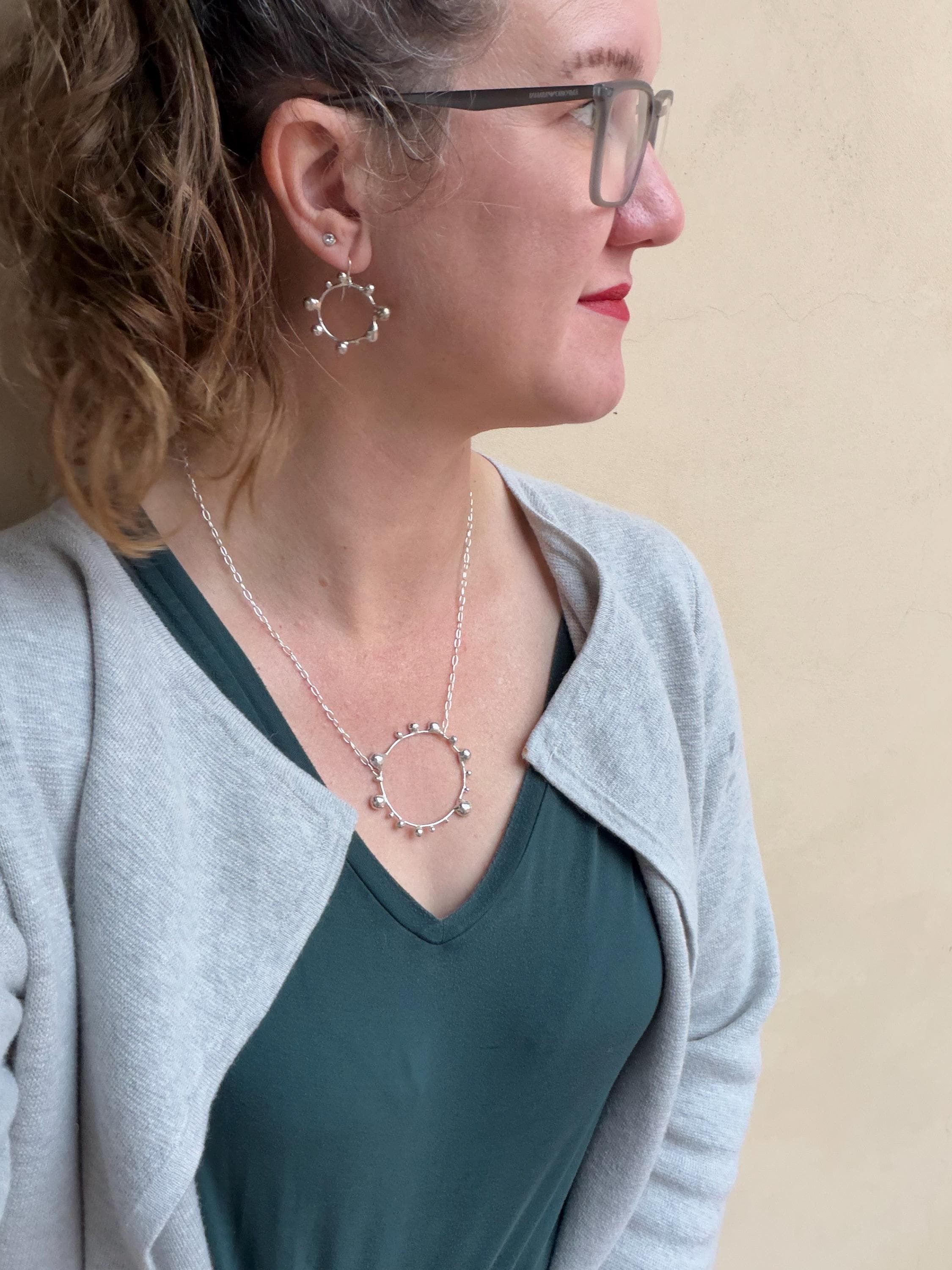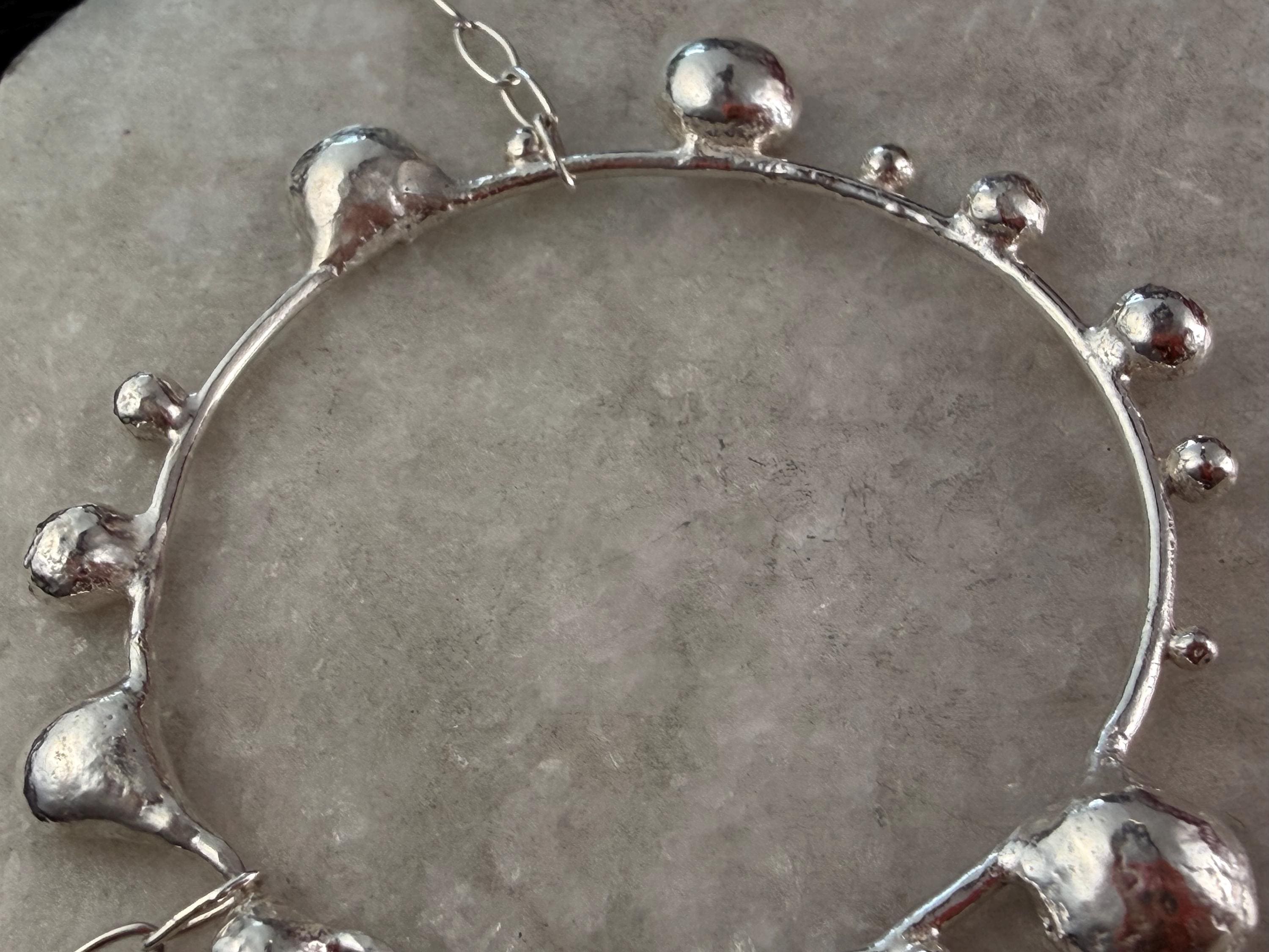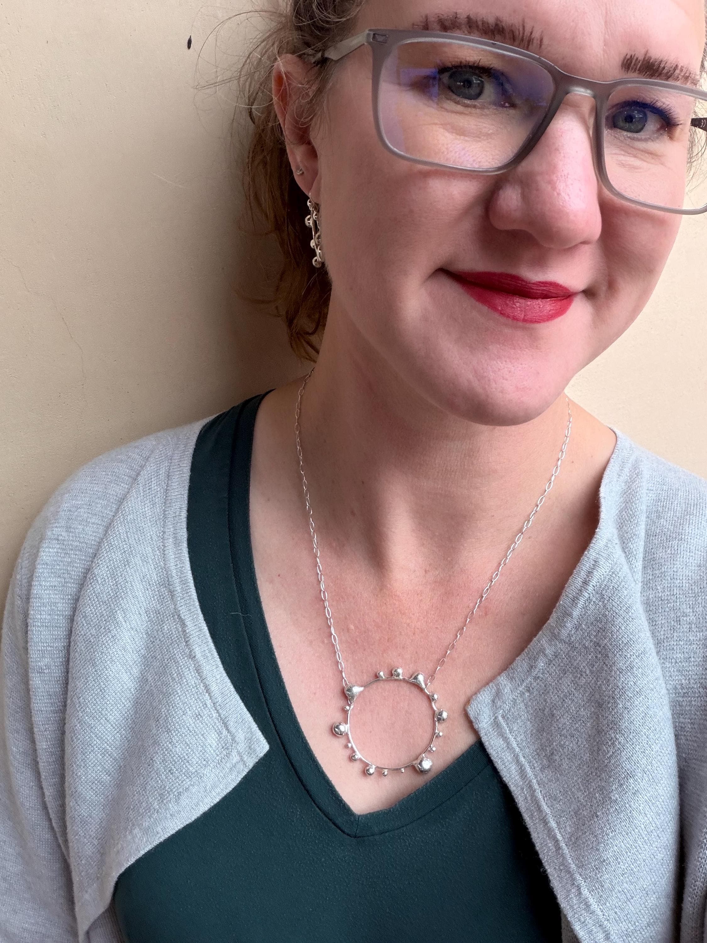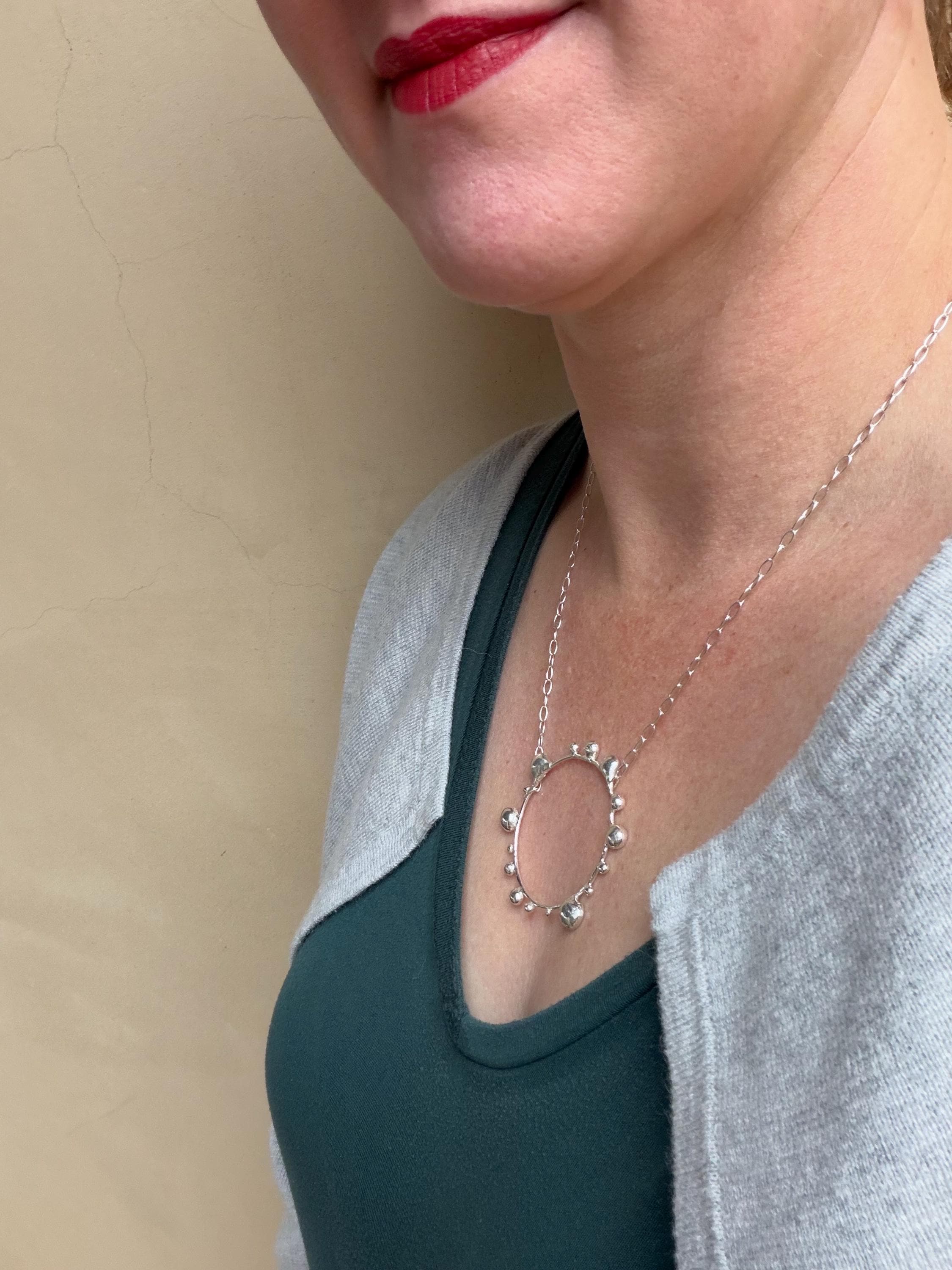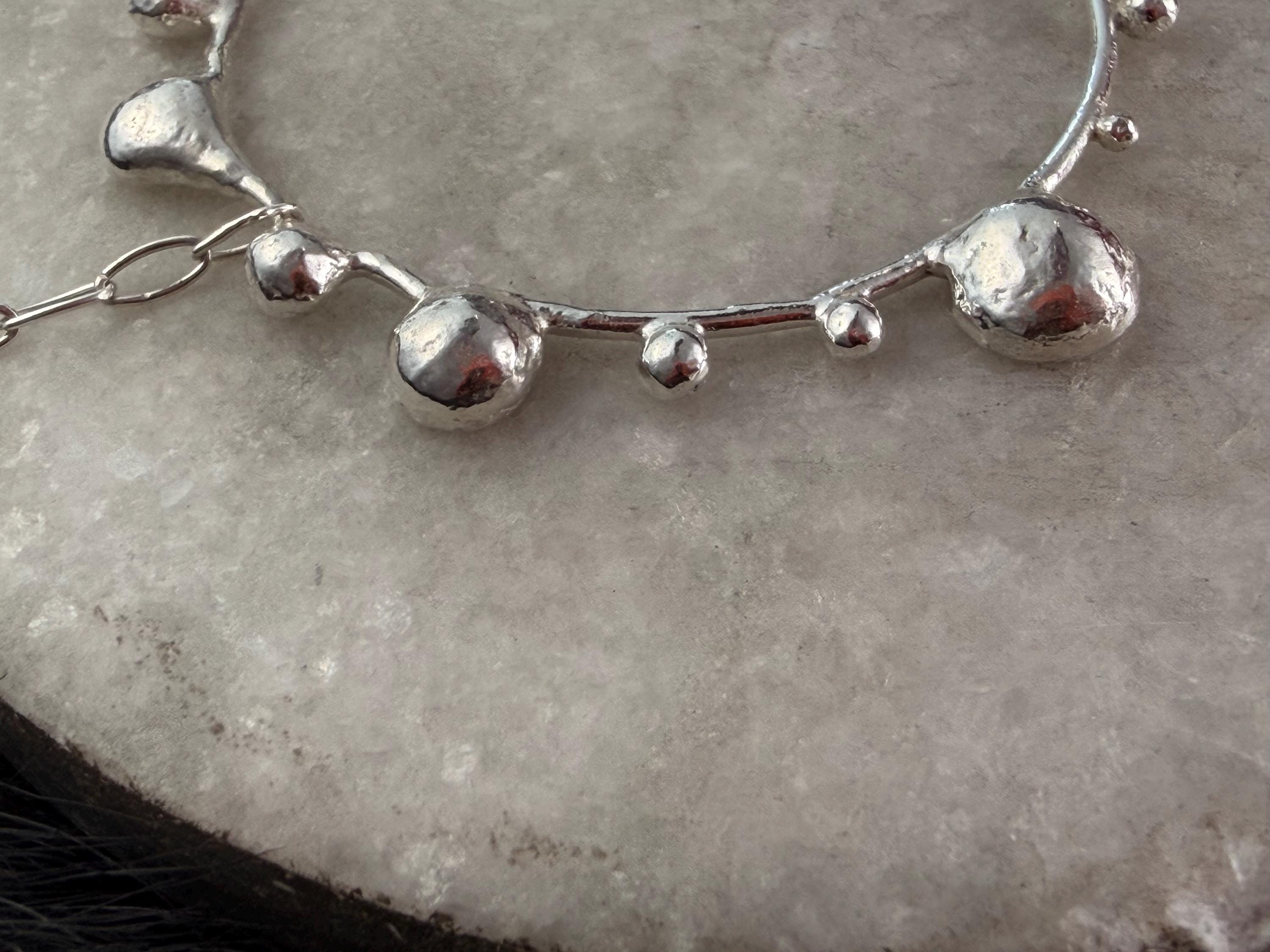 The Circle shape focal point is accented with free formed bubbles and balls of sterling silver. This necklace is part of a collection where I have explored more of my artistic creativity while testing the fusing and melting points of silver, it is quite delightful to find these geometric shapes to have formed in the way that they have. The necklace exhibits hand formed circle outline with the ball shapes fused and accenting the edge. this necklace is finished with a light and dainty paperclip chain and signature rectangle silver clasp.