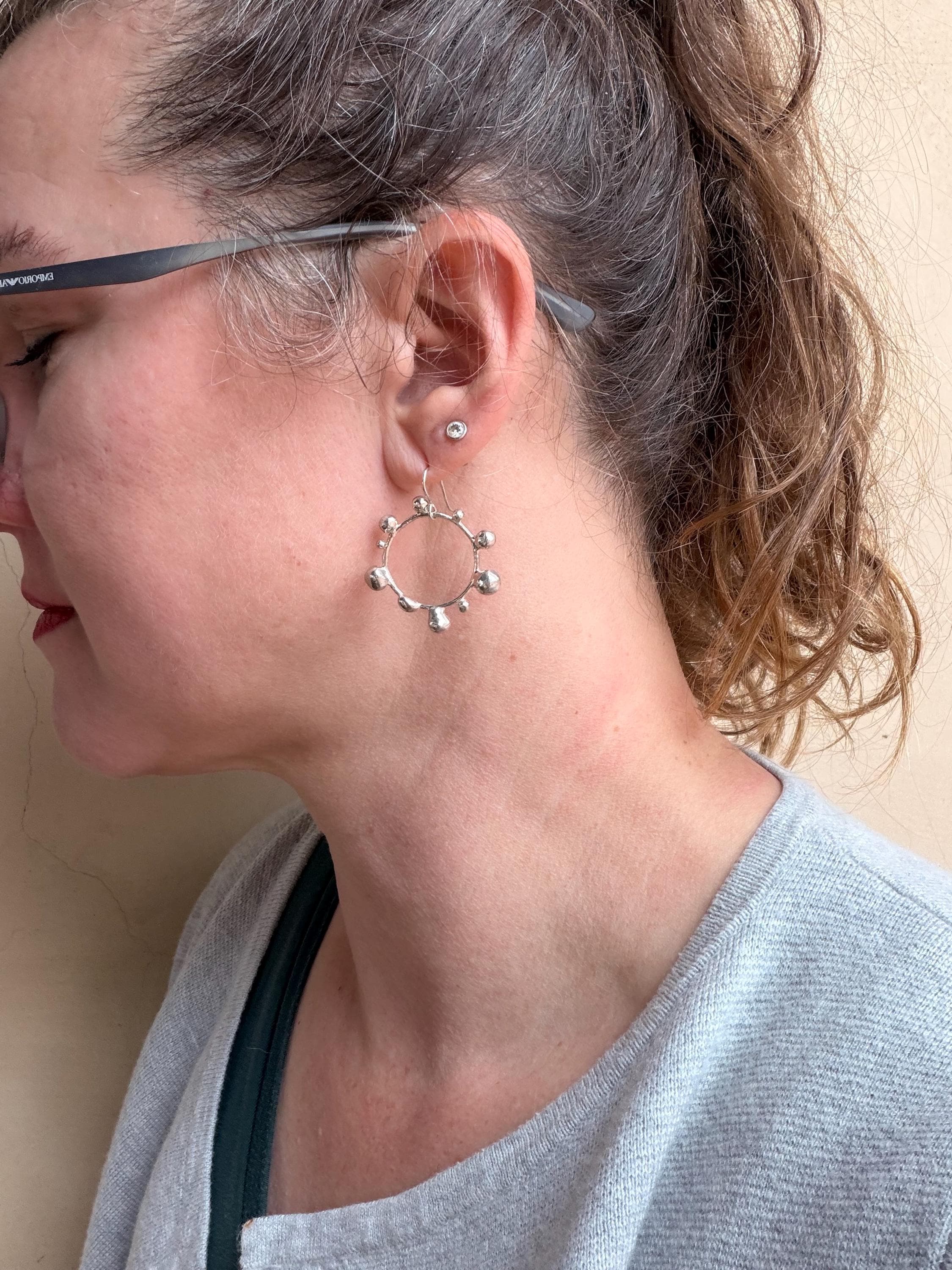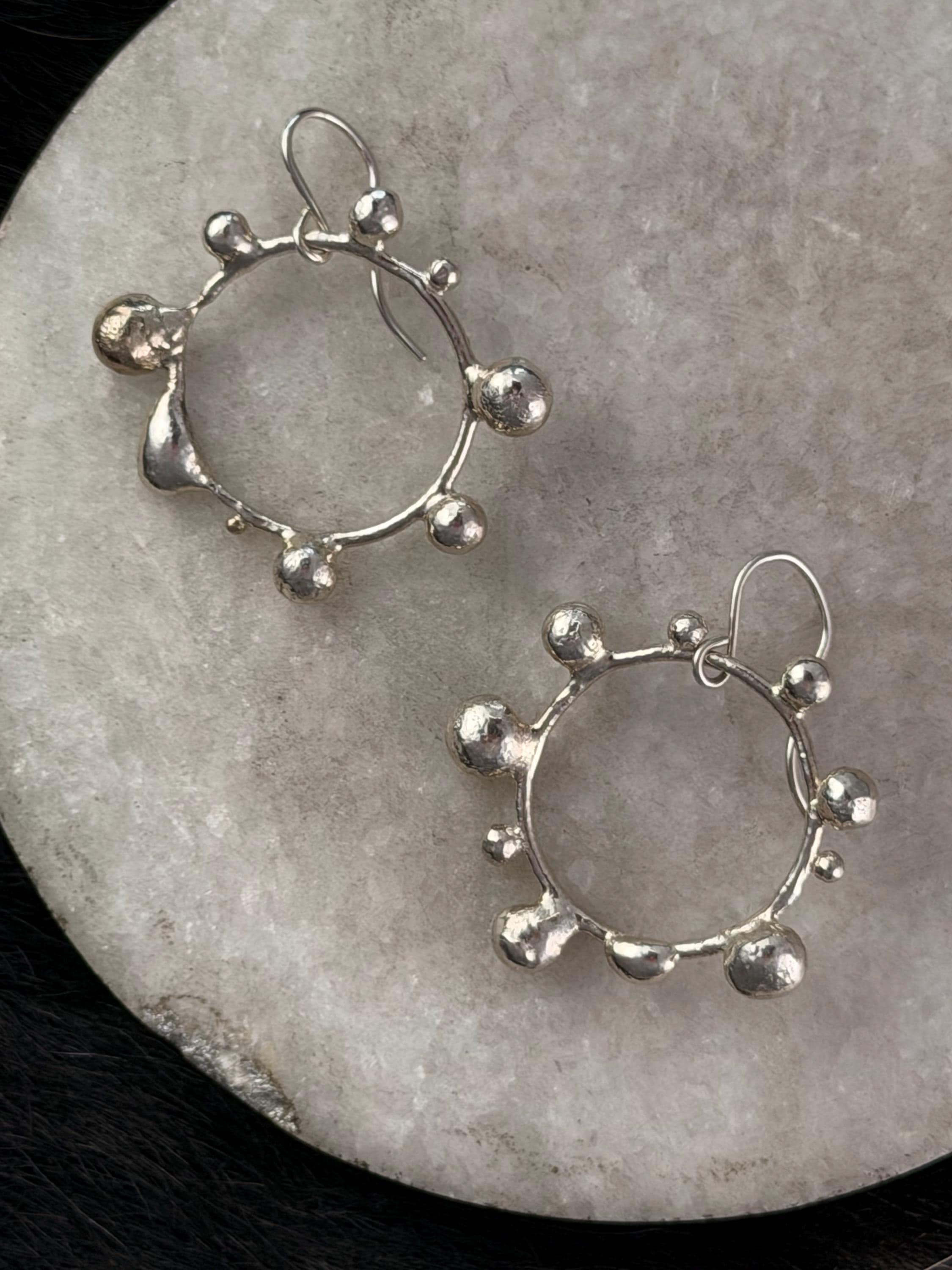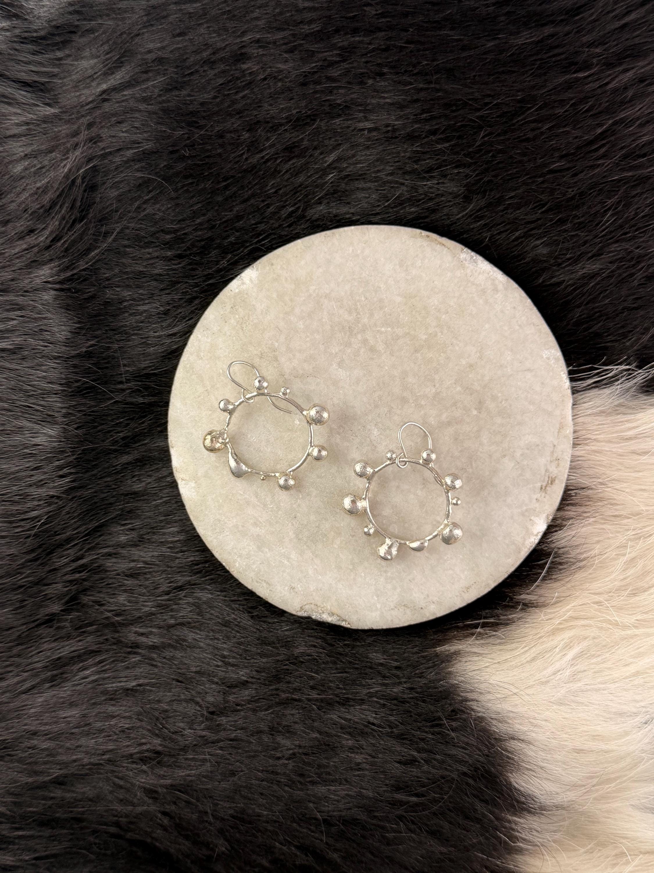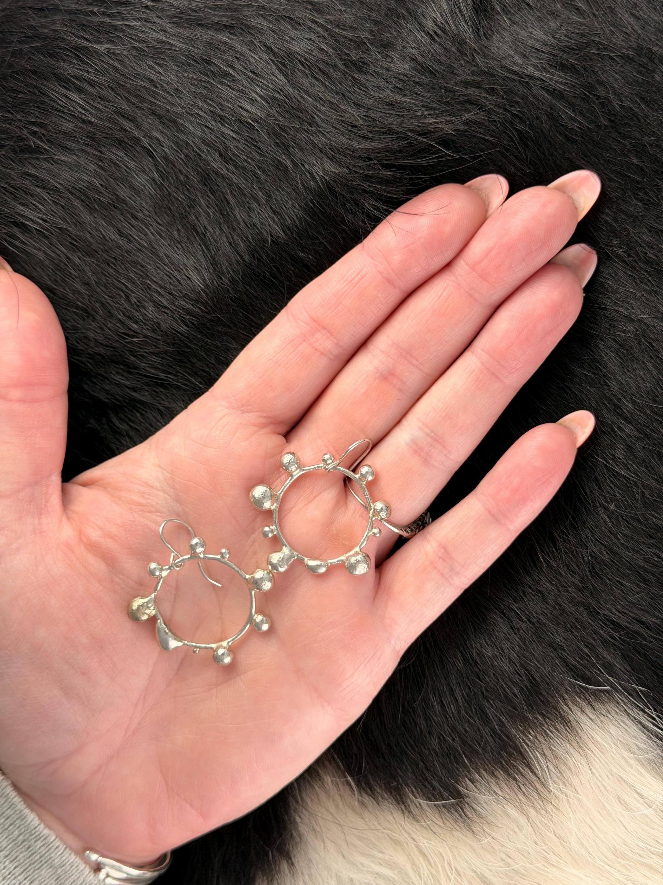 The Circle shape is accented with free formed bubbles and balls of sterling silver. This earring is part of a collection where I have explored more of my artistic creativity while testing the fusing and melting points of silver, it is quite delightful to find these geometric shapes to have formed in the way that they have.