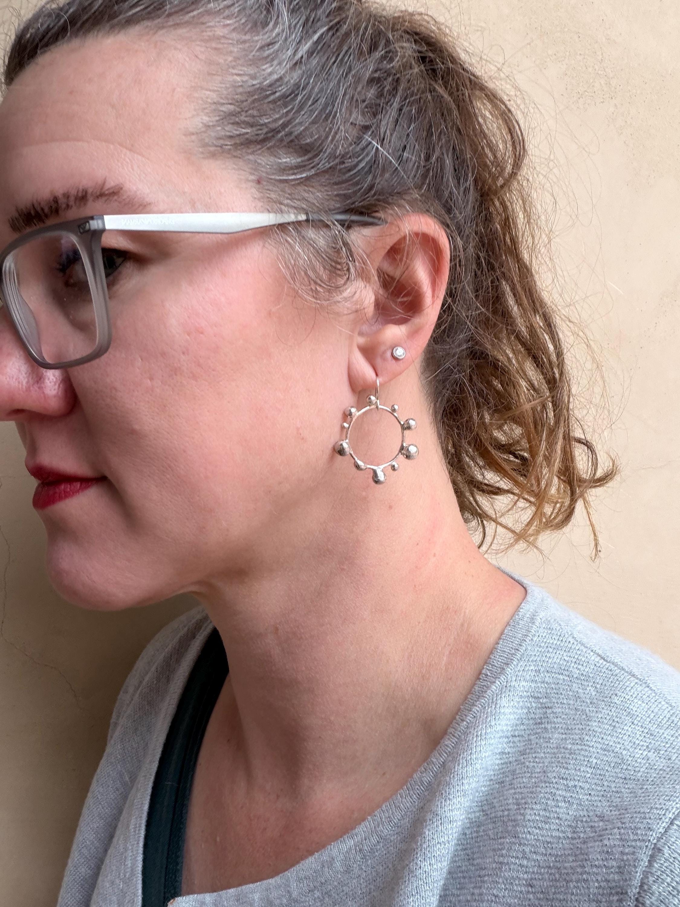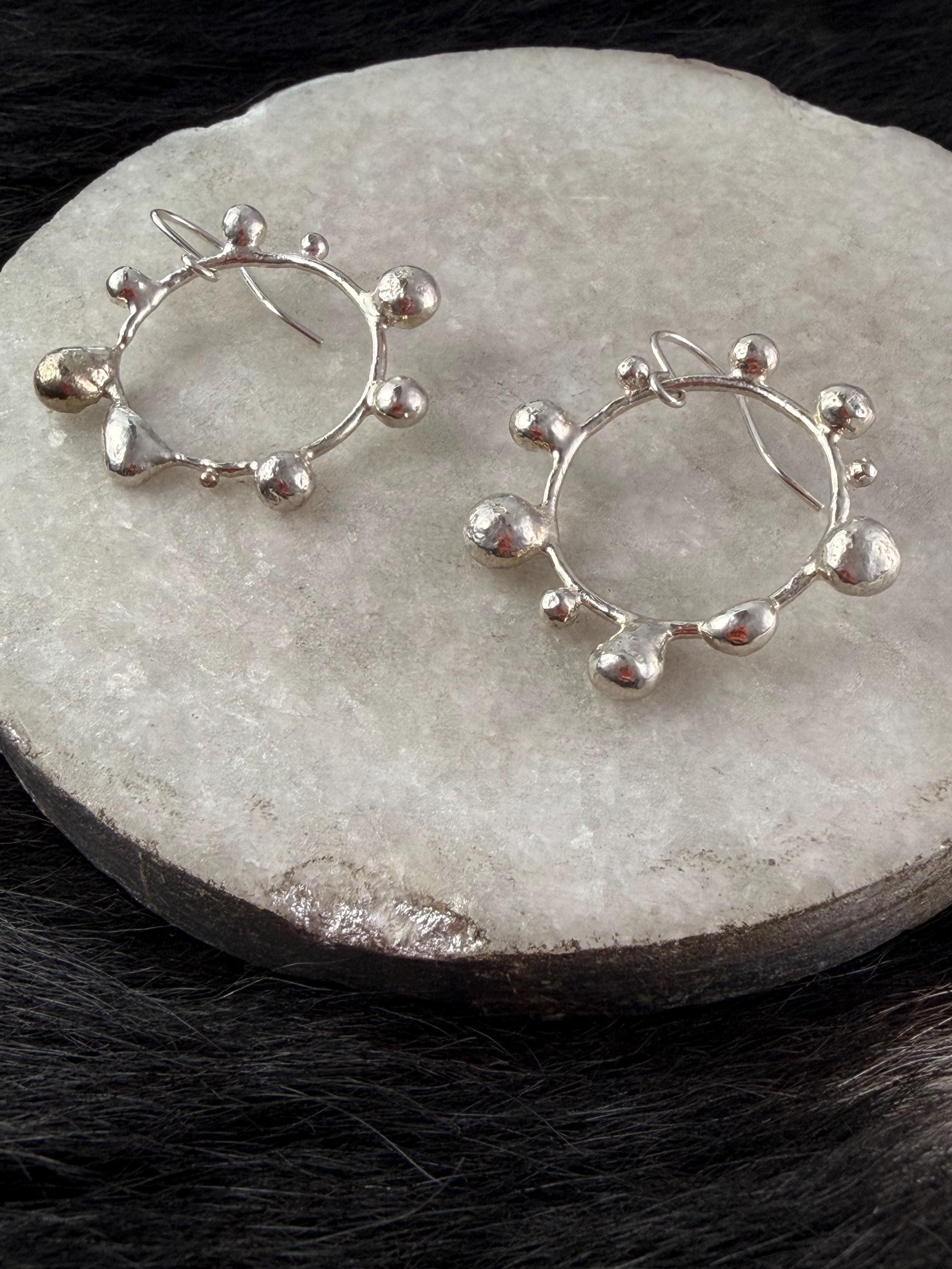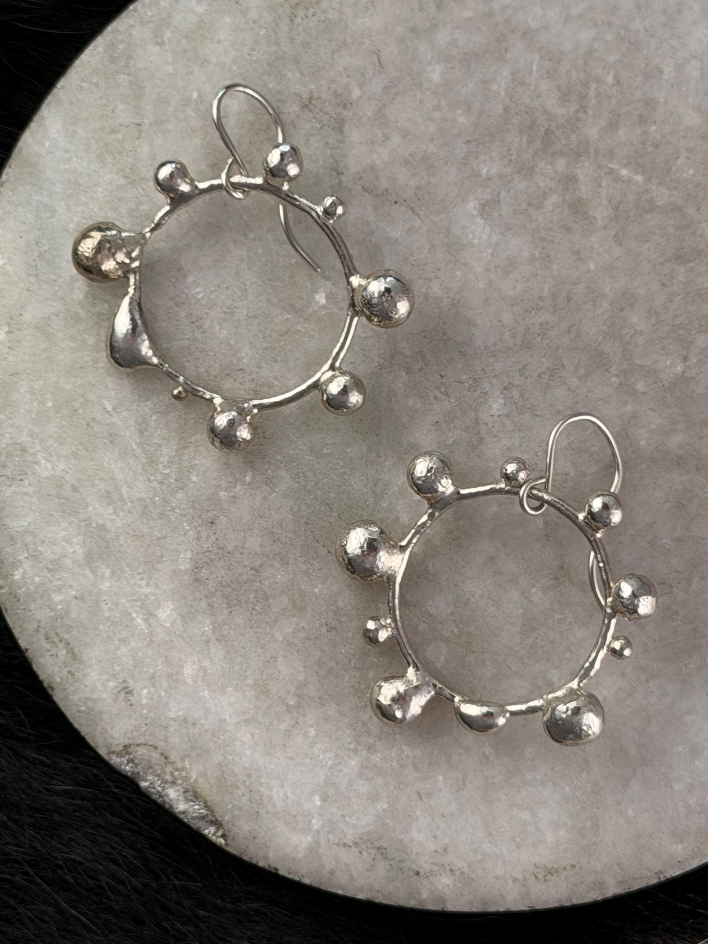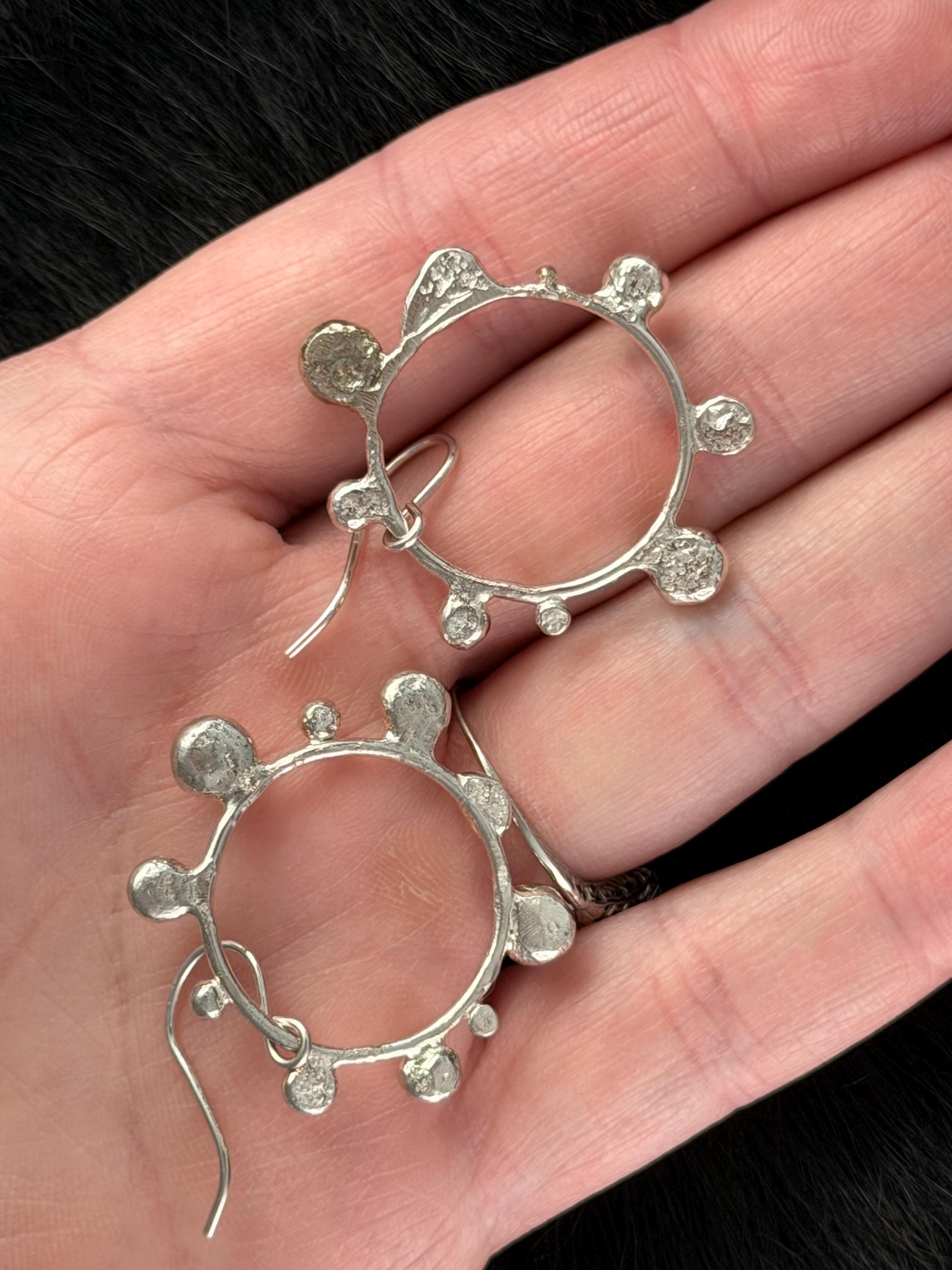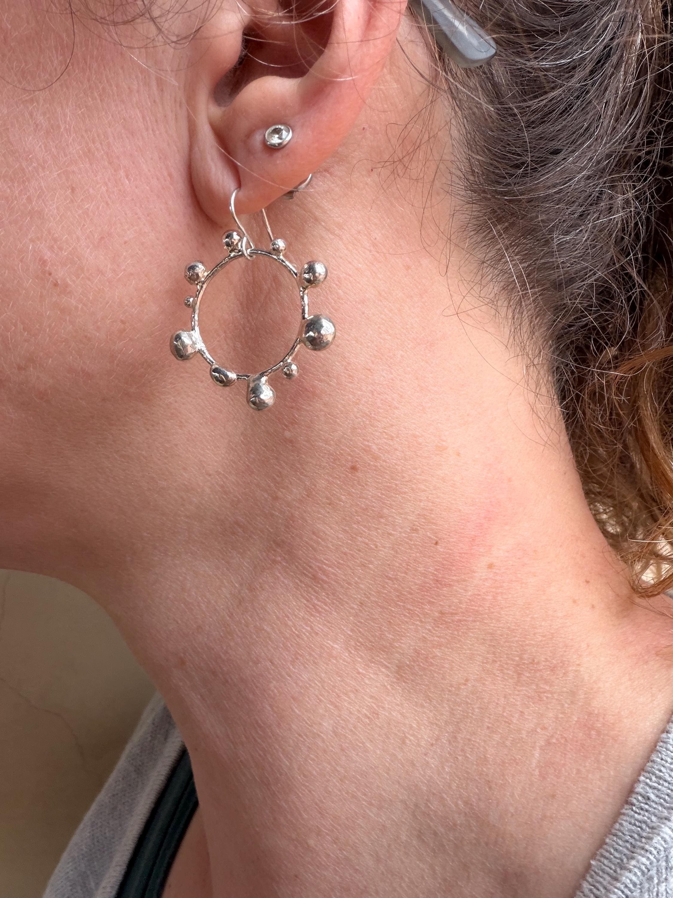 The Circle shape is accented with free formed bubbles and balls of sterling silver. This earring is part of a collection where I have explored more of my artistic creativity while testing the fusing and melting points of silver, it is quite delightful to find these geometric shapes to have formed in the way that they have.