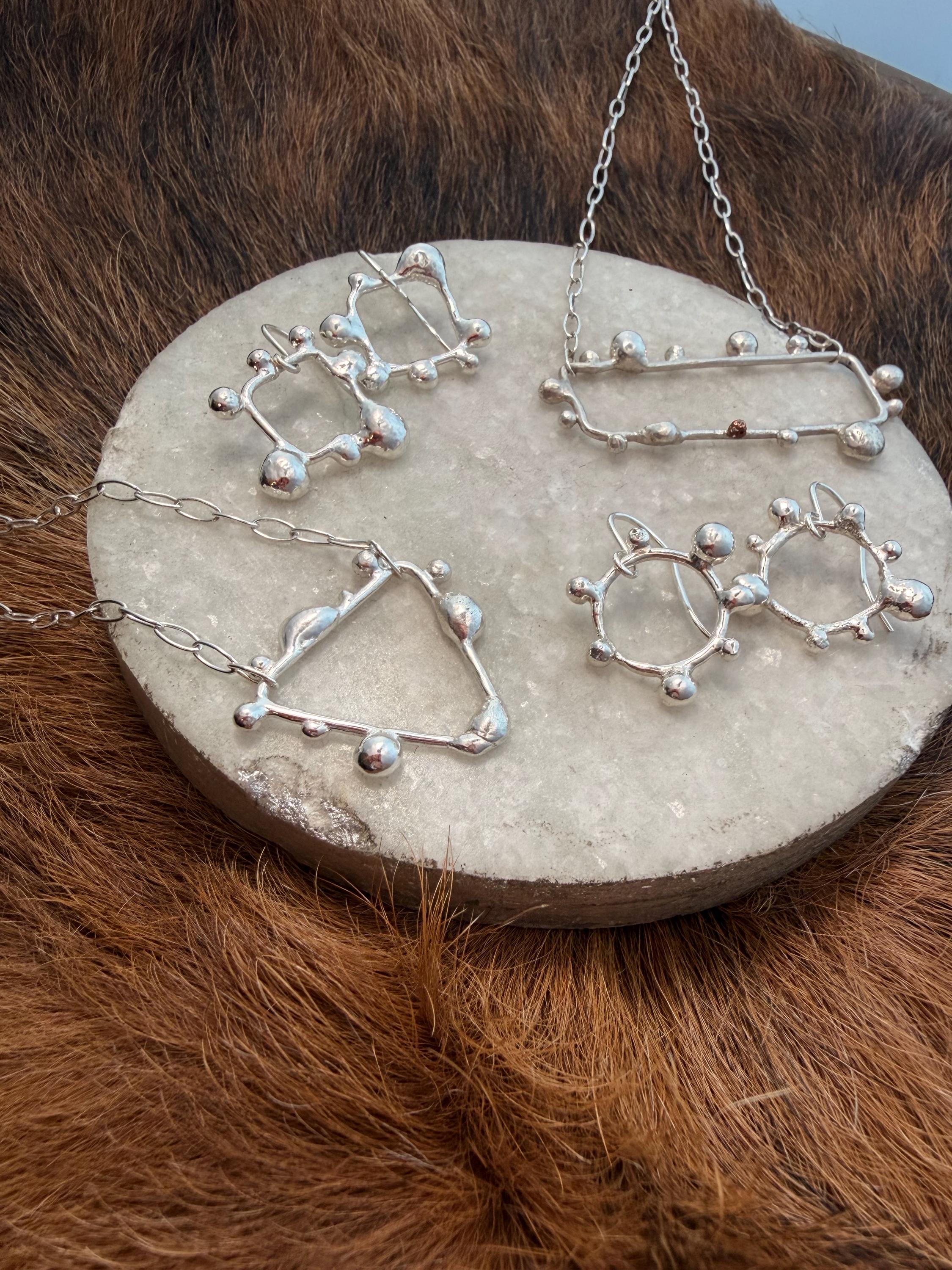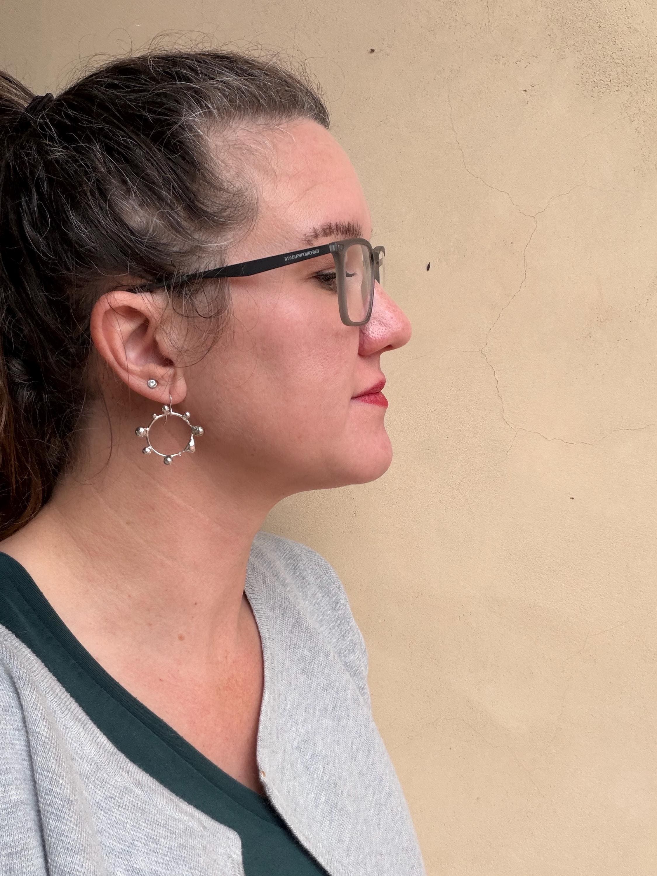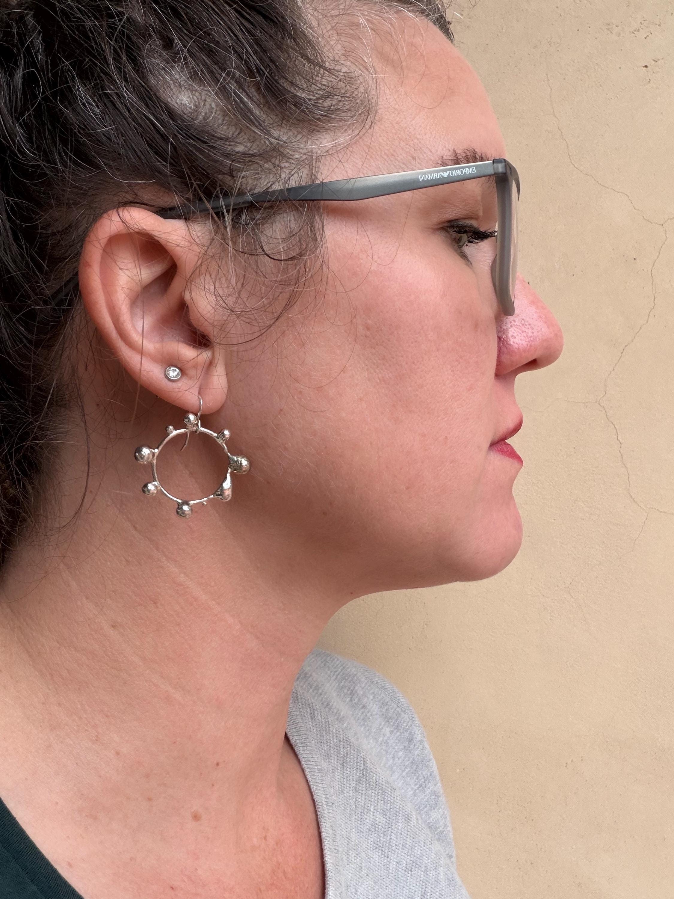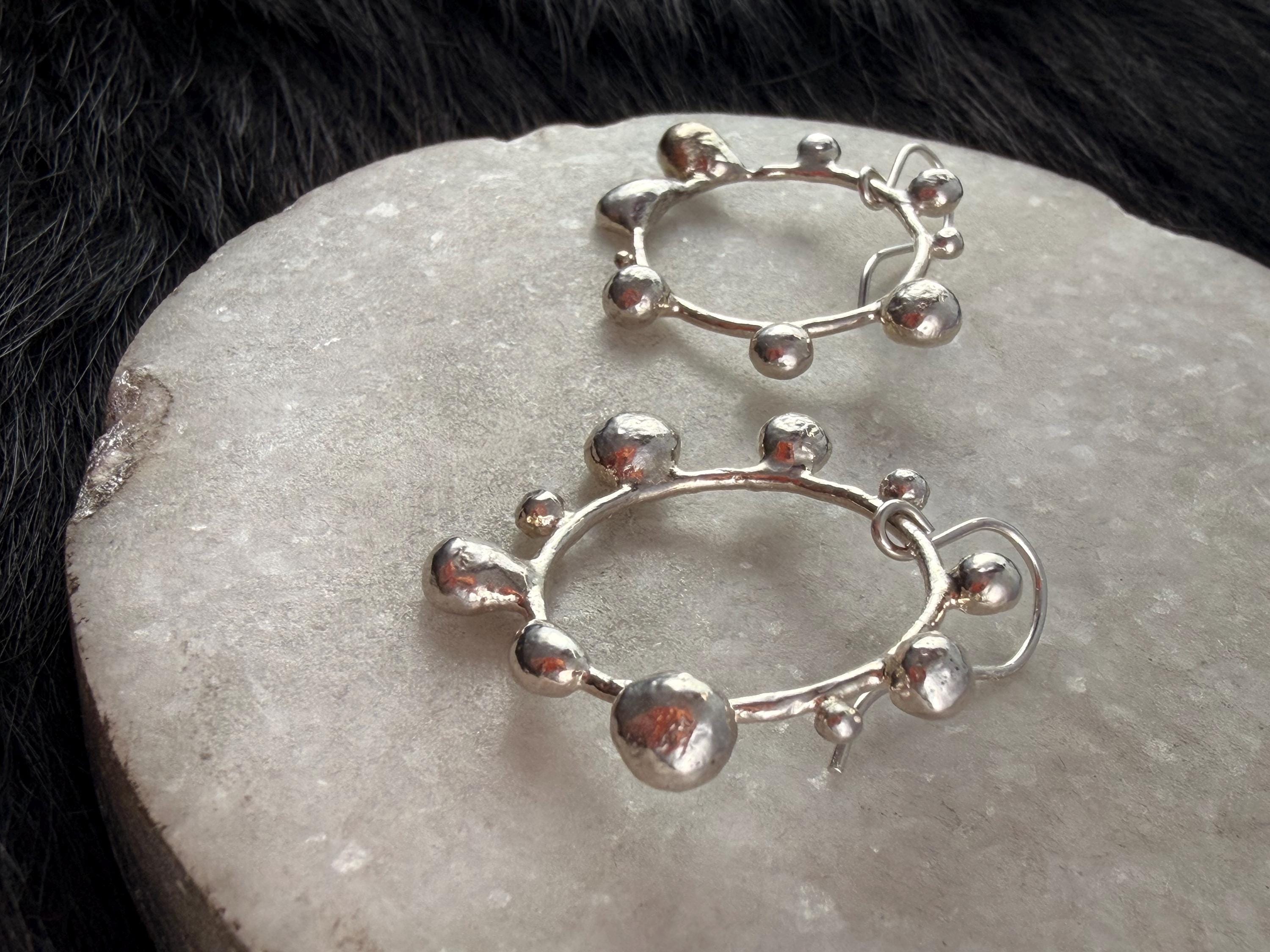 The Circle shape is accented with free formed bubbles and balls of sterling silver. This earring is part of a collection where I have explored more of my artistic creativity while testing the fusing and melting points of silver, it is quite delightful to find these geometric shapes to have formed in the way that they have.