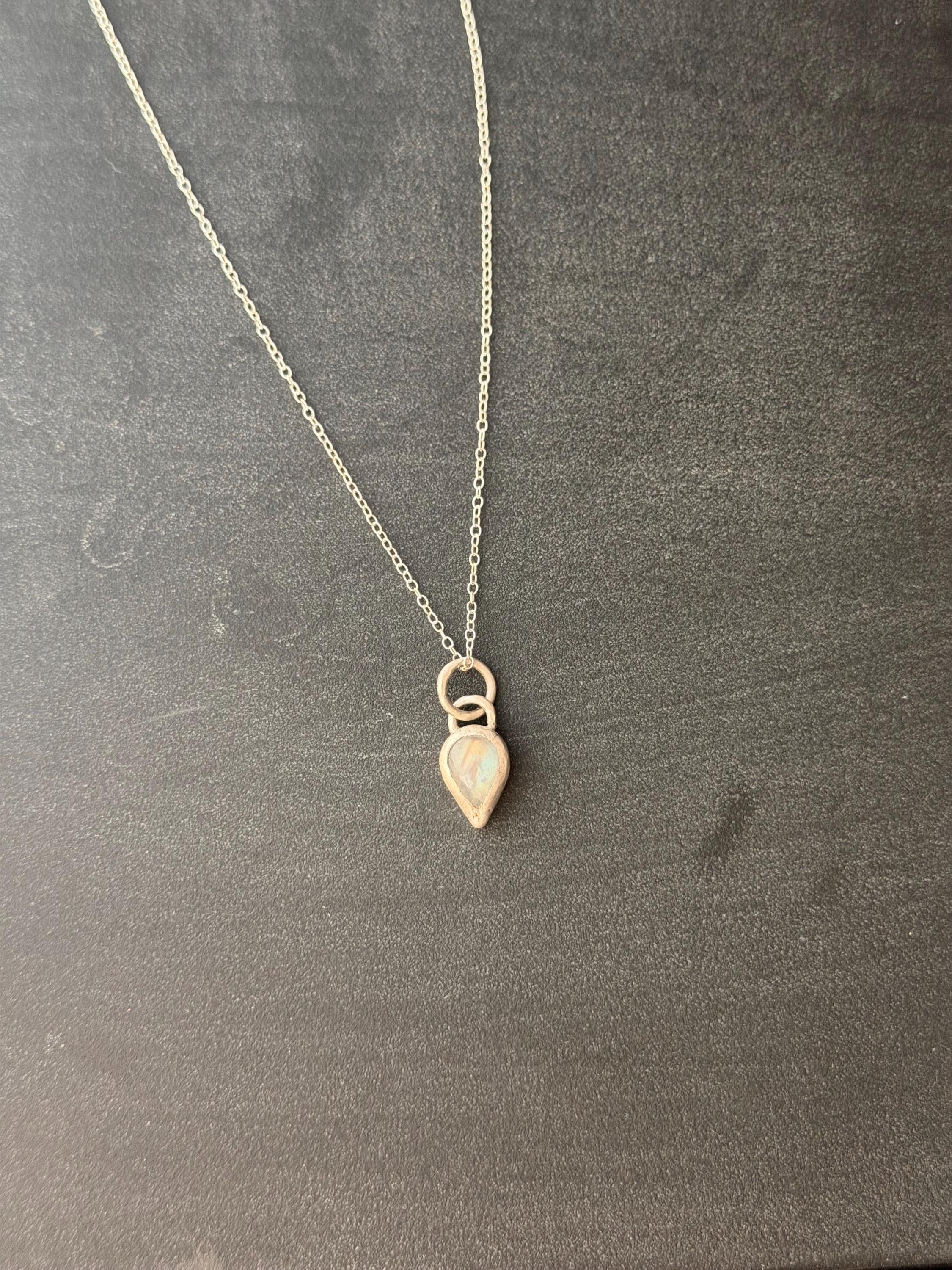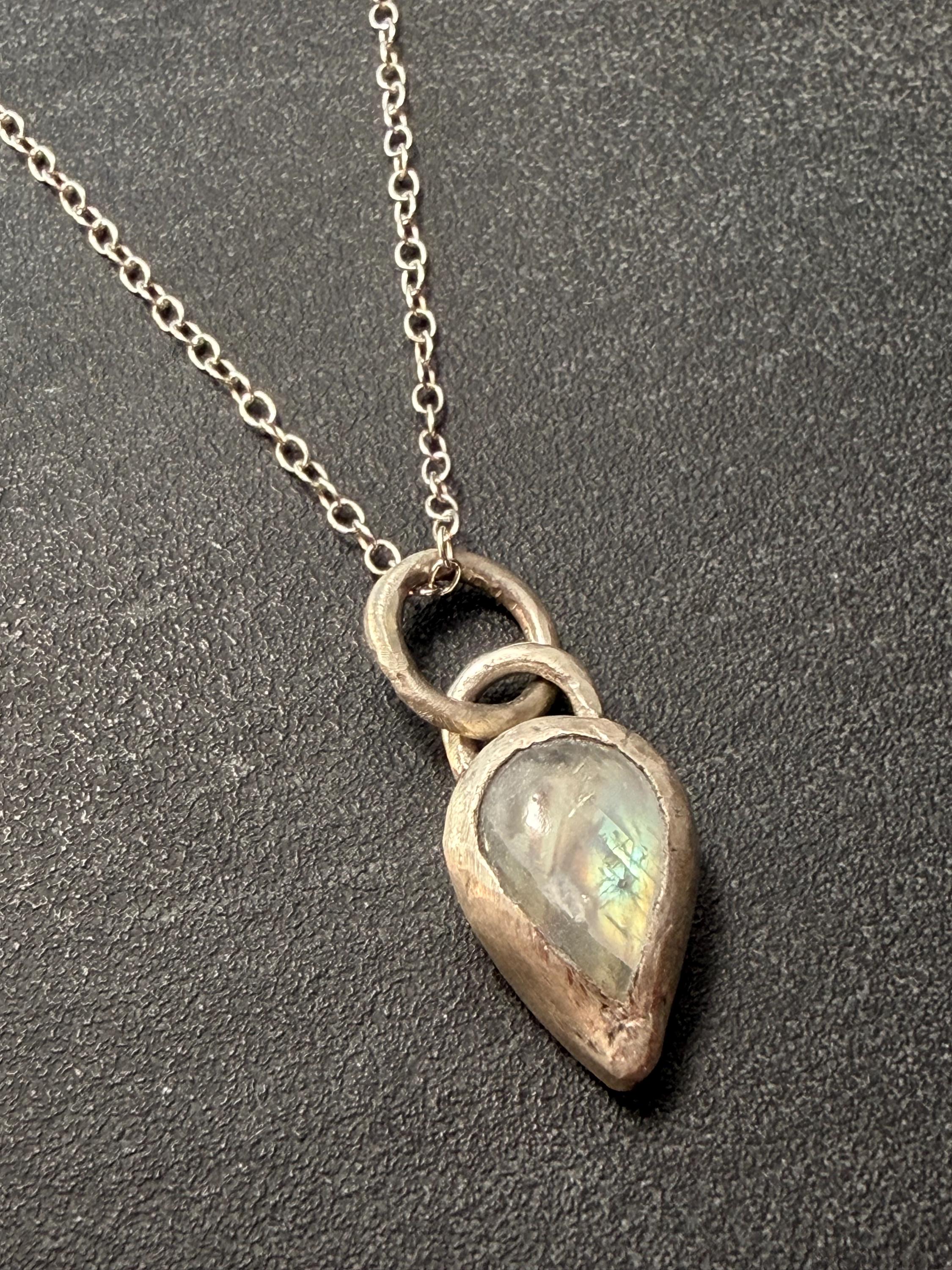 This pendant has a lovely moonstone stone with some great iridescent tones when it catches the light. it is shaped like a upside down teardrop.