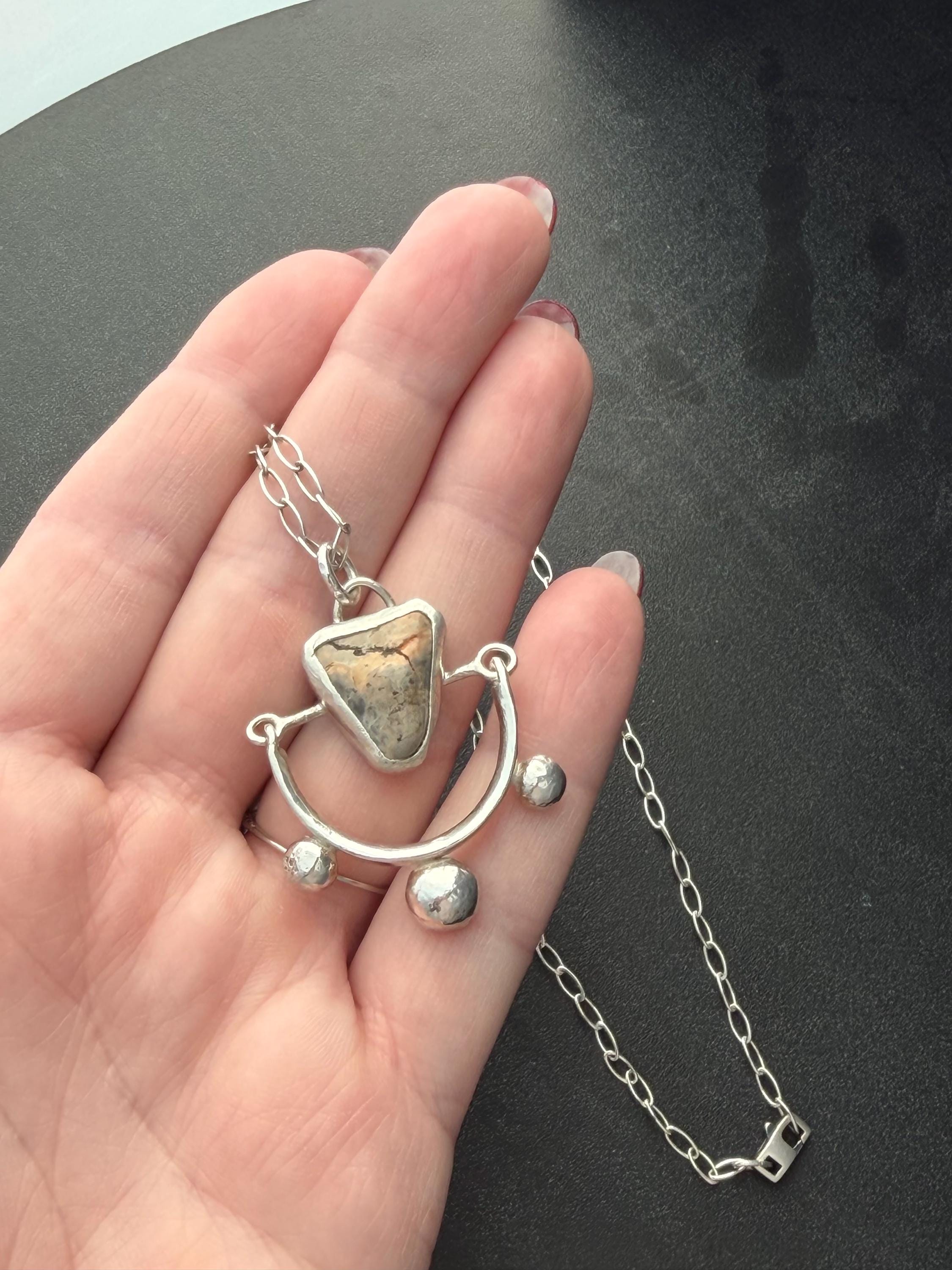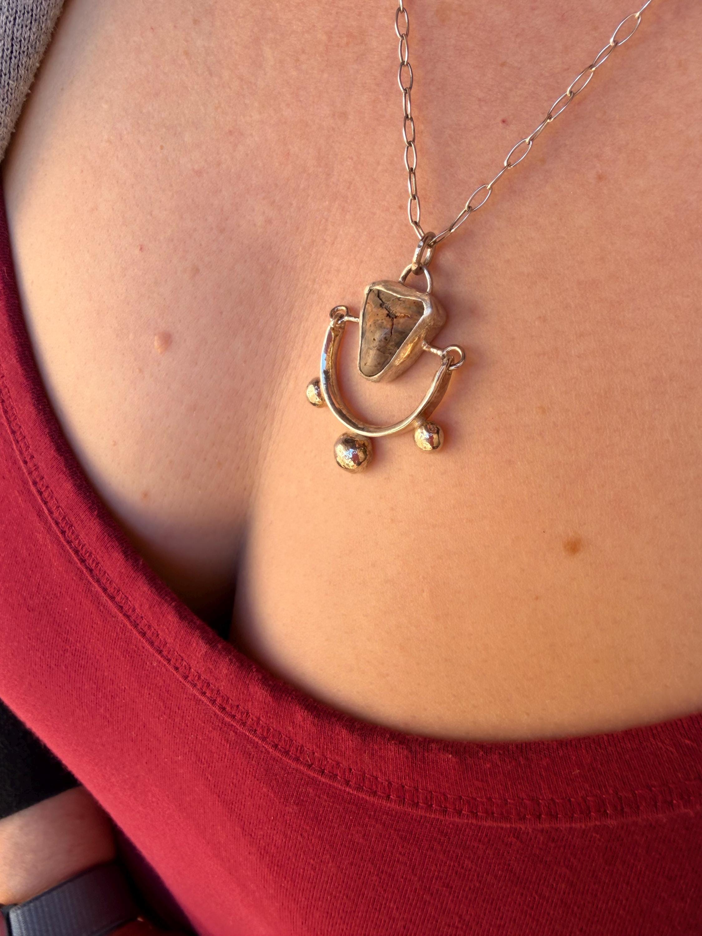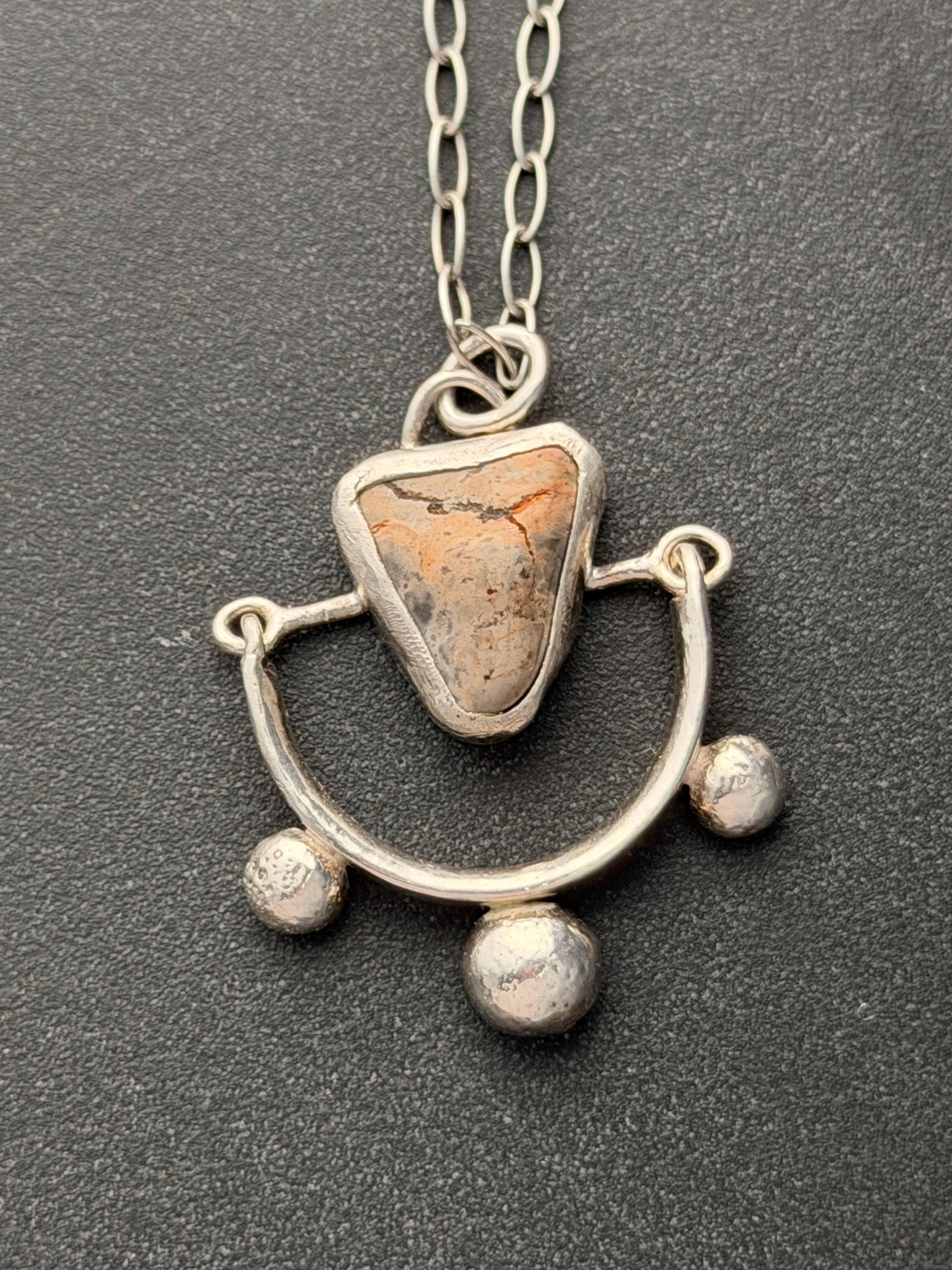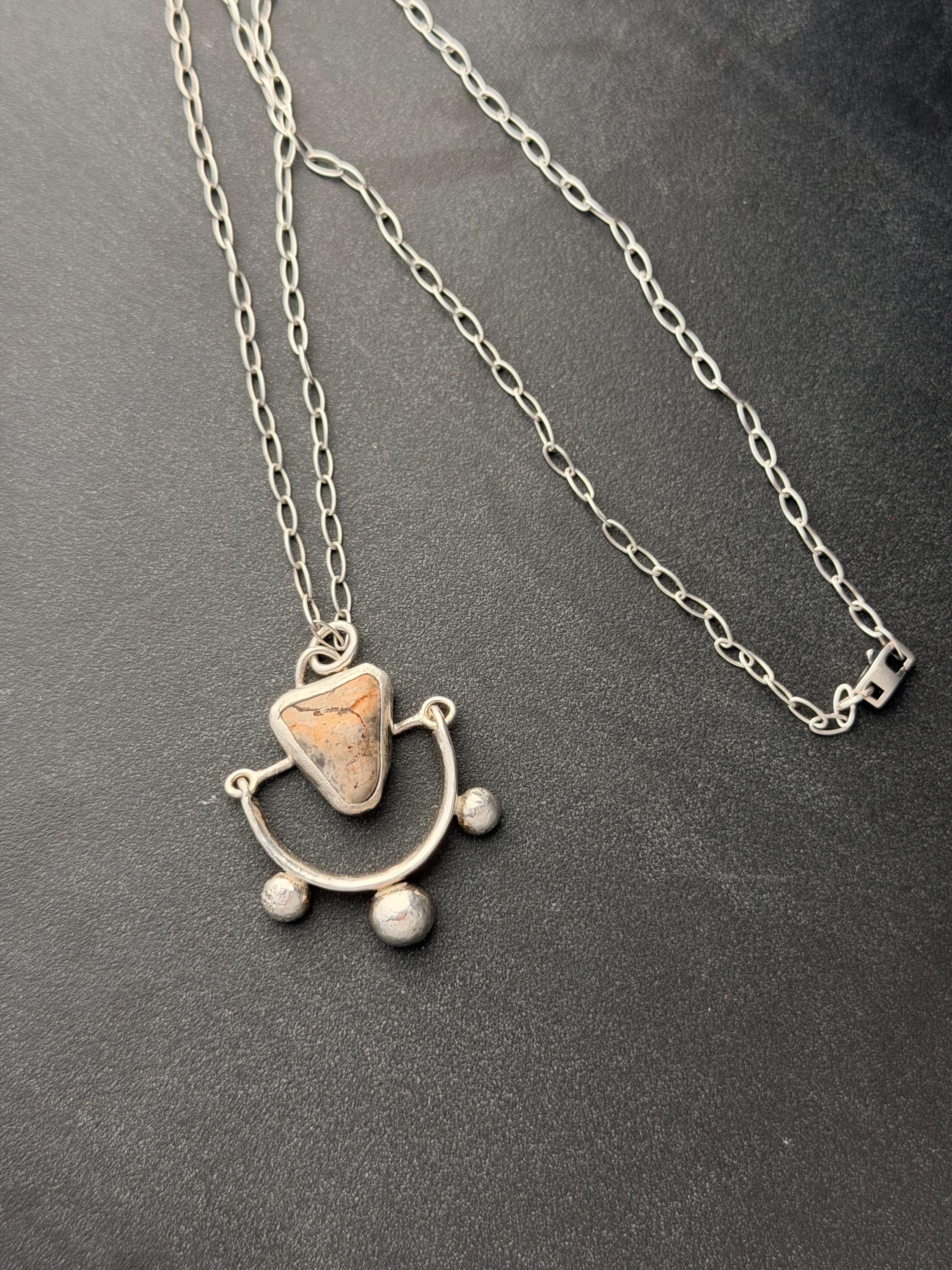 Swooping shape with ball accents. medium sized overall. it has an Arizona quartzite triangle shaped stone which is attached and swings back and forth giving movement and intrigue, maybe even fidget-like.