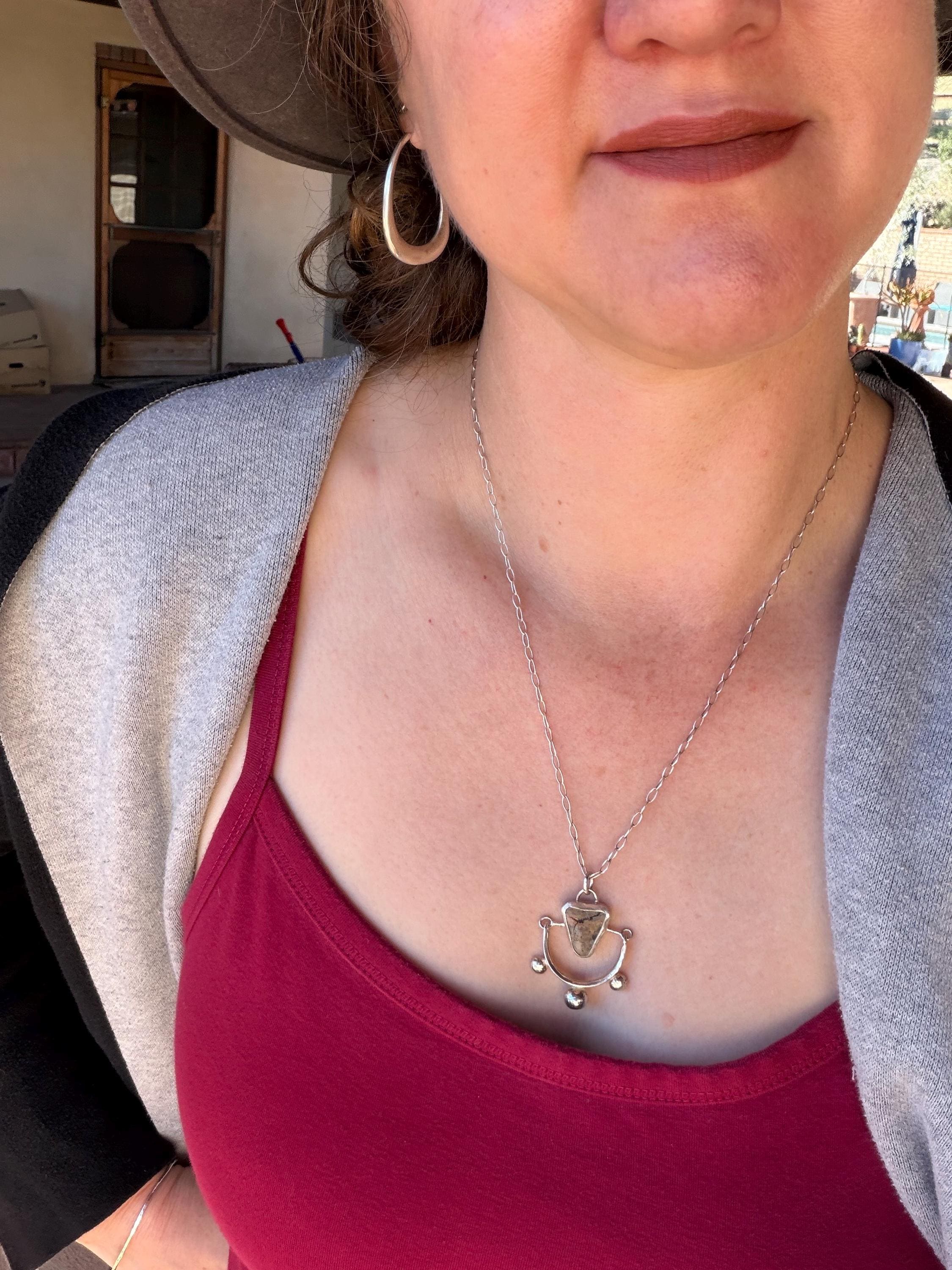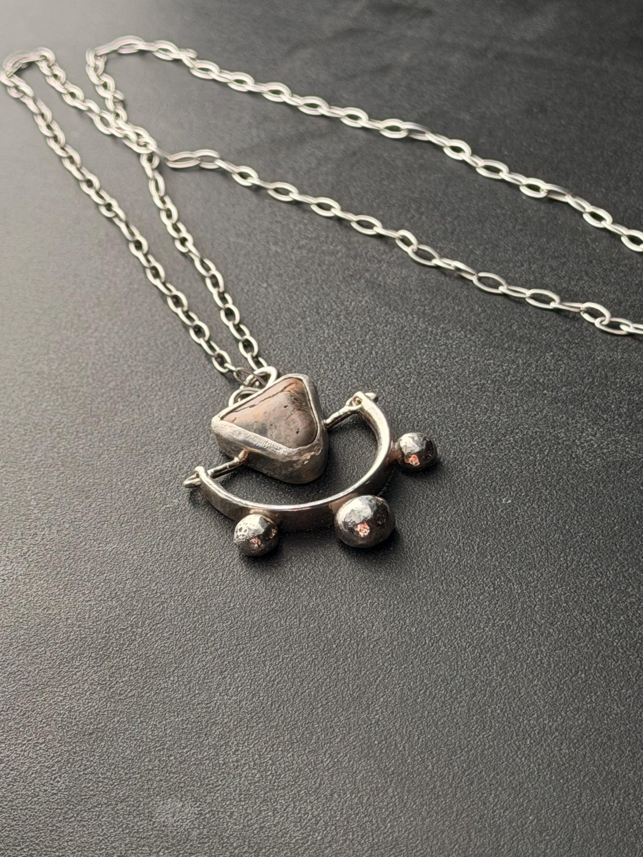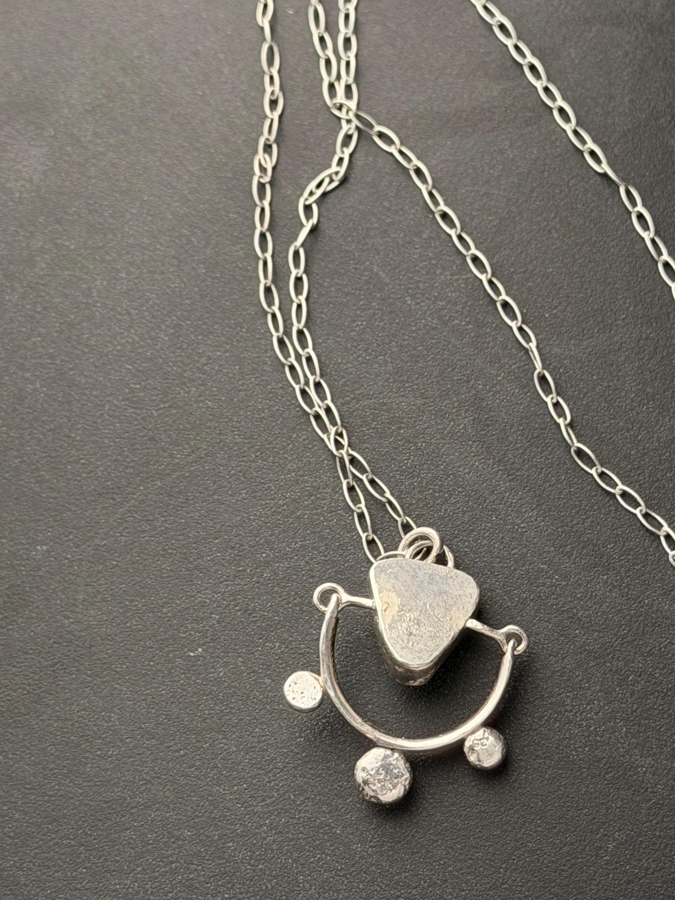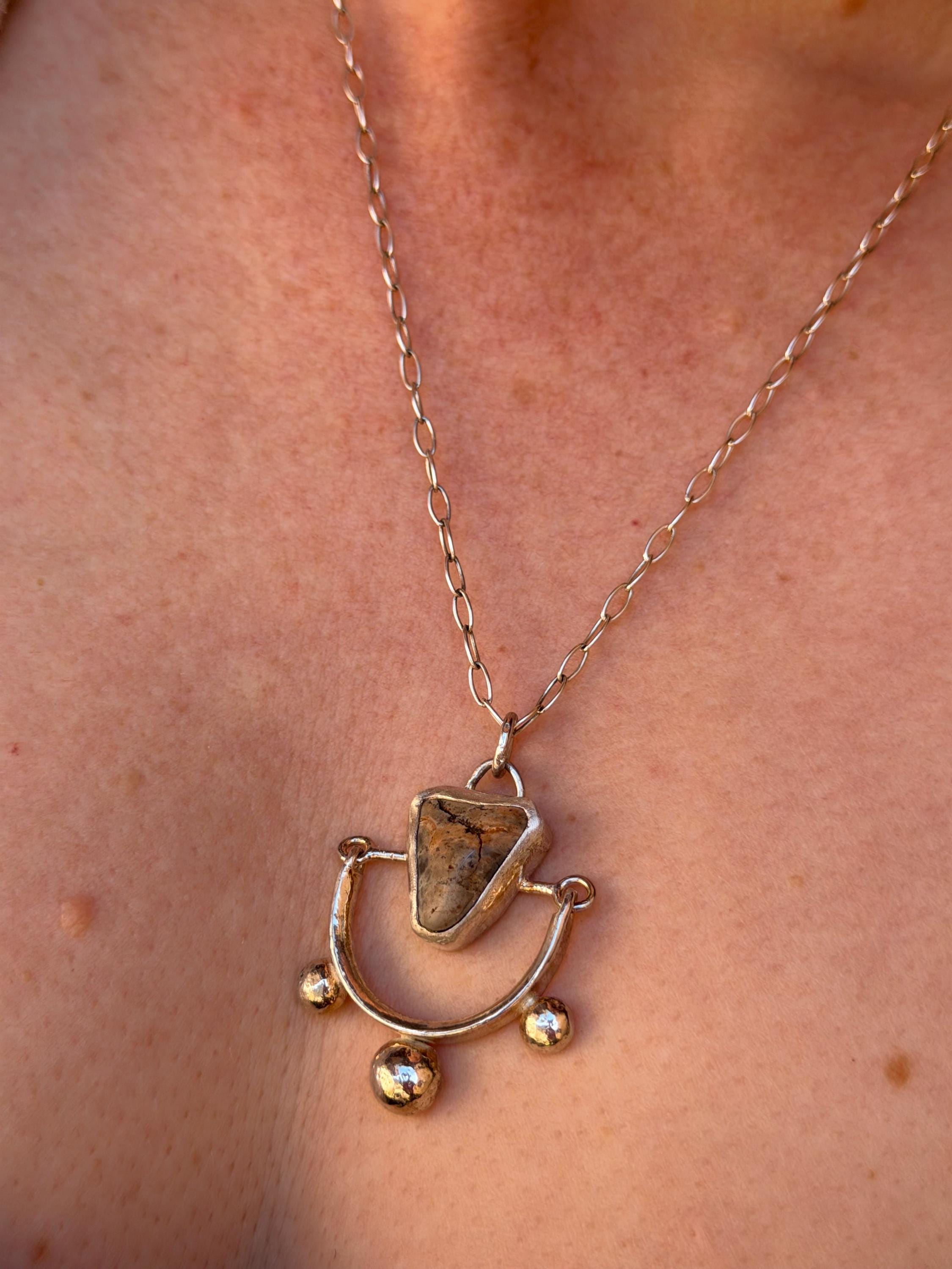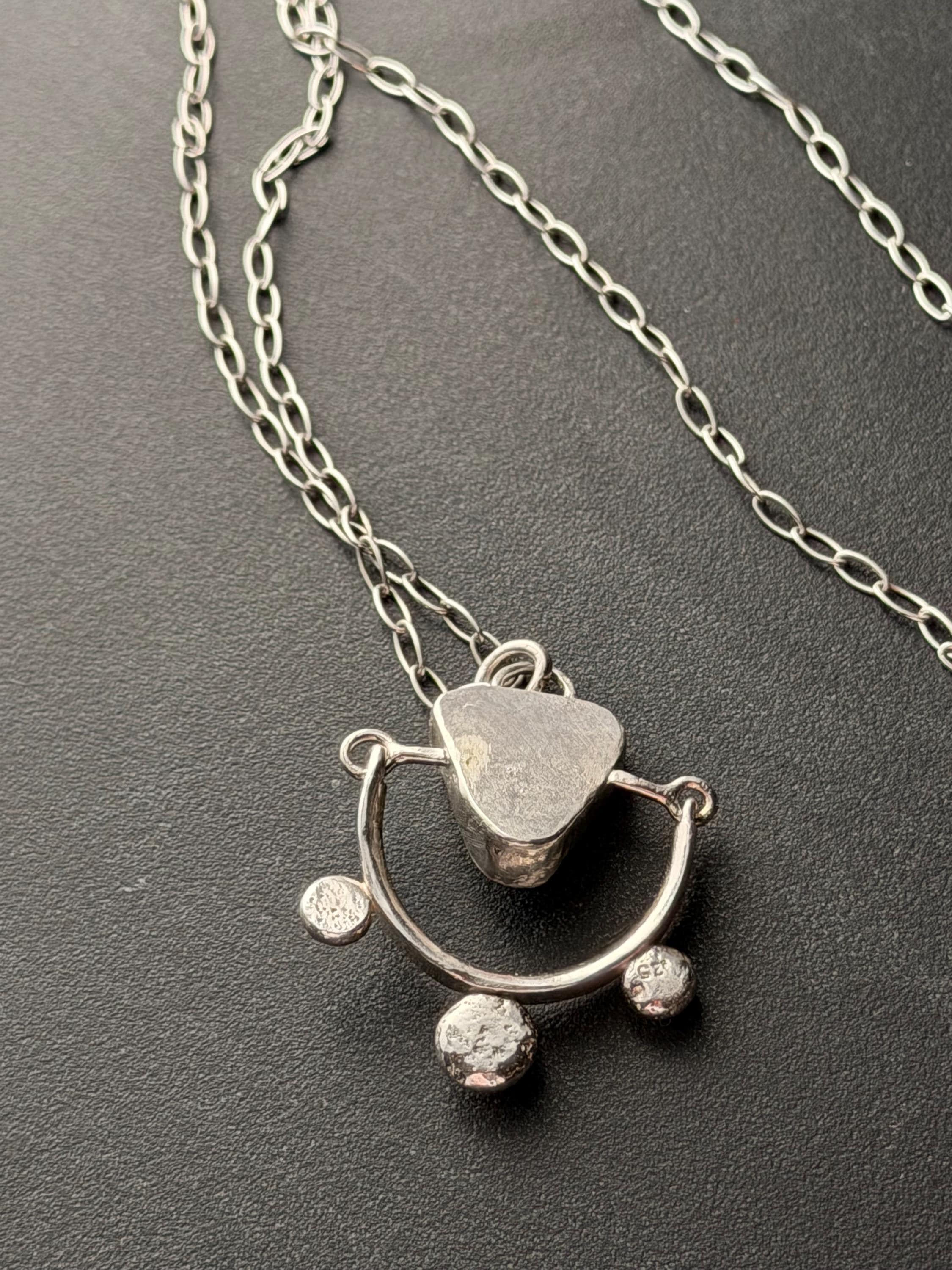 Swooping shape with ball accents. medium sized overall. it has an Arizona quartzite triangle shaped stone which is attached and swings back and forth giving movement and intrigue, maybe even fidget-like.