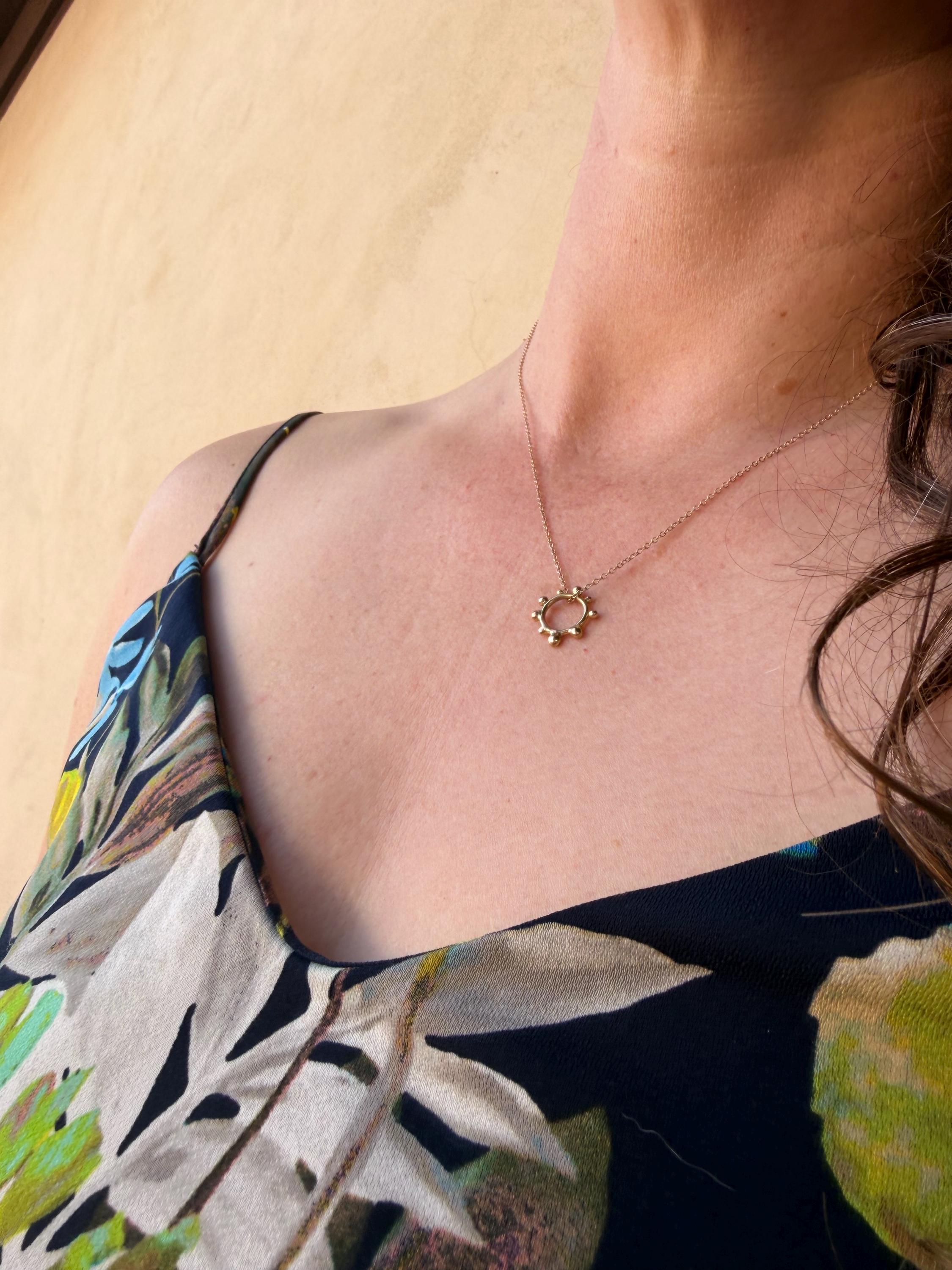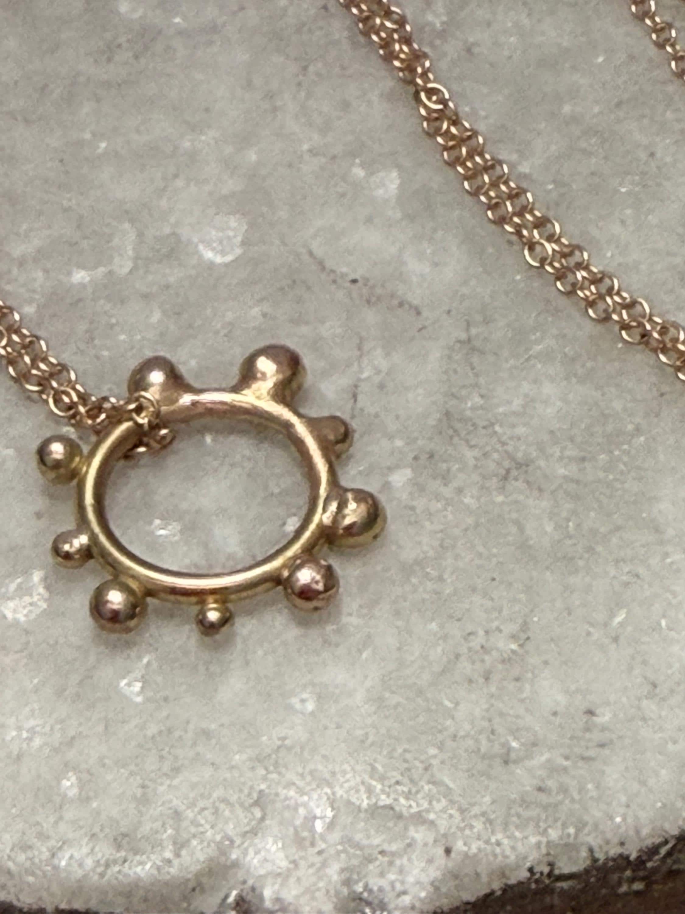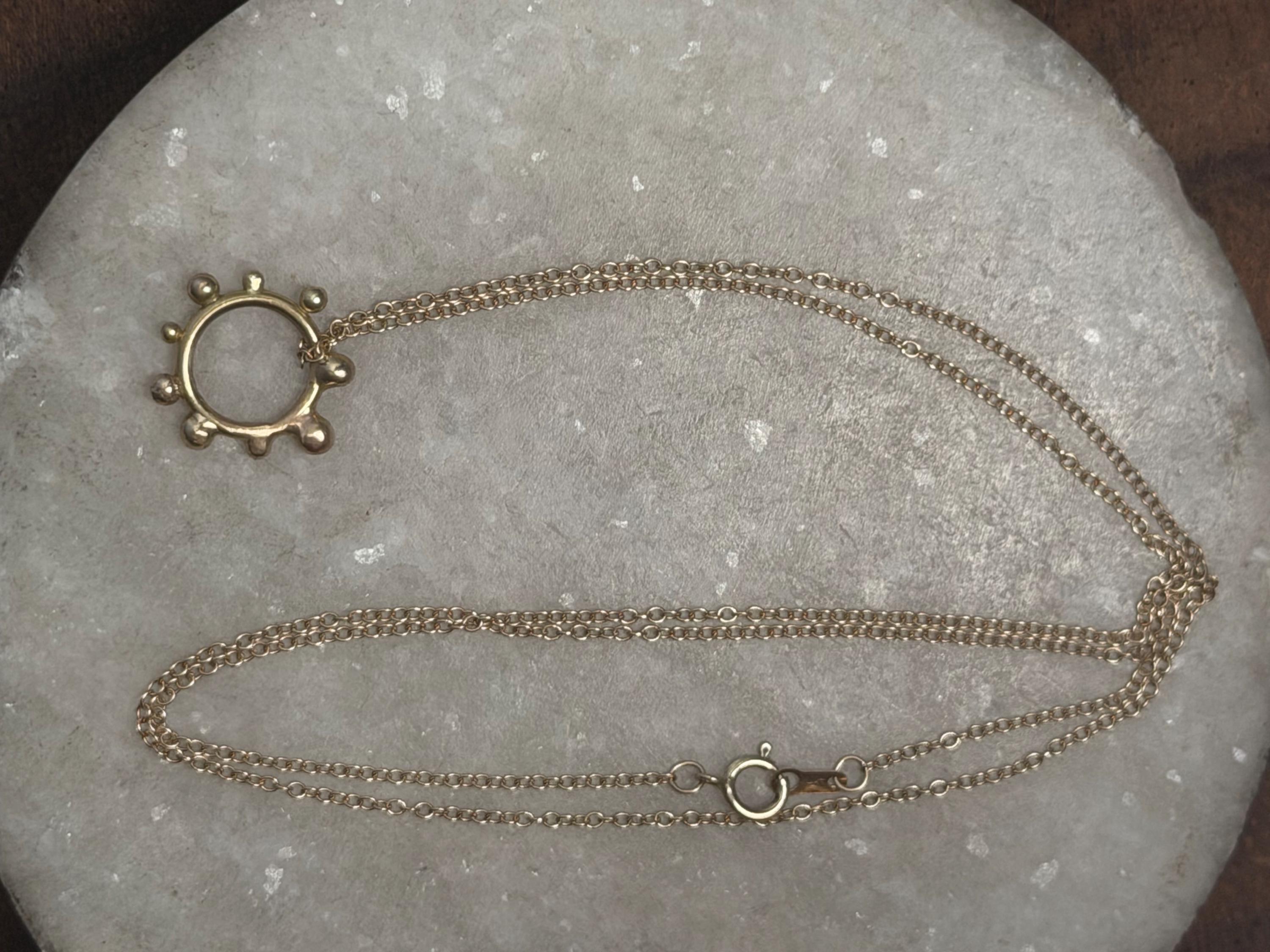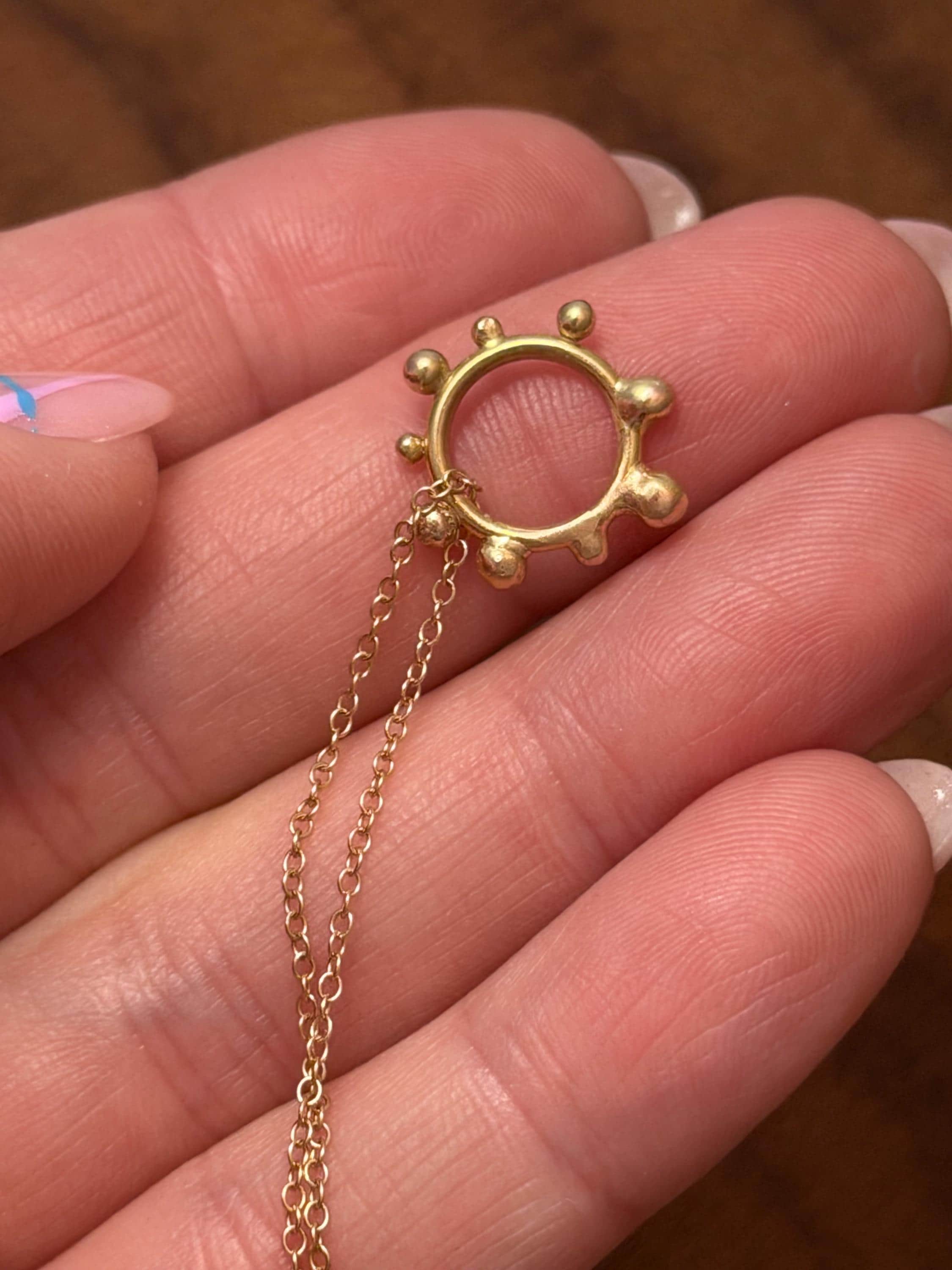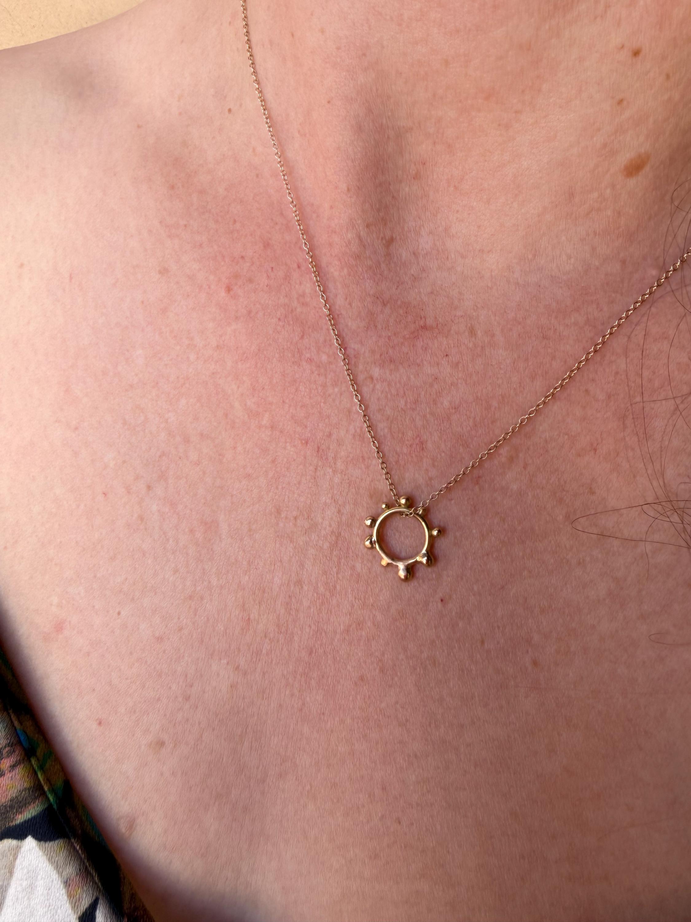 The Circle shape floats along the chain. The circle is accented with free formed bubbles and balls of 14k yellow gold. This necklace is part of a collection where I have explored more of my artistic creativity while testing the fusing and melting points of gold and silver, it is quite delightful to find these geometric shapes to have formed in the way that they have. The necklace exhibits hand formed circle outline with the ball shapes fused and accenting the edge. this necklace is finished with a light and dainty cable chain and round spring clasp.