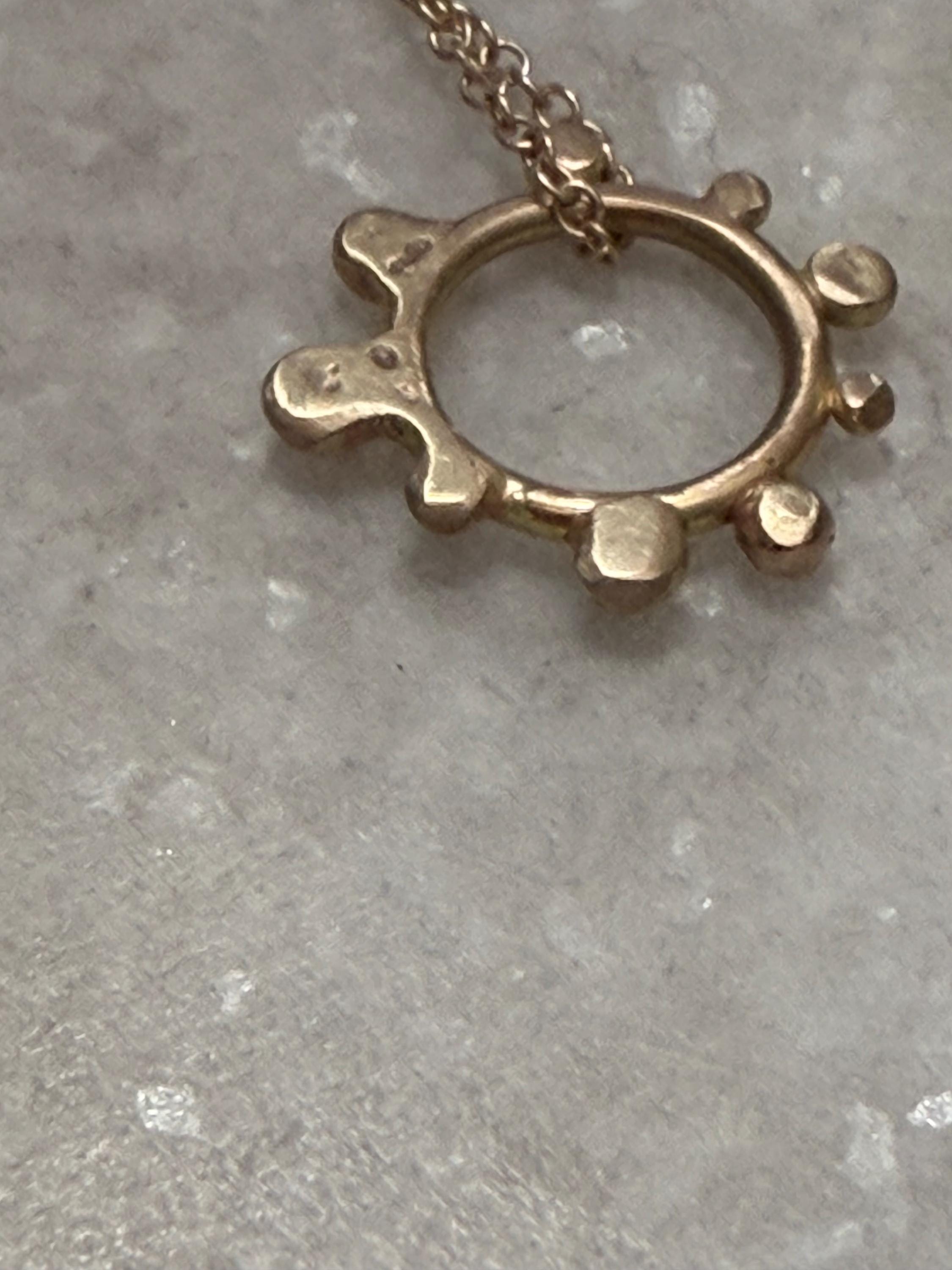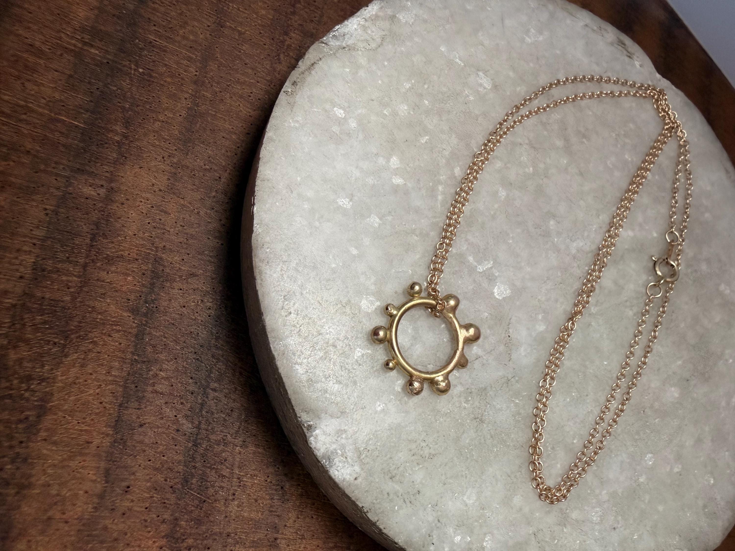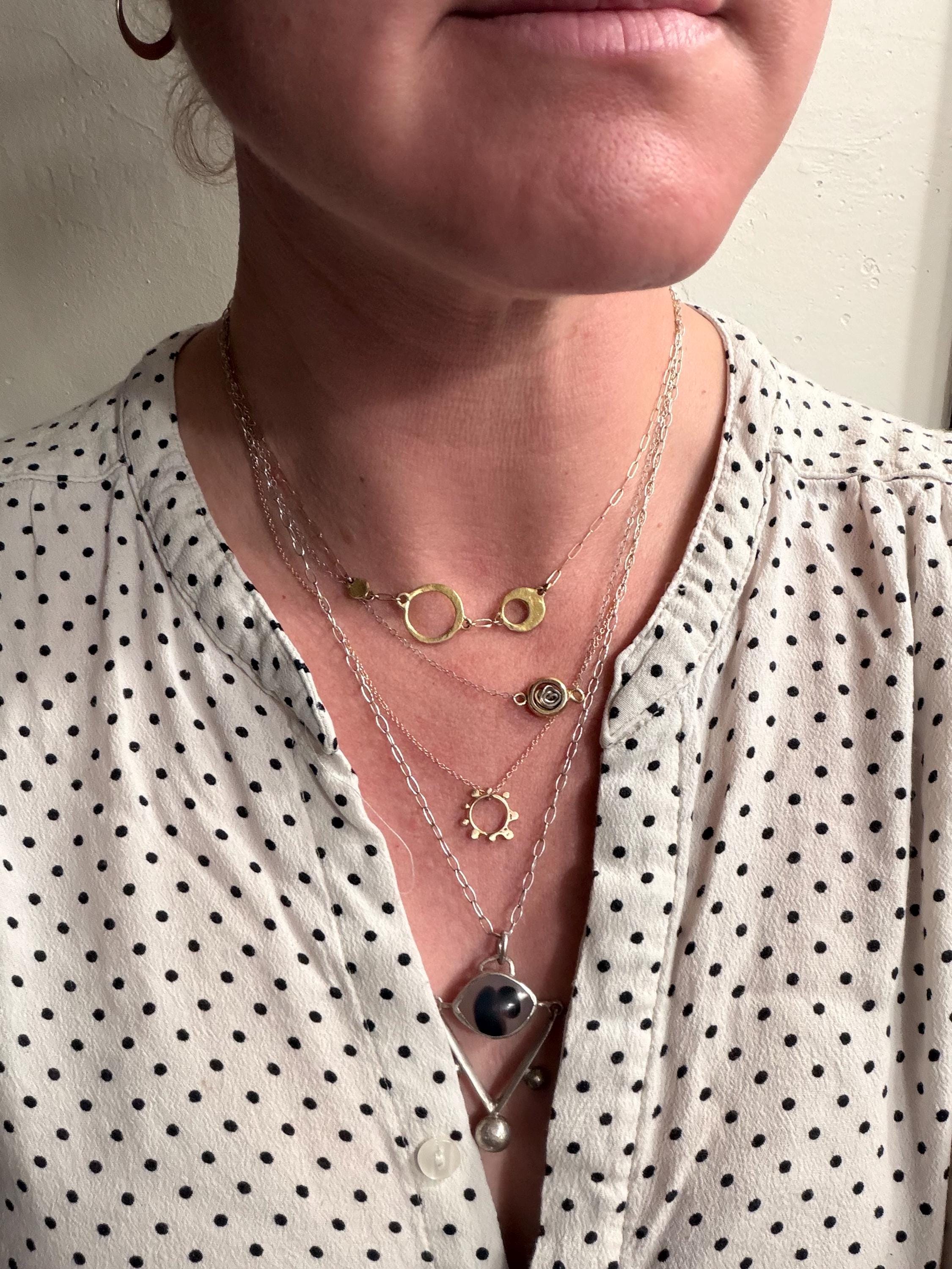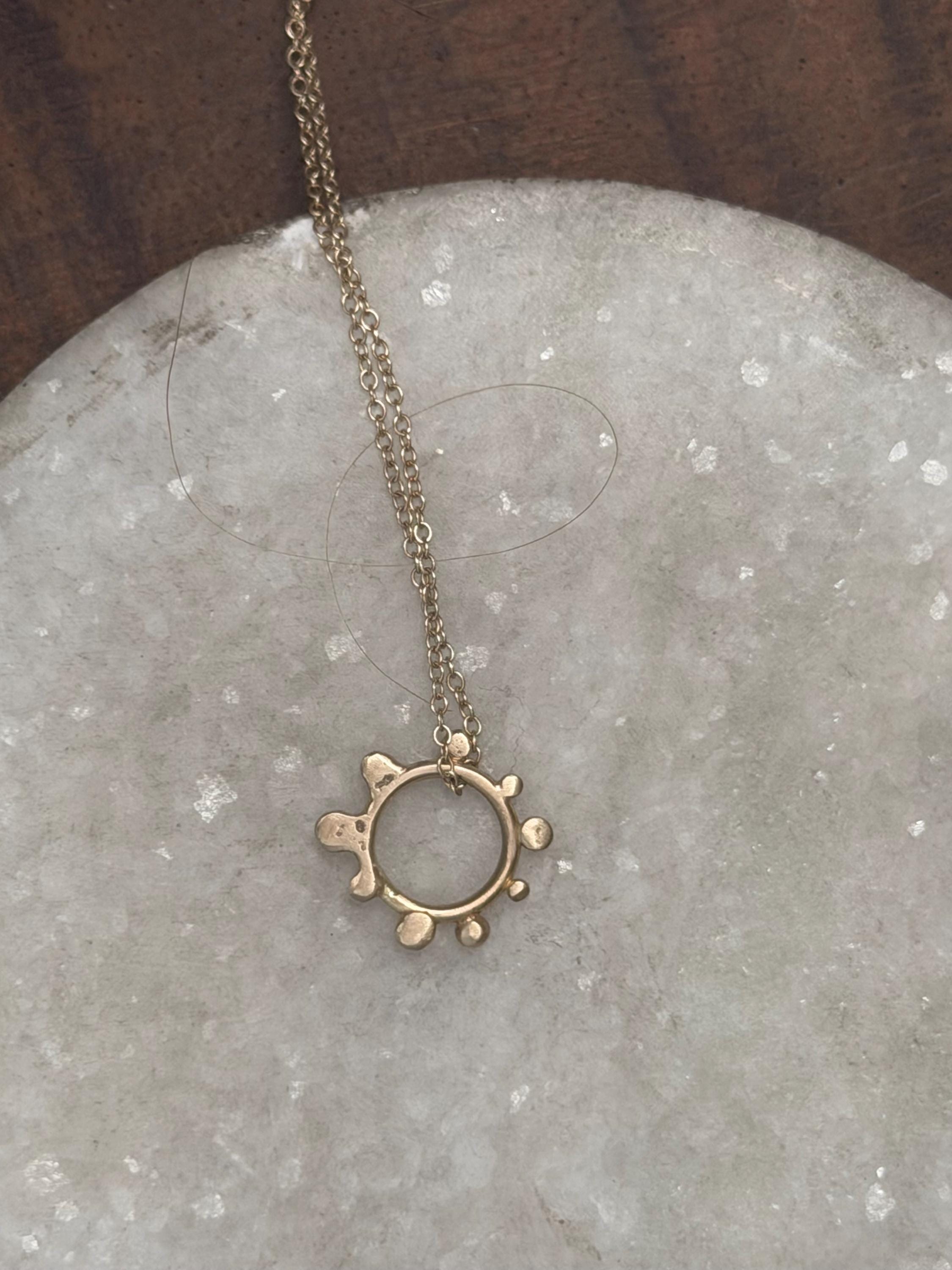 The Circle shape floats along the chain. The circle is accented with free formed bubbles and balls of 14k yellow gold. This necklace is part of a collection where I have explored more of my artistic creativity while testing the fusing and melting points of gold and silver, it is quite delightful to find these geometric shapes to have formed in the way that they have. The necklace exhibits hand formed circle outline with the ball shapes fused and accenting the edge. this necklace is finished with a light and dainty cable chain and round spring clasp.