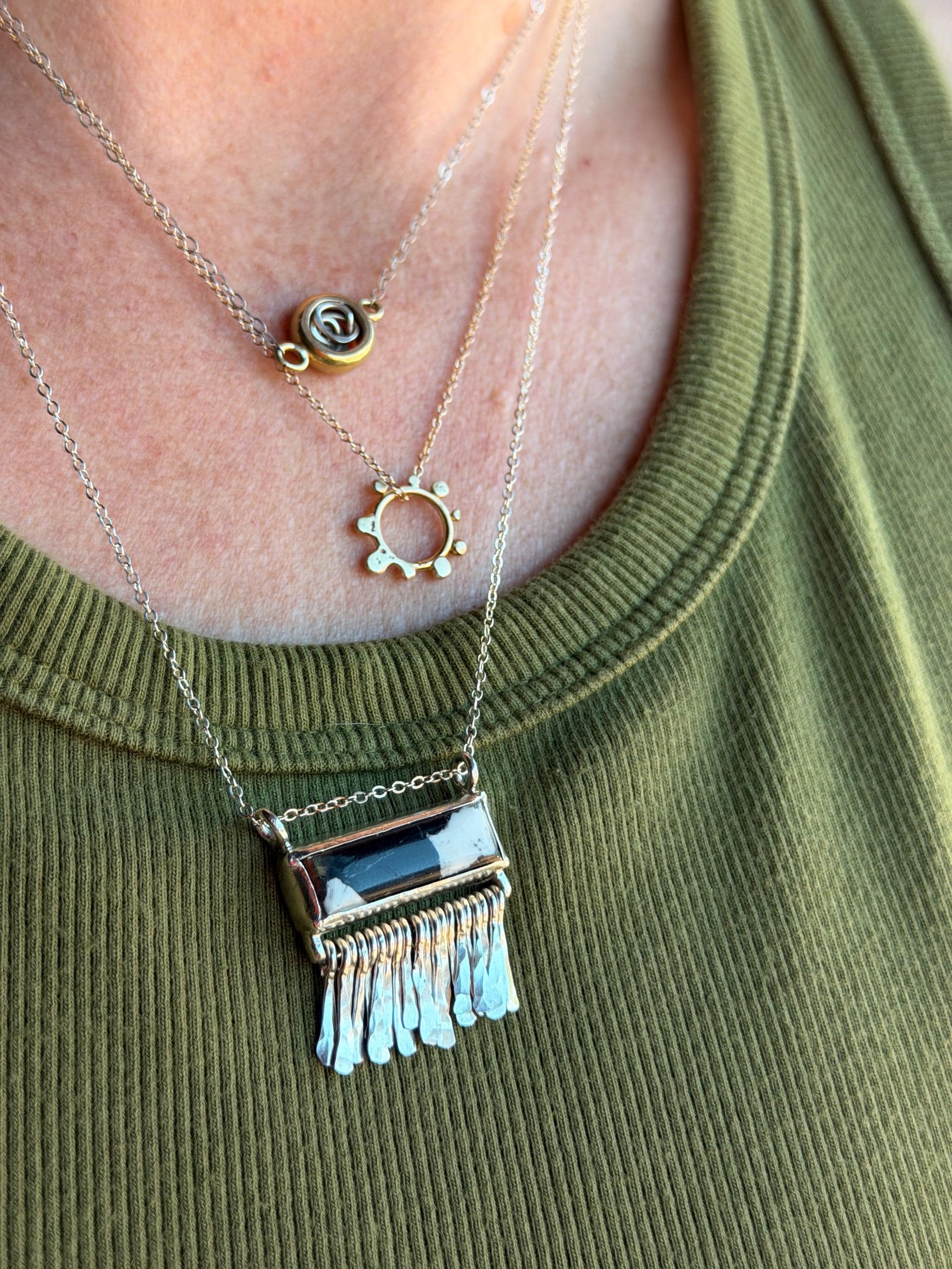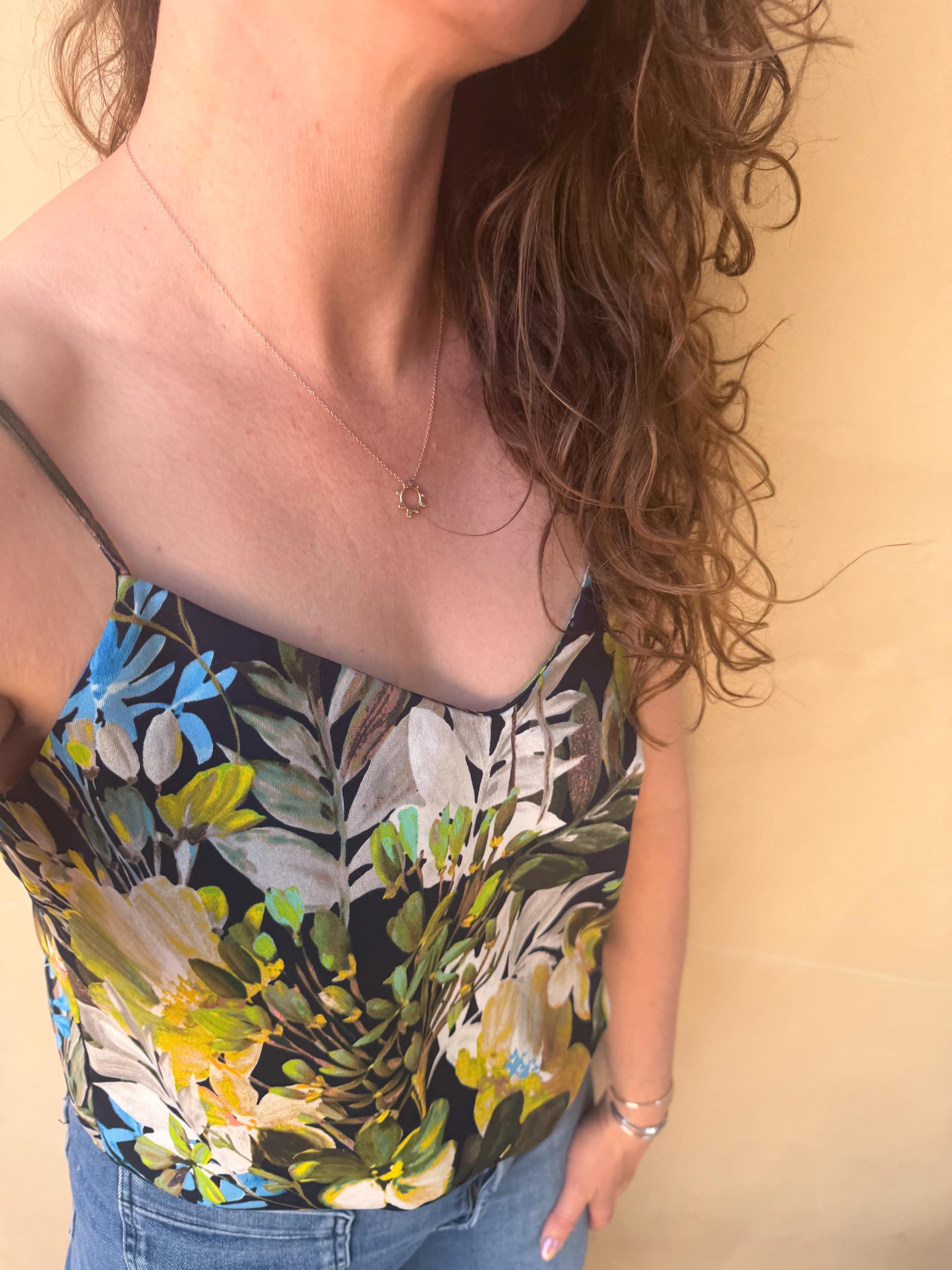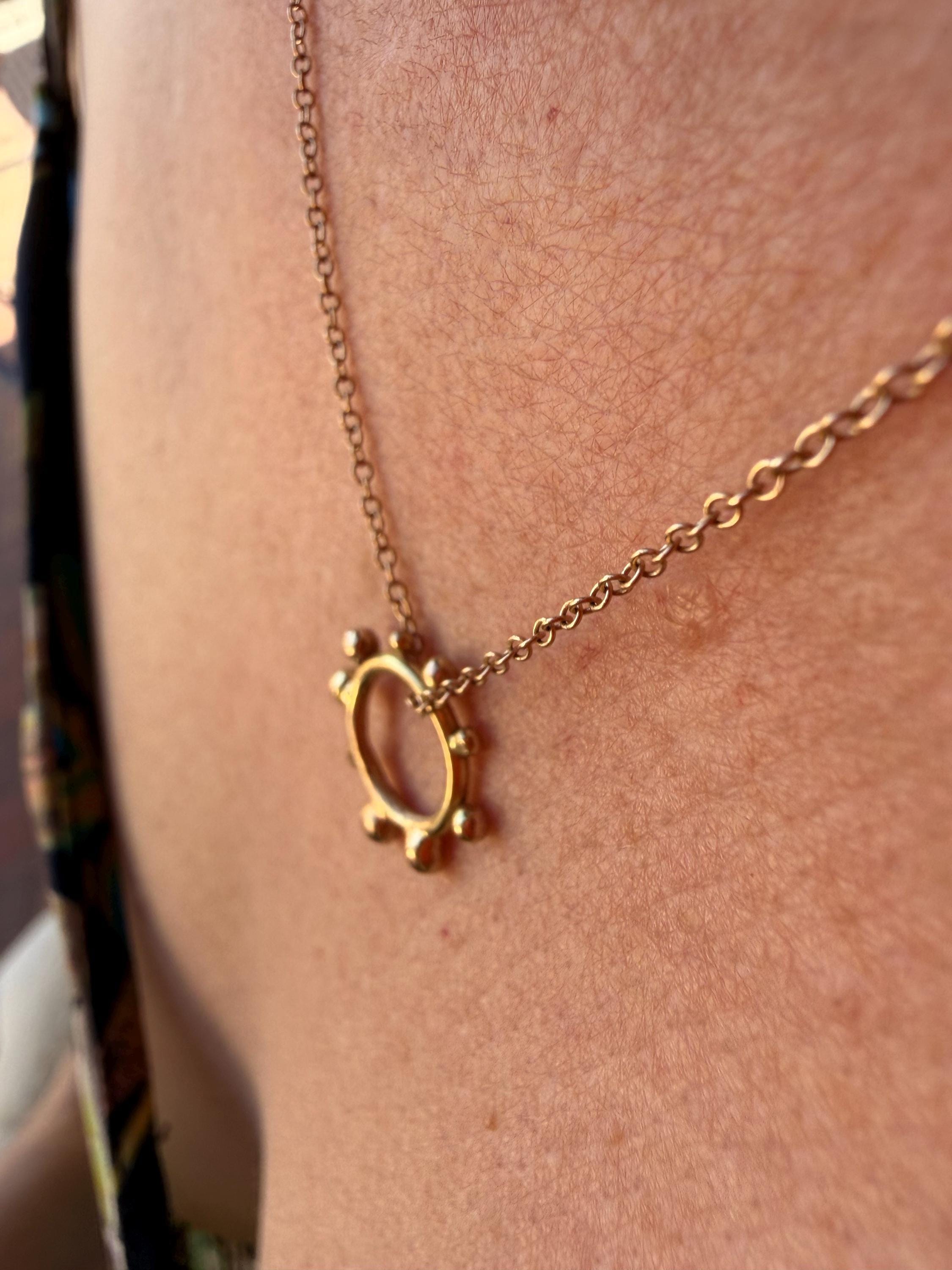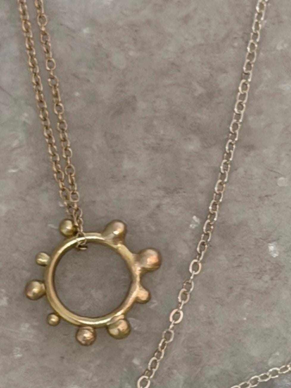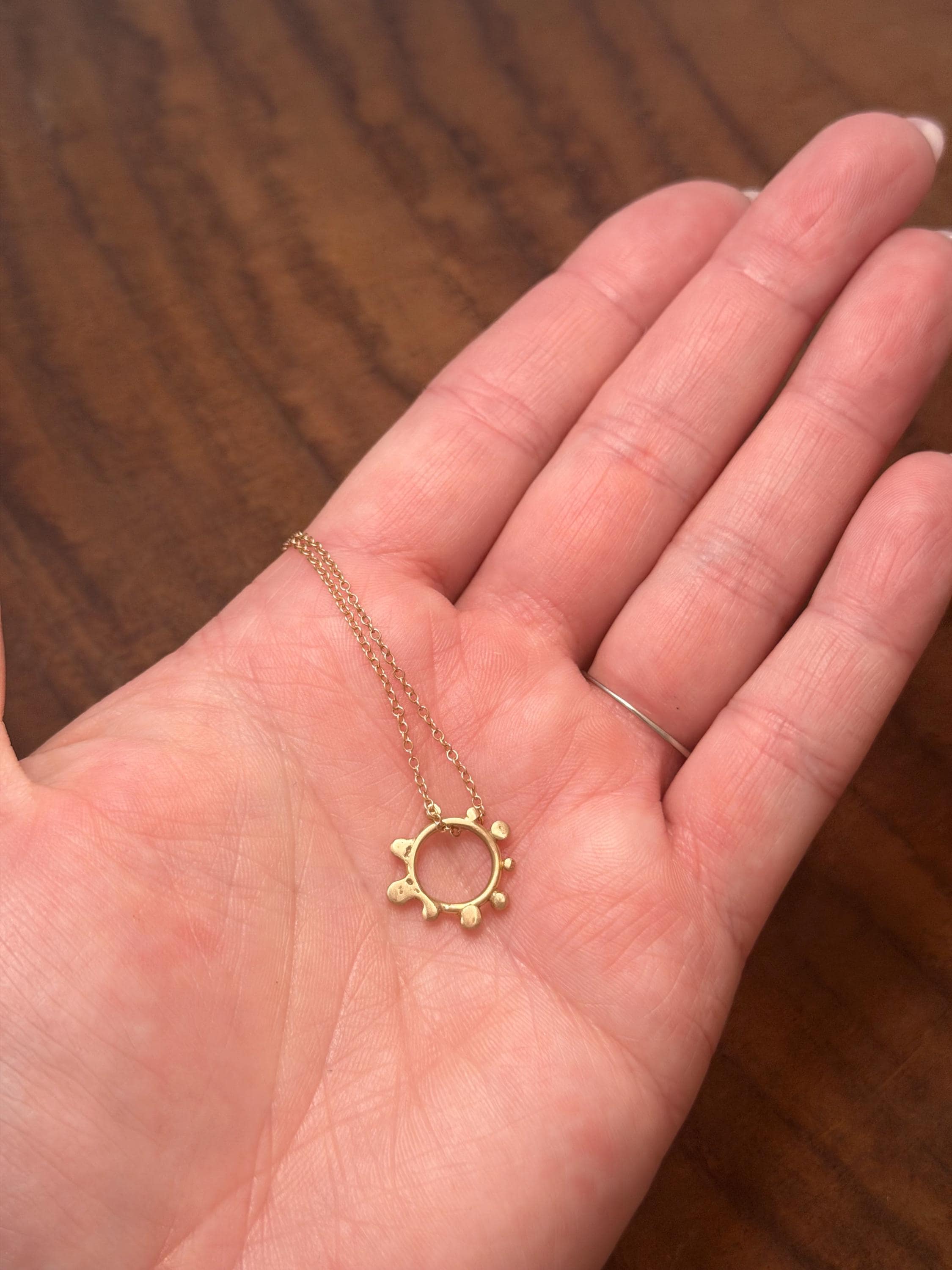 The Circle shape floats along the chain. The circle is accented with free formed bubbles and balls of 14k yellow gold. This necklace is part of a collection where I have explored more of my artistic creativity while testing the fusing and melting points of gold and silver, it is quite delightful to find these geometric shapes to have formed in the way that they have. The necklace exhibits hand formed circle outline with the ball shapes fused and accenting the edge. this necklace is finished with a light and dainty cable chain and round spring clasp.