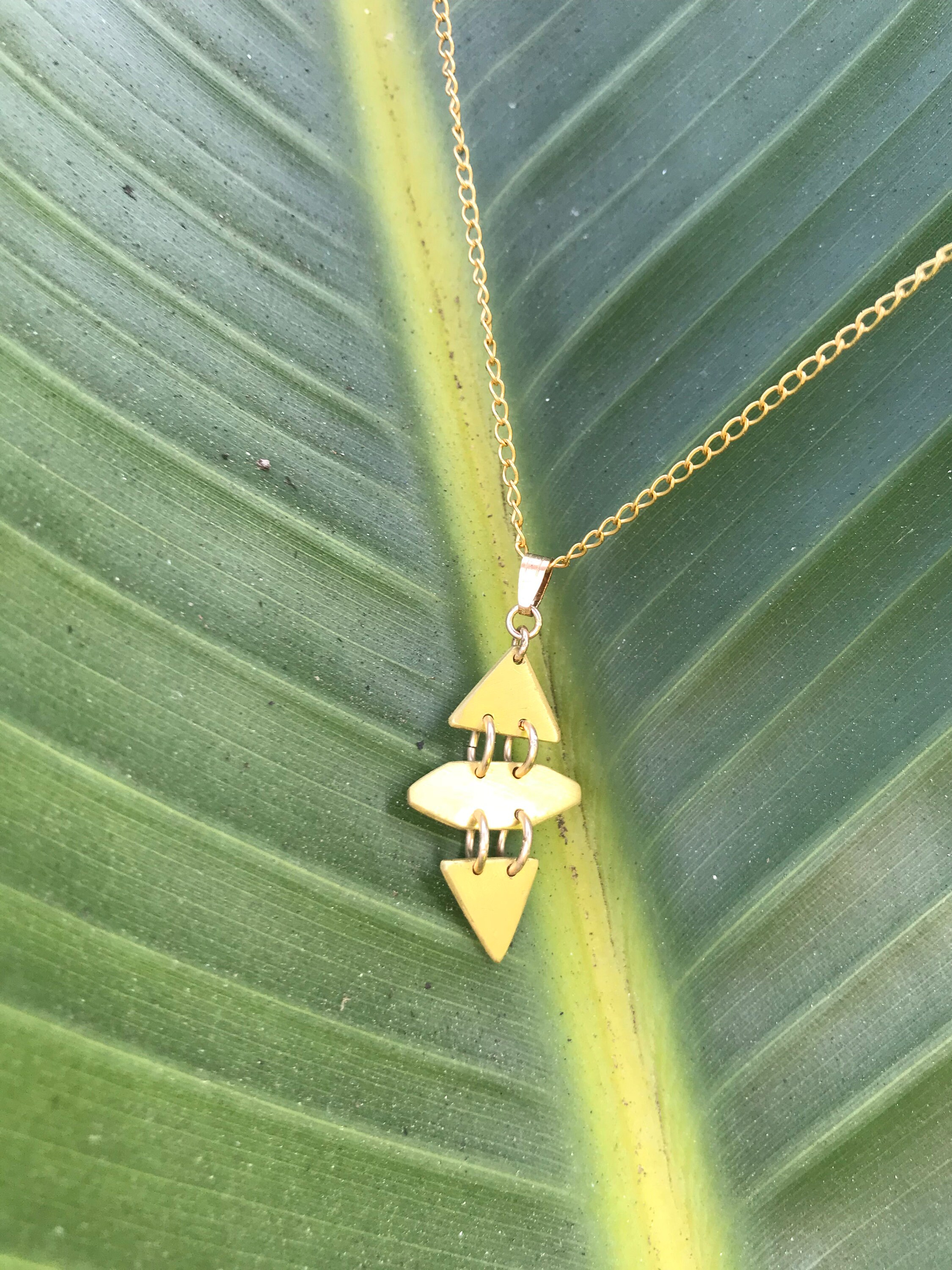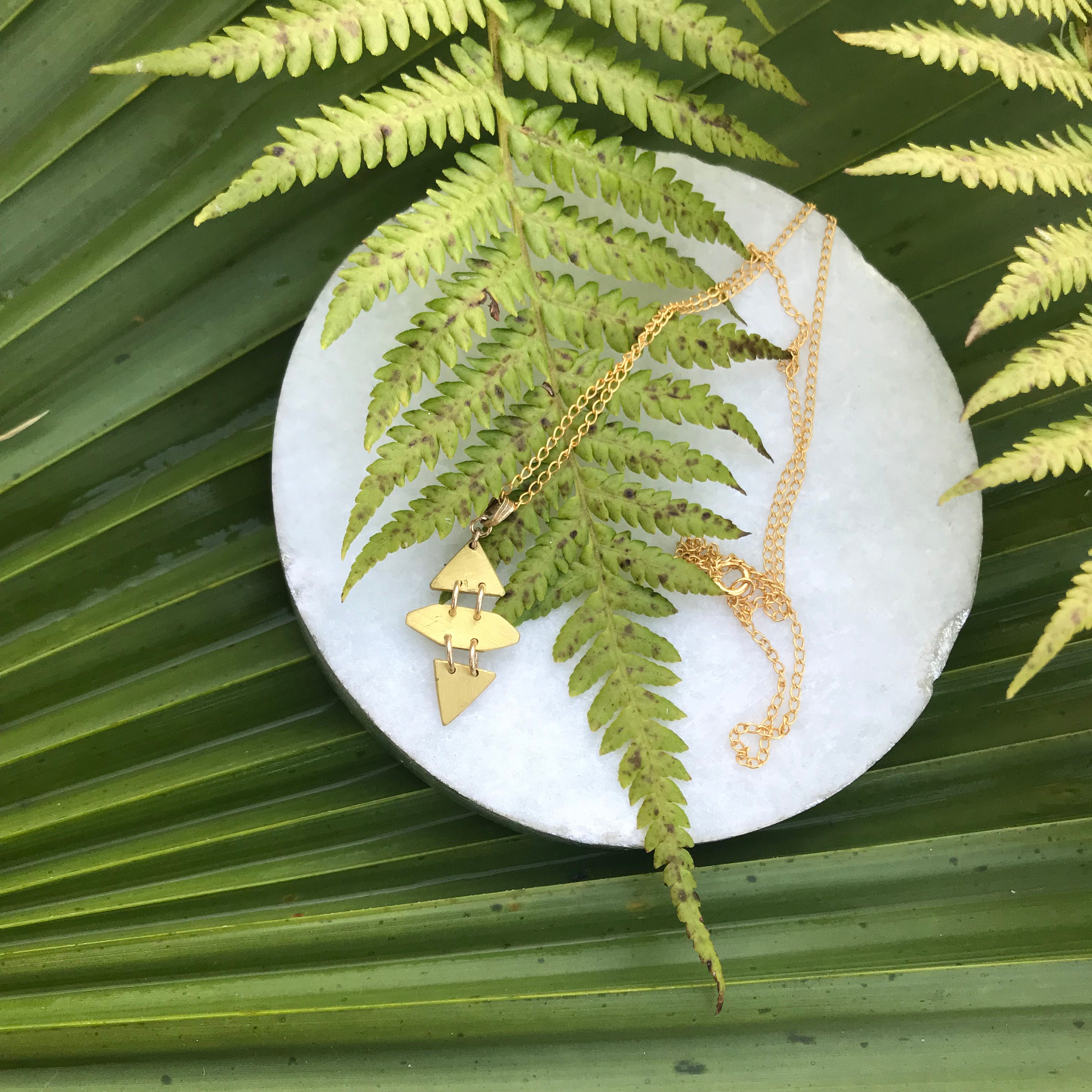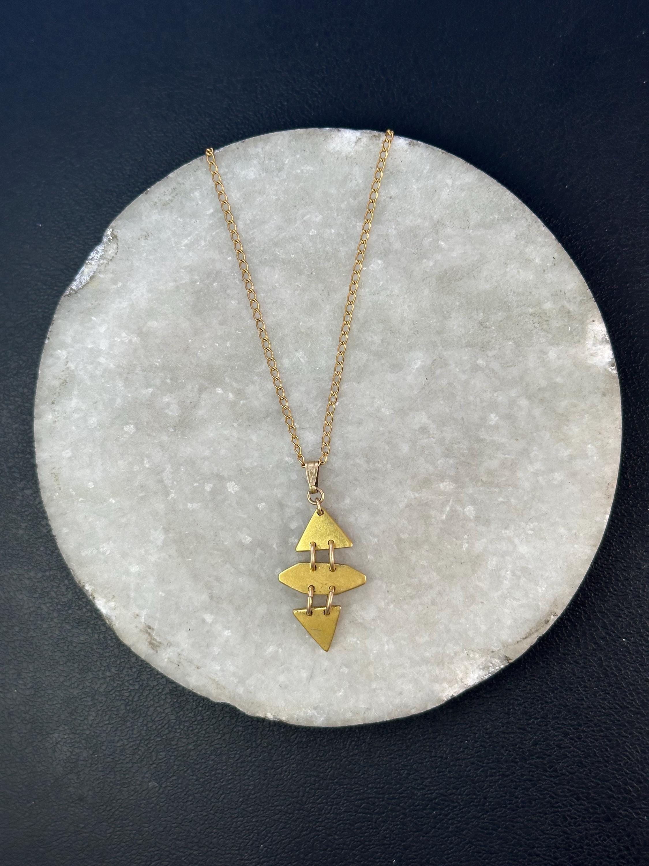 The 22k gold shapes, two triangles separated by an elongated octagon hang with ease and also with movement.