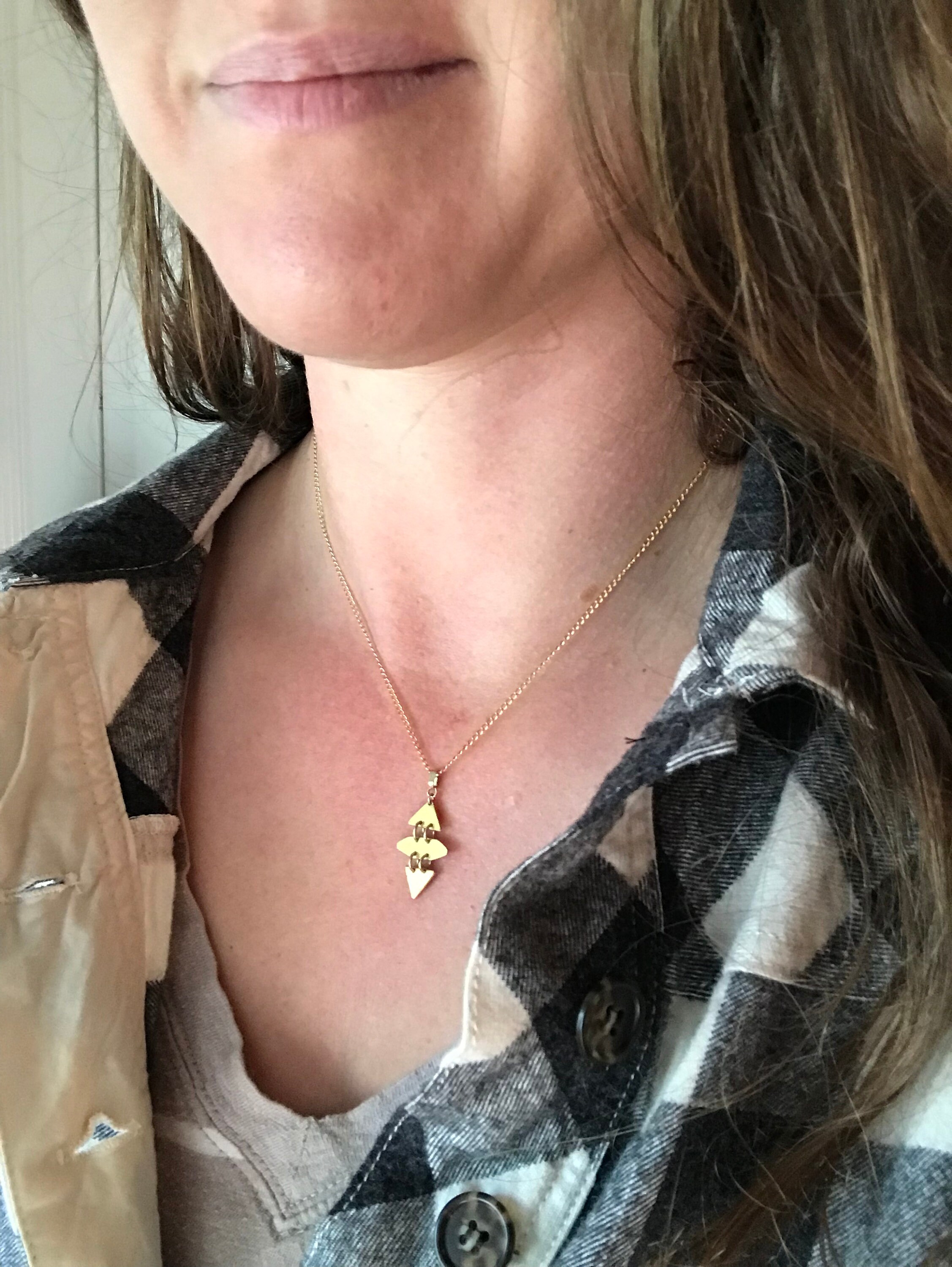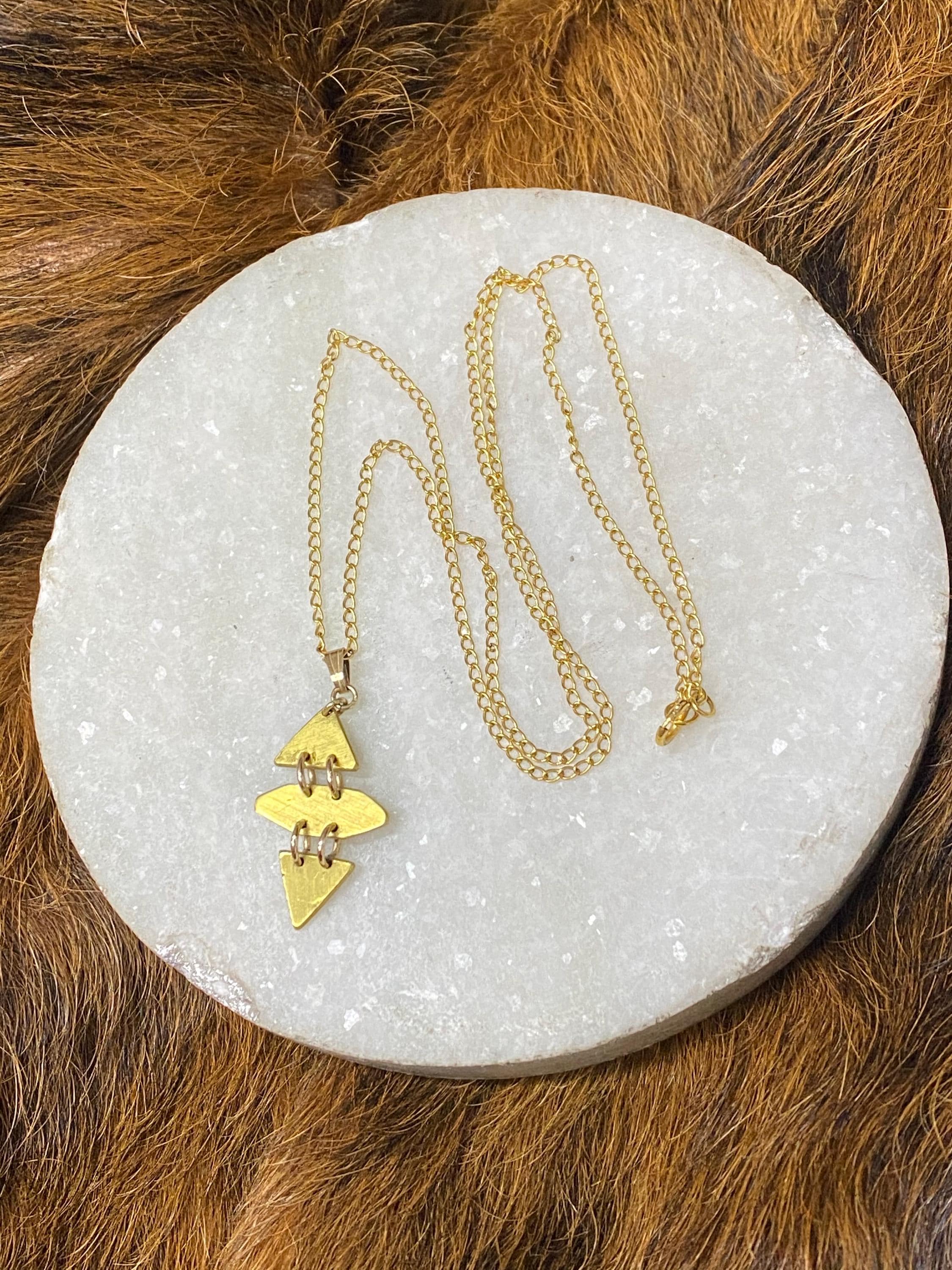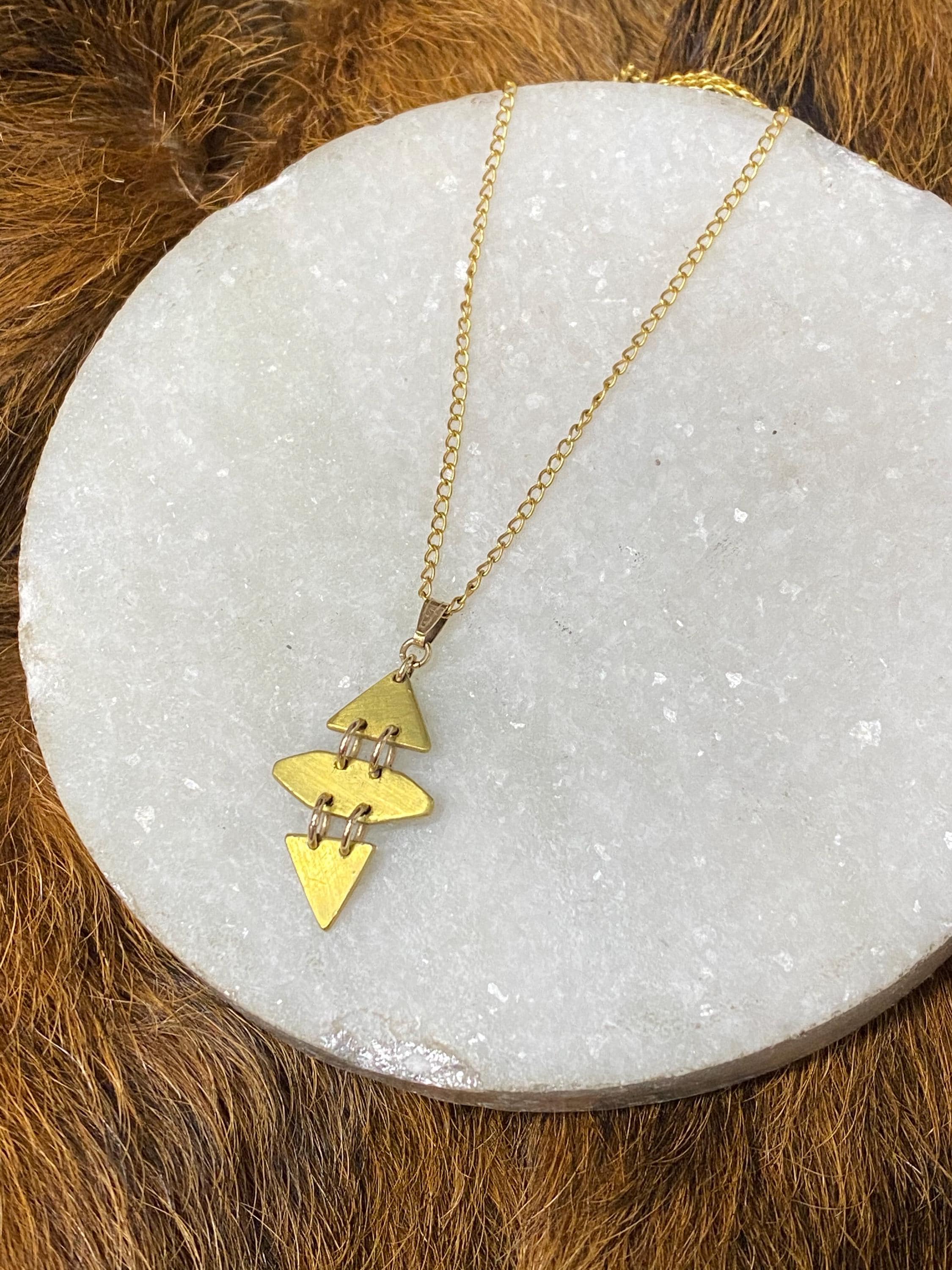 The 22k gold shapes, two triangles separated by an elongated octagon hang with ease and also with movement.