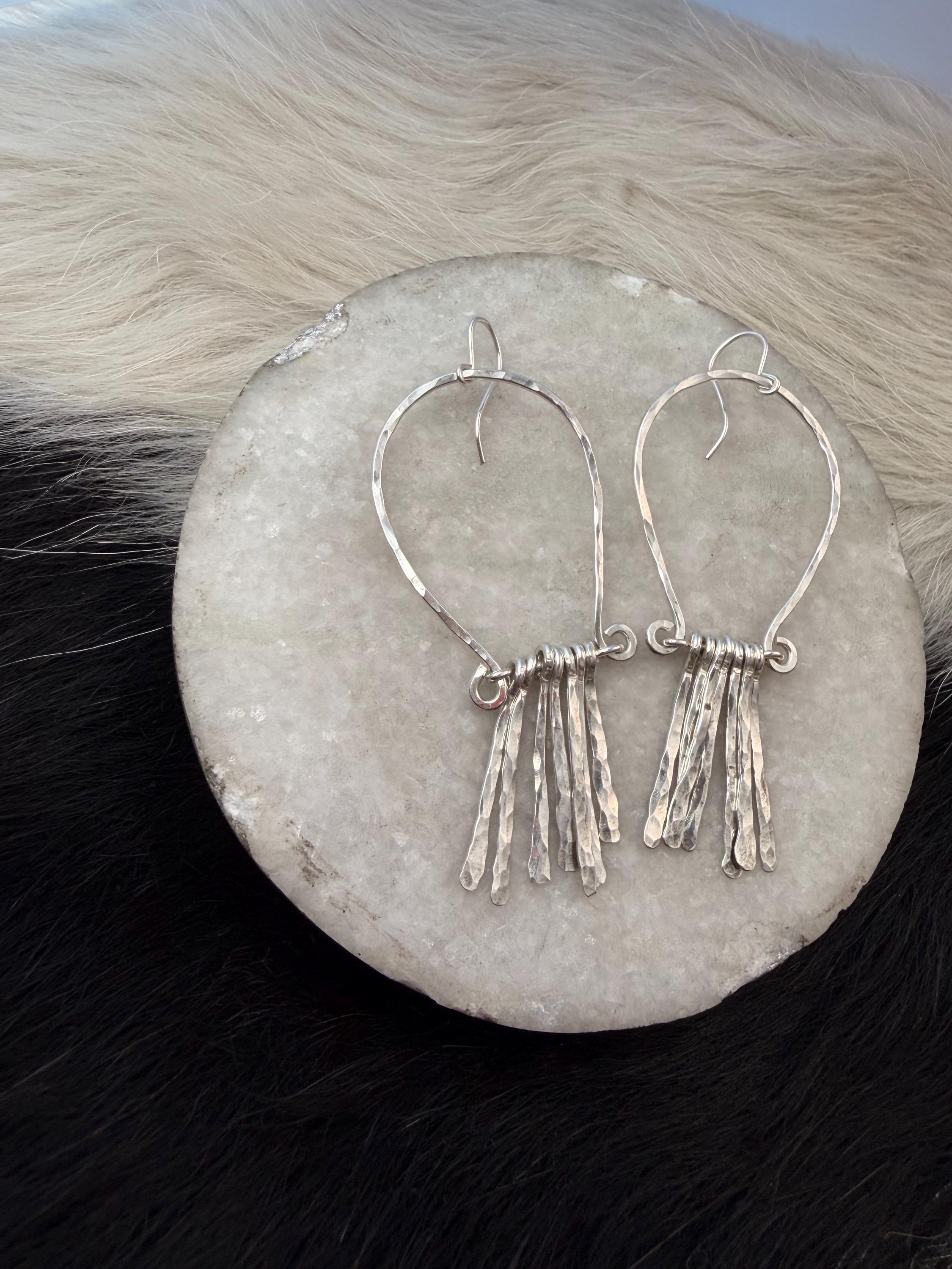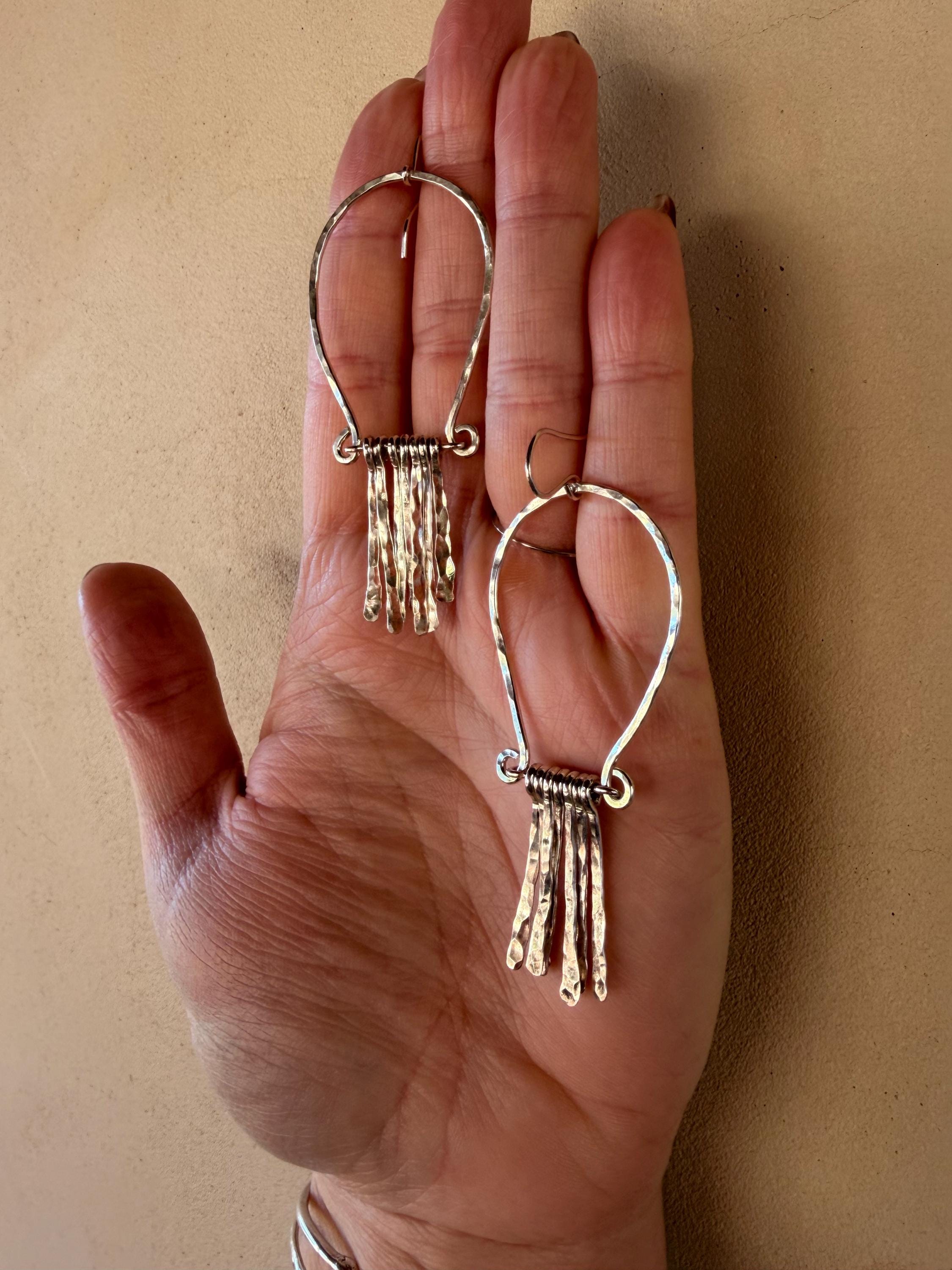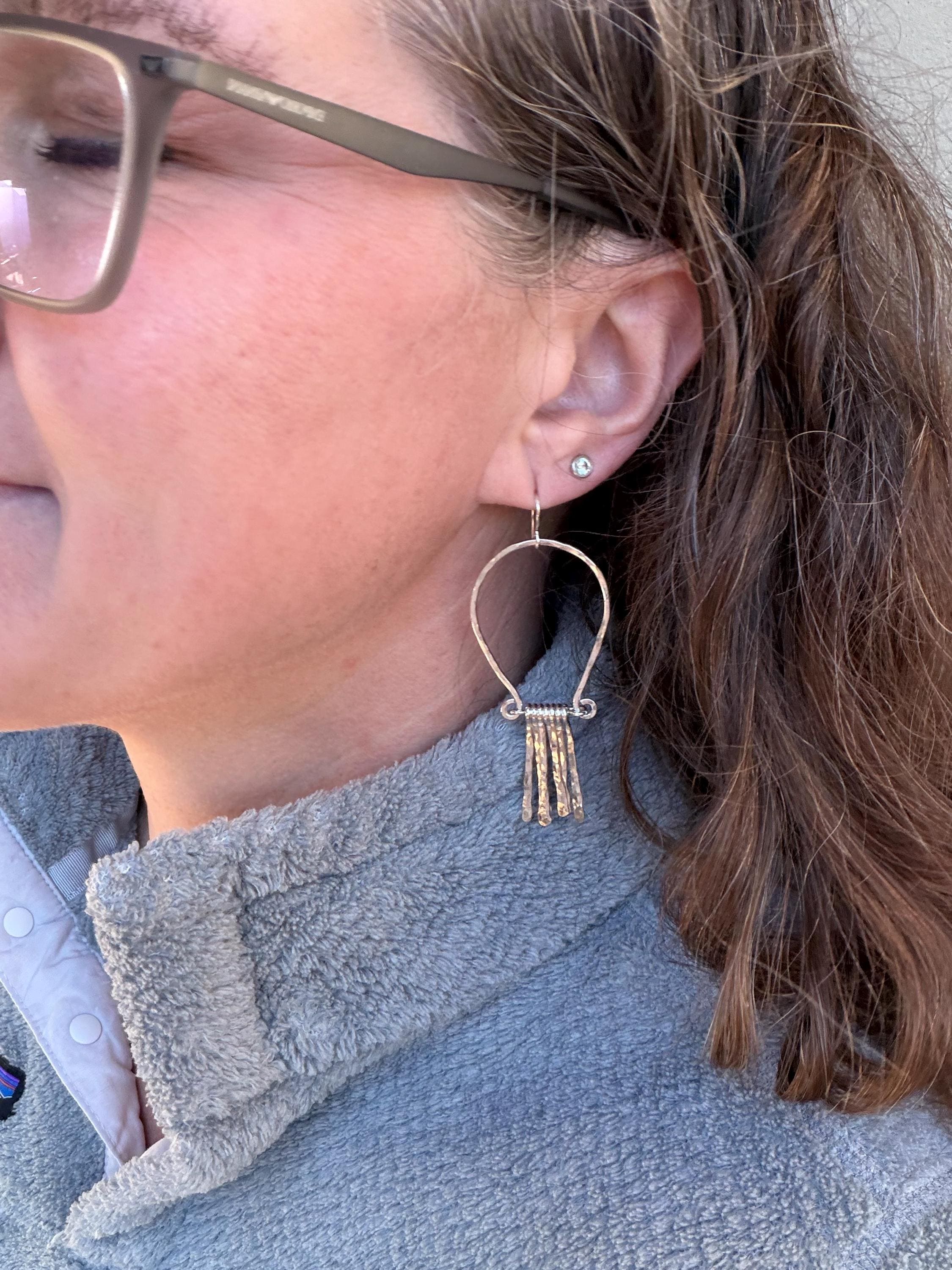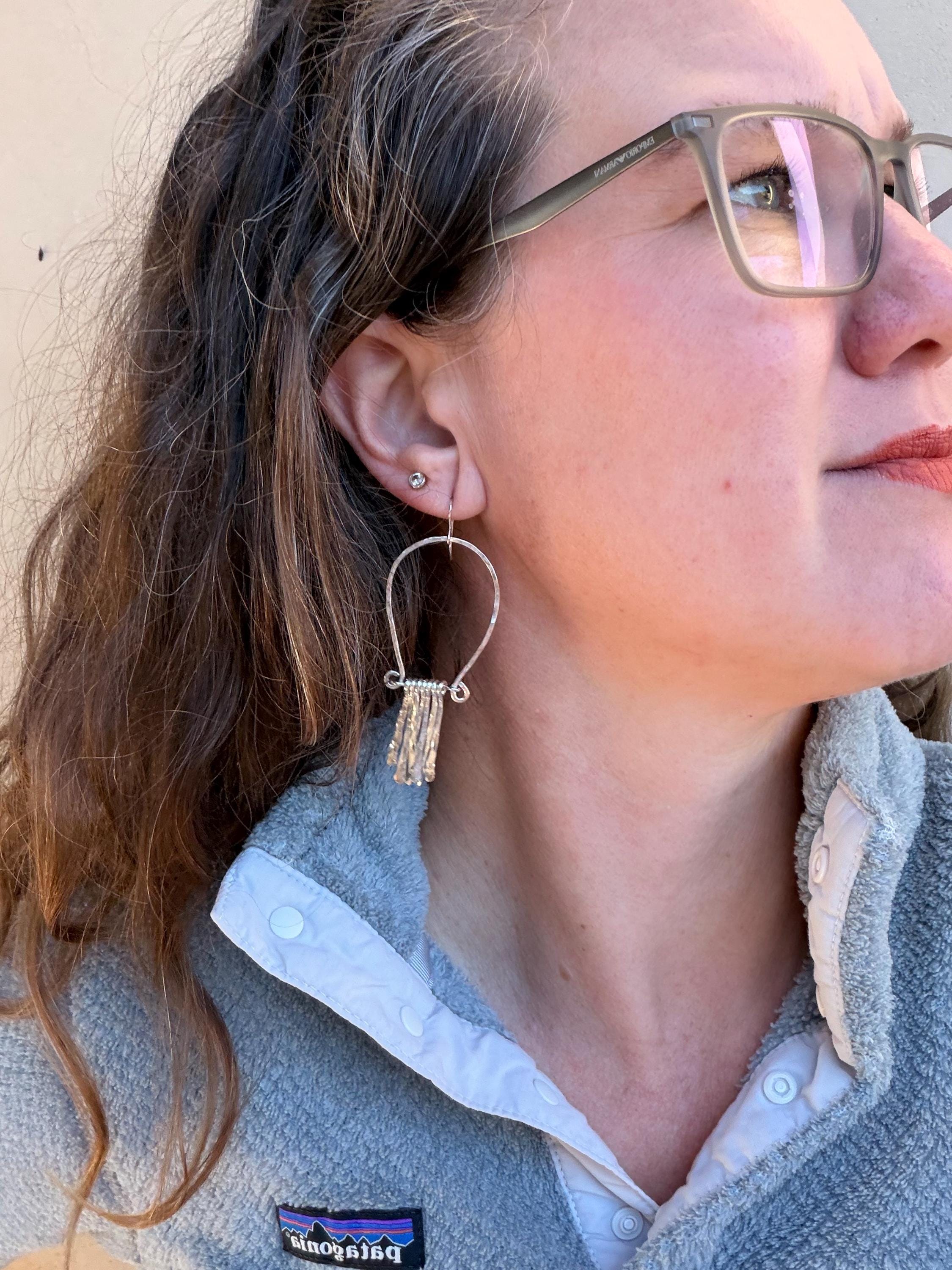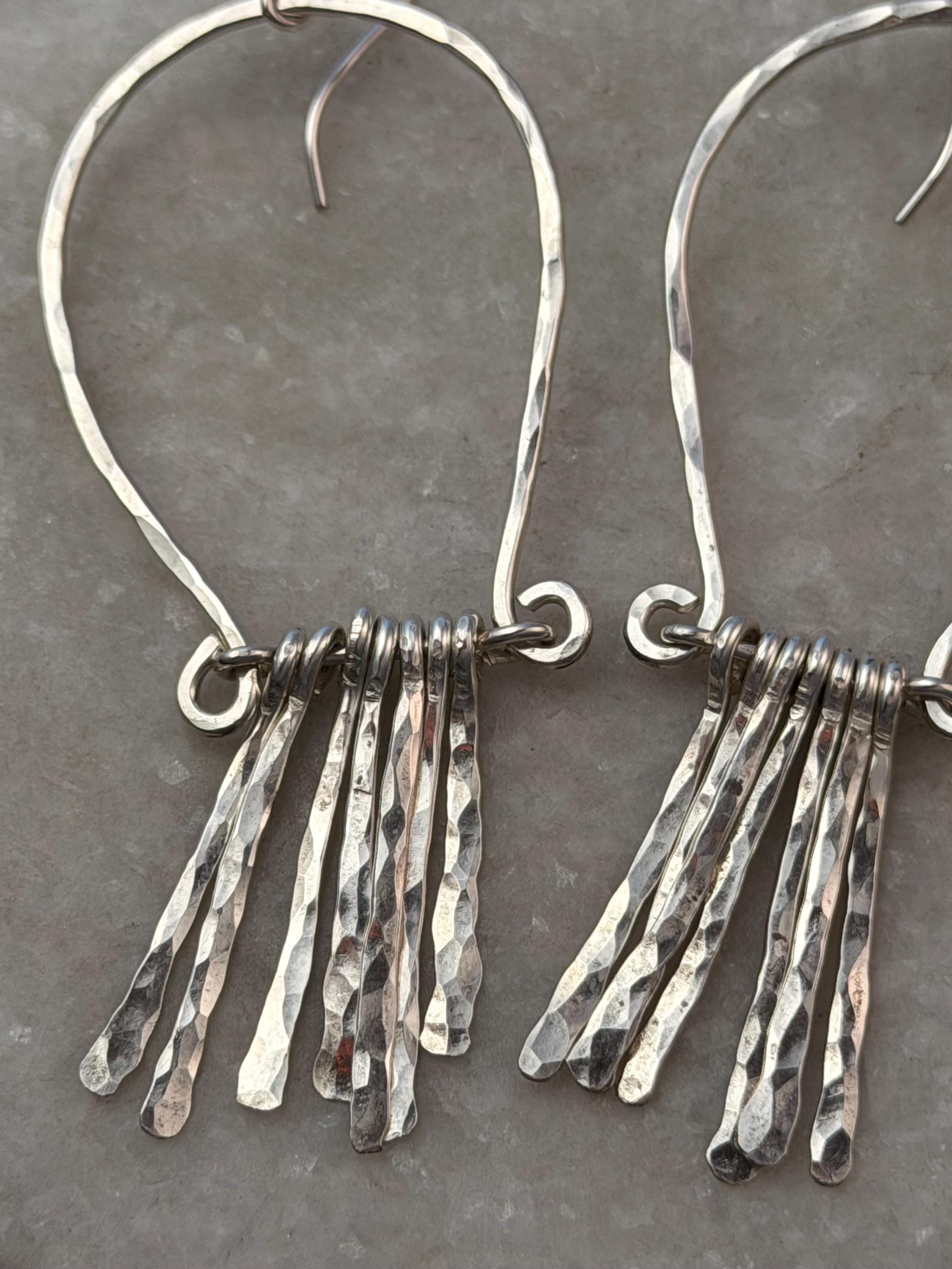 This is the Vivian earring. Its a rounded arc shape with hand forged metal fringe in sterling silver.